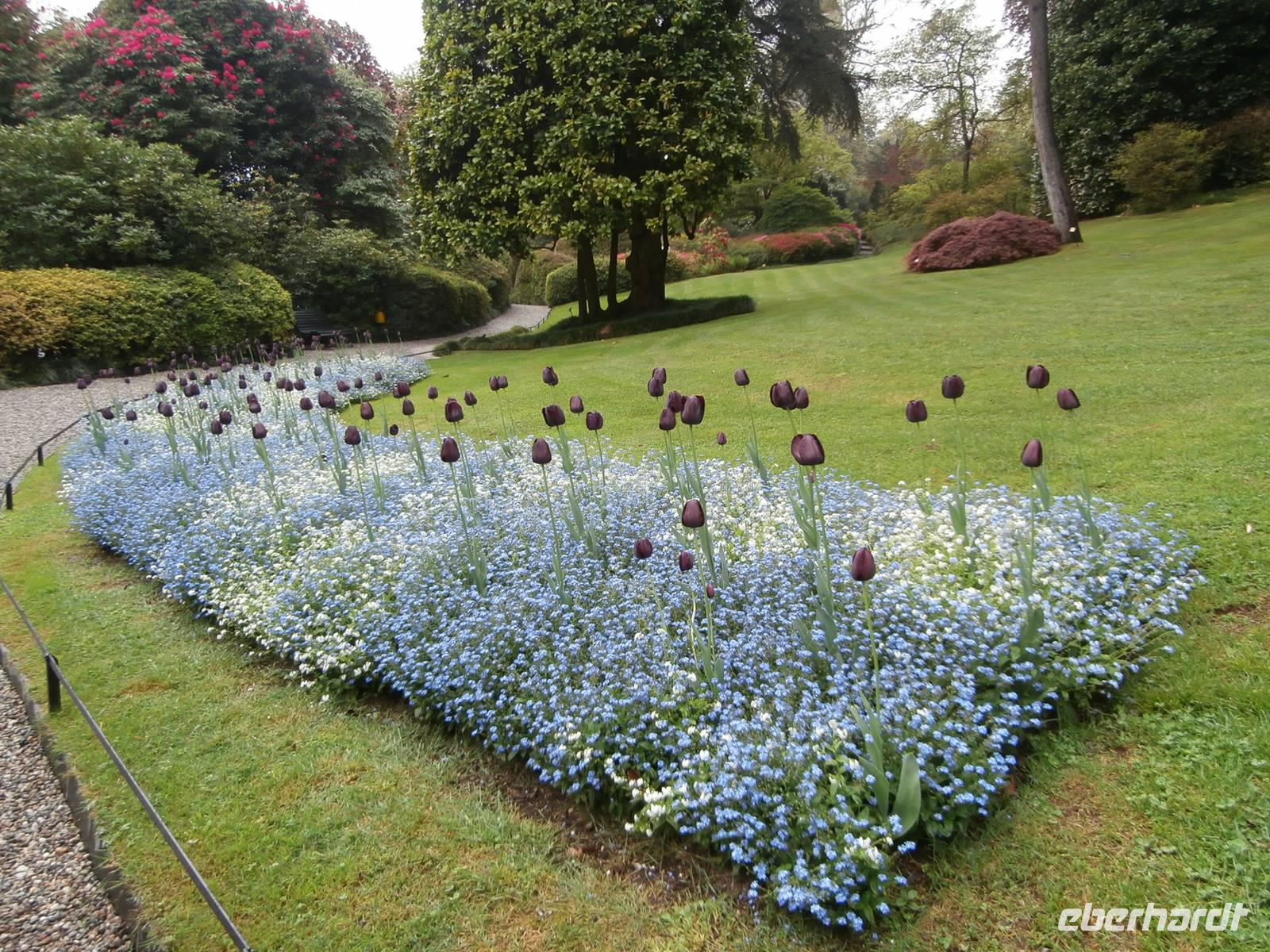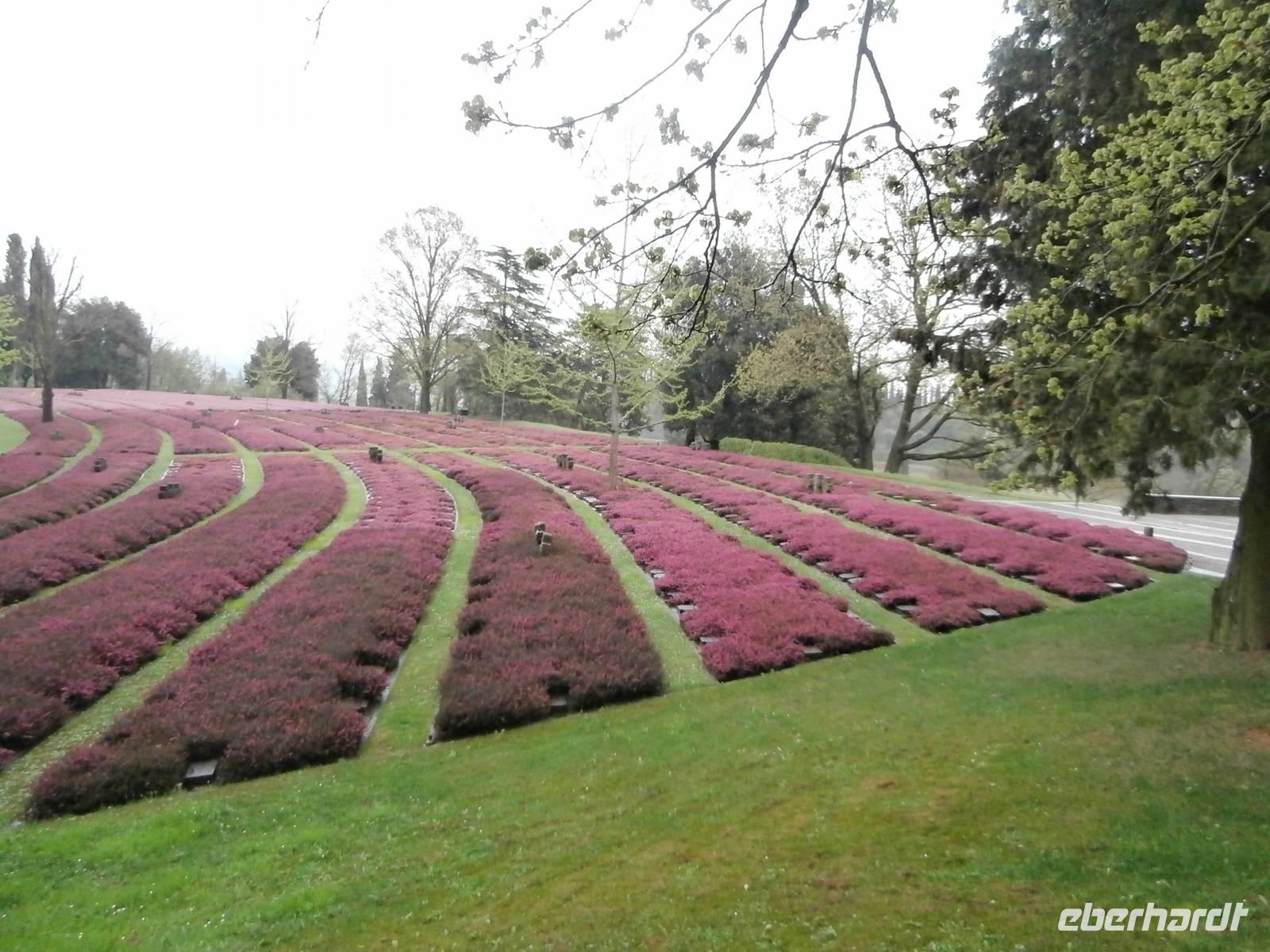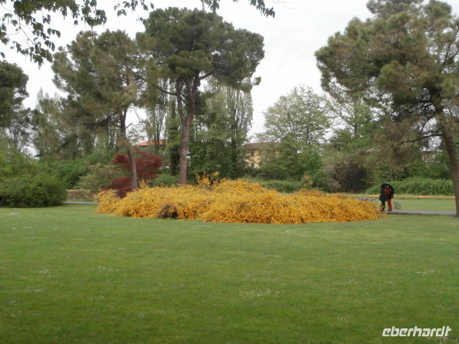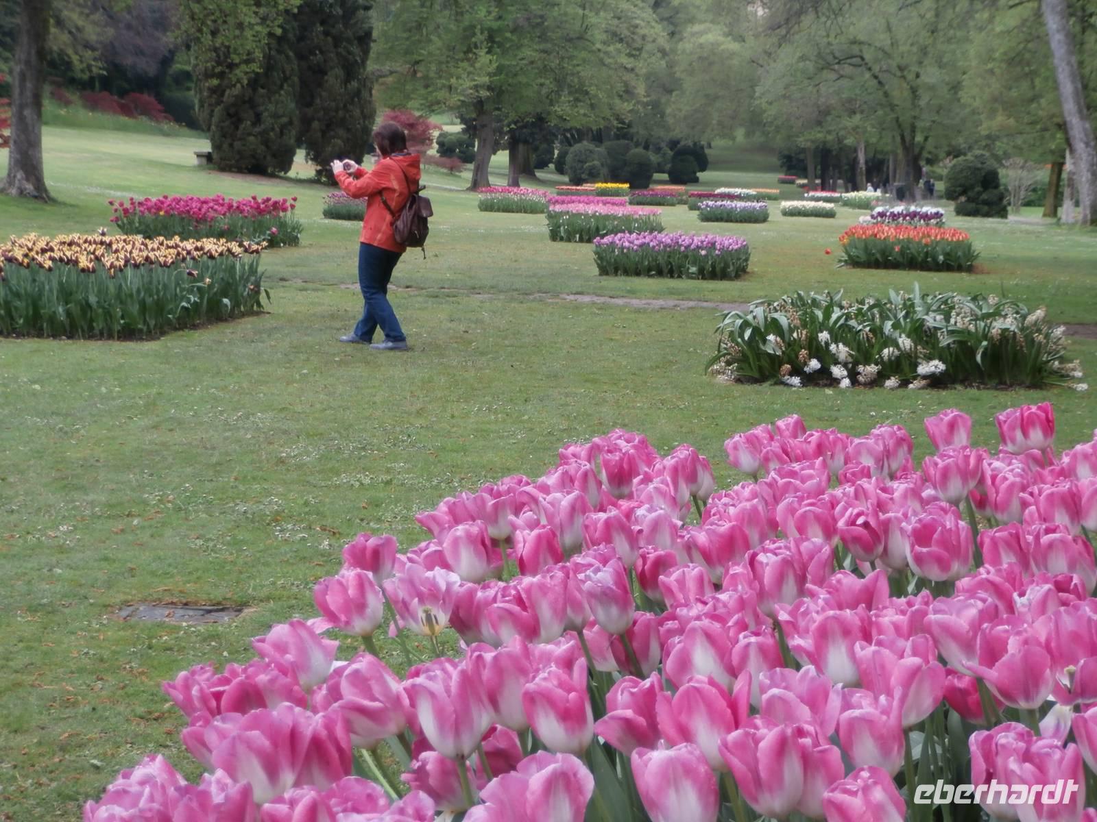Trüb aber noch trocken-so präsentiert sich der Morgen zum Frühstück. Wir erreichen ohne Regen Gardone Riviera und hier besichtigen wir den „Botanischen Garten"-die grüne Oase mit dem heutigen Namen "Heller Garten". Wir bummeln begeistert durch die Miniaturwelt mit Pflanzen und Bäumen, die aus der ganzen Welt zusammengetragen wurden. Nebel im Bambuswald und zwei Masken an einer Brücke, die sich gegenseitig mit Wasser bespucken-einfach herrlich durch dieses kleine Gartenwunder zu bummeln. Am Nachmittag führt uns die Fahrt nach Valeggio sul Mincio, hier werden wir zur Besichtigung im Parco Sigurta erwartet. Ohne Regen geht's los, mit unserer Führerin Sylviane Klein sehen wir auf einer riesengroßen Rasenfläche Tulpenbeete in einer Vielfalt an Formen und Farben. Wir sind am Fotografieren, Fachsimpeln und mit Sylvi auch gut versorgt, denn sie gibt uns viele Informationen zum Landschaftsgarten, der sich als weitläufige Parkanlage bis hin zum Mincio erstreckt. Auch das im Jahre 2011 neu angelegte Labyrinth mit über zwei Meter hohen Eiben bäumen sehen wir. Die anschließende Fahrt mit der Parkbahn lassen wir ausfallen, der einsetzende Regen lässt eine Warteschlange anwachsen, dort wollen wir uns nicht anstellen, haben wir doch den Park zu Fuß erschlossen und viel gesehen. Im Hotel wird uns wieder ein tolles Abendessen serviert.