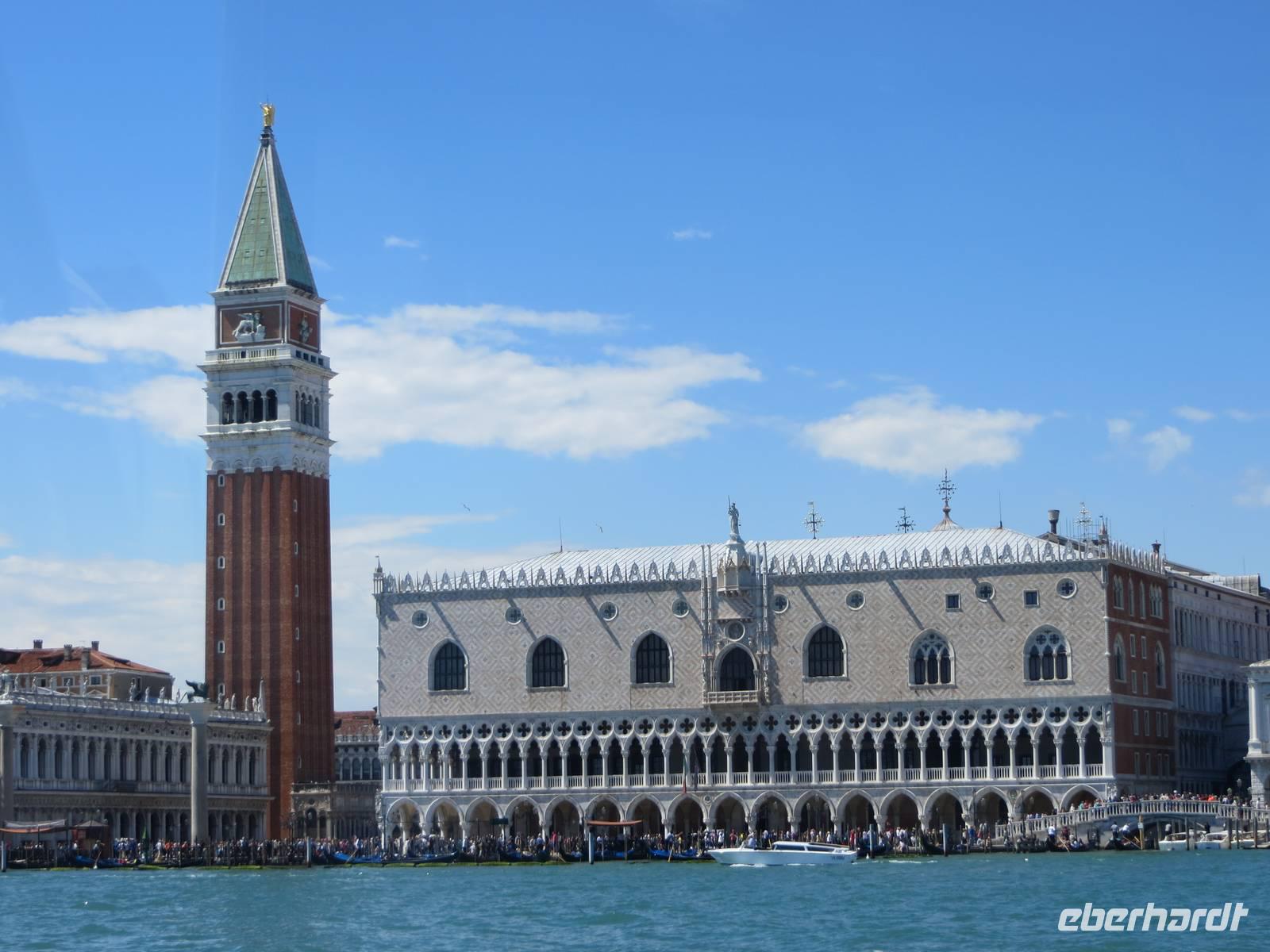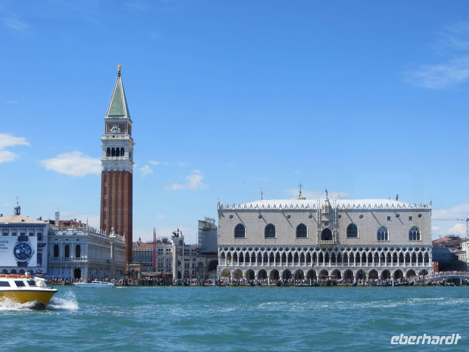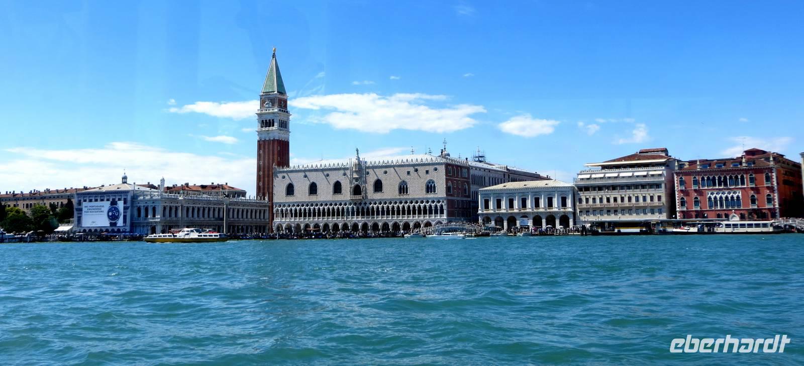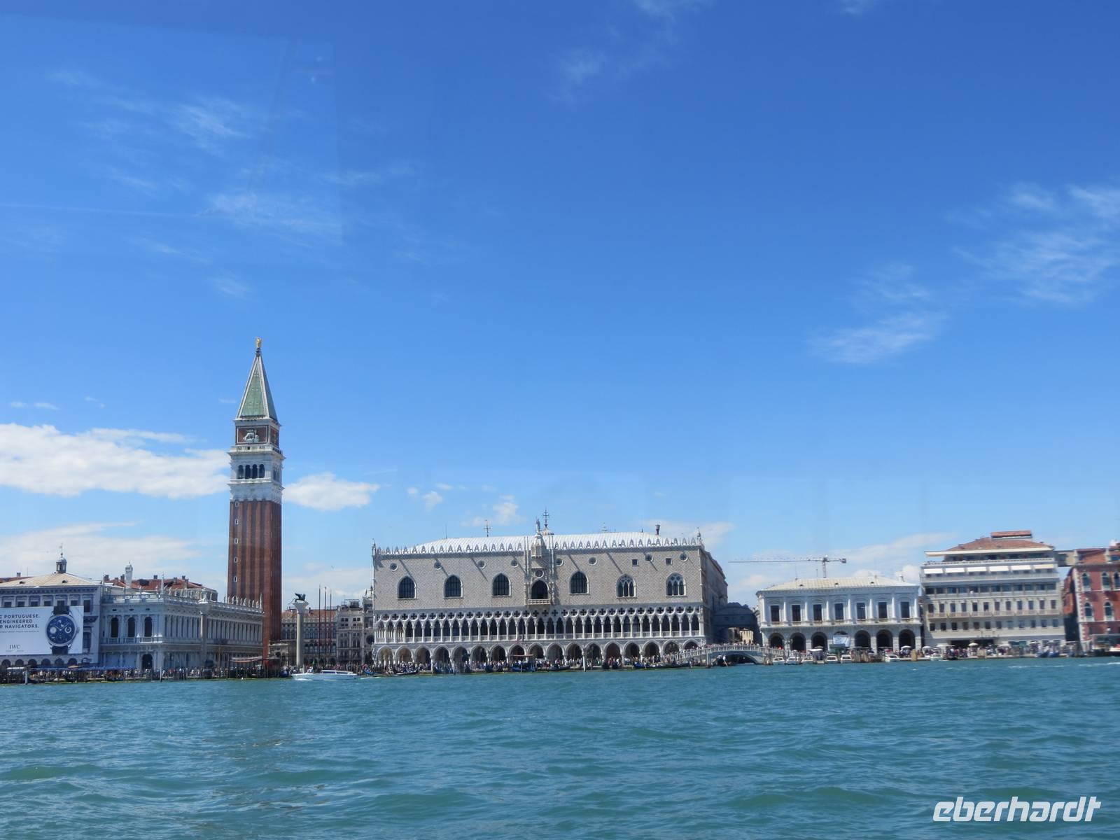 Nachdem wir uns unser Frühstück „erkämpft" hatten, starteten wir pünktlich 09.30 Uhr bei Sonnenschein unsere Weiterfahrt nach Venedig. Unterwegs legten wir eine kurze Kaffeepause ein, bevor wir uns in der Lagunenstadt mit unseren beiden örtlichen Reiseleiterinnen Alissia und Elisabeth trafen. Unsere beiden Chauffeure brachten unsere Koffer zur AIDAaura. So konnten wir ganz entspannt durch die Lagunenstadt spazieren. Zuerst nutzten wir den modernen People Mover, einen Zug, der auf Stelzen vorbei am Hafen der Kreuzfahrtschiffe bis zum Römischen Platz fährt. Nun teilten wir uns in eine Gruppe für Schnellläufer und in eine Genießergruppe. Wir gingen zuerst zum Campo Campazzo, dann zum Campo S. Polo. Unsere Reiseleiterinnen wählten eine Strecke, die etwas Abseits von den großen Touristenströmen lag. Unterwegs erfuhren wir Wissenswertes zum Leben in Venedig und natürlich zur Geschichte der Stadt. Plötzlich lag er vor uns, der Canale Grande mit der imposanten Rialto-Brücke. Hier sprudelte die Stadt fast über, sehr viele Touristen waren an diesem sonnigen Tag, bei fast wolkenlosem Himmel, unterwegs. Wir sahen kurz den Gondolieren bei der Arbeit zu. Aber wirklich nur ganz kurz, denn wir wollten unbedingt zum Markusplatz mit dem Campanile und dem Dogenpalast, den wir durch ein Gewirr engster Gassen mit vielen Touristen erreichten. Für alle Gäste war dies eine Stippvisite zum Auffrischen für Wiederbesucher oder zum Neugierigwerden für alle Gäste, die zum ersten Mal in Venedig weilten. Nach ganz kurzer Freizeit spazierten wir zum Schiffsanleger zu unserer Bootsüberfahrt zur AIDAaura. Leider hatten wir unterschiedliche Informationen zum Liegeplatz erhalten, nach der vierten oder fünften Brücke ...? Schließlich legten wir 15.10 Uhr ab und konnten den Markusplatz, die Kirche San Marco und den Canale Grande nun aus völlig neuer Perspektive bestaunen.Wir fuhren mit dem Boot zwischen den großen Schiffen von MSC und Royal Caribbian. Die AIDAaura versteckte sich noch etwas hinter diesen Ozeanriesen.