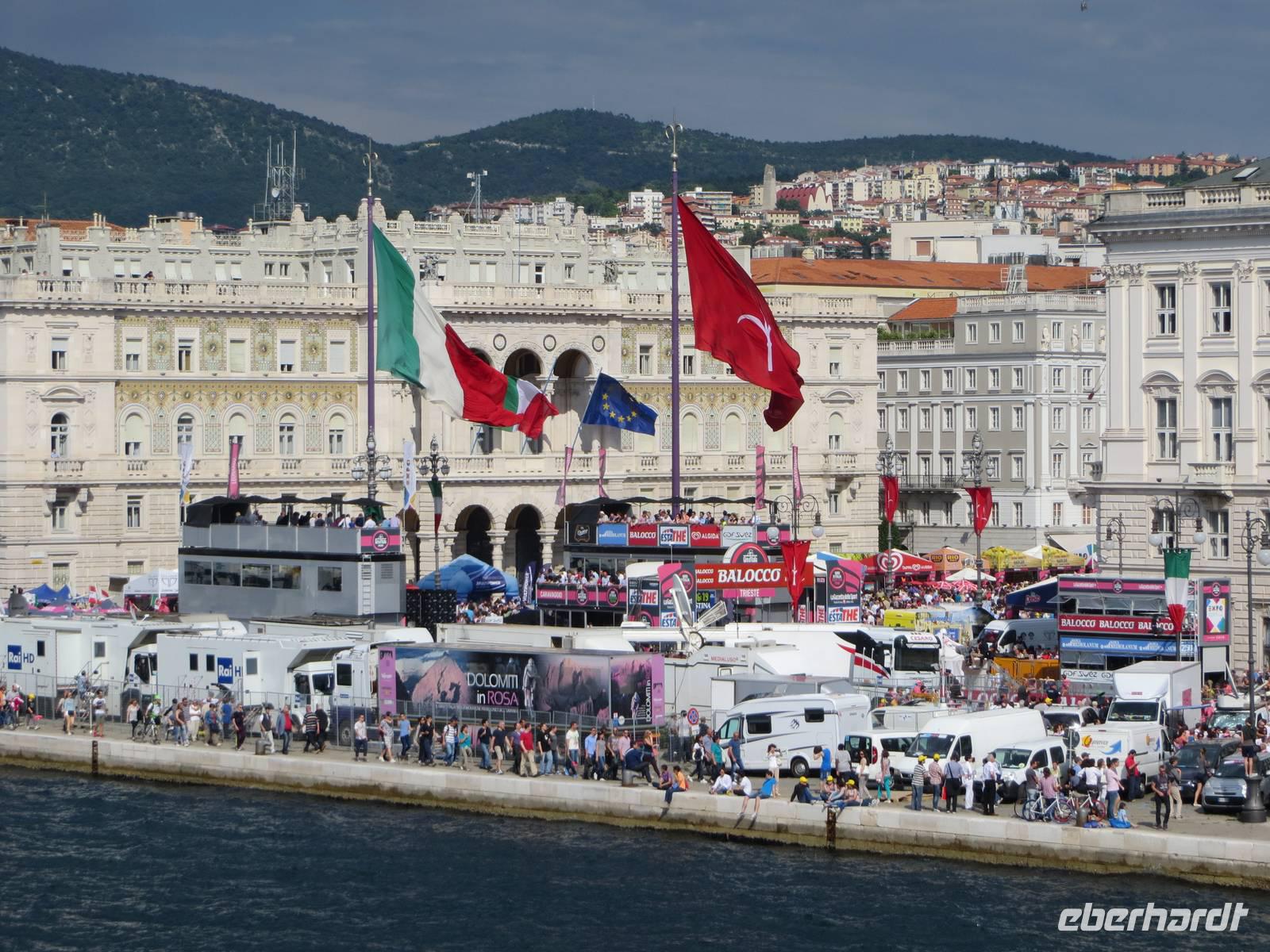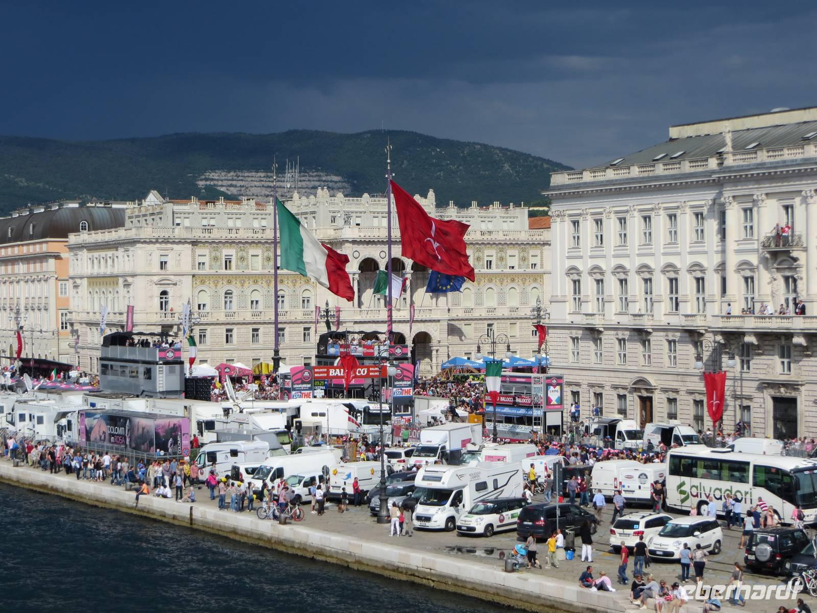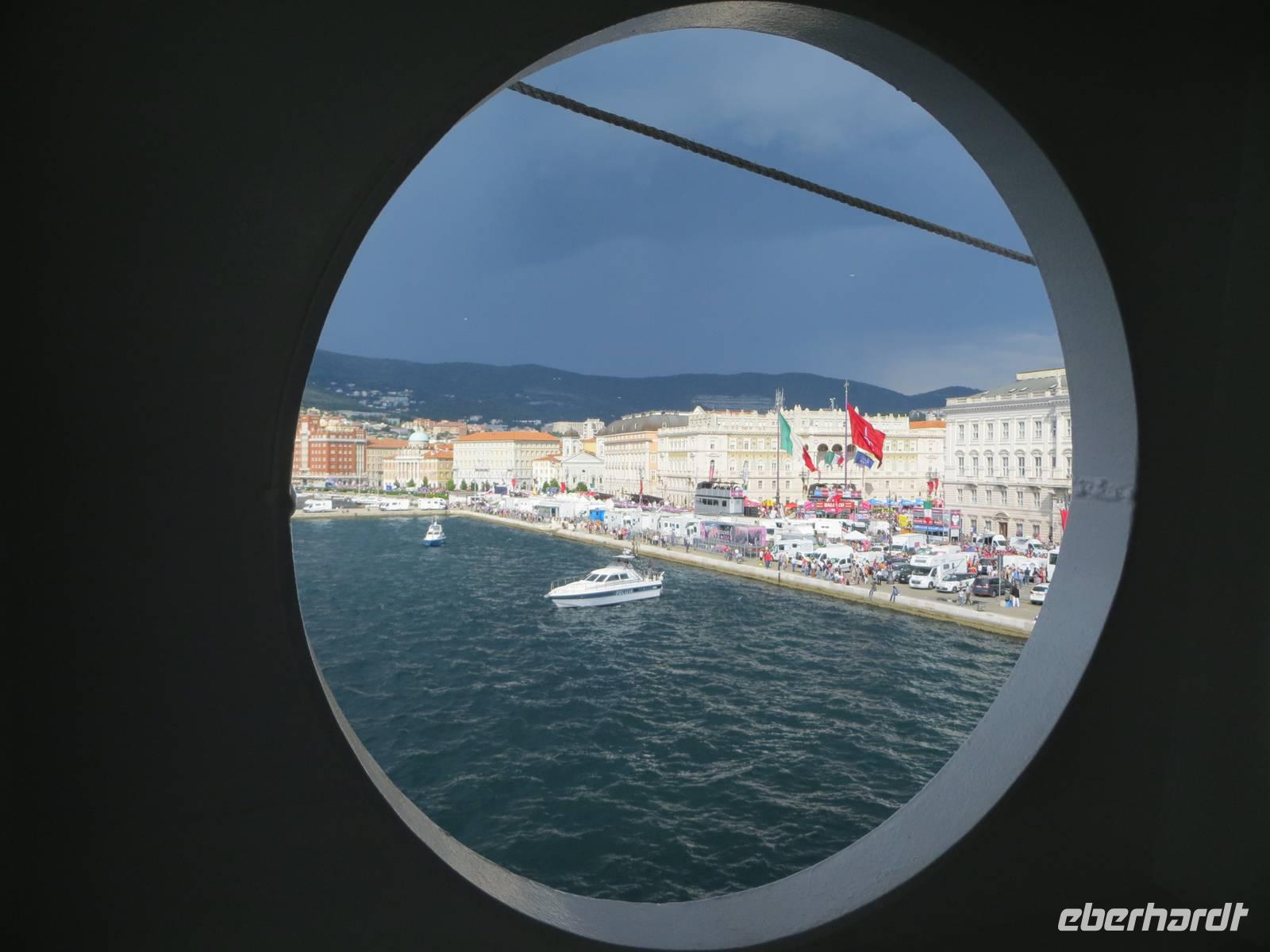 Die Fahrt durch die Altstadt endete am Hafen Triests, einst einer der bedeutendsten Häfen der Adria, der 500 Jahre lang Österreichs Zugang zum Meer war. Wir mussten uns sputen, denn ab dem frühen Nachmittag wurden viele Straßen gesperrt. Am heutigen Tag fand die letzte Etappe des Giro d'Italia statt. Das Ziel befand sich fast am Bug der AIDAaura und wir konnten das Geschehen so aus der ersten Reihe beobachten: ein Spektakel der besonderen Art. Besonders imposant war die Show einer italienischen Flugstaffel.