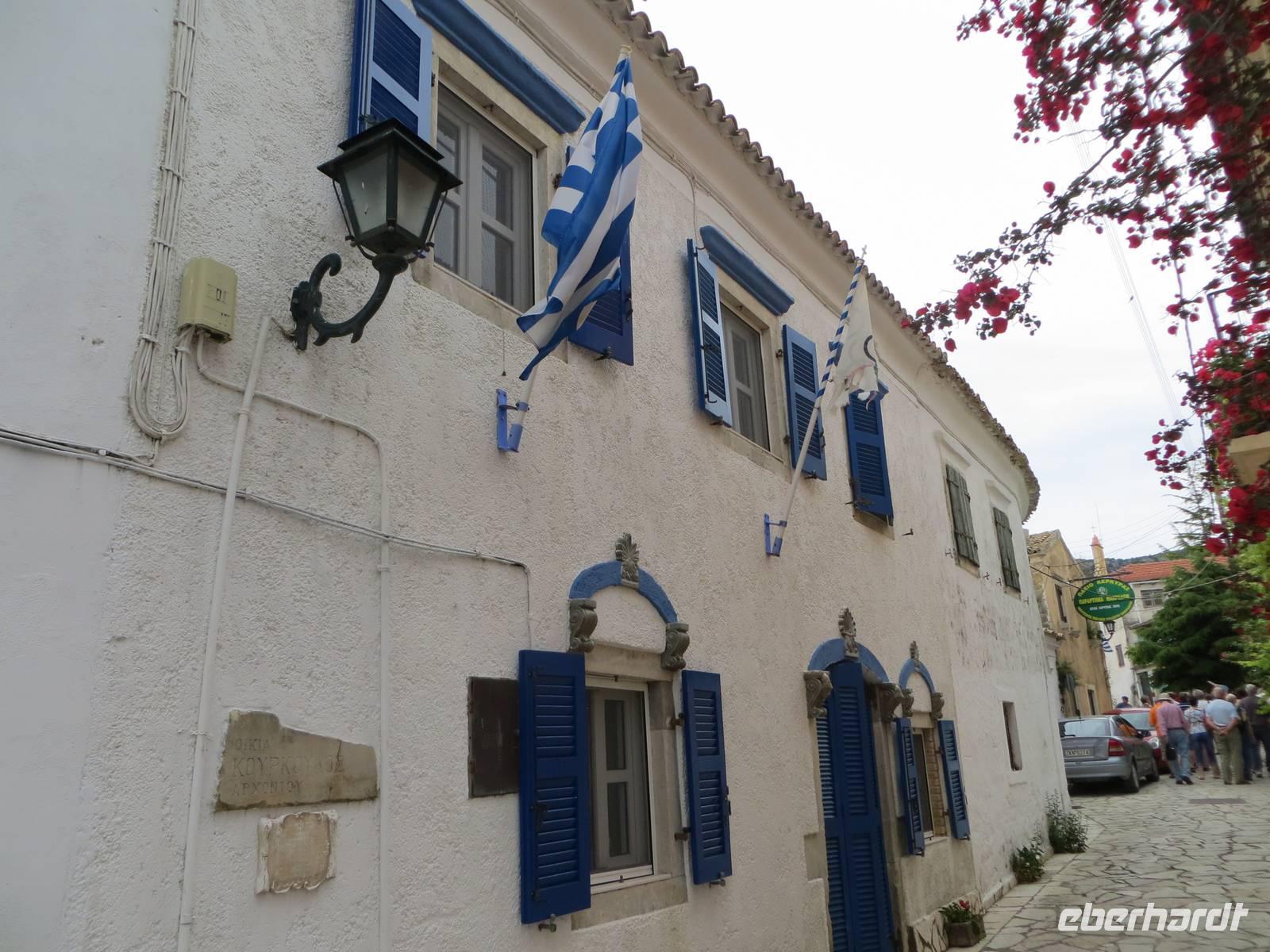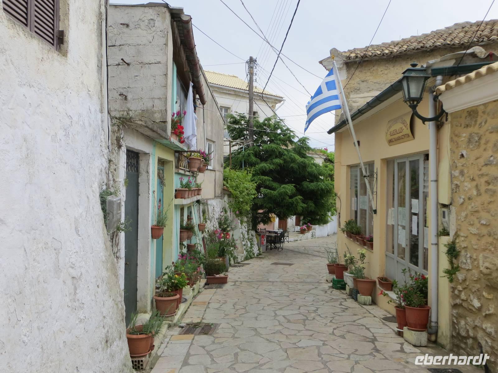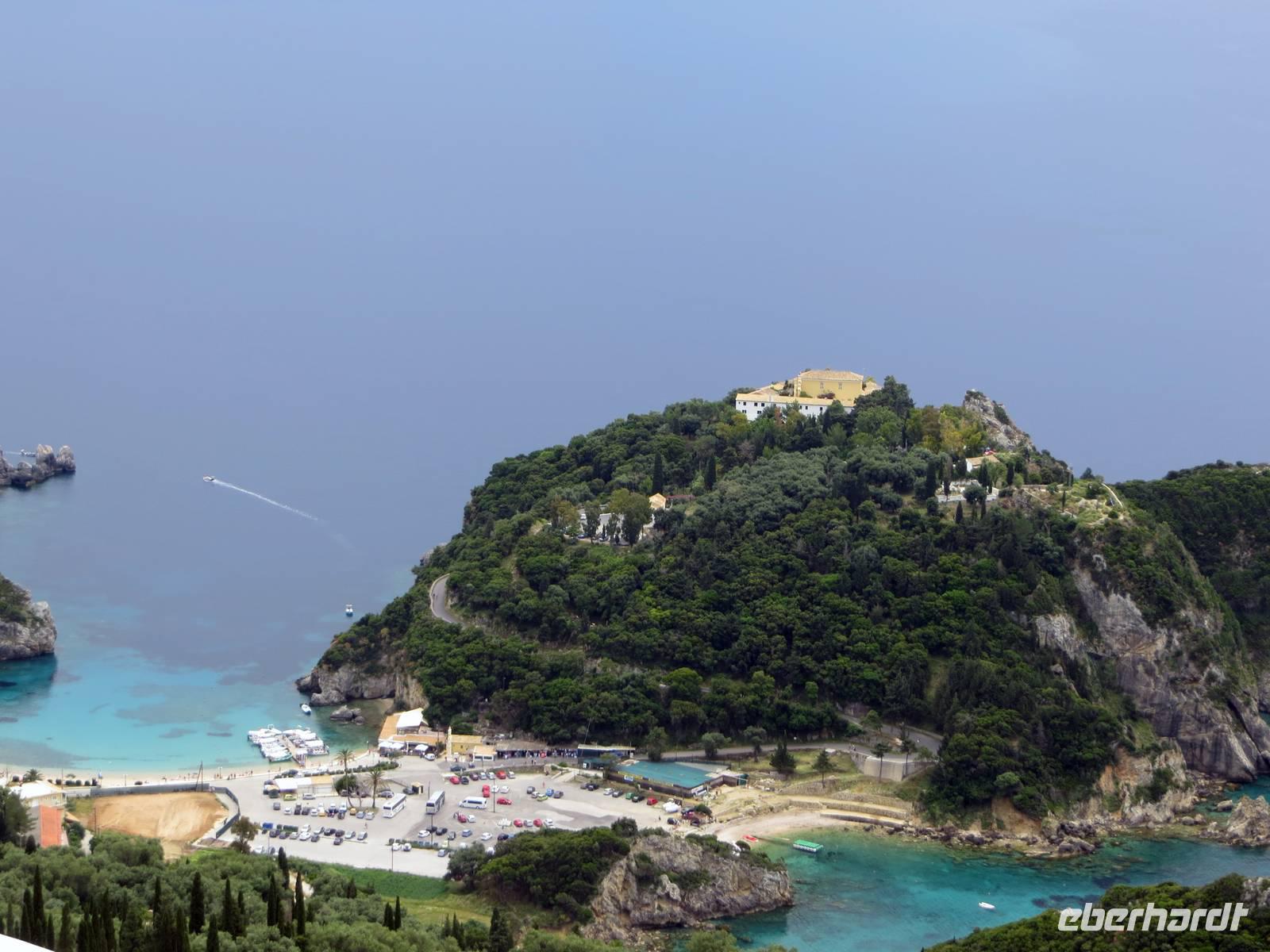 Alle Gäste, die mit Marion auf Inseltrundfahrt weilten, besuchten zuerst das Kloster Panagía Theotokós, das sich auf einem Bergsporn hoch über der kleinen Ortschaft Paleokastritsa befindet. Unsere örtliche Reiseleiterin Sissi berichtete über die Arbeit des Klosters und besuchte mit uns die Klosterkirche aus dem 18. Jahrhundert. Anschließend erfreuten wir uns mit dem Blick in die Bucht des Ortes hinüber zum "versteinerten Schiff" von Odysseus. Vom Aussichtspunkt Bella Vista bot sich uns ein Panoramablick auf die Westküste der Insel Korfu. Im Bergdorf Makrades erhielten wir einen Einblick in das einfache Leben auf dem Land. Sissi berichtete, welche Rolle ein Kafeion in der Dorfgemeinschaft besitzt. Zudem erfuhren wir Wissenswertes zum Zusammenhalt einer Familie auf der Insel. Im Pumphouse in Acharavi kehrten wir zu einer Stärkung ein: schmackhaftes Zaziki auf Tomaten, Gurken und Oliven, Reis mit Gyros und Fleisch, Kaffee und frische Früchte. Vorbei am mit 906 Metern höchsten Berg Korfus, dem Pantokrator, kehrten wir entlang der Küste in die Inselmetropole zurück. Sissi berichtete unterwegs über Schriftsteller, die auf Korfu lebten, sowie über Filmarbeiten zu den James-Bond-Filmen.