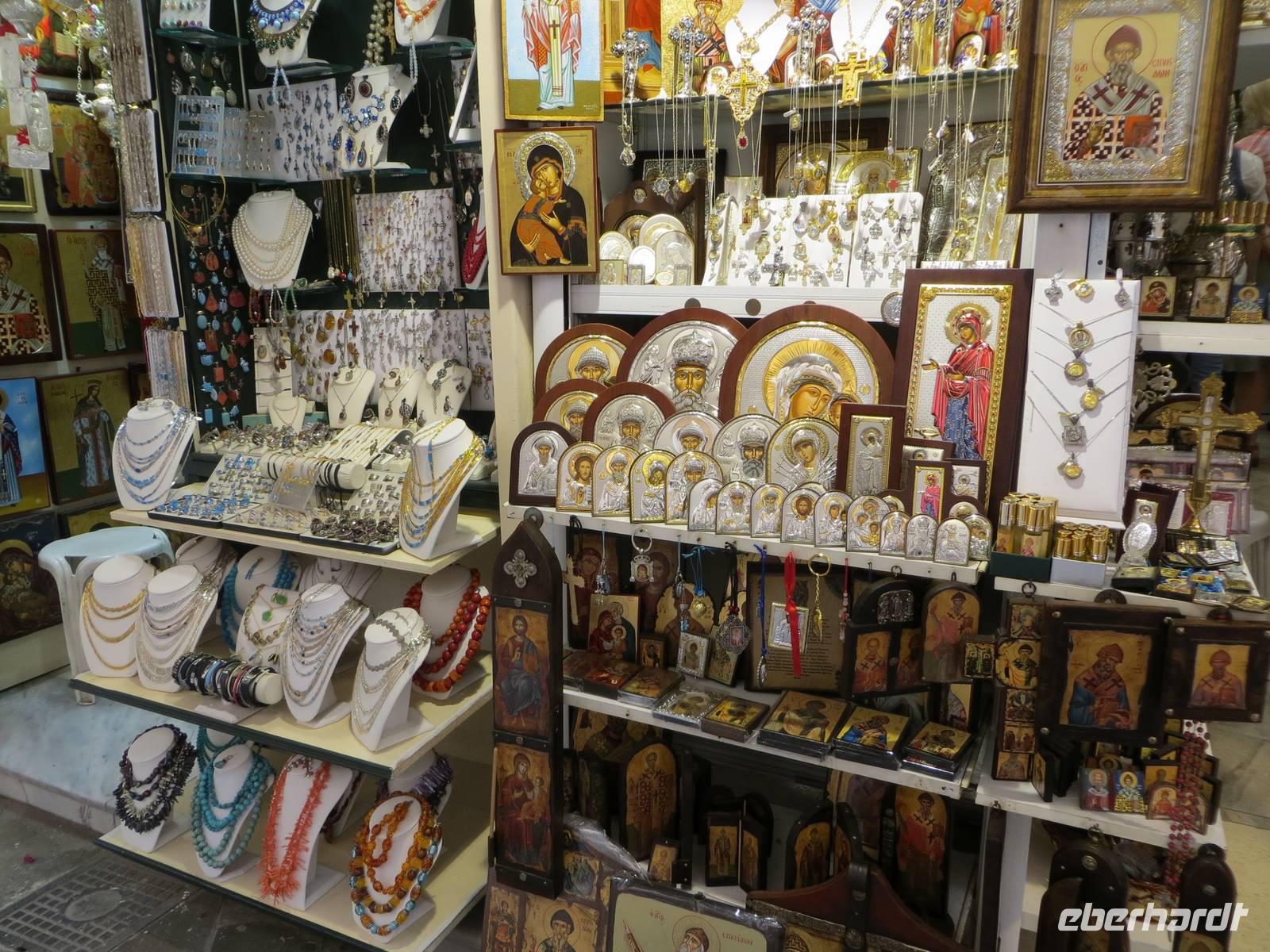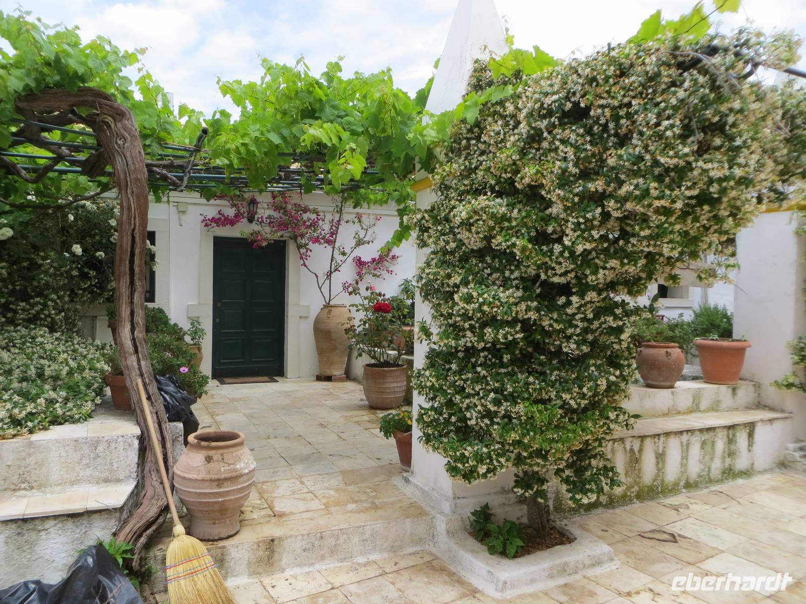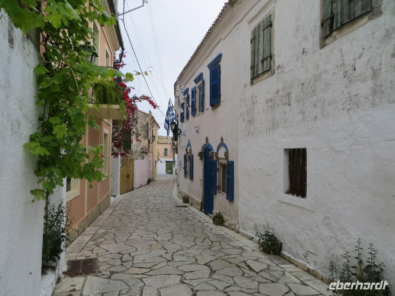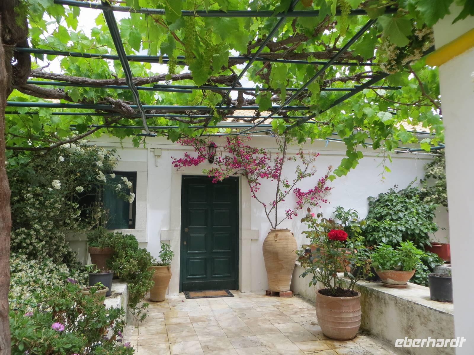 Alle Gäste, die mit Marion auf Inseltrundfahrt weilten, besuchten zuerst das Kloster Panagía Theotokós, das sich auf einem Bergsporn hoch über der kleinen Ortschaft Paleokastritsa befindet. Unsere örtliche Reiseleiterin Sissi berichtete über die Arbeit des Klosters und besuchte mit uns die Klosterkirche aus dem 18. Jahrhundert. Anschließend erfreuten wir uns mit dem Blick in die Bucht des Ortes hinüber zum "versteinerten Schiff" von Odysseus. Vom Aussichtspunkt Bella Vista bot sich uns ein Panoramablick auf die Westküste der Insel Korfu. Im Bergdorf Makrades erhielten wir einen Einblick in das einfache Leben auf dem Land. Sissi berichtete, welche Rolle ein Kafeion in der Dorfgemeinschaft besitzt. Zudem erfuhren wir Wissenswertes zum Zusammenhalt einer Familie auf der Insel. Im Pumphouse in Acharavi kehrten wir zu einer Stärkung ein: schmackhaftes Zaziki auf Tomaten, Gurken und Oliven, Reis mit Gyros und Fleisch, Kaffee und frische Früchte. Vorbei am mit 906 Metern höchsten Berg Korfus, dem Pantokrator, kehrten wir entlang der Küste in die Inselmetropole zurück. Sissi berichtete unterwegs über Schriftsteller, die auf Korfu lebten, sowie über Filmarbeiten zu den James-Bond-Filmen.