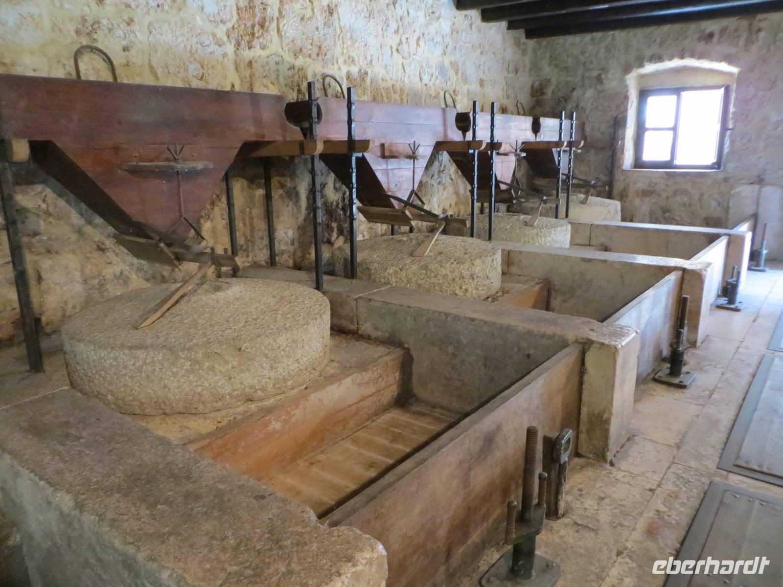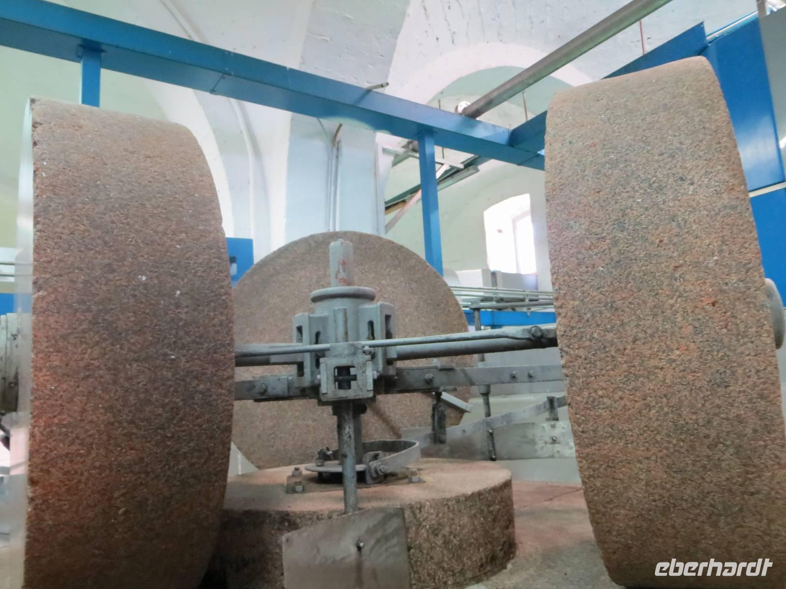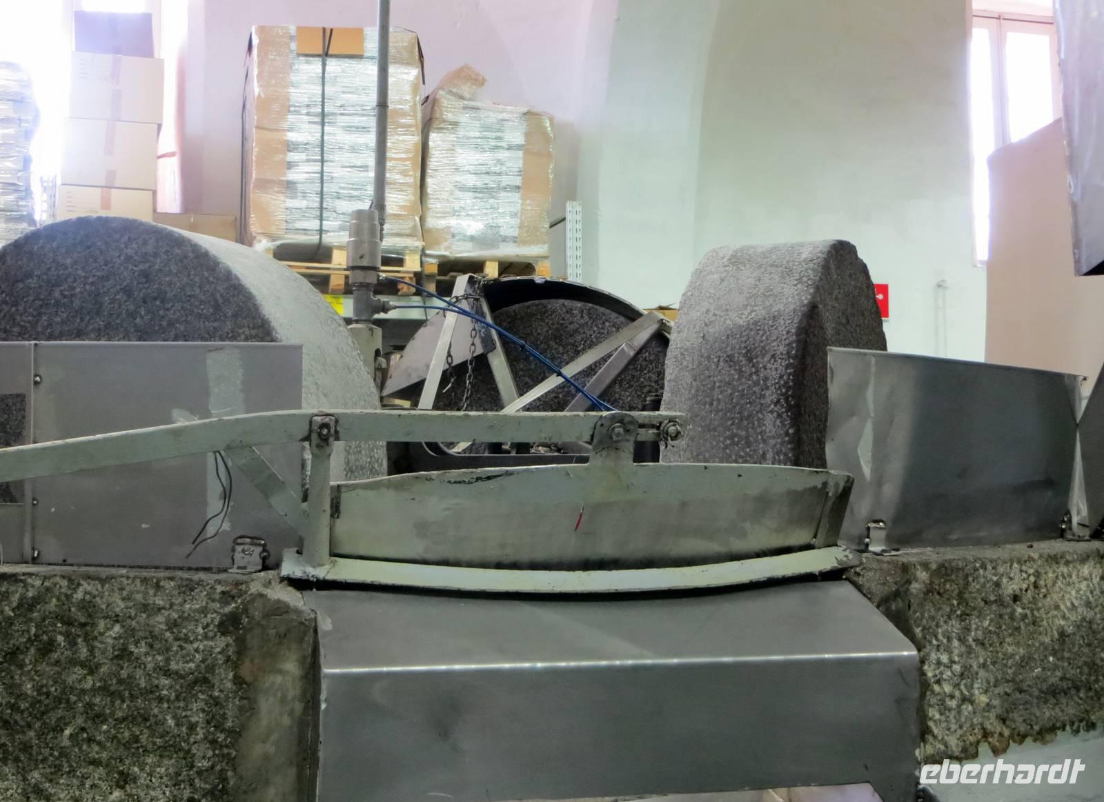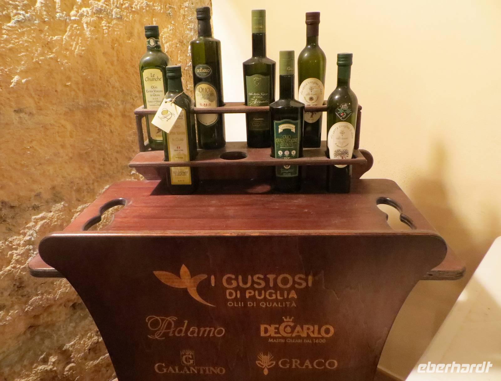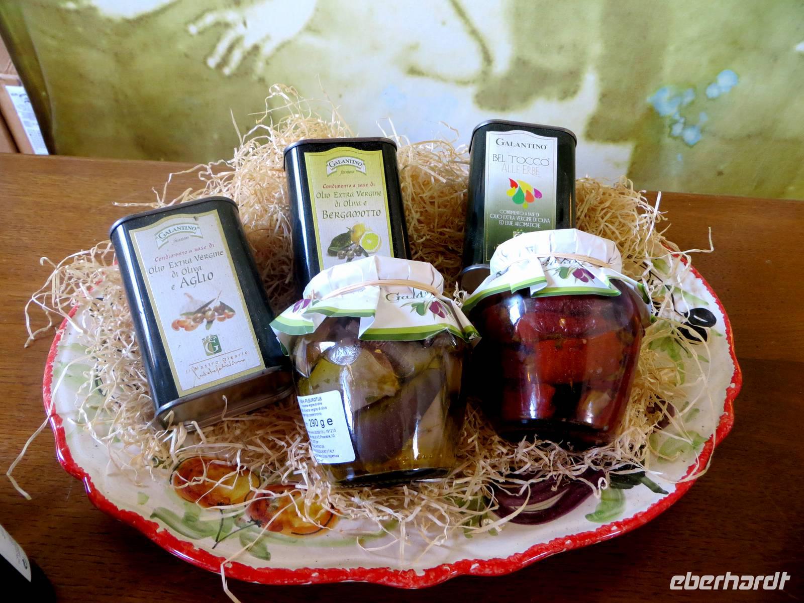 Apulien ist eines der Zentren der Olivenproduktion. Olivenbäume soweit wir blicken können auf riesigen, fast endlosen Plantagen. Sind Sie schon einmal durch einen Olivenbaumwald gefahren? Marion konnte dies mit ihren Gästen bewundern! Unsere örtliche Reiseleiterin Anna berichtete, dass hier 20 % der Weltproduktion und 40 % der Italiens gepresst werden. Wir stoppten an der Ölmühle „Galantino“, wo seit 1928 das „Gold Apuliens“ hergestellt wird. Der Marketingleiter führt uns durch die Räume der Mühle und weiht uns in die Geheimnisse der unterschiedlichen Arten ein. Zudem erfahren wir, wie der biolgische Kreislauf auffrechtgehalten wird. 3.990 kg brachte unsere Gruppe auf die LKW-Waage. Aus dieser Masse Oliven, könnten 57 Liter Öl gepresst werden. Natürlich ließen wir uns bei der Probe der Spezialtäten der Mühle nicht lange bitten: Wir kosteten Öl naturell, Öl mit Zitrone, Öl mit Balsamico, Öl mit Kräutern, Öl mit Knoblach, Öl mit Chilli ... eine Sorte köstlicher als die andere. So wanderten Flasche um Flasche, Kanister um Kanister, Karaffe um Karaffe in die Taschen der neuen Besitzer.