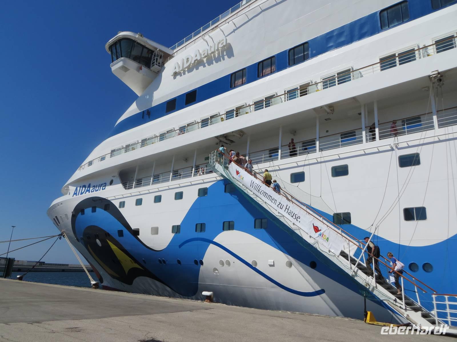 herzlichen Dank, dass Sie mit uns die Schönheiten der Adria mit AIDAaura entdeckt haben. Es war sehr angenehm mit Ihnen die Tage in Italien, Griechenland und Kroatien zu verbringen. Insgesamt haben wir mit dem Bus 1.998 Kilometer zurückgelegt. Mit AIDAaura kreuzten wir 1.293 Seemeilen (2.395 Kilometer) auf der Adria. Es hat uns viel Freude bereitet. Wir wünschen Ihnen beste Gesundheit und viel Reiselust!Besonders schön wäre es, wenn wir uns bei einer der Eberhardt-Reisen wiedersehen.