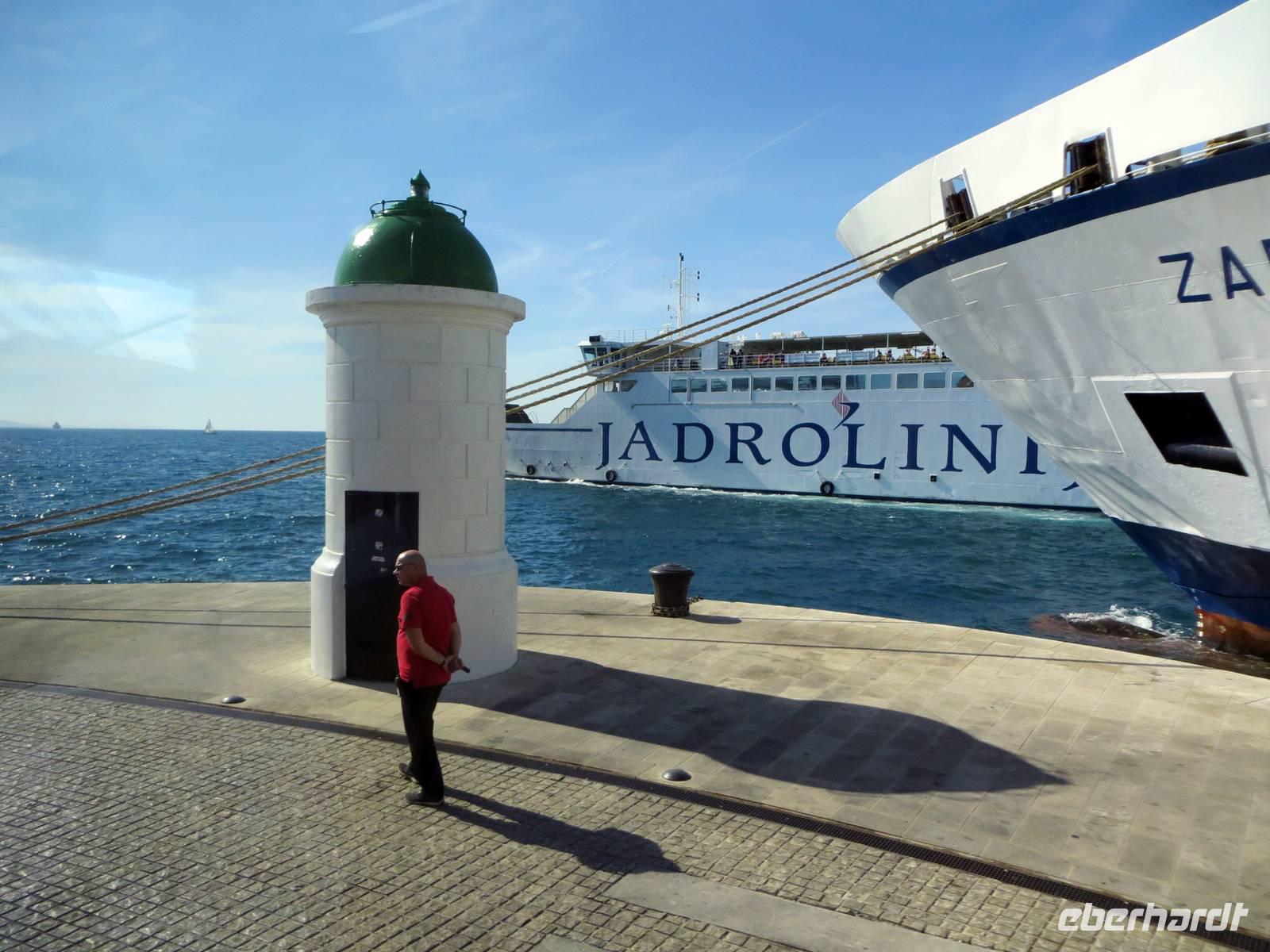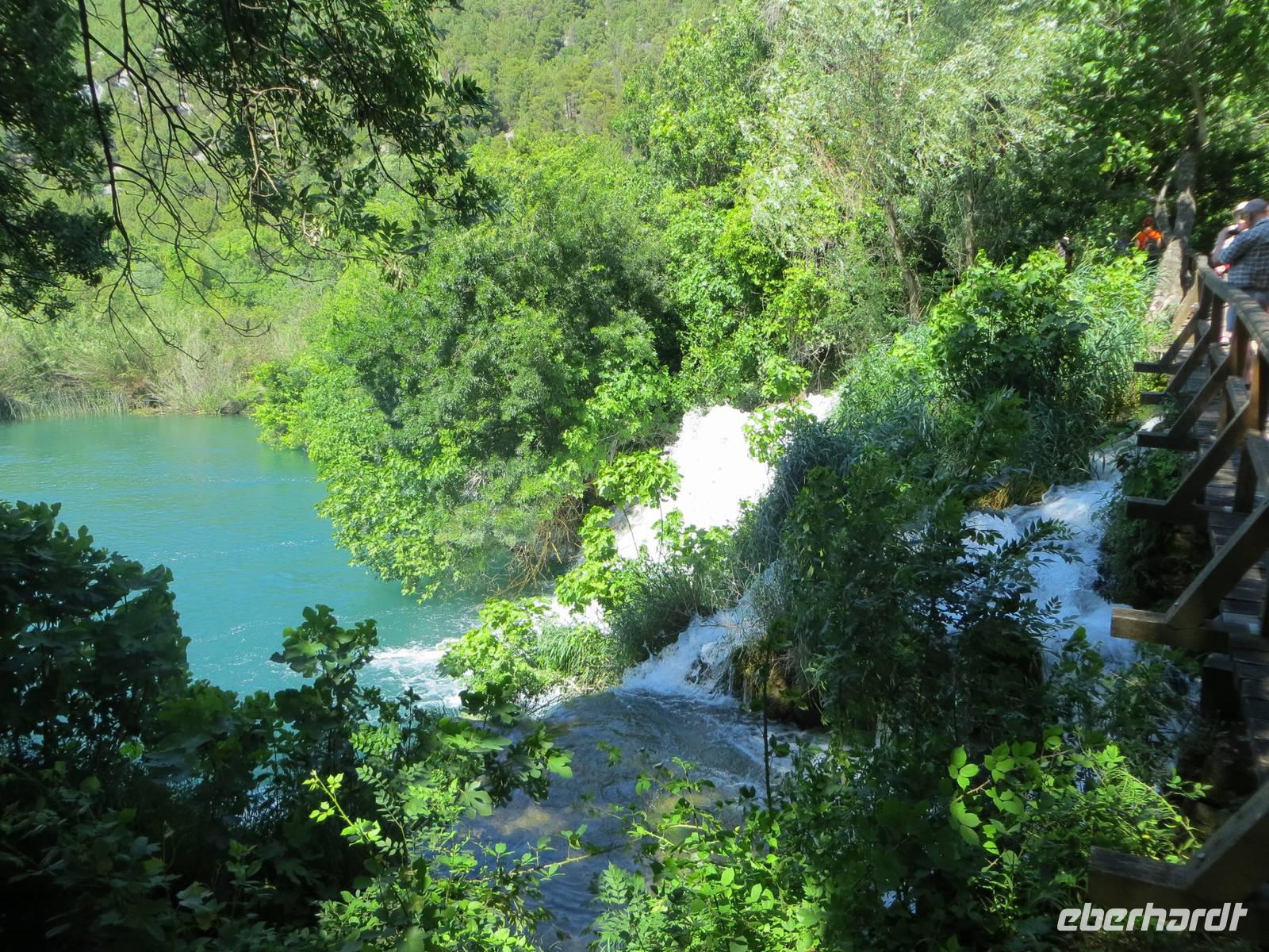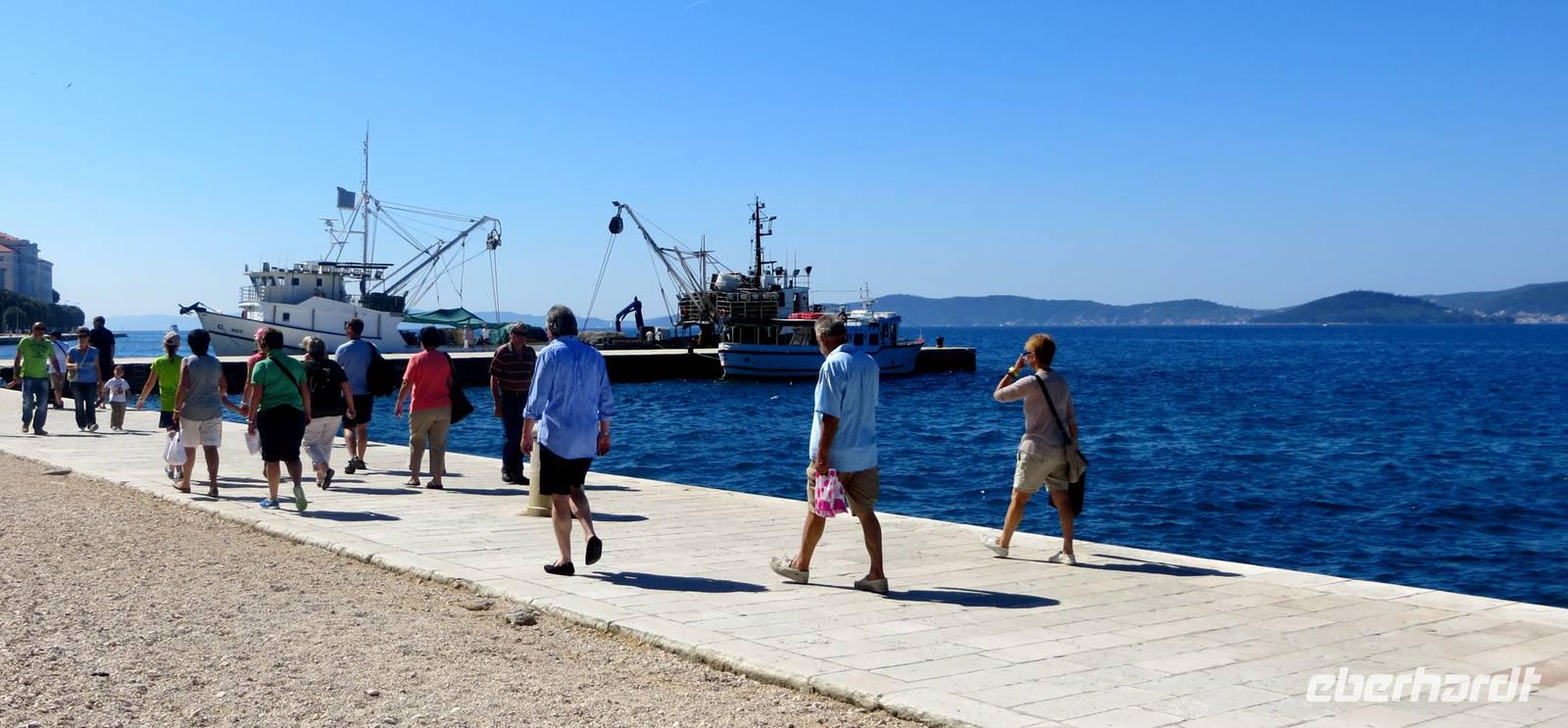 Hier standen die Busse für den zweiten Teil unseres Eberhardt-Inklusiv-Ausfluges bereit. Wir fuhren zum Naturparadies Krka-Wasserfälle. Über hölzerne Stege balancierten wir zuerst zu einer ehemaligen Wassermühle. Dann lag er vor uns und breitete seine natürliche Schönheit aus - der Skradinski Buk, der spektakulärste Wasserfall im Nationalpark. Über 17 Kaskaden und 45 Meter Höhe stürzte, rauschte und polderte das Wasser in die Tiefe. Nach einer Picknick-Pause an diesem eindrucksvollen Naturschauspiel spazierten wir im Nationalpark. Die Natur bot uns eine Fülle interessanter Beobachtungen: munter tummelten sich Fische im klaren Wasser, blaue Libellen tanzten in der heißen Luft, Vögel zwitscherten um die Wette, Frösche gaben ihr Konzert ... Nur einen haben wir nicht gesehen: Winnetou. Hier wurden Szenen der Filme „Der Ölprinz“ oder „Unter Geiern“ gedreht. Es störte nicht. Die Natur war umso schöner und beeindruckender. Gern wären wir noch etwas hier geblieben ... aber 17.30 Uhr war „Alle Mann an Bord“ und diese Zeit ist für alle Kreuzfahrer Gesetz. Da wir die neue Autobahn nehmen konnten, blieb uns noch etwas Zeit zu einem Bummel in der nachmittäglichen Sonne an der Uferpromenade Zadars.