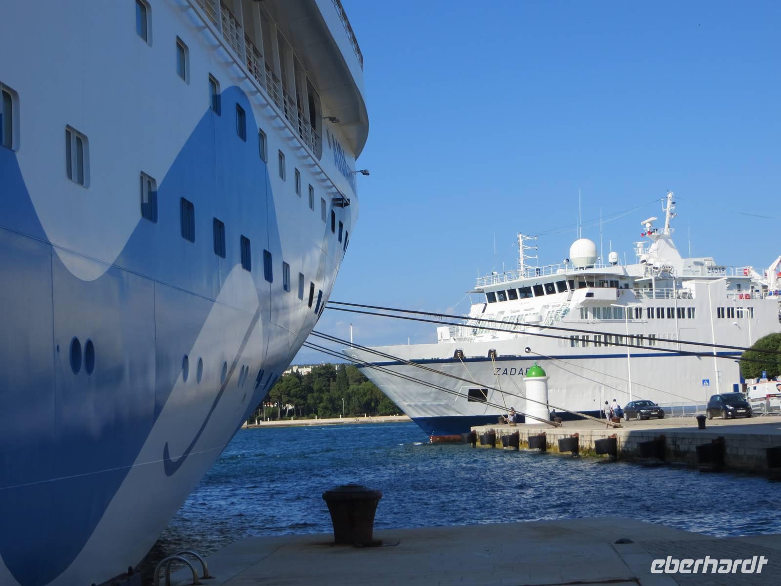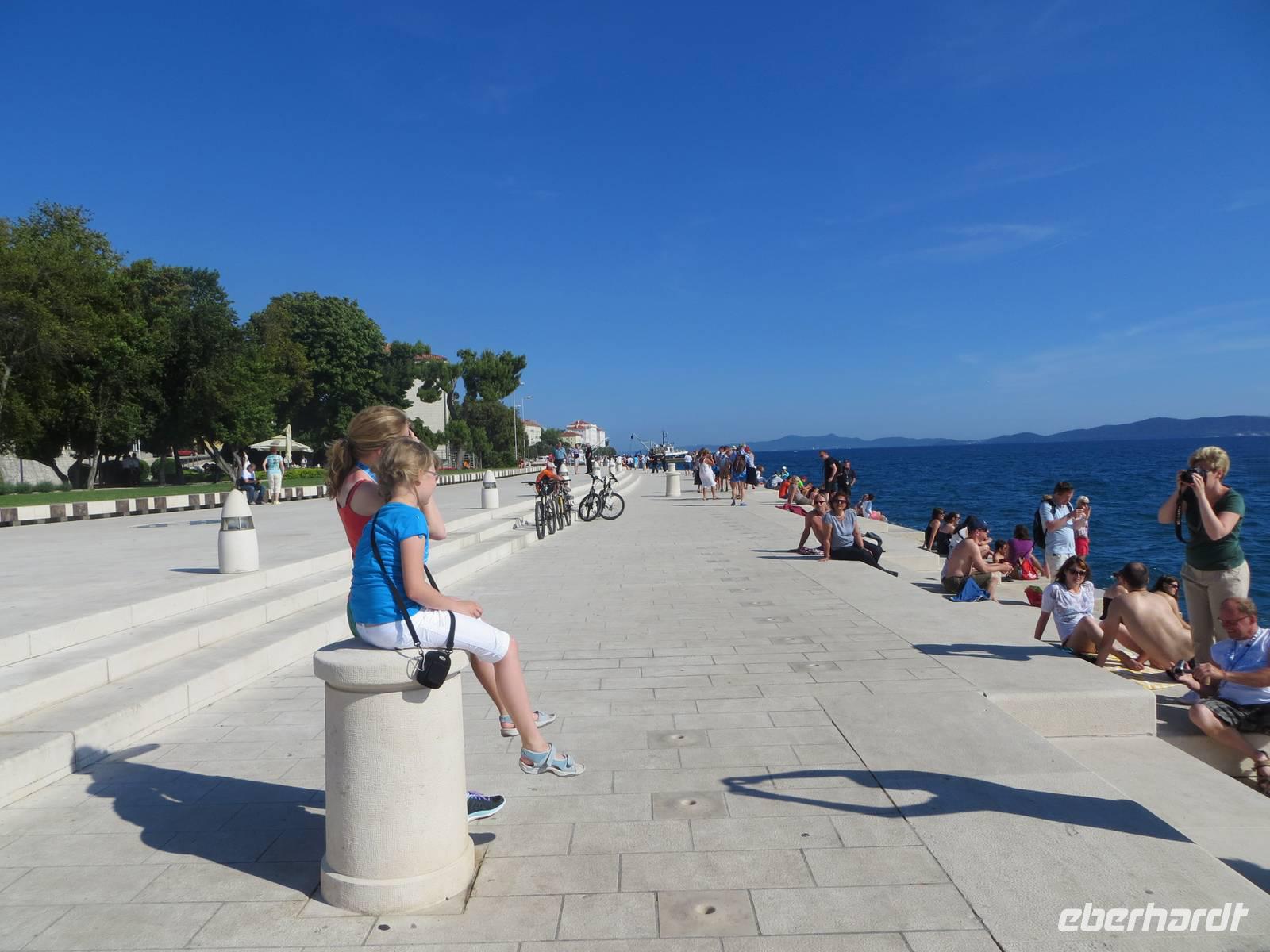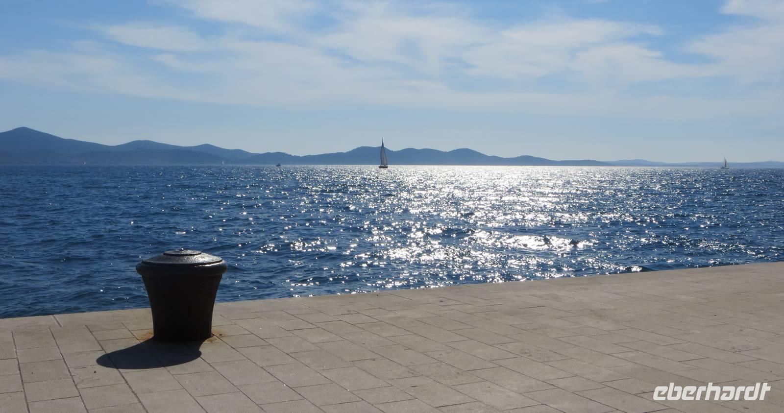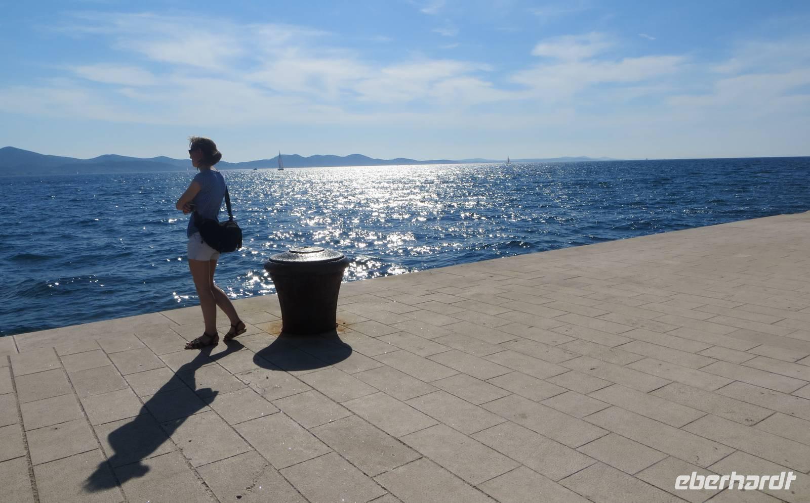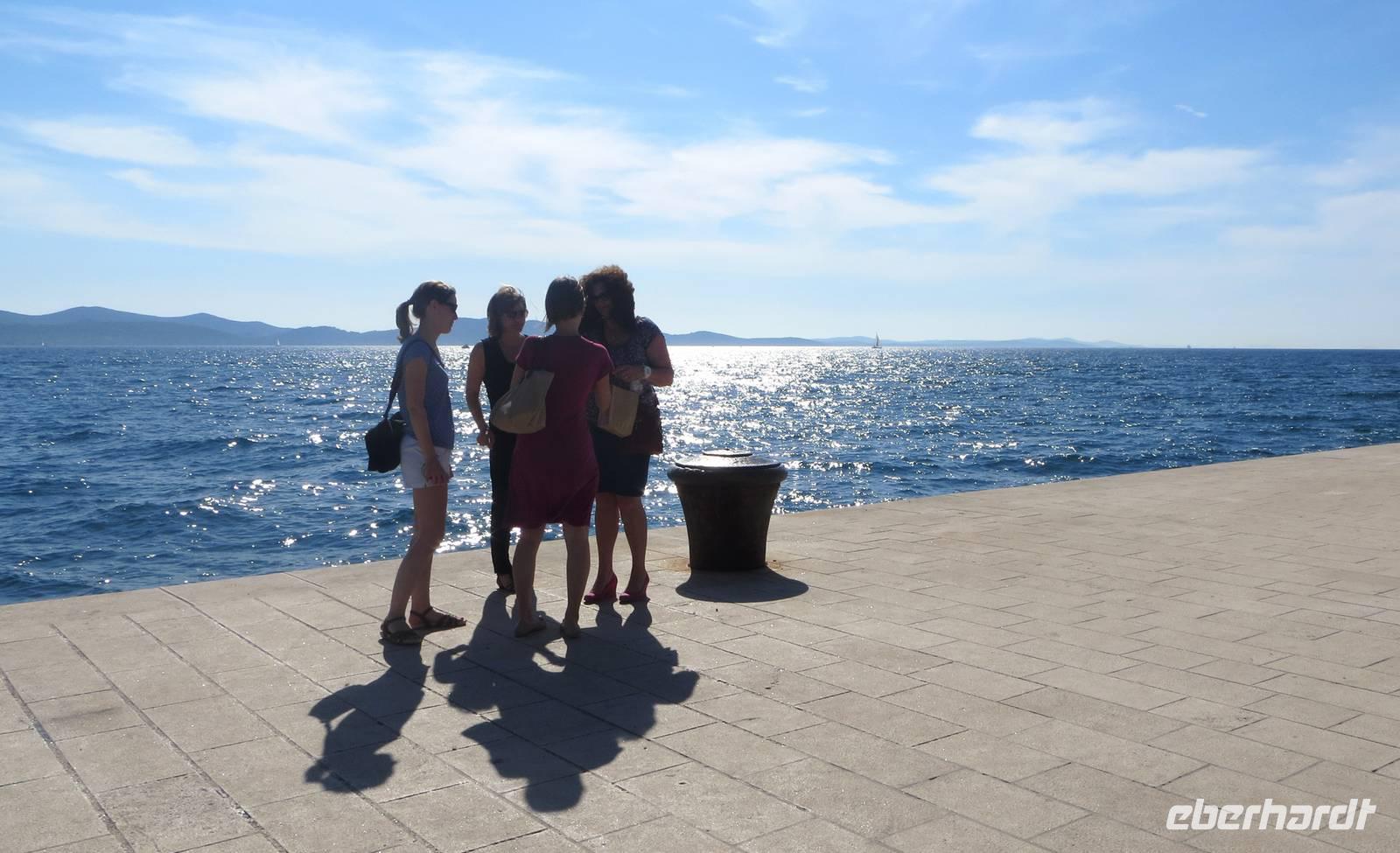Auch diese Nacht war ruhig. Eigentlich merkten wir gar nicht, dass wir mit einem Schiff unterwegs sind. Die AIDAaura hatte Kurs auf Norddalmatien genommen. Am Morgen erreichten wir eine der ältesten Städte Kroatiens, Zadar. Unser Schiff lag direkt an der modernen Uferpromenade. So holten uns unsere beiden örtlichen Reiseleiterinnen Julia und Ivana direkt im Hafen ab. Zuerst besichtigten wir die Licht- und die Meeresorgel. Wir lauschten den Melodien des Meeres!