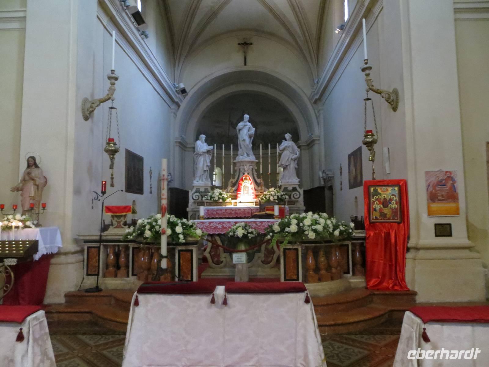In der Nacht hatten wir unsere Uhr wieder eine Stunde zurückgestellt. Nach dem Frühstück verfolgten wir die Einfahrt in den Hafen von Bari. Von hier verkehren Fähren nach Griechenland, Zypern, Kroatien ... Zudem ist es ein bedeutender Handelshafen. Gemeinsam mit einer stolzen Gruppe von Eberhardt-Reisegästen stand heute für Maria die Entdeckung der Hauptstadt Apuliens auf dem Programm. Nach einer kurzen Orientierungsfahrt entlang der Einkaufsstraße Corso Cavour mit dem stattlichen Teatro Petruzelli sowie entlang des „Lungomare“ mit dem Yachthafen mit vielen Bauwerken im viktorianischen Stil Mussolinis bis zum Stadtstrand „Pane e Pomodoro“ erreichten wir die Piazza Ferrarese, wo wir unseren Stadtspaziergang durch Bari begannen. Die örtliche Reiseleiterin Elke erläuterte viel zu den historischen Gebäuden, sowie zur Geschichte Apuliens und Bari. Die Innenbesichtigungen zweier bedeutender Kirchen Baris bleiben uns sicher in Erinnerung. Zum Einen bewunderten wir die im Stil der Romanik im 11./12. Jahrhundert errichtete Basilika San Nicola, einschließlich der Krypta, und zum Anderen führte uns unser Spaziergang zur Kathedrale von Bari, welche auch als Kirche von San Sabino bekannt ist. Hier fand gerade eine Hochzeit statt. Nach unserem Rundgang durch die Gassen der Altstadt hatten wir uns eine typisch italienische Erfrischung verdient.