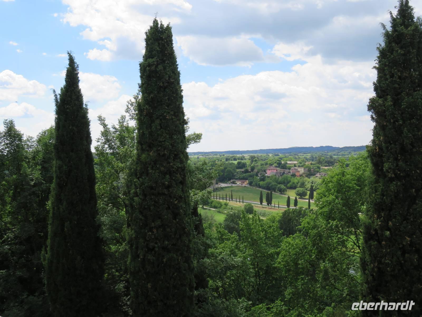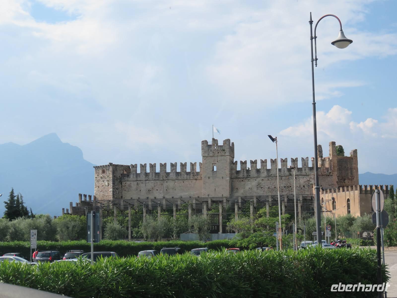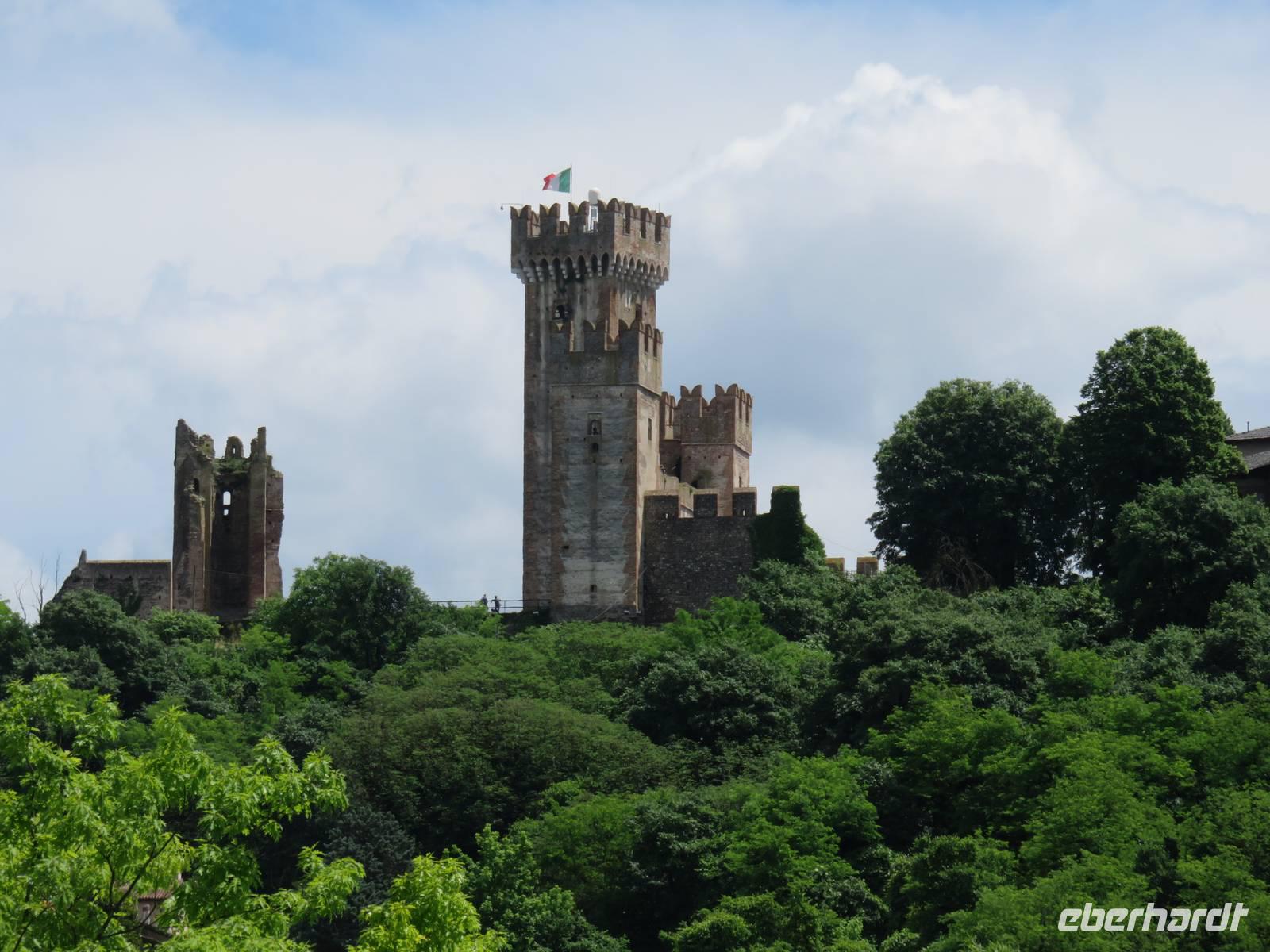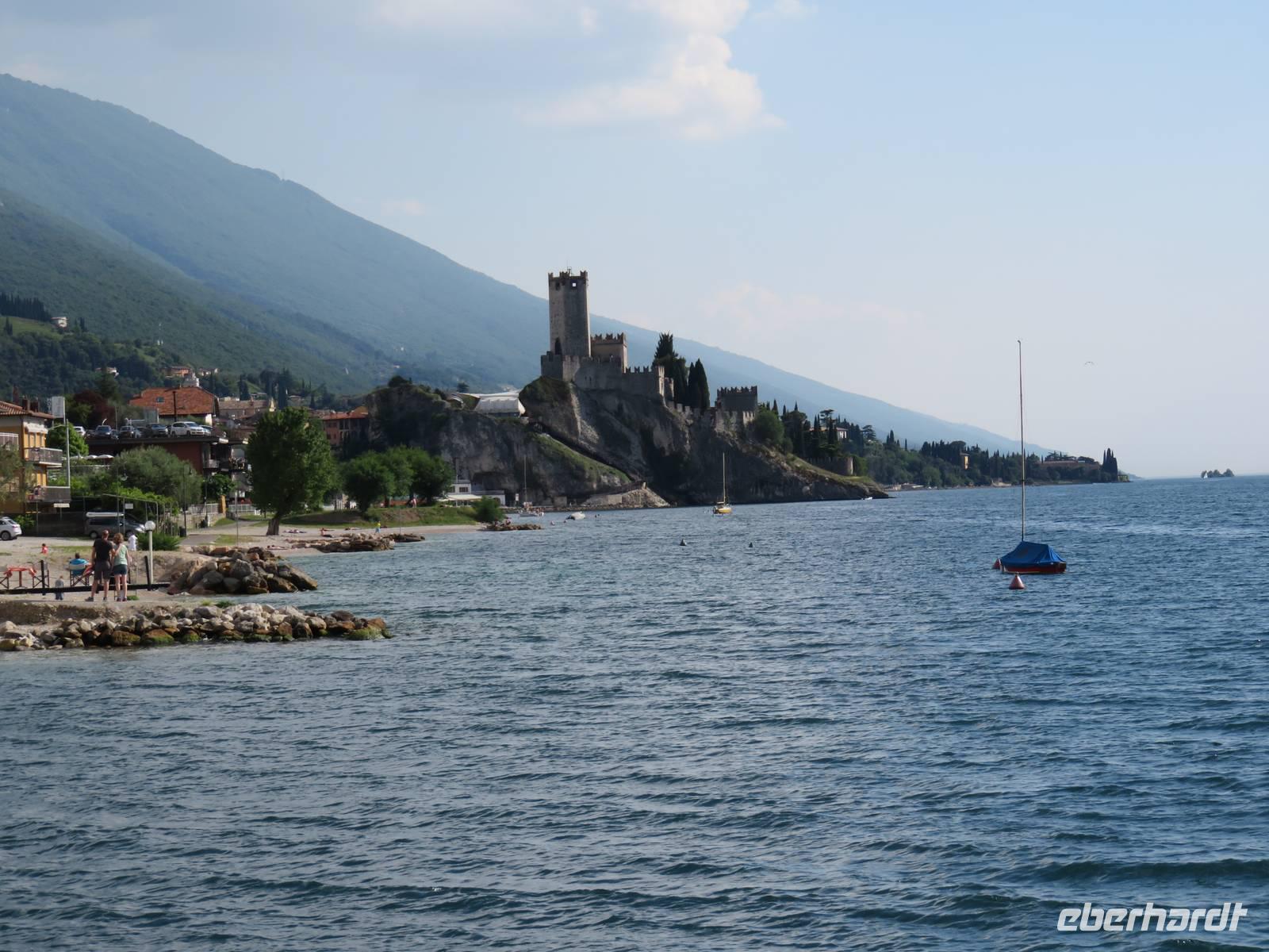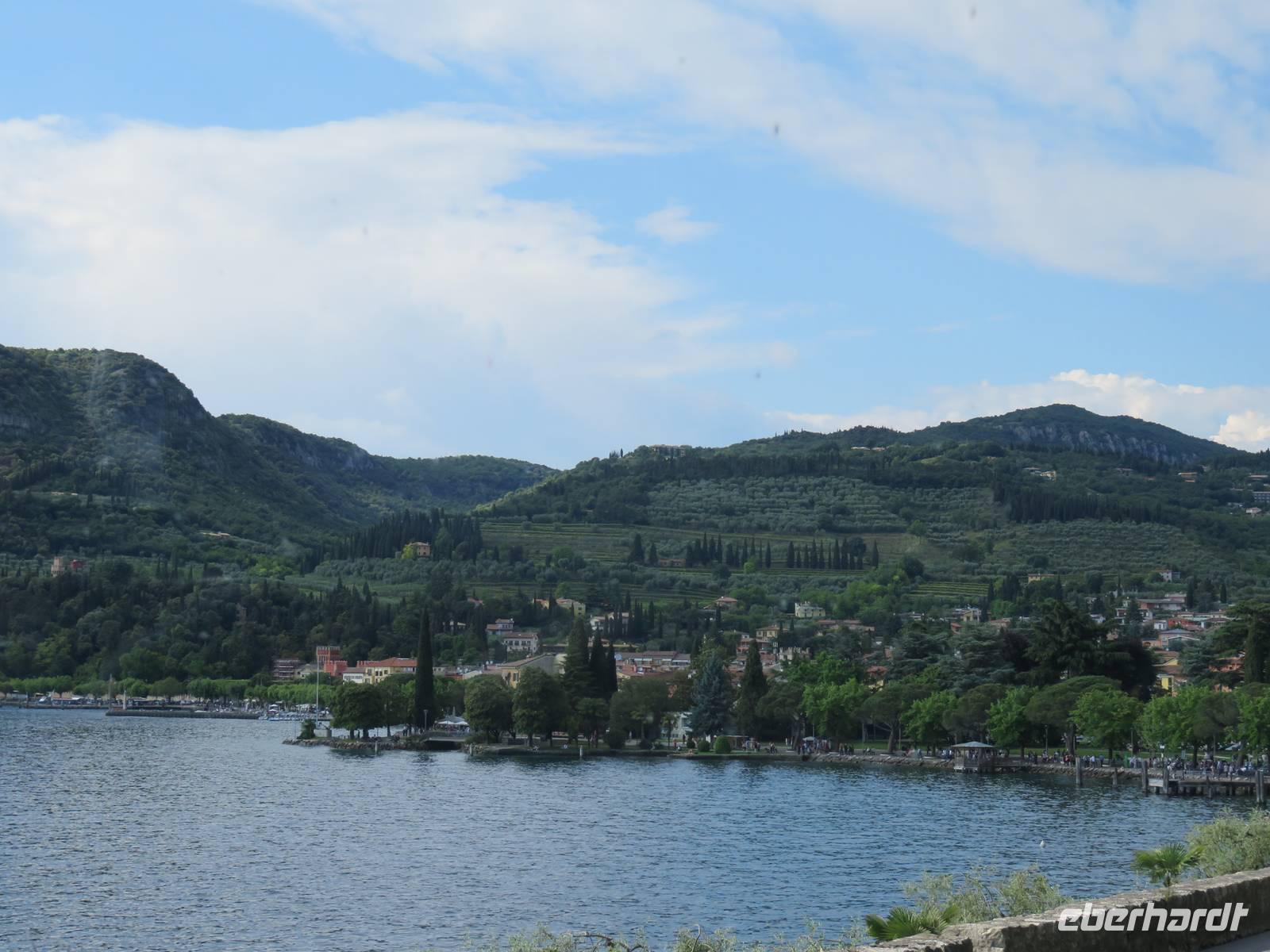 Heute hieß es nun Abschied nehmen von unserem schwimmenden Hotel. Die Busse standen kurz pünktlich zur Abfahrt bereit. Erste Station unseres Programms war der kleine Ort Borghetto südlich des Gardasees. Hier teilt sich der Mincio, der Abflusss des Gardasees, in mehrere Arme, deshalb ist der Ort prädestiniert für Wassermühlen. Die historischen Gebäude und Brücken lockten viele Touristen an. Gaststätten und Cafes luden uns bei herrlichem Wetter unter hohen Bäumen zur kurzen Mittagspause ein. Anschließend besuchten wir den Parco Sigurta in Valeggio. Mit der Parkbahn fuhren wir ca. 1 h durch das Gartenparadies, das private Eigentümer über viele Jahrhunderte gestaltet und seit 1978 für die Öffentlichkeit zugänglich gemacht haben. Heute zählt die weitläufige Anlage zu den schönsten der Welt. Große Rasenflächen, Rosengärten, Sträucher und Bäume in den vielfältigsten Formen, kleine Kirchen und Pavillions, ein Bauernhof und unzählige Blumenrabatten boten uns immer wieder neue Sichtachsen und Ausblicke. Von der sehenswerten Anlage konnten wir nur einen Überblick mitnehmen, es lohnt ein weiterer längerer Besuch. Auf der Weiterfahrt überreichten die Reiseleiterinnen das Gruppenfoto mit dem Kapitän der AIDAvita an die Gäste. Die Fahrt führte uns diesmal direkt am östlichen Ufer des Gardasees entlang durch die bekannten Touristenorte Lazise, Bardolino, Garda, Malcesine bis nach Torbole. Herrliches Wetter bescherte uns eine wunderschöne Panoramafahrt mit tollen Ausblicken auf die Wasserflächen mit ihren Sportmöglichkeiten, die Strände und die umliegenden Berglandschaften. Vom Nordufer des Sees aus fuhren wir in Richtung Calliano in die Region Trentin zu unserer Zwischenübernachtung. Calliano ist ein kleiner Ort unweit der Autobahn. Im „Villaggio Hotel Aguila", einem traditionsreichen, seit mehreren Generationen familiengeführten Haus in landestypischem Charme bezogen wir unsere Zimmer für die Übernachtung. Vom Hotel aus hatten wir abends einen herrlichen Blick auf das über dem Ort thronende und abends hell erleuchtete Castell Beseno.