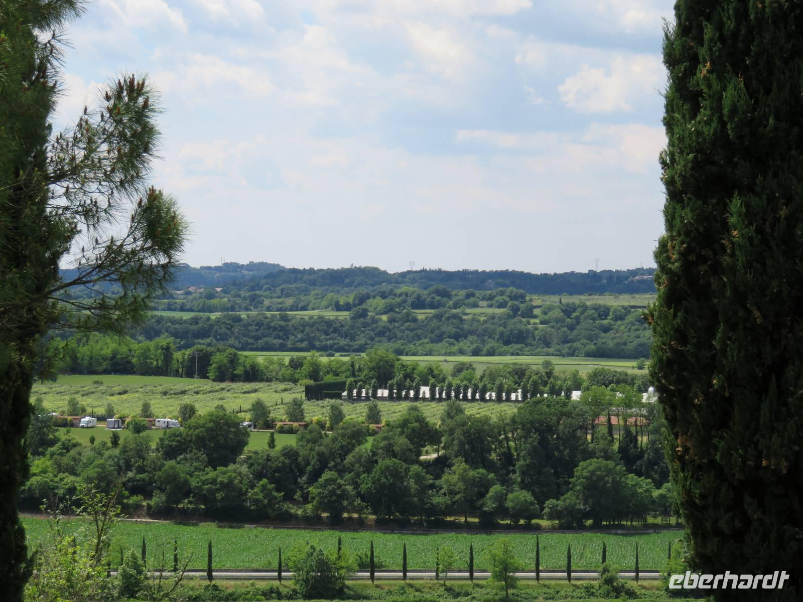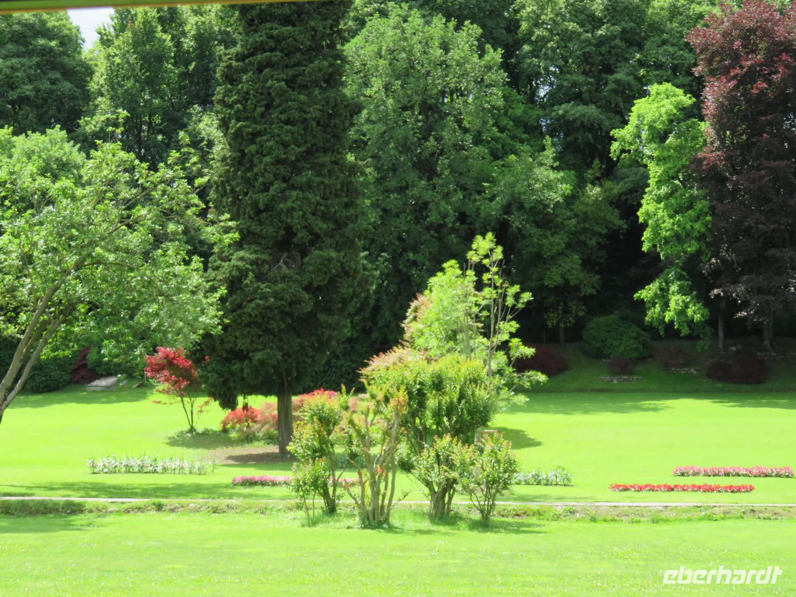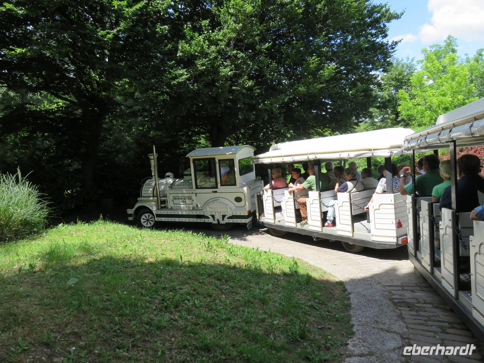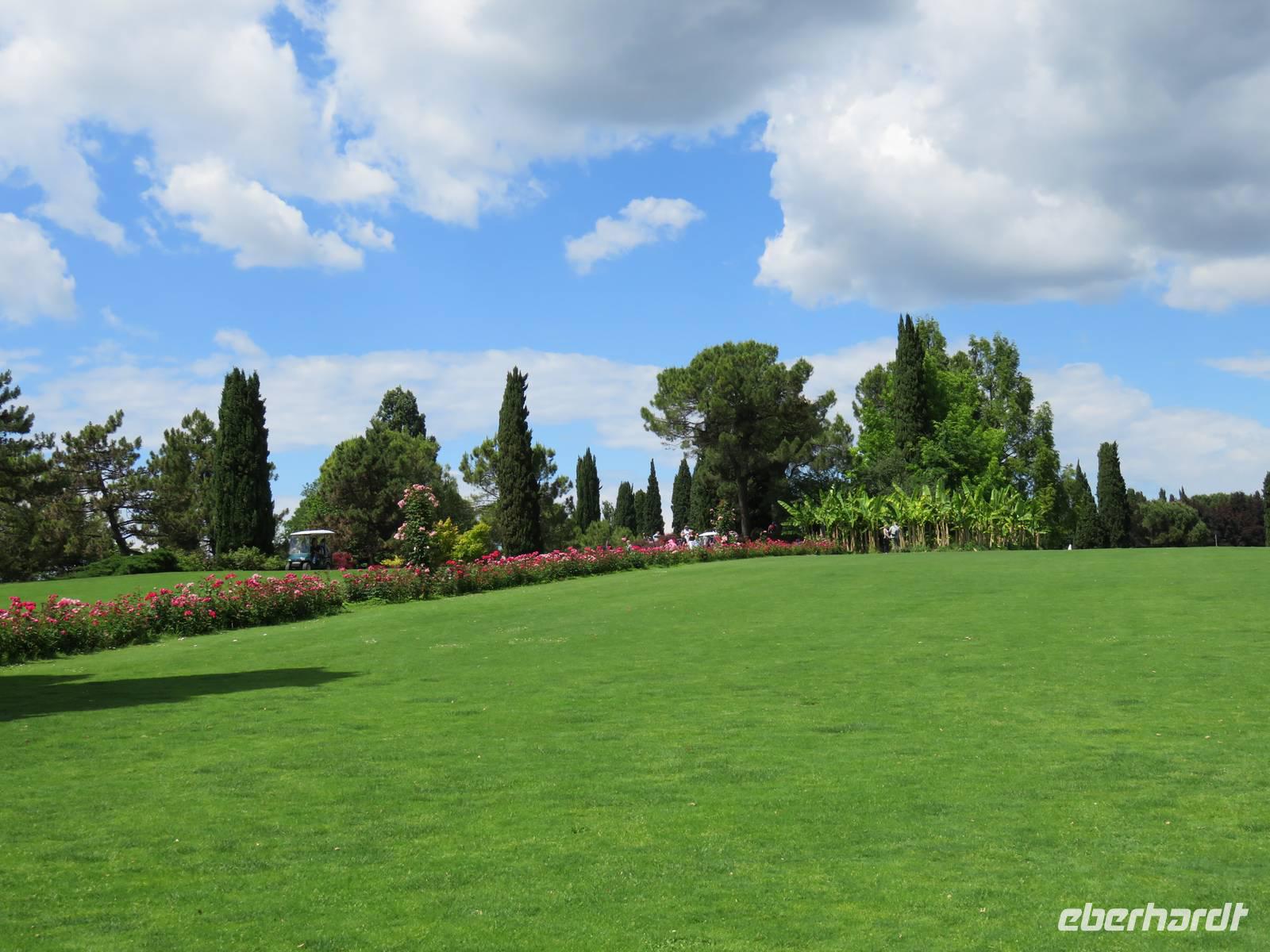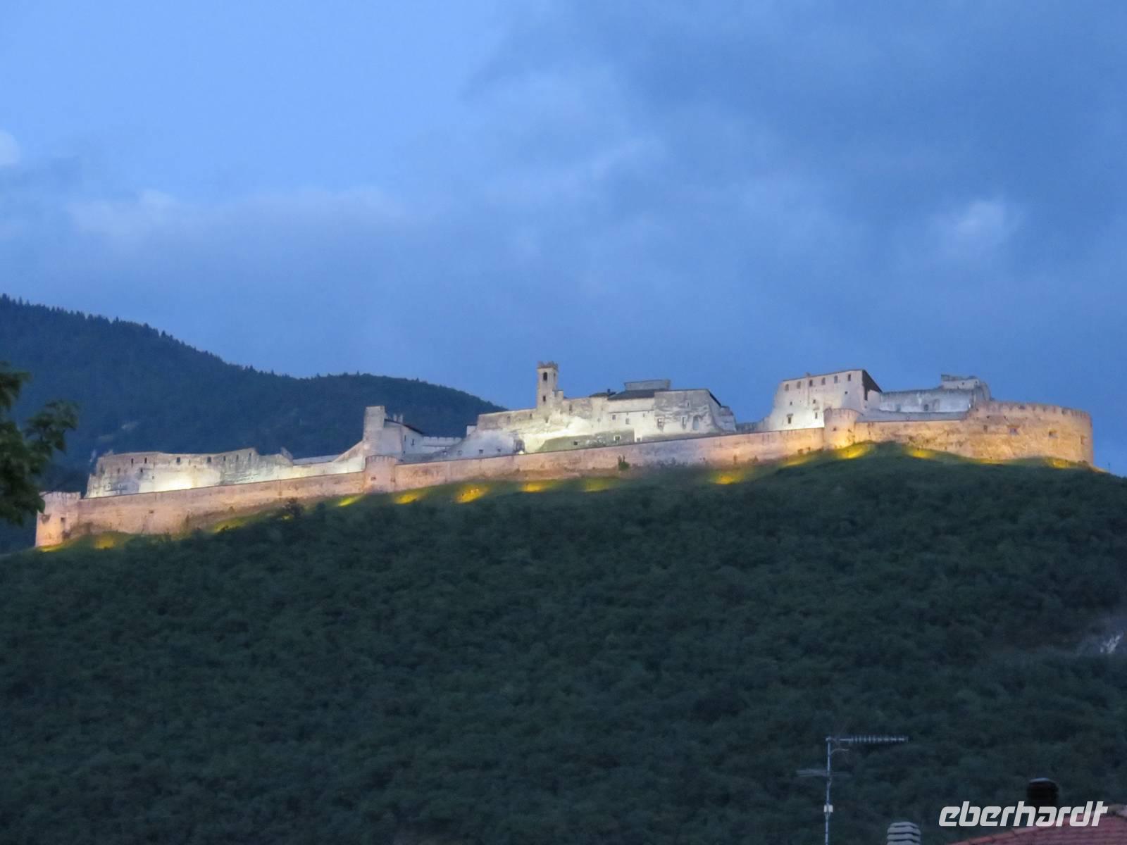 Heute hieß es nun Abschied nehmen von unserem schwimmenden Hotel. Die Busse standen kurz pünktlich zur Abfahrt bereit. Erste Station unseres Programms war der kleine Ort Borghetto südlich des Gardasees. Hier teilt sich der Mincio, der Abflusss des Gardasees, in mehrere Arme, deshalb ist der Ort prädestiniert für Wassermühlen. Die historischen Gebäude und Brücken lockten viele Touristen an. Gaststätten und Cafes luden uns bei herrlichem Wetter unter hohen Bäumen zur kurzen Mittagspause ein. Anschließend besuchten wir den Parco Sigurta in Valeggio. Mit der Parkbahn fuhren wir ca. 1 h durch das Gartenparadies, das private Eigentümer über viele Jahrhunderte gestaltet und seit 1978 für die Öffentlichkeit zugänglich gemacht haben. Heute zählt die weitläufige Anlage zu den schönsten der Welt. Große Rasenflächen, Rosengärten, Sträucher und Bäume in den vielfältigsten Formen, kleine Kirchen und Pavillions, ein Bauernhof und unzählige Blumenrabatten boten uns immer wieder neue Sichtachsen und Ausblicke. Von der sehenswerten Anlage konnten wir nur einen Überblick mitnehmen, es lohnt ein weiterer längerer Besuch. Auf der Weiterfahrt überreichten die Reiseleiterinnen das Gruppenfoto mit dem Kapitän der AIDAvita an die Gäste. Die Fahrt führte uns diesmal direkt am östlichen Ufer des Gardasees entlang durch die bekannten Touristenorte Lazise, Bardolino, Garda, Malcesine bis nach Torbole. Herrliches Wetter bescherte uns eine wunderschöne Panoramafahrt mit tollen Ausblicken auf die Wasserflächen mit ihren Sportmöglichkeiten, die Strände und die umliegenden Berglandschaften. Vom Nordufer des Sees aus fuhren wir in Richtung Calliano in die Region Trentin zu unserer Zwischenübernachtung. Calliano ist ein kleiner Ort unweit der Autobahn. Im „Villaggio Hotel Aguila", einem traditionsreichen, seit mehreren Generationen familiengeführten Haus in landestypischem Charme bezogen wir unsere Zimmer für die Übernachtung. Vom Hotel aus hatten wir abends einen herrlichen Blick auf das über dem Ort thronende und abends hell erleuchtete Castell Beseno.
