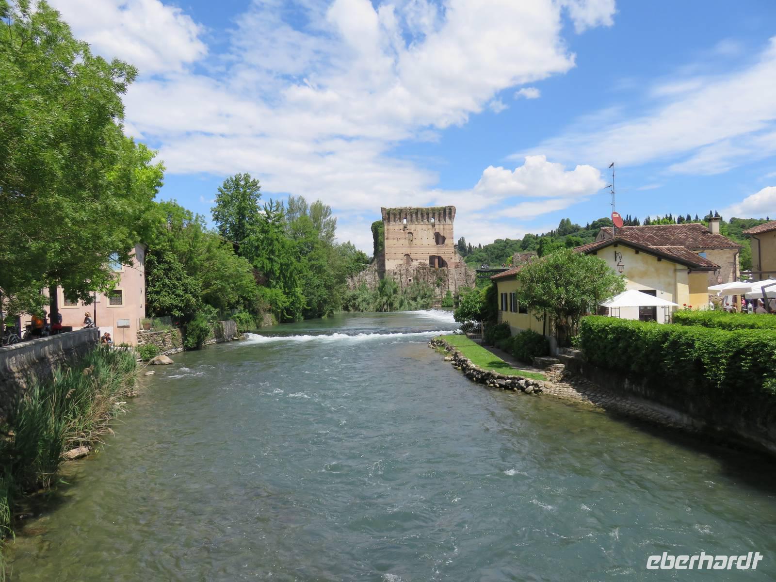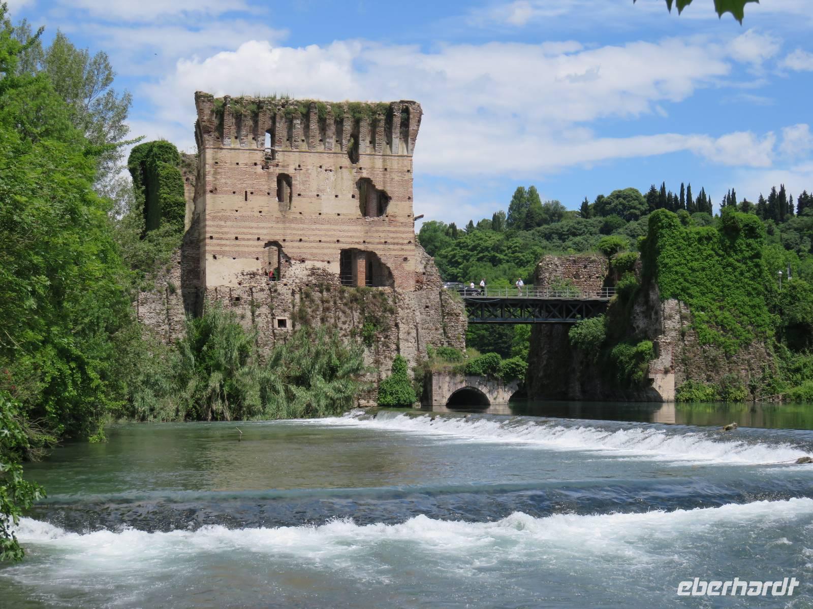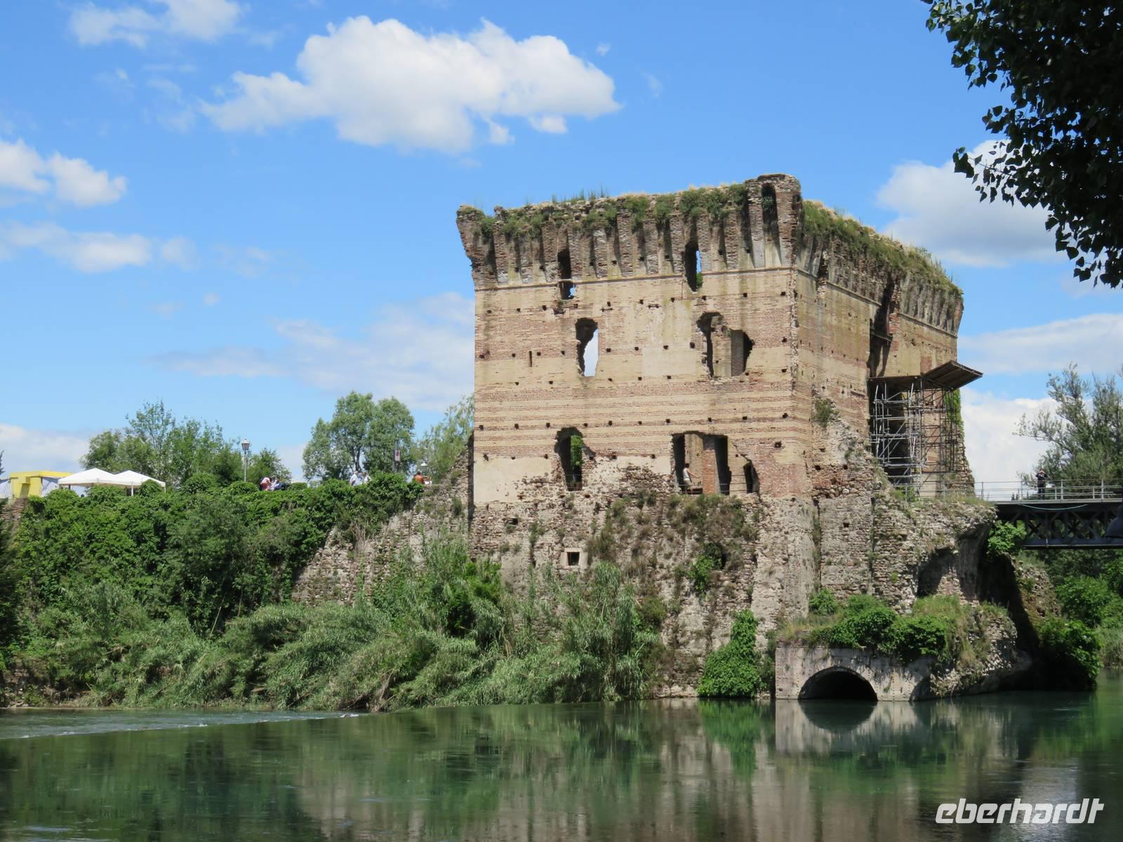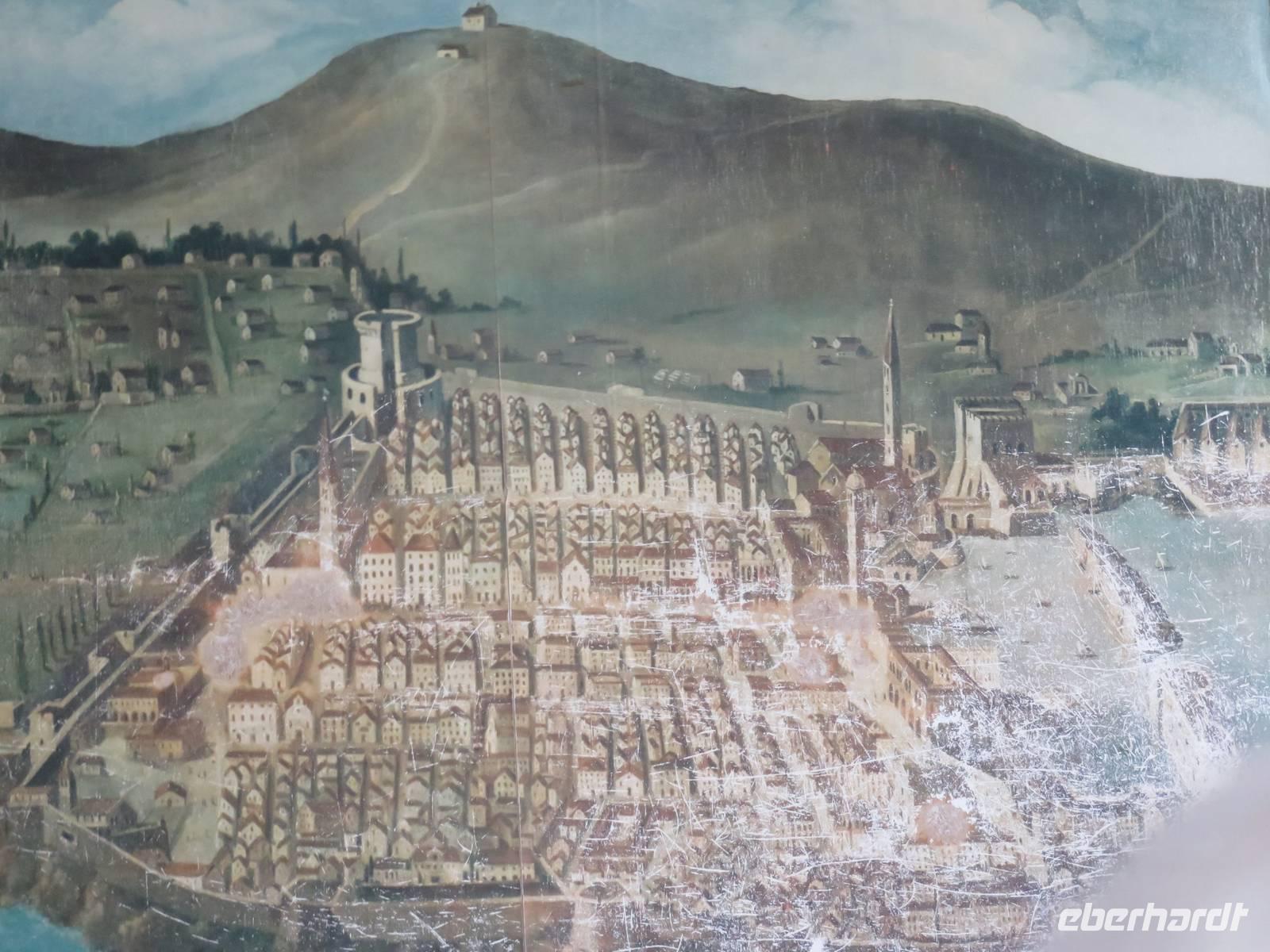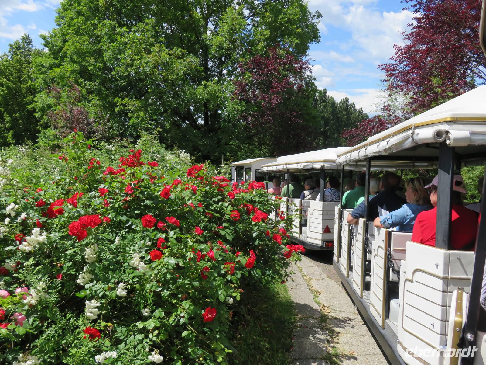 Heute hieß es nun Abschied nehmen von unserem schwimmenden Hotel. Die Busse standen kurz pünktlich zur Abfahrt bereit. Erste Station unseres Programms war der kleine Ort Borghetto südlich des Gardasees. Hier teilt sich der Mincio, der Abflusss des Gardasees, in mehrere Arme, deshalb ist der Ort prädestiniert für Wassermühlen. Die historischen Gebäude und Brücken lockten viele Touristen an. Gaststätten und Cafes luden uns bei herrlichem Wetter unter hohen Bäumen zur kurzen Mittagspause ein. Anschließend besuchten wir den Parco Sigurta in Valeggio. Mit der Parkbahn fuhren wir ca. 1 h durch das Gartenparadies, das private Eigentümer über viele Jahrhunderte gestaltet und seit 1978 für die Öffentlichkeit zugänglich gemacht haben. Heute zählt die weitläufige Anlage zu den schönsten der Welt. Große Rasenflächen, Rosengärten, Sträucher und Bäume in den vielfältigsten Formen, kleine Kirchen und Pavillions, ein Bauernhof und unzählige Blumenrabatten boten uns immer wieder neue Sichtachsen und Ausblicke. Von der sehenswerten Anlage konnten wir nur einen Überblick mitnehmen, es lohnt ein weiterer längerer Besuch. Auf der Weiterfahrt überreichten die Reiseleiterinnen das Gruppenfoto mit dem Kapitän der AIDAvita an die Gäste. Die Fahrt führte uns diesmal direkt am östlichen Ufer des Gardasees entlang durch die bekannten Touristenorte Lazise, Bardolino, Garda, Malcesine bis nach Torbole. Herrliches Wetter bescherte uns eine wunderschöne Panoramafahrt mit tollen Ausblicken auf die Wasserflächen mit ihren Sportmöglichkeiten, die Strände und die umliegenden Berglandschaften. Vom Nordufer des Sees aus fuhren wir in Richtung Calliano in die Region Trentin zu unserer Zwischenübernachtung. Calliano ist ein kleiner Ort unweit der Autobahn. Im „Villaggio Hotel Aguila", einem traditionsreichen, seit mehreren Generationen familiengeführten Haus in landestypischem Charme bezogen wir unsere Zimmer für die Übernachtung. Vom Hotel aus hatten wir abends einen herrlichen Blick auf das über dem Ort thronende und abends hell erleuchtete Castell Beseno.