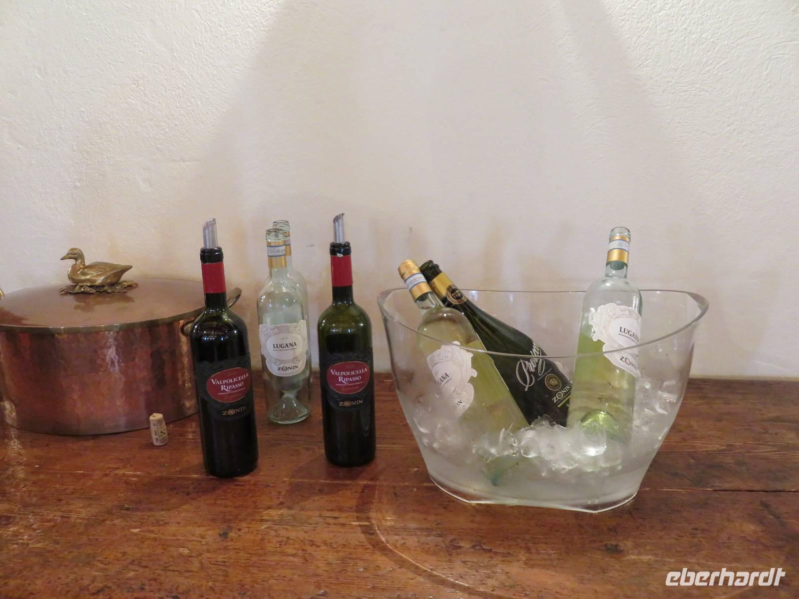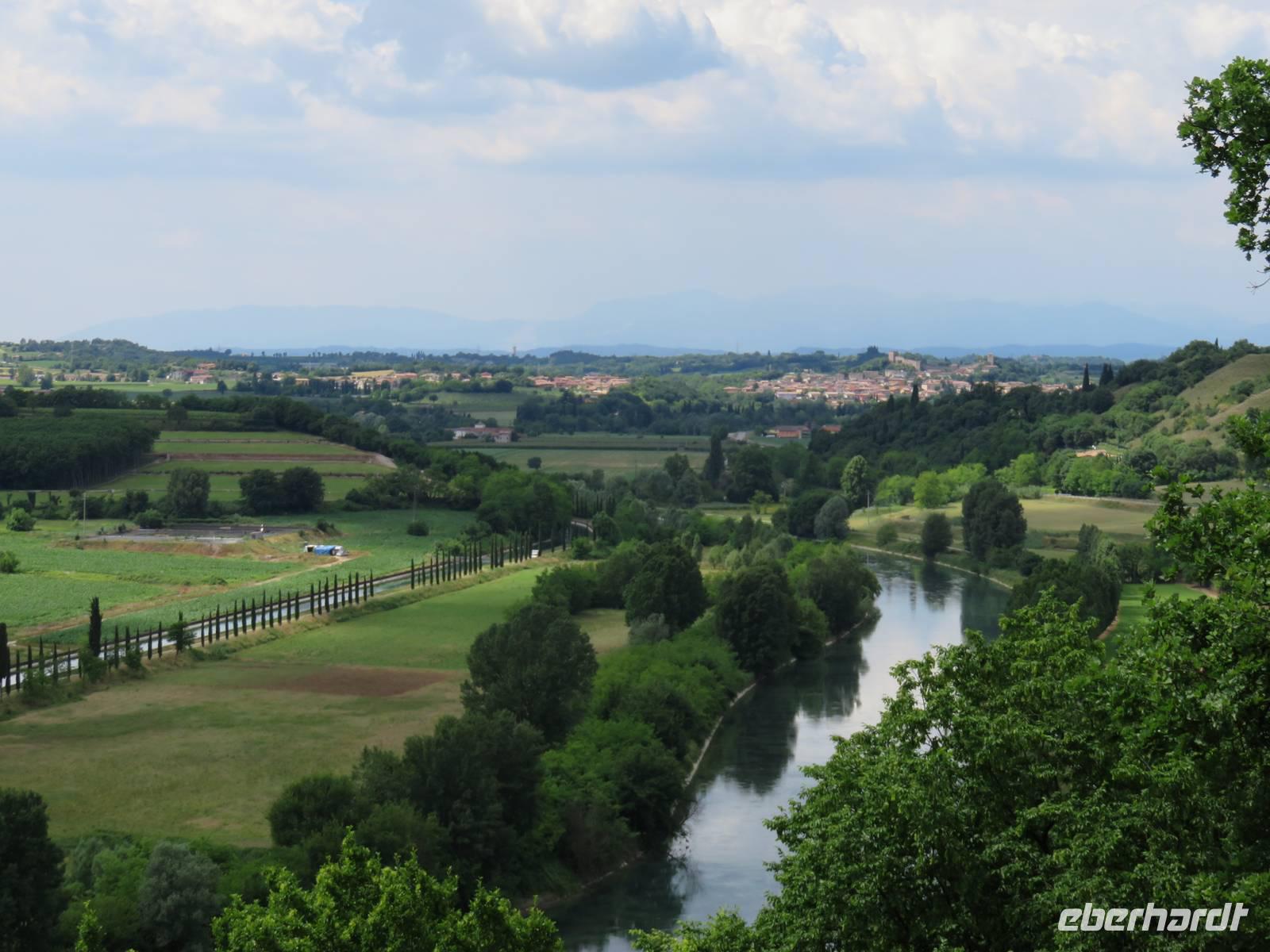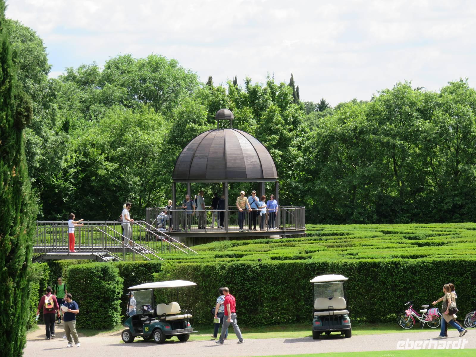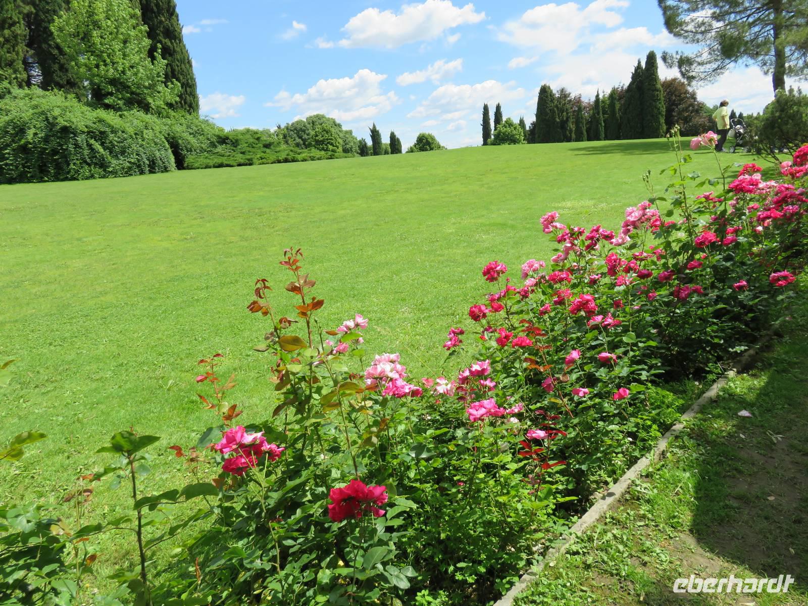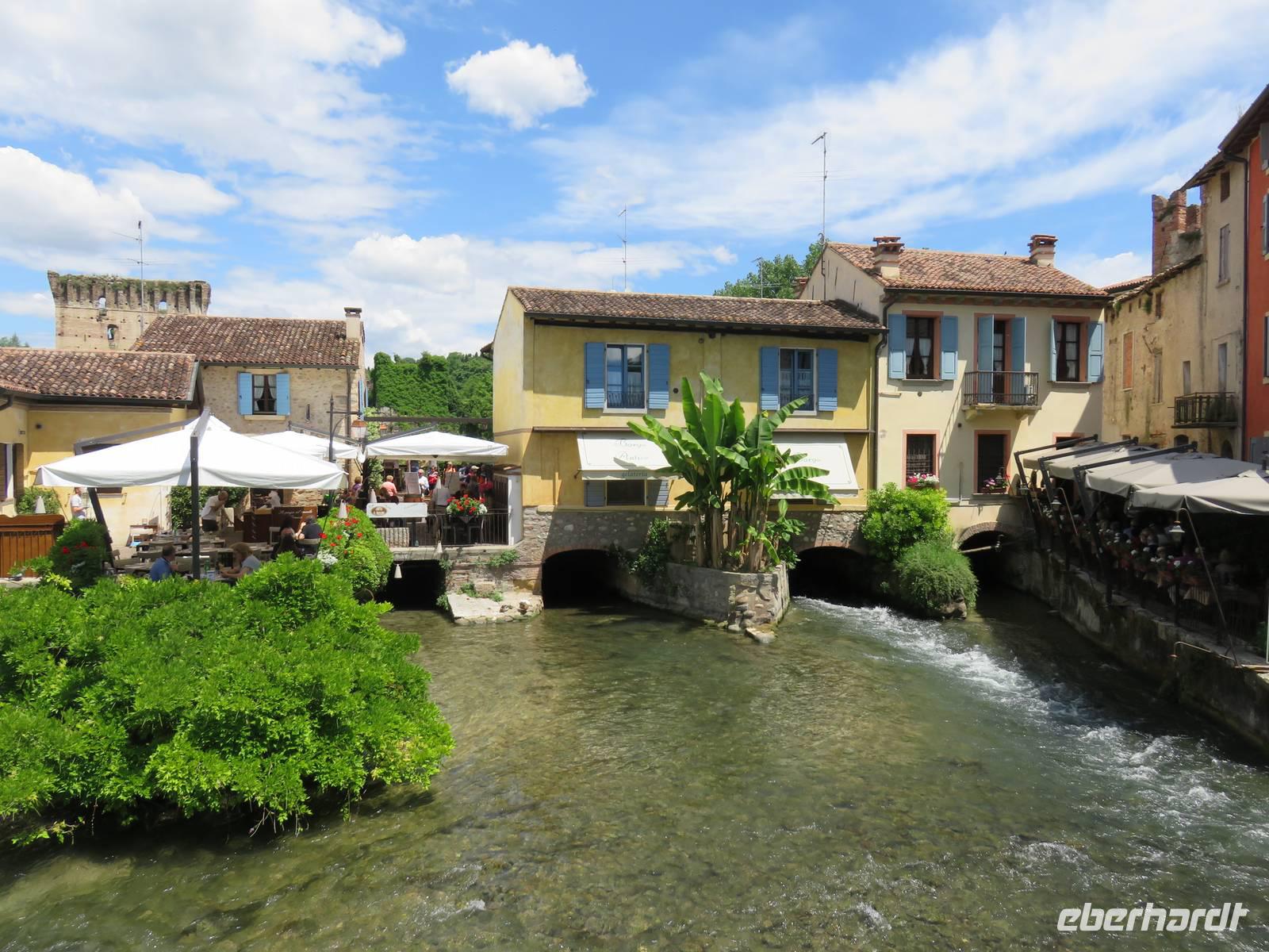 Heute hieß es nun Abschied nehmen von unserem schwimmenden Hotel. Die Busse standen kurz pünktlich zur Abfahrt bereit. Erste Station unseres Programms war der kleine Ort Borghetto südlich des Gardasees. Hier teilt sich der Mincio, der Abflusss des Gardasees, in mehrere Arme, deshalb ist der Ort prädestiniert für Wassermühlen. Die historischen Gebäude und Brücken lockten viele Touristen an. Gaststätten und Cafes luden uns bei herrlichem Wetter unter hohen Bäumen zur kurzen Mittagspause ein. Anschließend besuchten wir den Parco Sigurta in Valeggio. Mit der Parkbahn fuhren wir ca. 1 h durch das Gartenparadies, das private Eigentümer über viele Jahrhunderte gestaltet und seit 1978 für die Öffentlichkeit zugänglich gemacht haben. Heute zählt die weitläufige Anlage zu den schönsten der Welt. Große Rasenflächen, Rosengärten, Sträucher und Bäume in den vielfältigsten Formen, kleine Kirchen und Pavillions, ein Bauernhof und unzählige Blumenrabatten boten uns immer wieder neue Sichtachsen und Ausblicke. Von der sehenswerten Anlage konnten wir nur einen Überblick mitnehmen, es lohnt ein weiterer längerer Besuch. Auf der Weiterfahrt überreichten die Reiseleiterinnen das Gruppenfoto mit dem Kapitän der AIDAvita an die Gäste. Die Fahrt führte uns diesmal direkt am östlichen Ufer des Gardasees entlang durch die bekannten Touristenorte Lazise, Bardolino, Garda, Malcesine bis nach Torbole. Herrliches Wetter bescherte uns eine wunderschöne Panoramafahrt mit tollen Ausblicken auf die Wasserflächen mit ihren Sportmöglichkeiten, die Strände und die umliegenden Berglandschaften. Vom Nordufer des Sees aus fuhren wir in Richtung Calliano in die Region Trentin zu unserer Zwischenübernachtung. Calliano ist ein kleiner Ort unweit der Autobahn. Im „Villaggio Hotel Aguila", einem traditionsreichen, seit mehreren Generationen familiengeführten Haus in landestypischem Charme bezogen wir unsere Zimmer für die Übernachtung. Vom Hotel aus hatten wir abends einen herrlichen Blick auf das über dem Ort thronende und abends hell erleuchtete Castell Beseno.