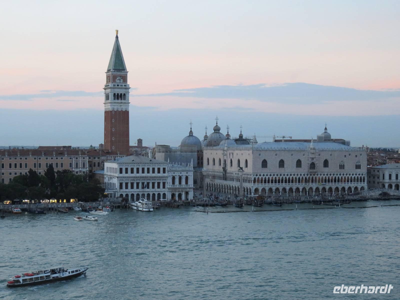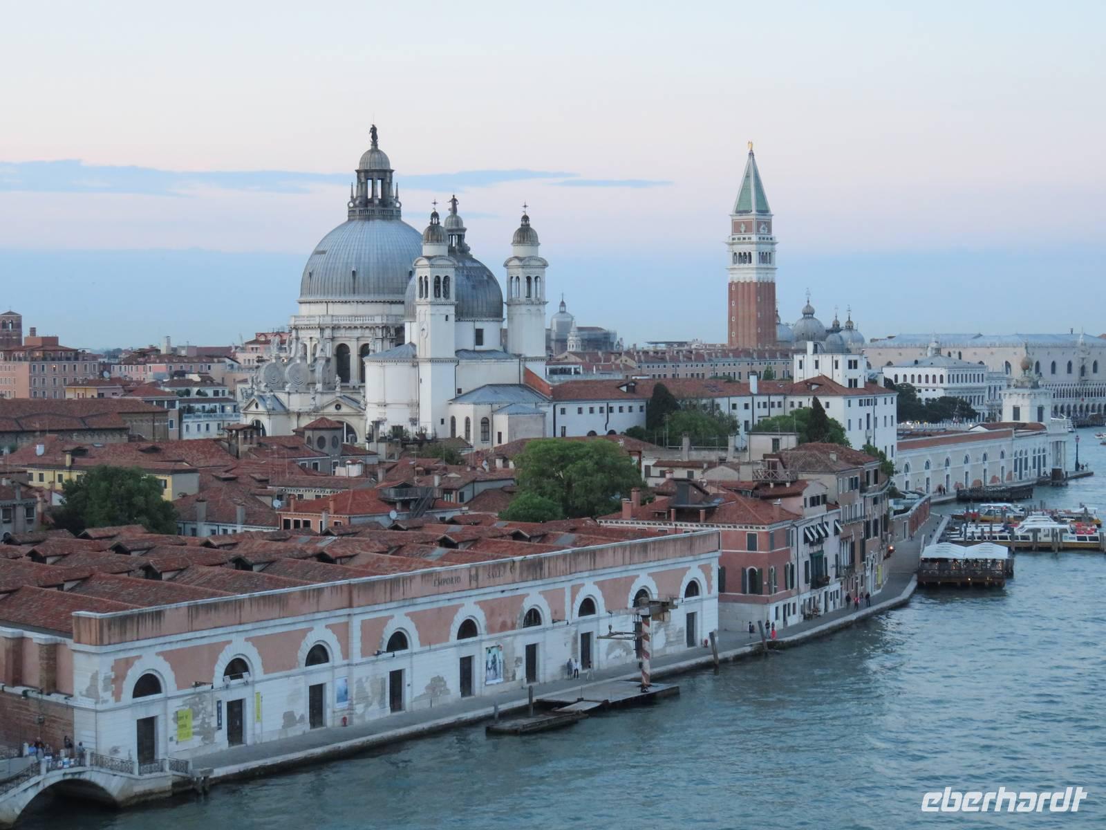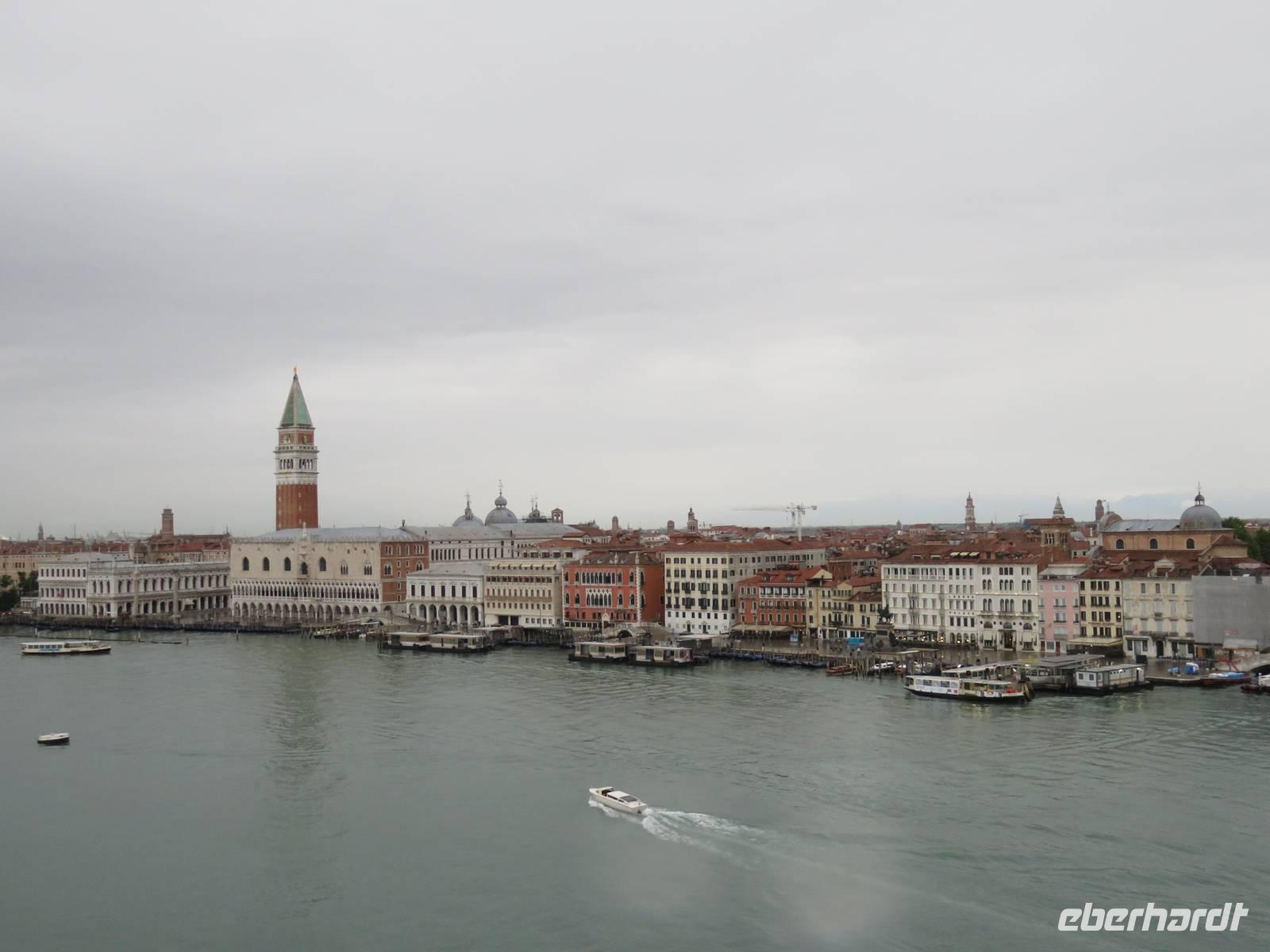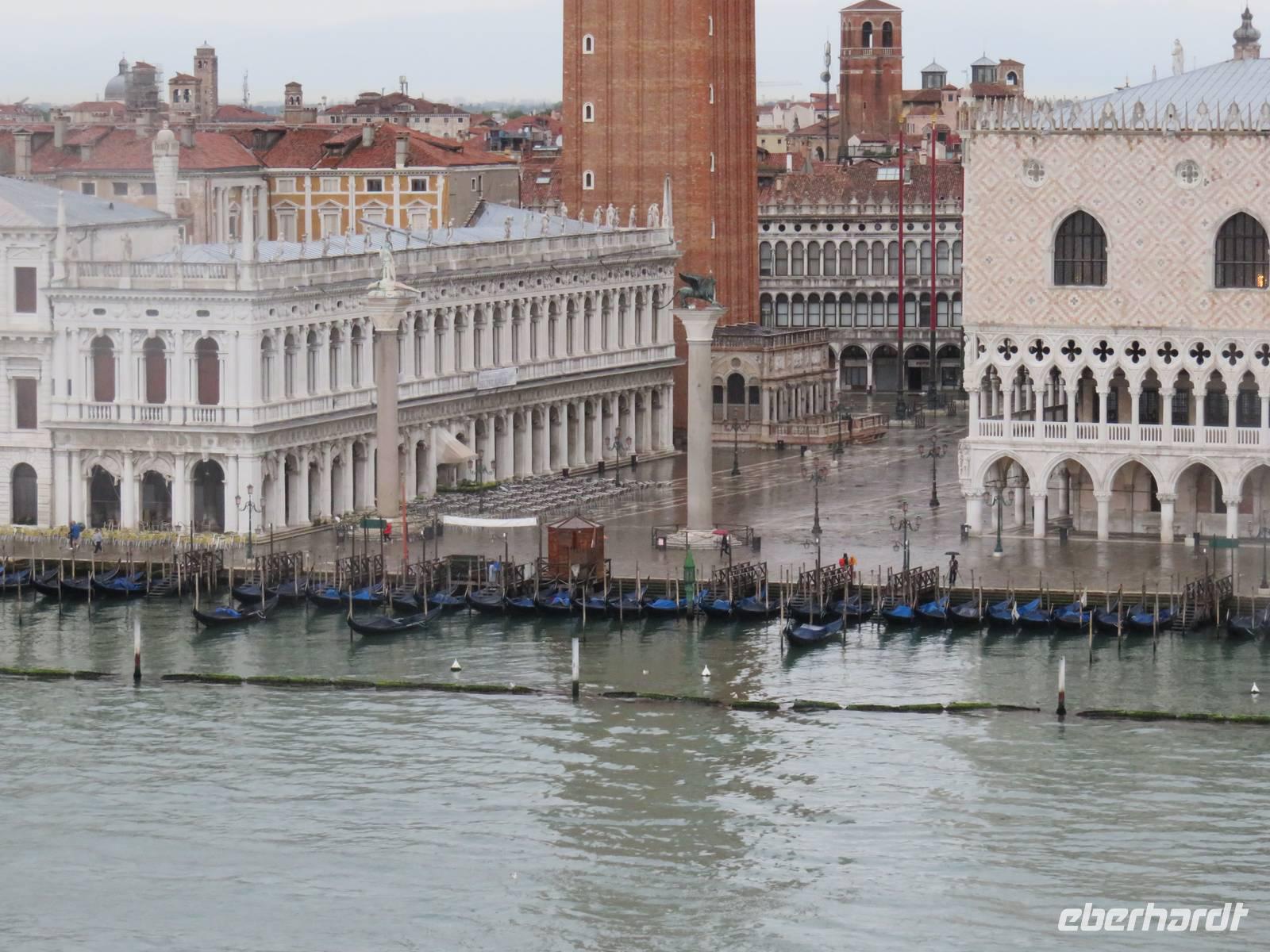 Schon sehr früh lief die AIDAvita in den Hafen von Venedig ein, mit wenigen Gästen verfolgten wir die Fahrt durch die südliche Lagune zum Liegeplatz. Leider hatte uns der Regen wieder und der Vormittag konnten wir nur im Inneren des Schiffs verbringen. Unser Ausflug, der mit der Fahrt mit dem „People Mover" in die Stadt begann, war leider auch vom Regen geprägt. Der „People Mover" ist eine kleine Bahn, die den zentralen Busbahnhof und den Hafen mit der Stadt verbindet und hilft, die ca. 25 Mio. Touristen pro Jahr in die autofreie Stadt zu transportieren. Venedig wurde auf vielen Inseln erbaut und das Hauptverkehrsmittel sind die Boote und Gondeln auf den unzähligen Kanälen. Für Touristen klingt das sehr idyllisch, das Leben in der Stadt ist aber damit sehr beschwerlich und teuer, sodass die historische Stadt nur noch ca. 42.000 Einwohner hat. Unser Spaziergang mit den örtlichen Reiseleiterinnen durch die engen Gassen, über viele Brücken und Plätze hat gezeigt, dass die meisten Gebäude dringend sanierungsbedürftig sind und viele Schäden haben, die insbesondere durch die immer wieder auftretenden Überschwemmungen hervorgerufen werden. Die Gassen waren teilweise so schmal, dass wir sogar den Regenschirm zugemachen mussten. Die berühmte Rialto-Brücke über den Canale Grande wird derzeit teilweise rekonstruiert und war deshalb nicht in ihrer vollen Schönheit zu bewundern. Auch auf der Brücke hatten wir kaum Zeit zum Verweilen, da wir durch die Touristenströme einfach mitgeschoben wurden. Vielfältige Geschäfte, vor allem mit Schmuck, Murano-Glas, Masken, Markentextilien und -schuhen sowie Souvenirs luden uns zum Geldausgeben ein. Endlich auf dem Markusplatz angekommen, überwältigte uns dieser auch bei Regen durch seine Größe und Schönheit. Die Kathedrale, der Campanile, der Uhrenturm, die berühmten Arkaden auf beiden Seiten und nicht zuletzt die vielen Tauben schaffen diesen einzigartigen und unzählige Male fotografierten Mittelpunkt der Stadt Venedig. Unser Stadtrundgang führte uns zum Dogenpalast am Wasser und zum sich anschließenden ehemaligen Untersuchungsgefängnis. Da die Gefangenen vom Gefängnis zu Verhören und zur Gerichtsverhandlung in den Dogenpalast gebracht werden mussten und dann dort ihr Urteil erhielten, wird der Übergang zwischen beiden Gebäuden „Seufzerbrücke" genannt. Hier endete unsere Stadtführung und uns blieb genügend Zeit, den Markusplatz und die umliegenden Gassen selbst zu erkunden oder ein leckeres italienisches Eis zu genießen. Am frühen Abend fuhren wir mit einem extra für uns bestelltem Boot zurück zum Schiff. Noch einmal konnten wir vom Wasser aus die gut erhaltenen Gebäude am Ufer und den Markusplatz bewundern, sogar der Regen hatte zwischenzeitlich aufgehört. Der letzte Abend auf dem Schiff begann für uns mit einem leckeren Abschiedsessen in den Restaurants mit tollen Eisskulpturen, einer AIDA-Torte, Hummer und vielen anderen Köstlichkeiten. Im Theatrium wurde der Eurovision Contest übertragen und mit einem Conchita Wurst-Double entsprechend gefeiert. Wir holten letzte Fotos ab, genossen einen leckeren Cocktail oder schgwangen in der AIDA-Bar das Tanzbein zum Abschiedstanz. Außerdem packten wir unsere Koffer gepackt und stellten sie vor die Kabine, von wo sie in der Nacht durch die fleißigen Crew-Mitglieder von Deck in die Gepäckhalle gebracht wurden.