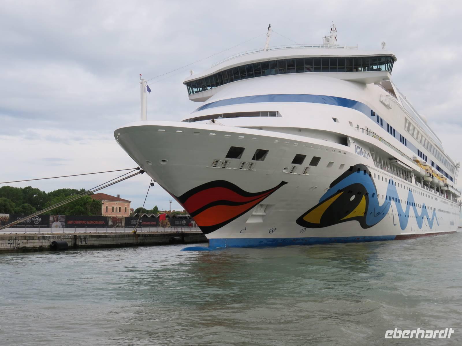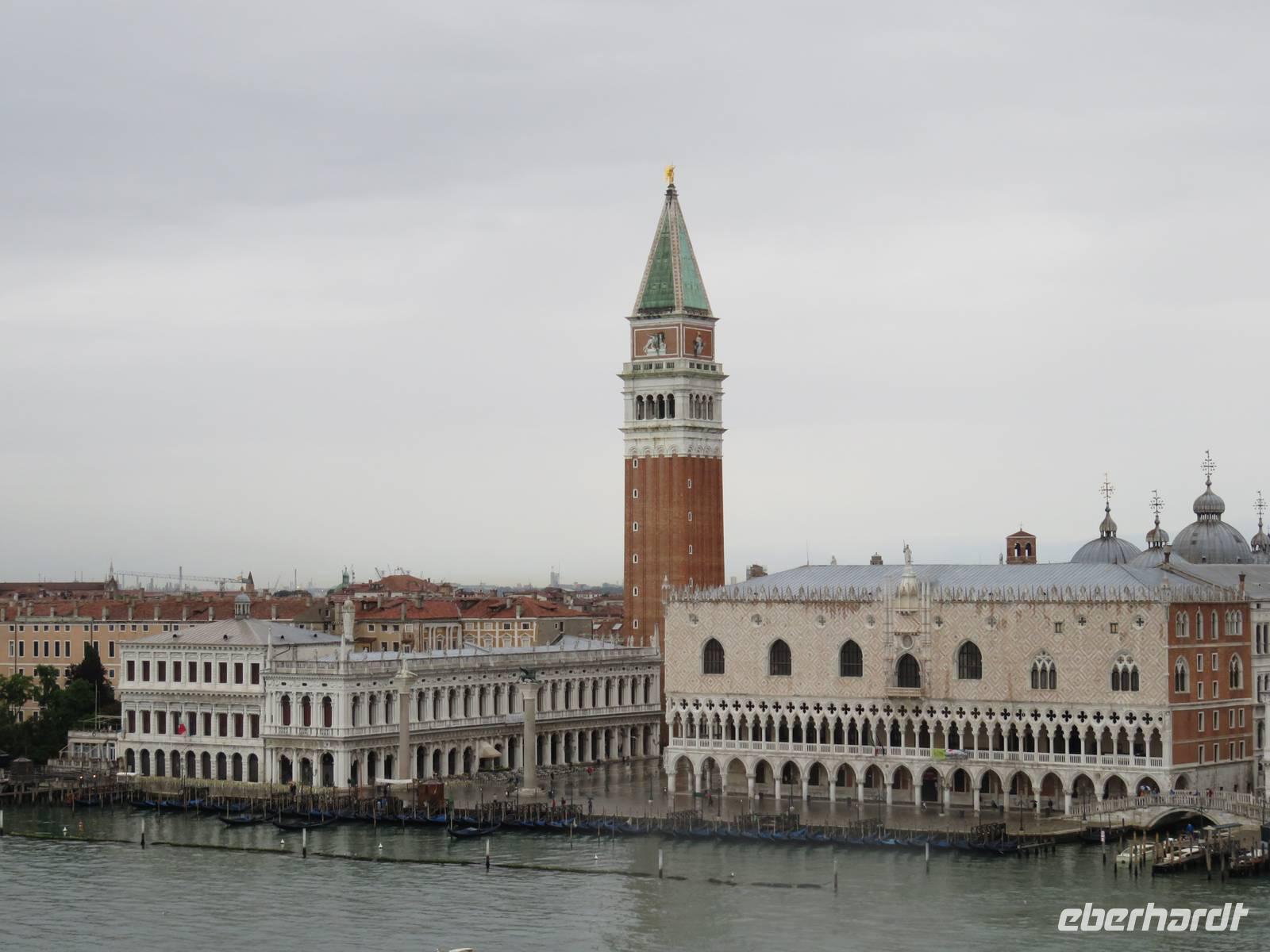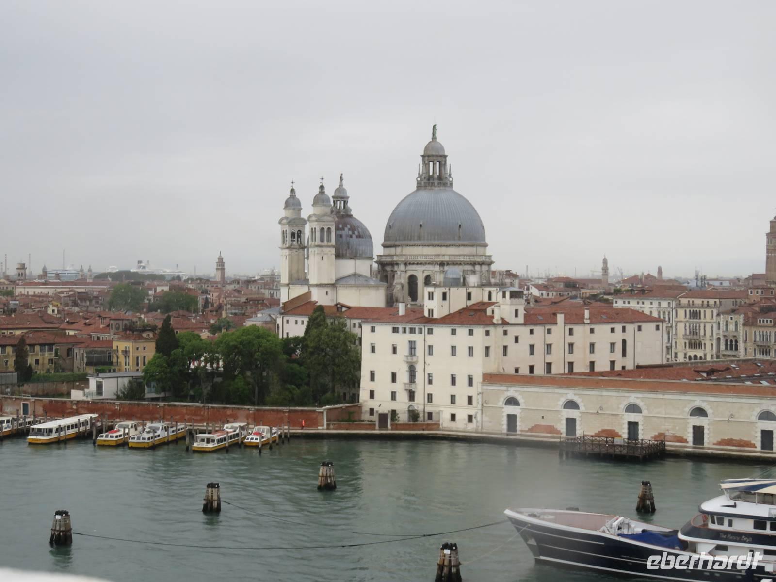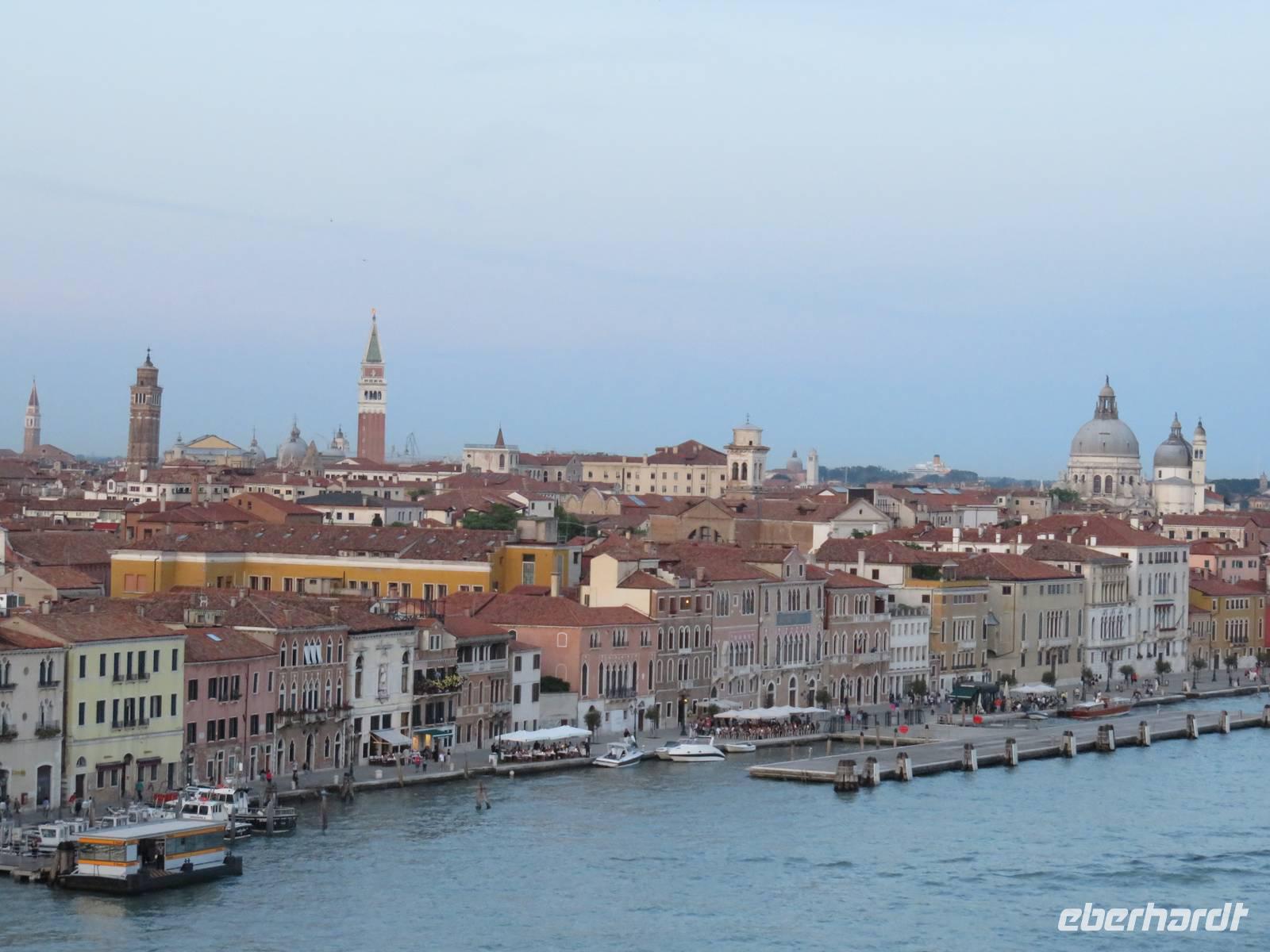Schon sehr früh lief die AIDAvita in den Hafen von Venedig ein, mit wenigen Gästen verfolgten wir die Fahrt durch die südliche Lagune zum Liegeplatz. Leider hatte uns der Regen wieder und der Vormittag konnten wir nur im Inneren des Schiffs verbringen. Unser Ausflug, der mit der Fahrt mit dem „People Mover" in die Stadt begann, war leider auch vom Regen geprägt. Der „People Mover" ist eine kleine Bahn, die den zentralen Busbahnhof und den Hafen mit der Stadt verbindet und hilft, die ca. 25 Mio. Touristen pro Jahr in die autofreie Stadt zu transportieren. Venedig wurde auf vielen Inseln erbaut und das Hauptverkehrsmittel sind die Boote und Gondeln auf den unzähligen Kanälen. Für Touristen klingt das sehr idyllisch, das Leben in der Stadt ist aber damit sehr beschwerlich und teuer, sodass die historische Stadt nur noch ca. 42.000 Einwohner hat. Unser Spaziergang mit den örtlichen Reiseleiterinnen durch die engen Gassen, über viele Brücken und Plätze hat gezeigt, dass die meisten Gebäude dringend sanierungsbedürftig sind und viele Schäden haben, die insbesondere durch die immer wieder auftretenden Überschwemmungen hervorgerufen werden. Die Gassen waren teilweise so schmal, dass wir sogar den Regenschirm zugemachen mussten. Die berühmte Rialto-Brücke über den Canale Grande wird derzeit teilweise rekonstruiert und war deshalb nicht in ihrer vollen Schönheit zu bewundern. Auch auf der Brücke hatten wir kaum Zeit zum Verweilen, da wir durch die Touristenströme einfach mitgeschoben wurden. Vielfältige Geschäfte, vor allem mit Schmuck, Murano-Glas, Masken, Markentextilien und -schuhen sowie Souvenirs luden uns zum Geldausgeben ein. Endlich auf dem Markusplatz angekommen, überwältigte uns dieser auch bei Regen durch seine Größe und Schönheit. Die Kathedrale, der Campanile, der Uhrenturm, die berühmten Arkaden auf beiden Seiten und nicht zuletzt die vielen Tauben schaffen diesen einzigartigen und unzählige Male fotografierten Mittelpunkt der Stadt Venedig. Unser Stadtrundgang führte uns zum Dogenpalast am Wasser und zum sich anschließenden ehemaligen Untersuchungsgefängnis. Da die Gefangenen vom Gefängnis zu Verhören und zur Gerichtsverhandlung in den Dogenpalast gebracht werden mussten und dann dort ihr Urteil erhielten, wird der Übergang zwischen beiden Gebäuden „Seufzerbrücke" genannt. Hier endete unsere Stadtführung und uns blieb genügend Zeit, den Markusplatz und die umliegenden Gassen selbst zu erkunden oder ein leckeres italienisches Eis zu genießen. Am frühen Abend fuhren wir mit einem extra für uns bestelltem Boot zurück zum Schiff. Noch einmal konnten wir vom Wasser aus die gut erhaltenen Gebäude am Ufer und den Markusplatz bewundern, sogar der Regen hatte zwischenzeitlich aufgehört. Der letzte Abend auf dem Schiff begann für uns mit einem leckeren Abschiedsessen in den Restaurants mit tollen Eisskulpturen, einer AIDA-Torte, Hummer und vielen anderen Köstlichkeiten. Im Theatrium wurde der Eurovision Contest übertragen und mit einem Conchita Wurst-Double entsprechend gefeiert. Wir holten letzte Fotos ab, genossen einen leckeren Cocktail oder schgwangen in der AIDA-Bar das Tanzbein zum Abschiedstanz. Außerdem packten wir unsere Koffer gepackt und stellten sie vor die Kabine, von wo sie in der Nacht durch die fleißigen Crew-Mitglieder von Deck in die Gepäckhalle gebracht wurden.