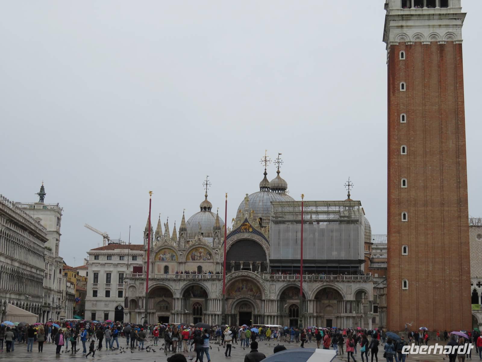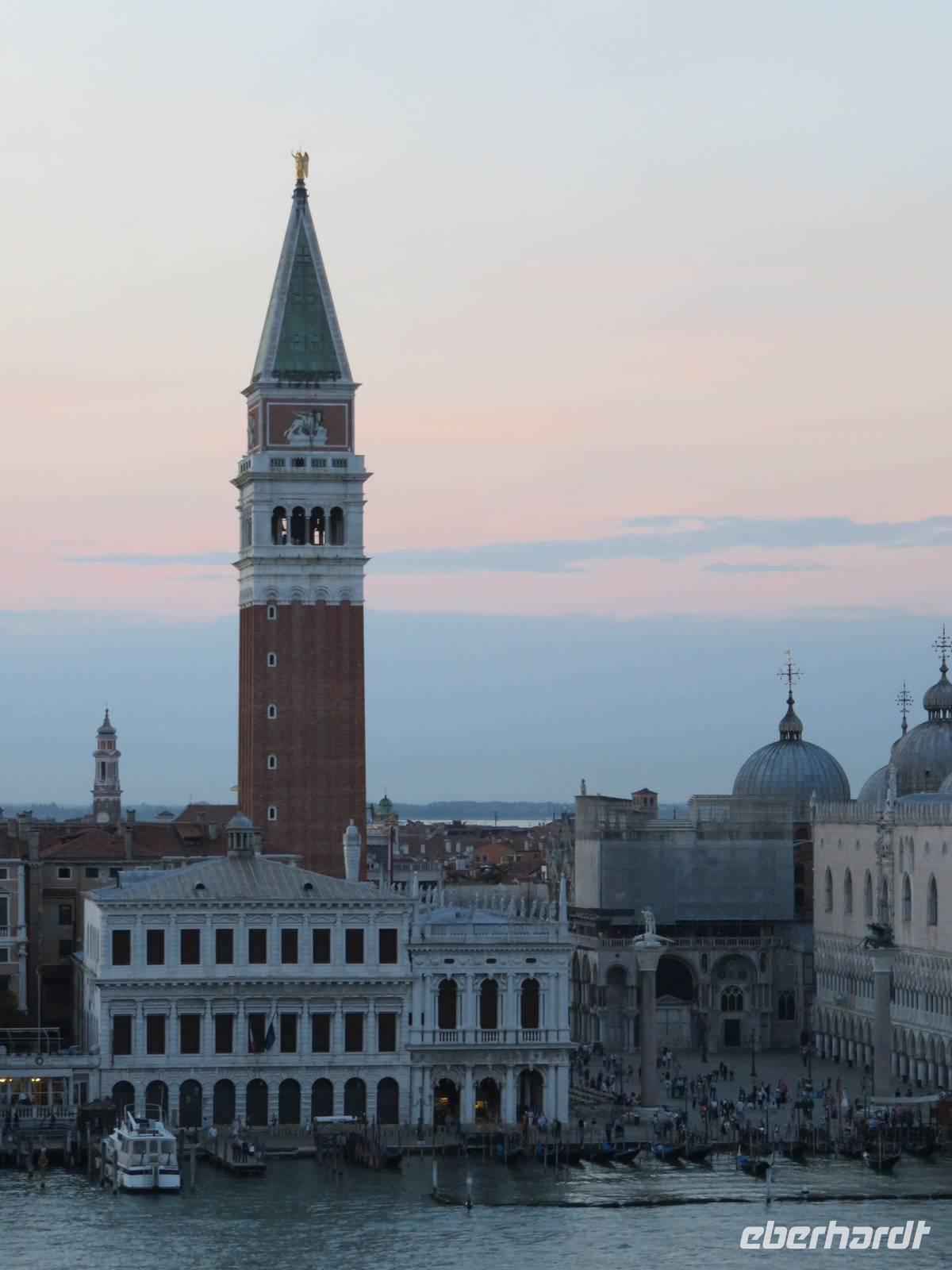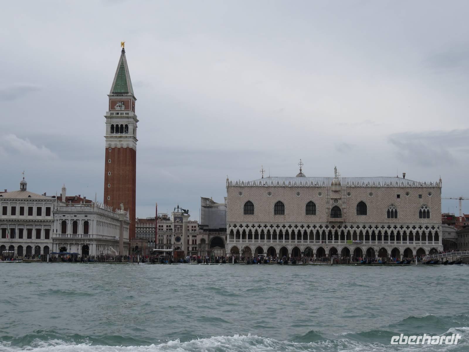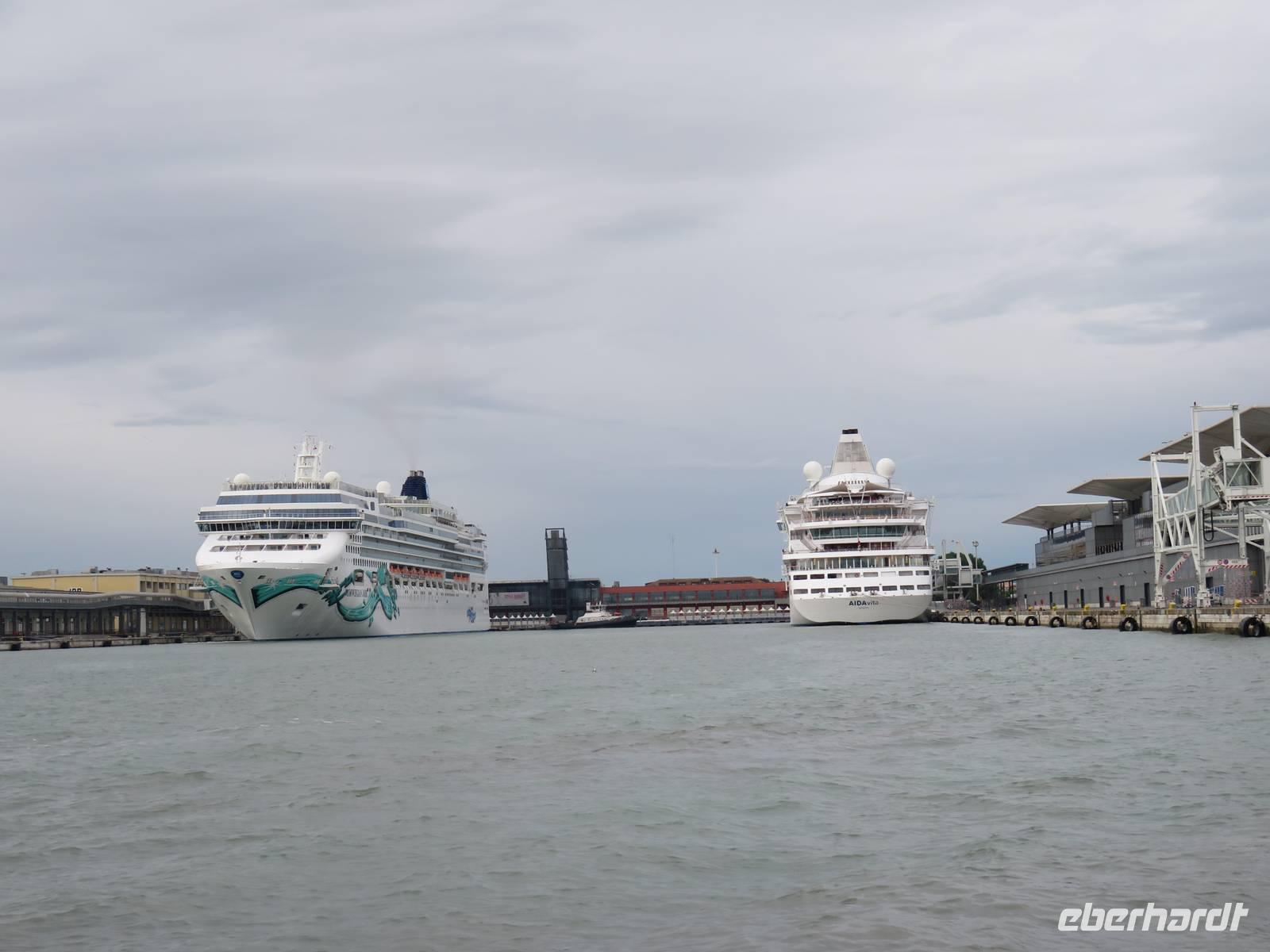 Schon sehr früh lief die AIDAvita in den Hafen von Venedig ein, mit wenigen Gästen verfolgten wir die Fahrt durch die südliche Lagune zum Liegeplatz. Leider hatte uns der Regen wieder und der Vormittag konnten wir nur im Inneren des Schiffs verbringen. Unser Ausflug, der mit der Fahrt mit dem „People Mover" in die Stadt begann, war leider auch vom Regen geprägt. Der „People Mover" ist eine kleine Bahn, die den zentralen Busbahnhof und den Hafen mit der Stadt verbindet und hilft, die ca. 25 Mio. Touristen pro Jahr in die autofreie Stadt zu transportieren. Venedig wurde auf vielen Inseln erbaut und das Hauptverkehrsmittel sind die Boote und Gondeln auf den unzähligen Kanälen. Für Touristen klingt das sehr idyllisch, das Leben in der Stadt ist aber damit sehr beschwerlich und teuer, sodass die historische Stadt nur noch ca. 42.000 Einwohner hat. Unser Spaziergang mit den örtlichen Reiseleiterinnen durch die engen Gassen, über viele Brücken und Plätze hat gezeigt, dass die meisten Gebäude dringend sanierungsbedürftig sind und viele Schäden haben, die insbesondere durch die immer wieder auftretenden Überschwemmungen hervorgerufen werden. Die Gassen waren teilweise so schmal, dass wir sogar den Regenschirm zugemachen mussten. Die berühmte Rialto-Brücke über den Canale Grande wird derzeit teilweise rekonstruiert und war deshalb nicht in ihrer vollen Schönheit zu bewundern. Auch auf der Brücke hatten wir kaum Zeit zum Verweilen, da wir durch die Touristenströme einfach mitgeschoben wurden. Vielfältige Geschäfte, vor allem mit Schmuck, Murano-Glas, Masken, Markentextilien und -schuhen sowie Souvenirs luden uns zum Geldausgeben ein. Endlich auf dem Markusplatz angekommen, überwältigte uns dieser auch bei Regen durch seine Größe und Schönheit. Die Kathedrale, der Campanile, der Uhrenturm, die berühmten Arkaden auf beiden Seiten und nicht zuletzt die vielen Tauben schaffen diesen einzigartigen und unzählige Male fotografierten Mittelpunkt der Stadt Venedig. Unser Stadtrundgang führte uns zum Dogenpalast am Wasser und zum sich anschließenden ehemaligen Untersuchungsgefängnis. Da die Gefangenen vom Gefängnis zu Verhören und zur Gerichtsverhandlung in den Dogenpalast gebracht werden mussten und dann dort ihr Urteil erhielten, wird der Übergang zwischen beiden Gebäuden „Seufzerbrücke" genannt. Hier endete unsere Stadtführung und uns blieb genügend Zeit, den Markusplatz und die umliegenden Gassen selbst zu erkunden oder ein leckeres italienisches Eis zu genießen. Am frühen Abend fuhren wir mit einem extra für uns bestelltem Boot zurück zum Schiff. Noch einmal konnten wir vom Wasser aus die gut erhaltenen Gebäude am Ufer und den Markusplatz bewundern, sogar der Regen hatte zwischenzeitlich aufgehört. Der letzte Abend auf dem Schiff begann für uns mit einem leckeren Abschiedsessen in den Restaurants mit tollen Eisskulpturen, einer AIDA-Torte, Hummer und vielen anderen Köstlichkeiten. Im Theatrium wurde der Eurovision Contest übertragen und mit einem Conchita Wurst-Double entsprechend gefeiert. Wir holten letzte Fotos ab, genossen einen leckeren Cocktail oder schgwangen in der AIDA-Bar das Tanzbein zum Abschiedstanz. Außerdem packten wir unsere Koffer gepackt und stellten sie vor die Kabine, von wo sie in der Nacht durch die fleißigen Crew-Mitglieder von Deck in die Gepäckhalle gebracht wurden.