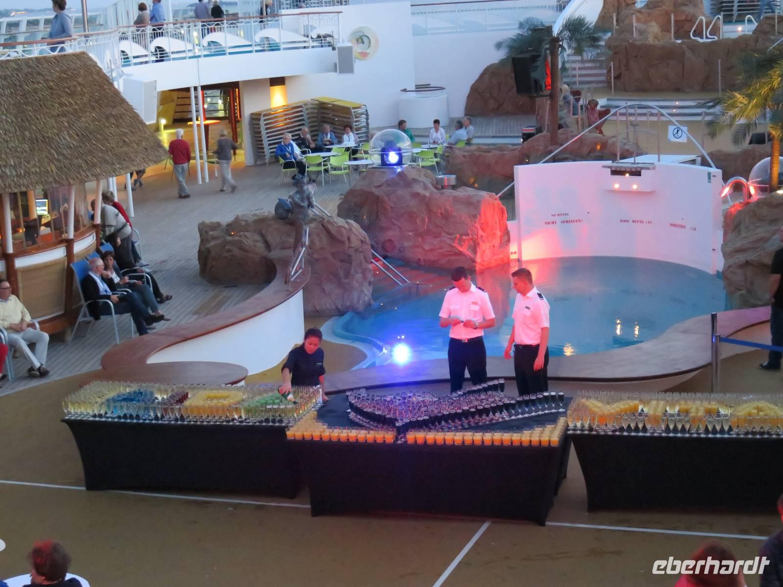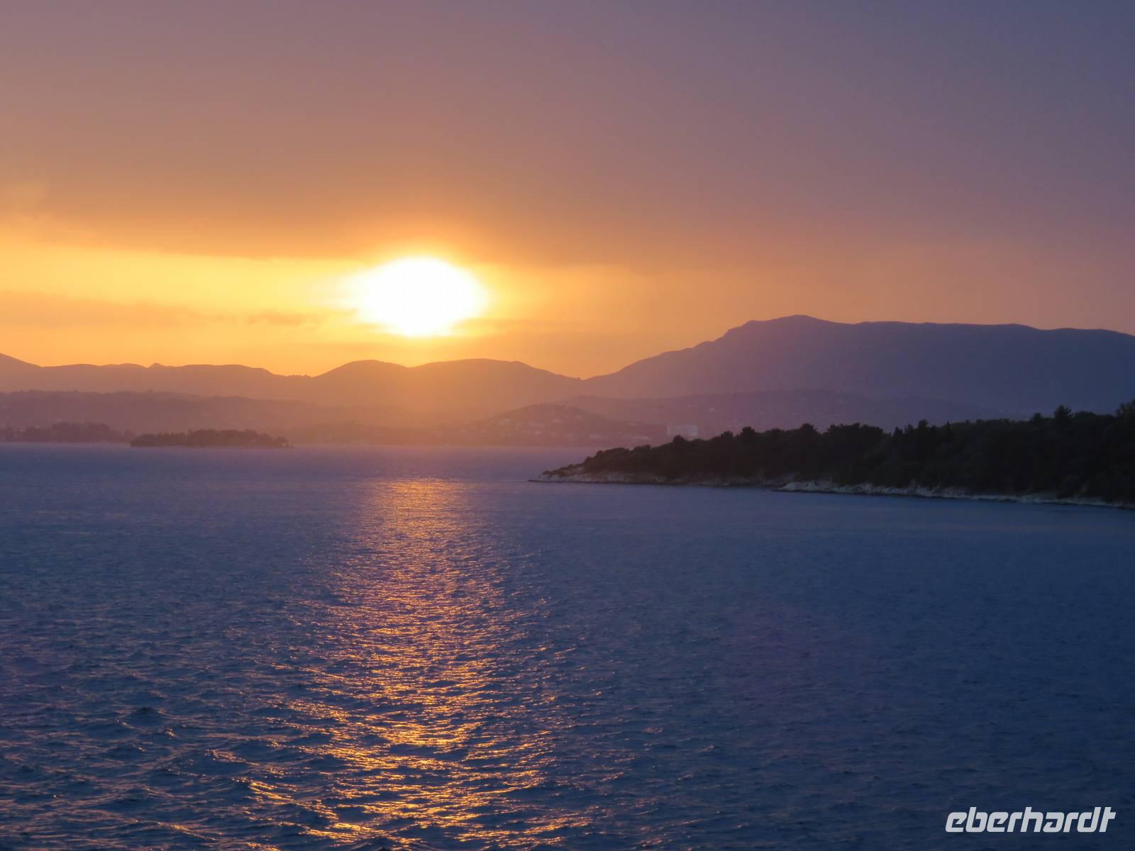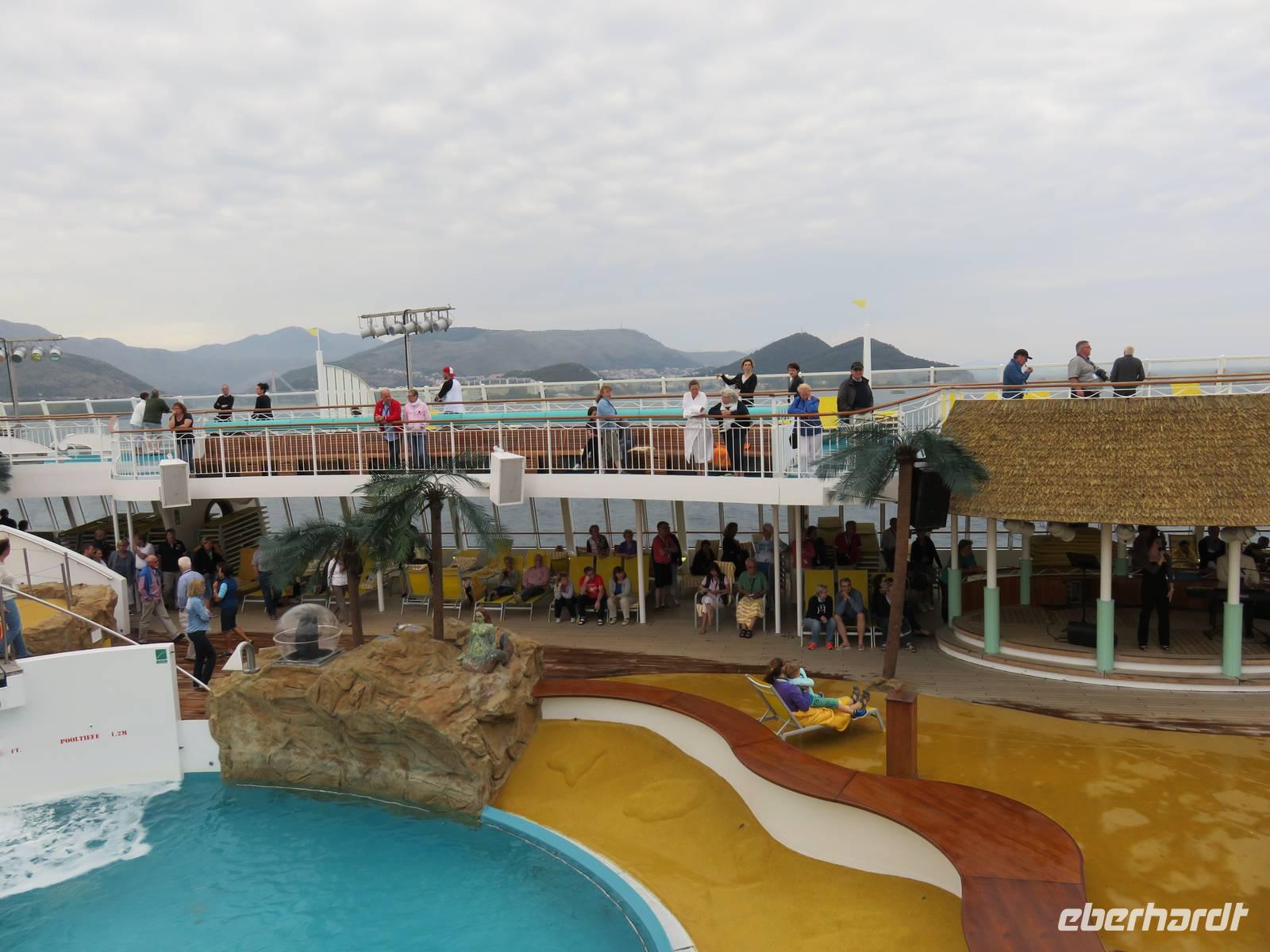 Das Wetter zeigte sich nicht ganz so von seiner besten Seite und einige Regentropfen fielen vom Himmel. Beim Auslaufen aus Korfu hörte der Regen dann aber kurz auf und wir konnten einen fantastischen Sonnenuntergang genießen. Die Abendshow auf dem Pooldeck wurde von weiteren Regenschauern beeinträchtigt, die anschließende Poolparty heizte uns trotz kühler Temperaturen „hüttenmäßig" ein.