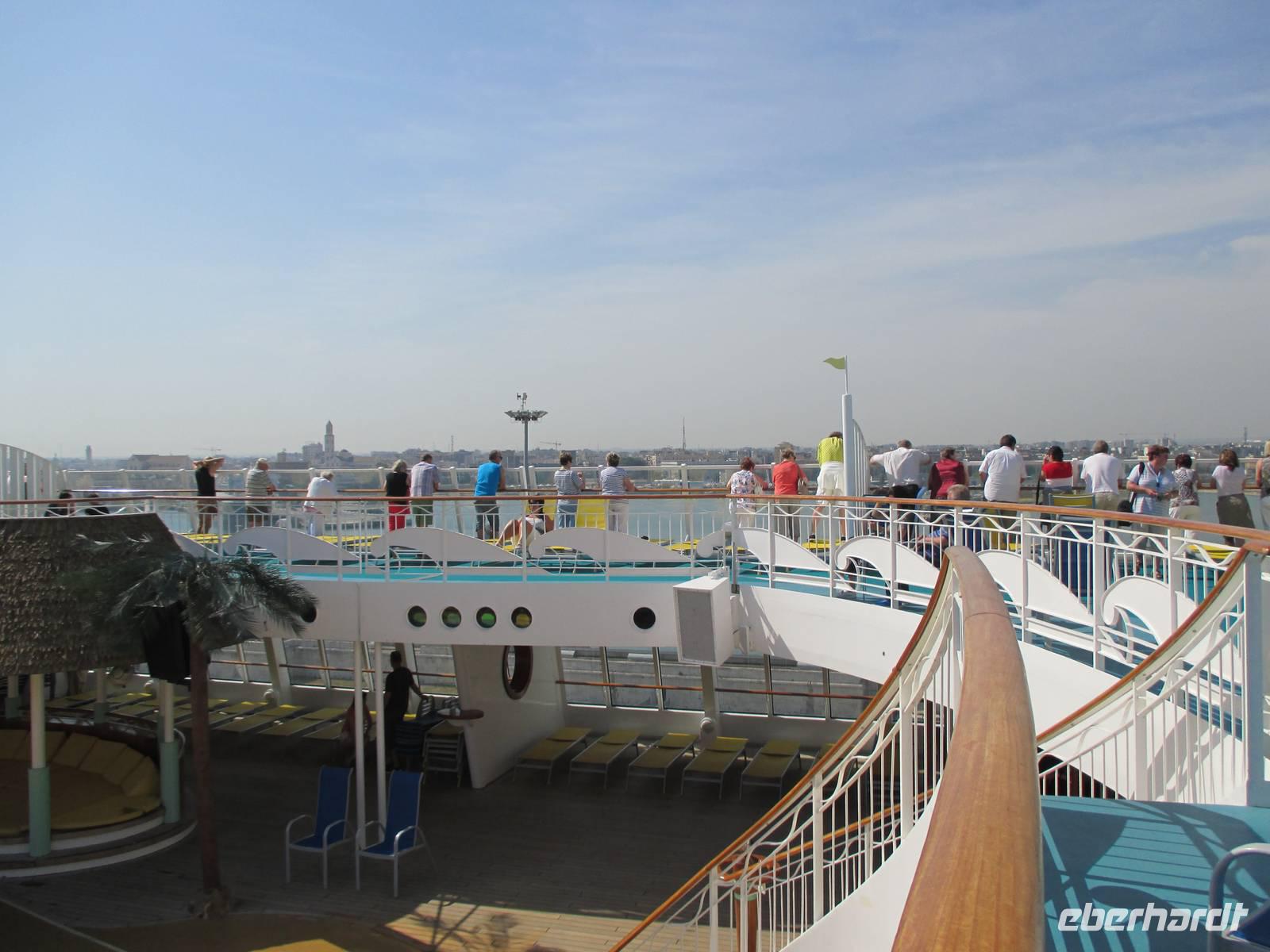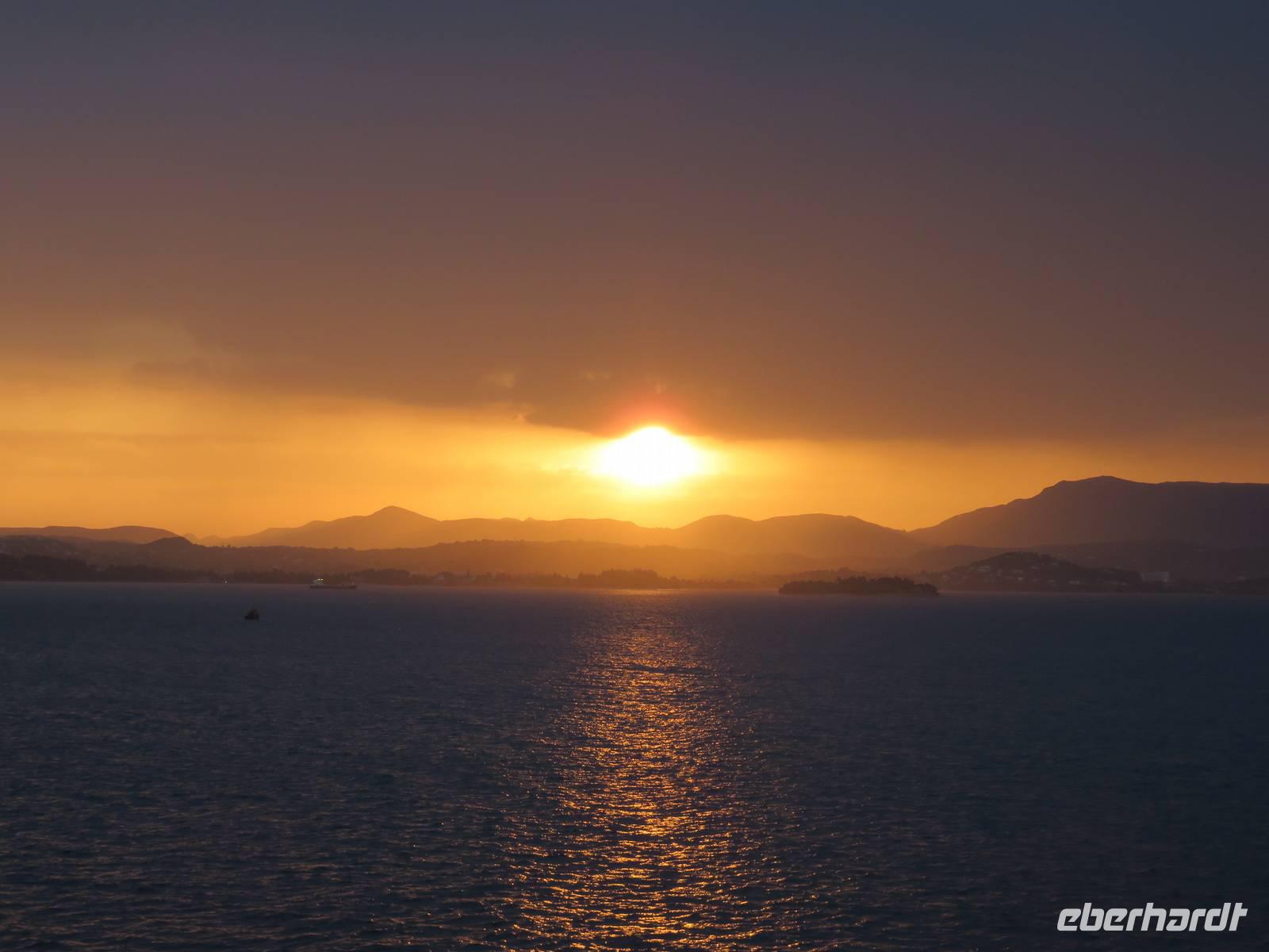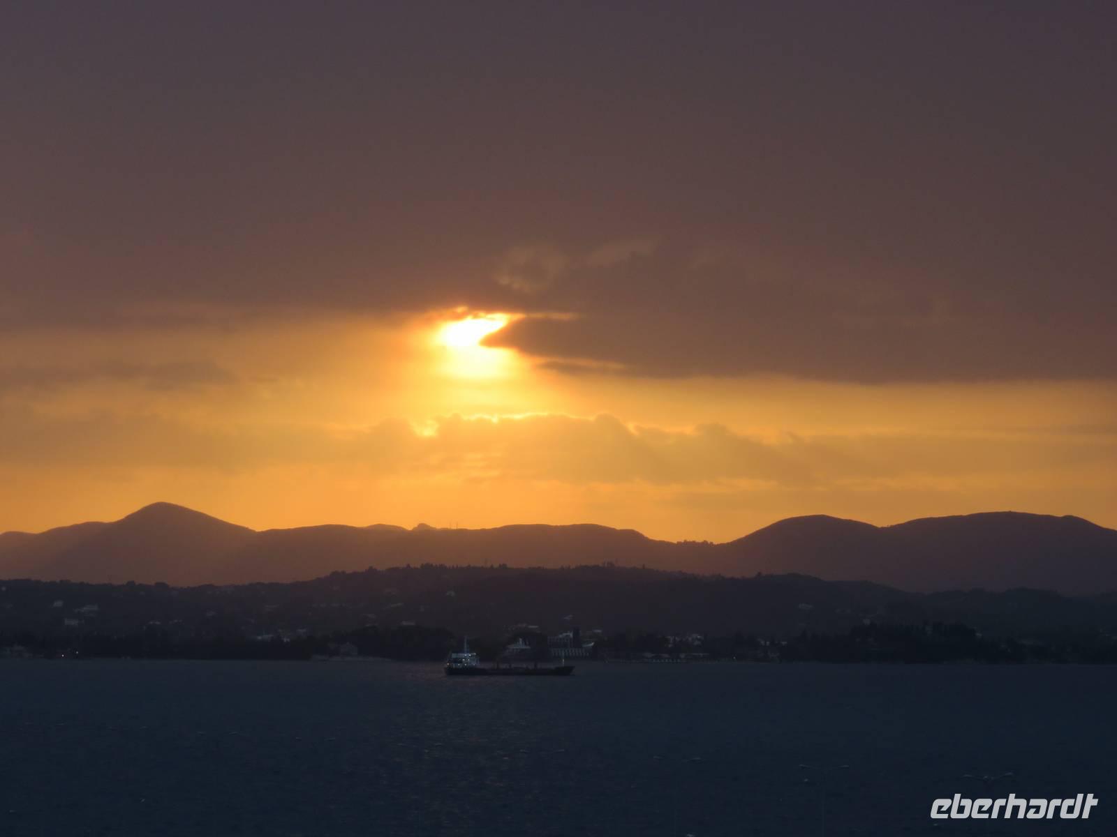 Das Wetter zeigte sich nicht ganz so von seiner besten Seite und einige Regentropfen fielen vom Himmel. Beim Auslaufen aus Korfu hörte der Regen dann aber kurz auf und wir konnten einen fantastischen Sonnenuntergang genießen. Die Abendshow auf dem Pooldeck wurde von weiteren Regenschauern beeinträchtigt, die anschließende Poolparty heizte uns trotz kühler Temperaturen „hüttenmäßig" ein.