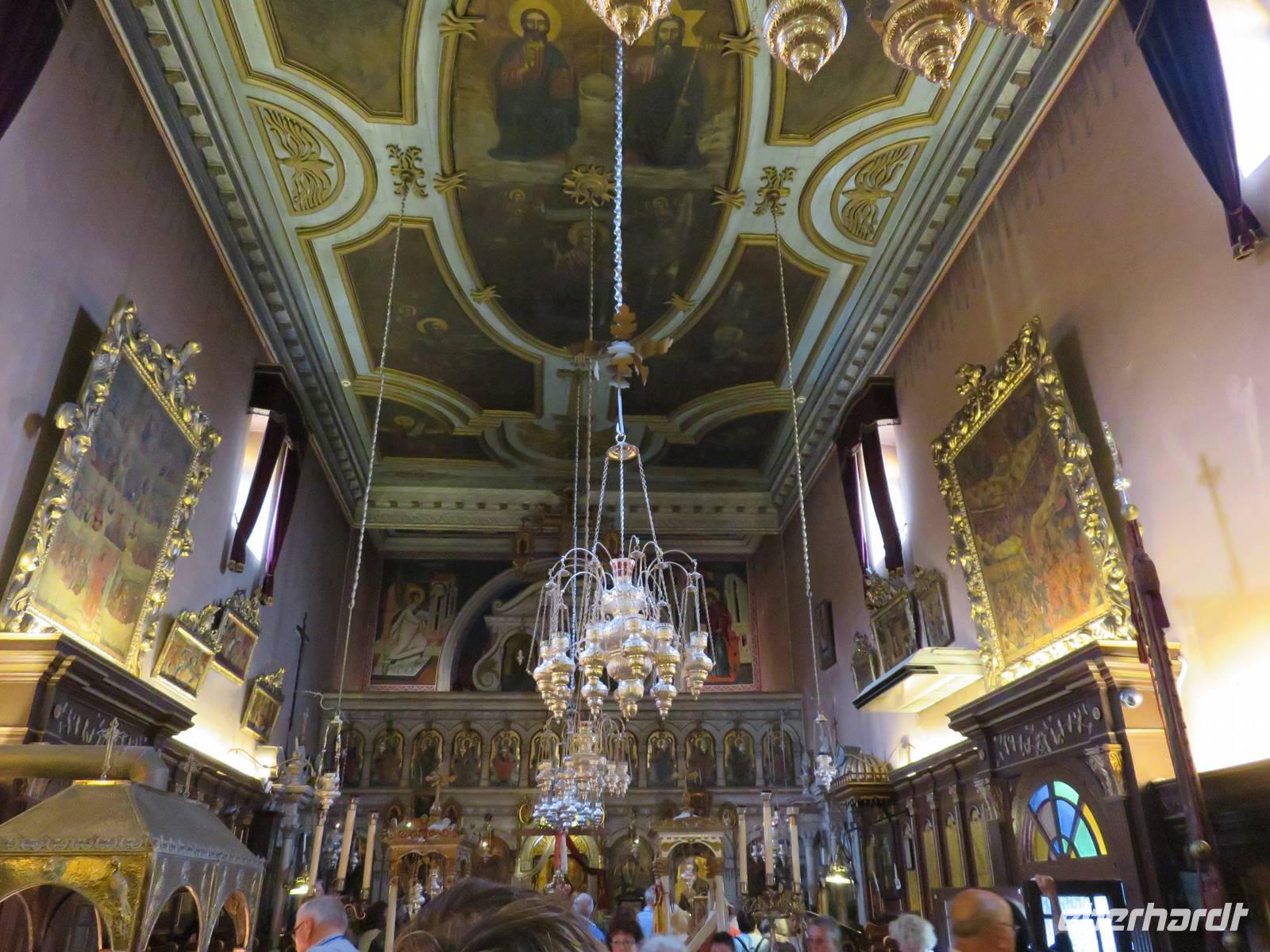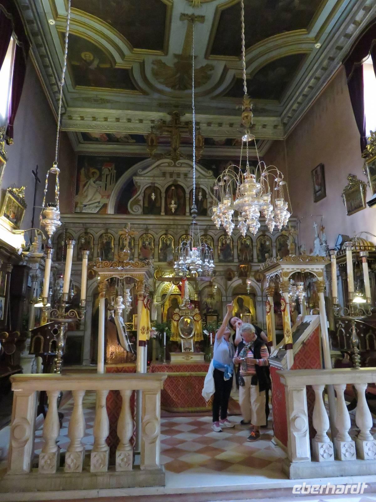 Annette Weise traf sich mit 12 Gästen zur Inselrundfahrt. Zunächst besuchten wir das Kloster Panagí Theotokós in Paleokastritsa. In der Kirche bestaunten wir die Ikonen und unsere Reiseleiterin Maria erläuterte uns, wie die Ikonen in mühevoller Arbeit entstanden. Weiter ging es zum Aussichtspunkt „Bella Vista". Wir konnten einen traumhaften Blick über die Westküste Korfus genießen. Das türkisblaue Meer lag uns zu Füßen und wir sahen das „steinerne Schiff des Odysseus" und die schroffe Küstenlandschaft. Nun ging unsre Tour in das kleine Dorf Makrades. Wir spazierten durch das Dorf und Maria zeigte uns so manche Pflanze und lieferte gleich die passenden Rezepte dazu. Wir sahen die typischen Häuser und die Gärten mit den vielen verschiedenen Nutzpflanzen und bunten Blumen. Über die Küstenstraße führte uns die Fahrt weiter nach Acharavi, einem Ferienort an der Küste. Hier nahmen wir ein leckeres Mittagessen ein. Uns wurden typische griechische Gerichte gereicht. Nun fuhren wir auf der Küstenstraße zurück nach Korfu-Stadt. Dabei konnten wir immer wieder fantastische Blicke über die vielen Buchten und die zerklüftete Küste genießen. In Korfu spazierten wir durch die Altstadt. Maria zeigte uns die Hauptkirche und den ältesten Musikverein Griechenlands. Anschließend mussten wir bereits wieder auf unser Schiff.