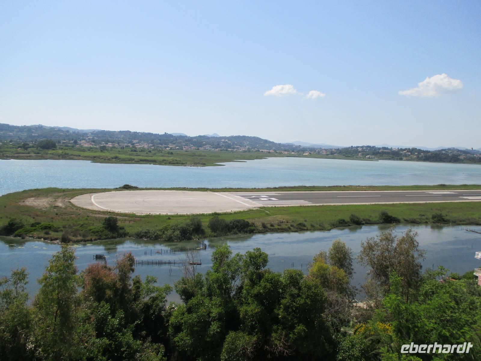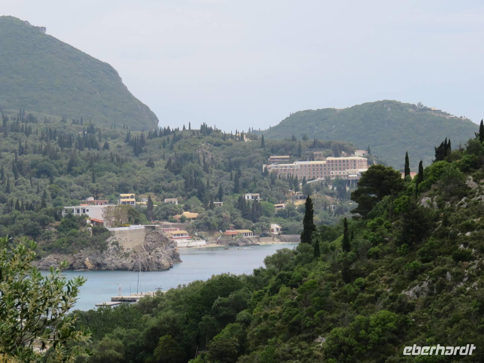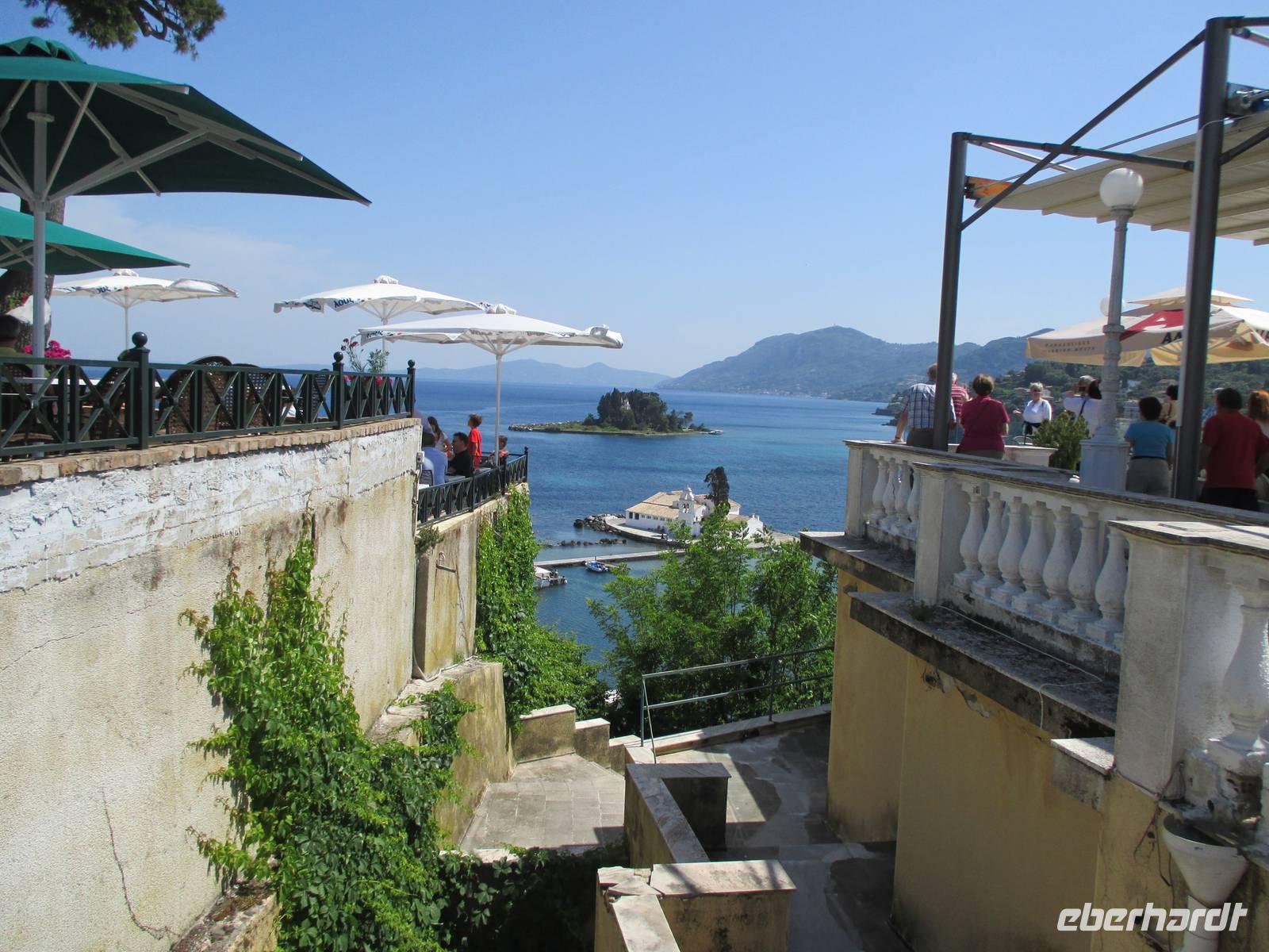 Christine Paulan begleitete eine Gruppe von Eberhardt-Gästen auf einen Ausflug zu den schönsten Aussichten der Insel. Die Fahrt ging ebenfalls zum Aussichtspunkt Bella Vista. Die Straßen in die Berge waren so schmal, dass der Chauffeur sein ganzes fahrerisches Können einsetzen musste. Anschließend besuchten wir eine Likörmanufaktur. Hier werden vor allem Kumquat-Früchte verarbeitet. Es handelt sich um kleine Orangen, die ein Seefahrer aus China nach Korfu gebracht und hier kultiviert hat. Neben den aromatischen Likören, die wir probieren durften, werden daraus auch Bonbons, Marmeladen und kandierte Früchte hergestellt. Die Fahrt ging weiter zum Aussichtspunkt Kanoni, von hier hatten wir einen Blick zur „Mäuseinsel" und zu einem kleinen Insel-Kloster. Am meisten hat uns jedoch beeindruckt, unmittelbar am Beginn der Rollbahn des Flughafens die Landung einer großen Maschine zu beobachten. Aus Platzgründen wurde die Landebahn in das Wasser gebaut, außerdem muss eine Straße gesperrt werden, wenn ein Flugzeug ankommt. Die Fahrt endete ebenfalls in Korfu-Stadt, nach einem kurzen Bummel durch die Altstadt und die Hauptkirche war auch dieser Ausflug zu Ende. Weitere mögliche Ausflüge führten zur Sissi-Villa, man konnte Wandern oder Radfahren.