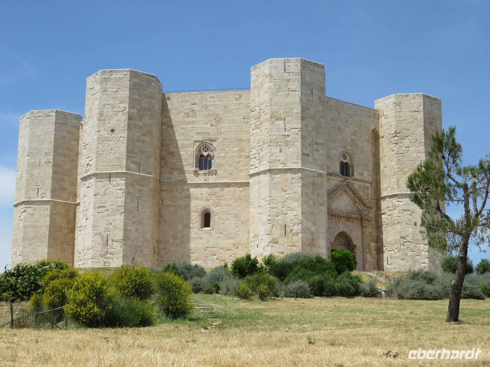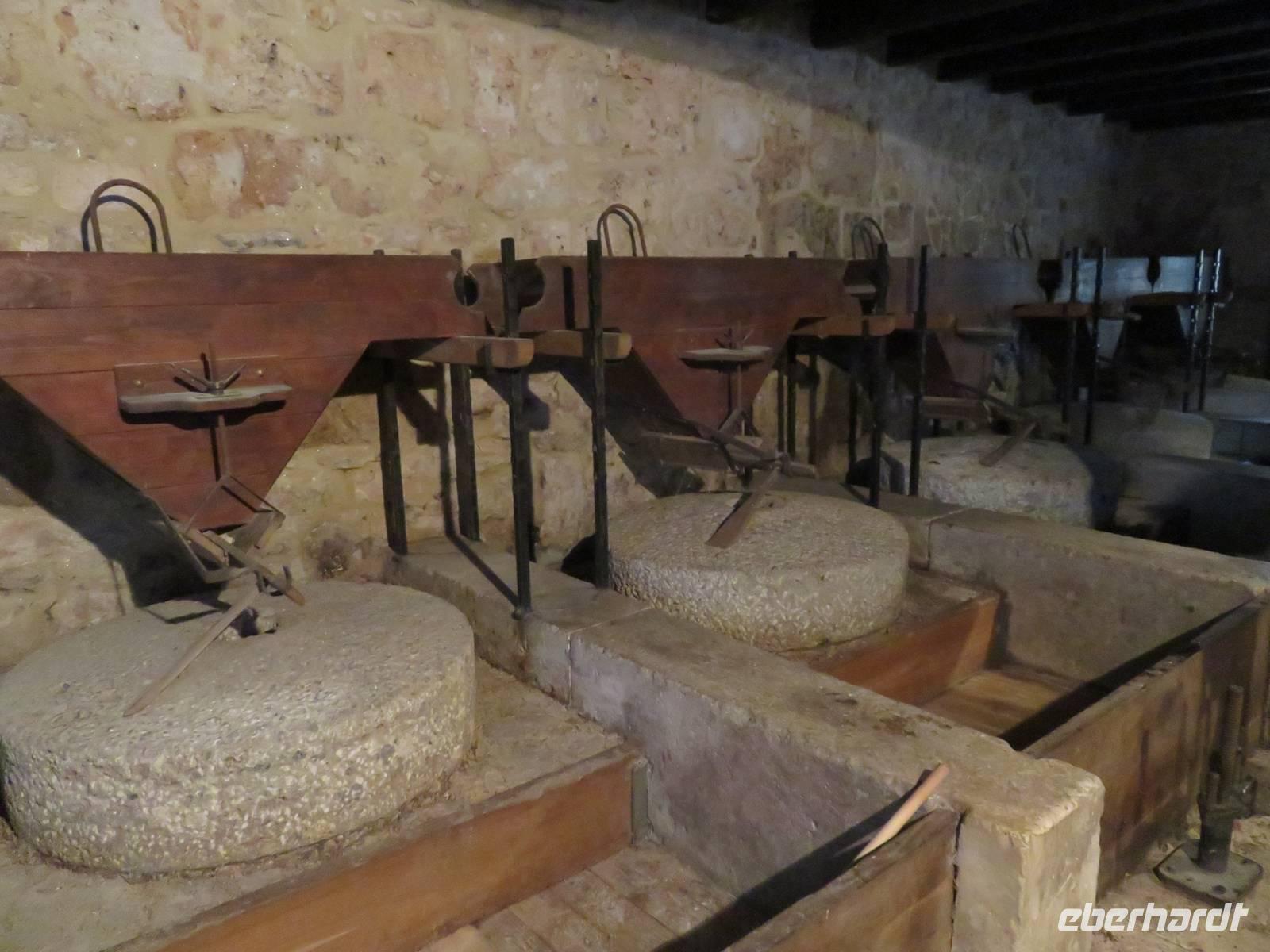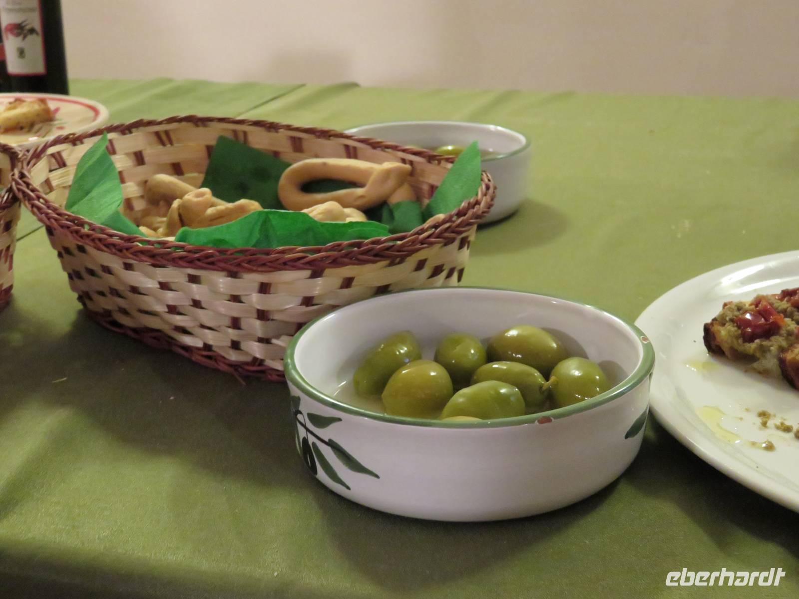 Annette Weise begleitete Eberhardt-Gäste auf einer Fahrt zur Ölmühle Galantino in Biscegli. In Apulien wird eines die besten Olivenöle hergestellt. Es gibt in Apulien 60 Millionen Olivenbäume, die bis zu 1000 Jahre und älter werden können. Ein Drittel der Weltproduktion an Olivenöl wird in Apulien hergestellt. Wir besuchten zunächst die Produktionsräume. Die Oliven werden in dieser Mühle noch ganz traditionell mit Granitmahlsteinen gemahlen. So entsteht das kalt gepresste Öl. Durch Zugabe von Basilikum, Zitrone oder Kräuter und das gleichzeitige Pressen der Oliven und der zugegebenen Früchte oder Kräuter entstehen ganz natürlich aromatisierte Öle. Wir durften sieben verschiedene Sorten verkosten und ebenfalls Oliven und Olivenpaste testen. Anschließend fand jeder noch ein Öl als Mitbringsel im Verkaufsraum. Weiter führte uns die Tour zu Krone Apuliens dem Castel del Monte. Wie eine achteckige Krone ragt das imposante Bauwerk aus der Landschaft. Kaiser Friedrichs II lies diese Residenz erbauen und bis ins 17. Jahrhundert war es bewohnt oder wurde als Gefängnis genutzt. Heute zählt es zum UNESCO-Weltkulturerbe. Wir besichtigten die ehemaligen Wohnräume und Zeugnisse der frühen Wohnkultur. Auf der Rückfahrt erzählte uns die örtliche Reiseleiterin noch die Geschichte der runden Steinhäuser, die überall in Apulien zu sehen sind. Sie wurden aus Natursteinen in Trockenbauweise erbaut und wurden als Speicher aber auch als Wohnhäuser der Bauern benutzt.