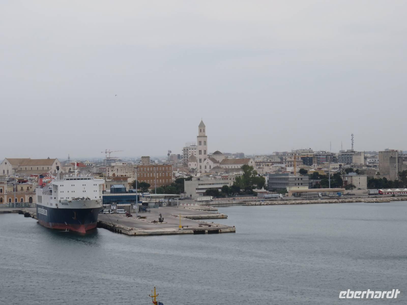 Am Vormittag legte unsere AIDAvita im neuen Hafen der 350.000 Einwohner zählenden Industrie- und Universitätsstadt Bari an. Die Stadt hat eine 8 km lange Uferpromenade, eine Altstadt mit Kastell, Kathedrale, Basilika und kleinen Gassen, aber auch neue moderne Geschäftsstraßen und Wohnviertel. Verschiedene AIDA-Ausflüge in die Stadt und die nähere Umgebung wurden angeboten.