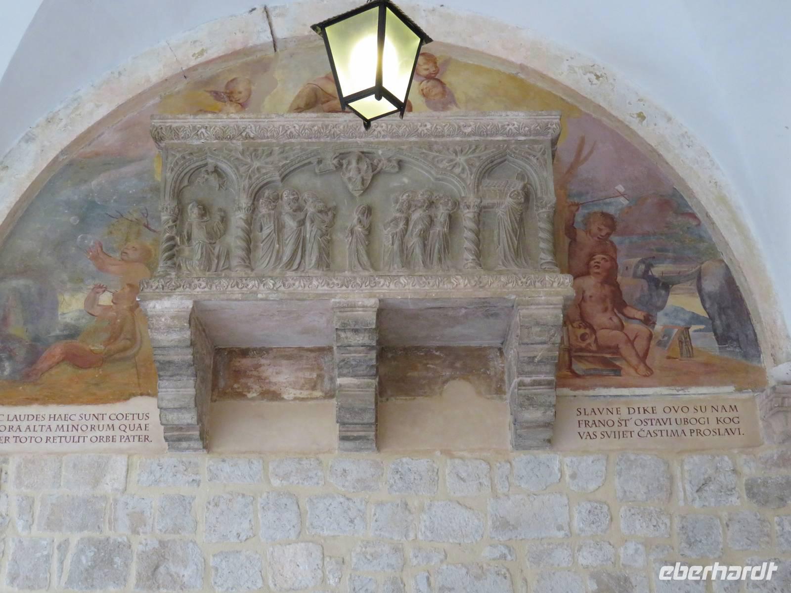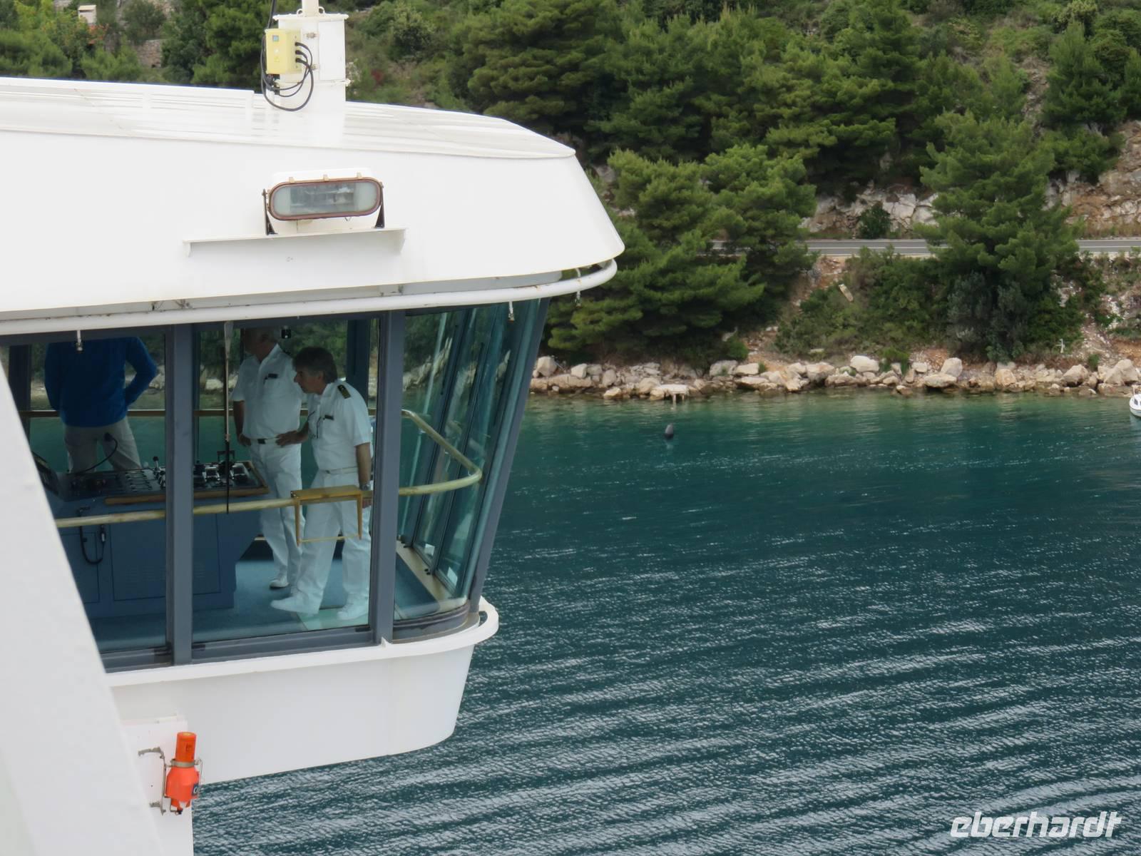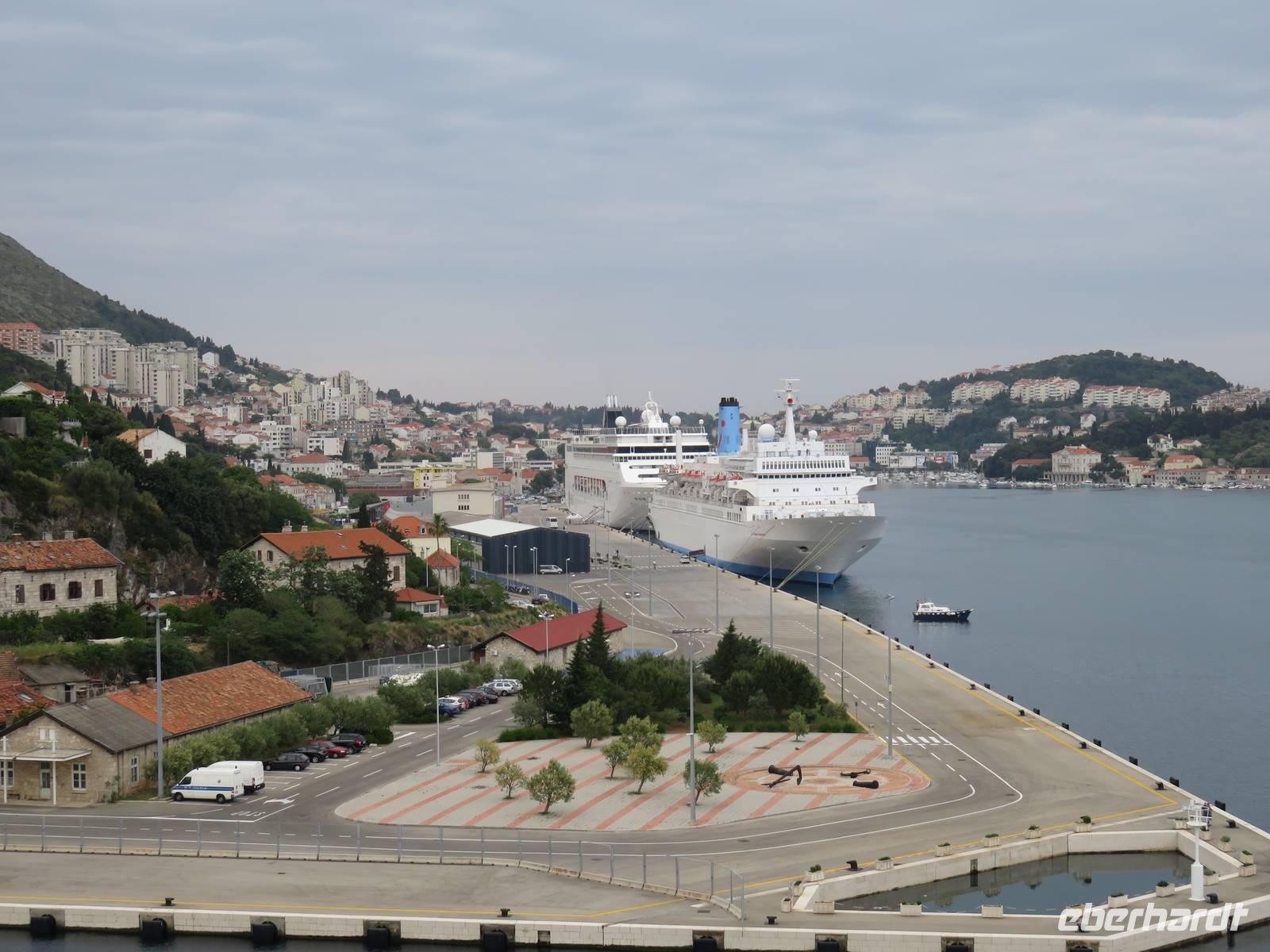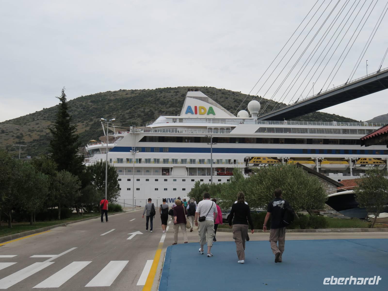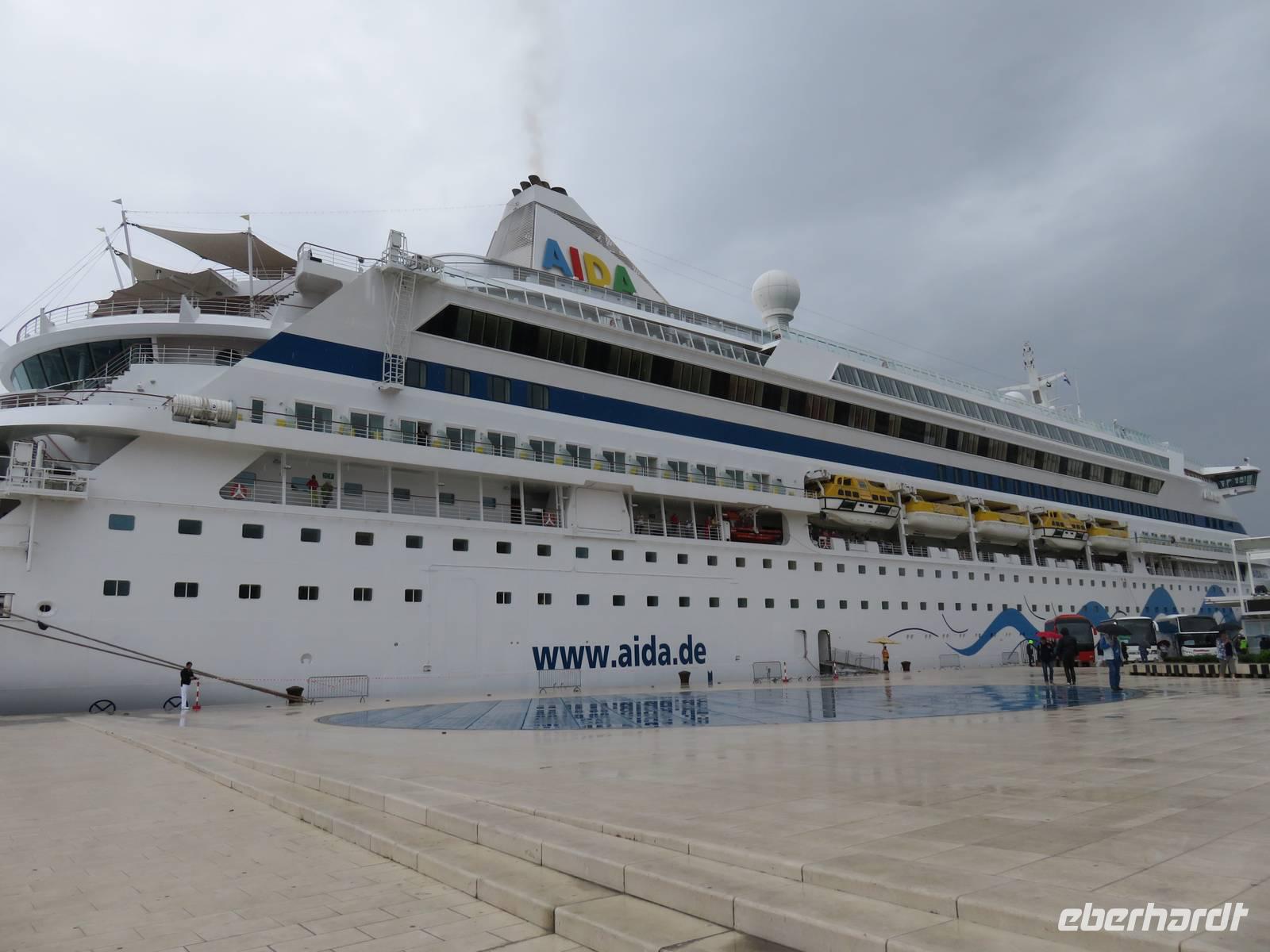 Am frühen Morgen legte die AIDAvita unmittelbar unter der imposanten Brücke im Hafen von Dubrovnik an. Heute begaben wir uns auf den ersten Eberhardt-Inklusivausflug auf dieser Reise. Die örtlichen Reiseleiterinnen nahmen uns in Empfang, dann ging es mit 2 Bussen zuerst die Serpentinen hinauf zur Fernstraße. Von einem Aussichtspunkt aus hatten wir einen herrlichen Blick auf das Panorama der ganzen Stadt. Anschließend führte uns die Tour zum Pile-Platz, dem zentralen Verkehrsknoten am Eingangstor zur Altstadt. Im Inneren der bis zu 25 m hohen Mauern eröffnet sich eine andere Welt, eine komplett nach dem Jugoslawienkrieg wieder hergestellte und restaurierte historische Stadt, die von einer umlaufenden, über 2 km langen Stadtmauer umgeben ist und wegen ihrer Komplexität und Schönheit zum Weltkulturerbe der UNESCO zählt. Von den Reiseleiterinnen erfuhren wir viel zur Geschichte der Stadt und insbesondere zur über 500 Jahre hier praktizierten Demokratie in der Republik Dubrovnik. Klöster, Kirchen, öffentliche Gebäude, die Hauptstraße, die vielen engen Gassen, der Markt, der Hafen und eine der ältesten Apotheken der Welt im Franziskaner-Kloster gehörten zu unserem Besichtigungsprogramm. Anschließend hatten wir genügend Zeit, die Stadt uf eigene Faust zu erkunden. Einige Gäste nutzen mit Annette Weise die Gelegenheit zum Aufstieg auf die Stadtmauer und zu einen Rundgang auf dieser. Wir erlebten wunderbare Ausblicke auf die Altstadt und die weitere Umgebung von Dubrovnik und das Meer mit den umliegenden Inseln. Unzählige Restaurants, Cafés, Geschäfte und Souvenirläden lockten in der Stadt zum Besuch und wir probierten die kulinarischen Angebote. Sogar das Wetter hatte zeitweilig ein Einsehen und so konnten wir mit unvergesslichen Eindrücken wieder zum Schiff fahren. Am Nachmittag nahm AIDAvita Kurs Richtung Zadar. Eine Kunstauktion in der AIDA-Bar, die große James-Bond-Show im Theater und viele weitere Unterhaltungsmöglichkeiten standen uns bis spät in die Nacht zur Verfügung.