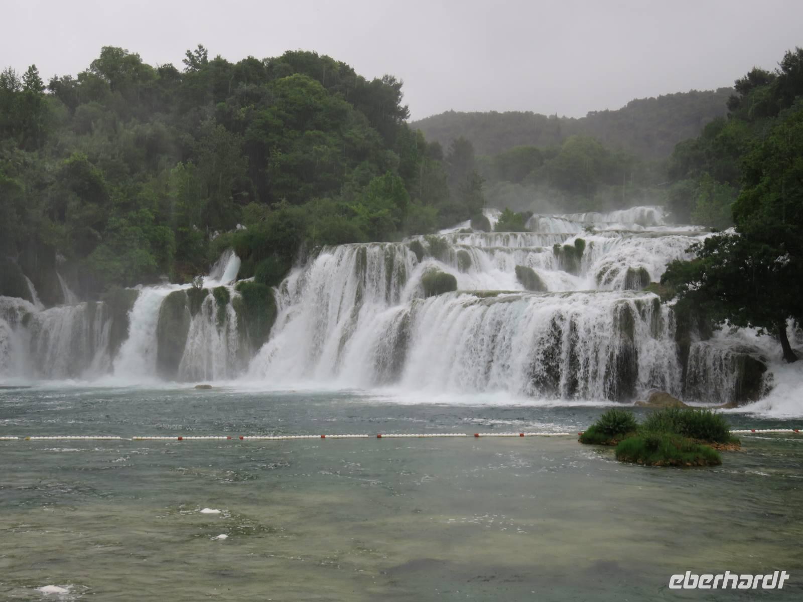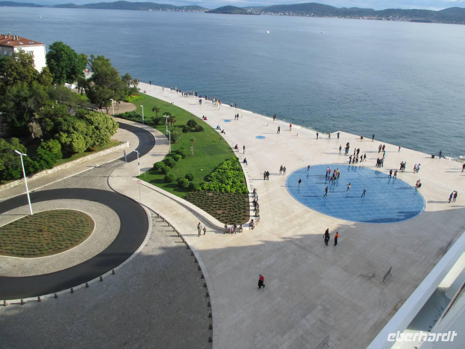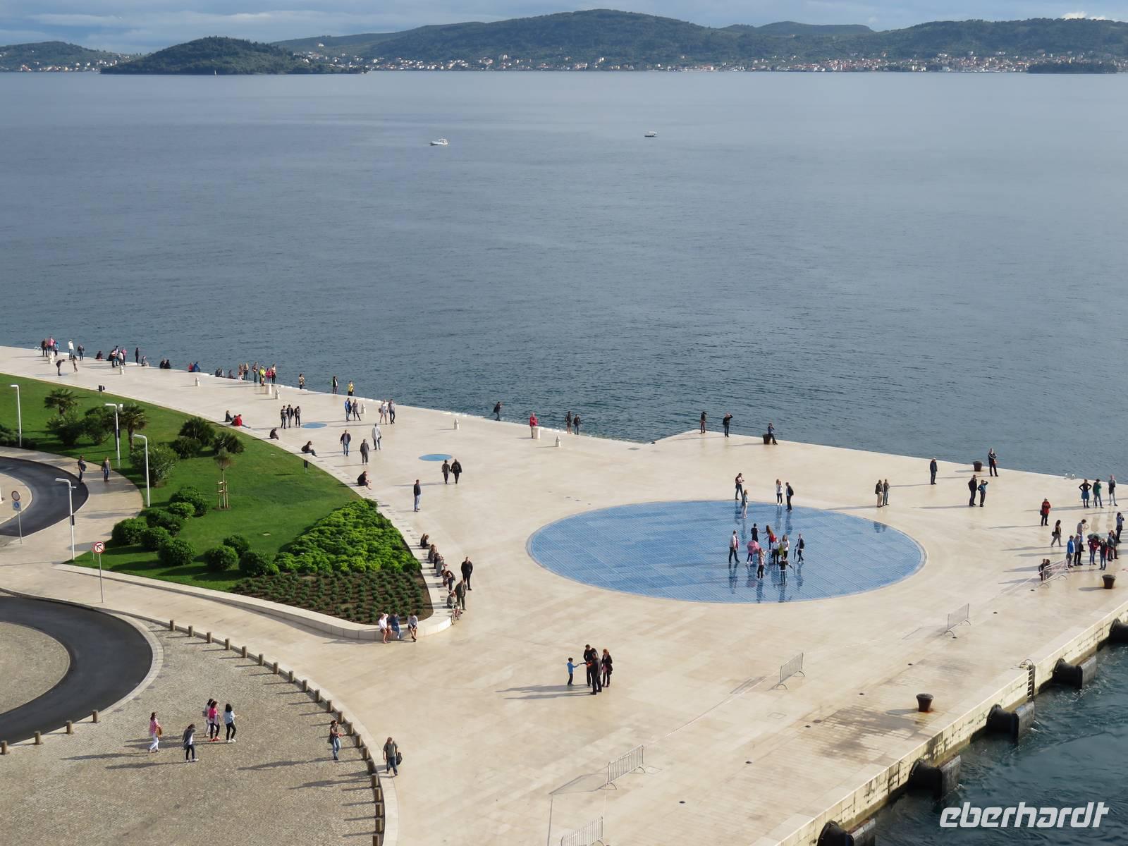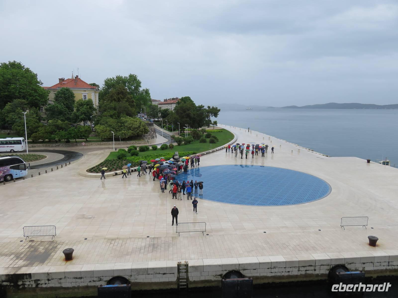 Nach einer windigen Überfahrt von Dubrovnik aus erreichten wir mit unserer AIDAvita am Vormittag die kroatische Stadt Zadar. Das Wetter hatte uns nun leider komplett im Stich gelassen, für den ganzen Tag war Regen angesagt. Unser Eberhardt-Inklusivausflug begann heute mit einem Spaziergang in die Stadt. Schon unmittelbar am Liegeplatz erwarteten uns zwei Highlights. Der „Gruß an die Sonne" ist eine moderne Installation aus Solarelementen, die abends die Uferpromenade beleuchten. Die Meeresorgel ist einmalig in der Welt. Durch die Bewegung des Wassers wird hier Luft in unterirdische Röhren gedrückt, dadurch werden über Orgelpfeifen unterschiedliche Töne erzeugt, eine einzigartige Musik entsteht. Weiter führte uns unsere Spaziergang in das städtische Museum. Vielfältige Exponate aus den vergangenen Jahrhunderten, insbesondere viele sakrale Ausstellungsstücke aus Gold und Silber, künden vom ehemaligen Reichtum der Handelsstadt Zadar und ihrer wechselvollen Geschichte. Die Nonnen des Klosters behüten und beschützemn diesen einmaligen Schatz bereits seit dem 16. Jahrhundert und er ist nie in die Hände von Feinden gefallen. Ein kurzer Besuch in der Donatuskirche und ein anschließender Gang durch die Stadt führten uns vor die Stadtmauer, von wo wir per Bus unseren Ausflug in Richtung Krka - Nationapark fortstzten. Wir stärkten uns mit einem Lunch-Paket während der Busfahrt, weil leider auf Grund des Wetters ein Picknick im Park nicht möglich war. Im Bereich des Nationalparks Wasserfälle Krka erwartete uns heftiger Regen, trotzdem nahmen wir den Spaziergang über die gut ausgebauten Wege, Treppen und Holzstege in das Herz des Nationalparks in Angriff. Die wunderschöne Natur, die besondere Tier- und Pflanzenwelt und insbesondere die Vielzahl und Vielfalt der unterschiedlichen Wasserfälle, Strudel, Flussläufe und Bäche war beeindruckend. Manchmal dachten wir, dass doch Winnetou gleich um die Ecke kommen müsste, denn die berühmten Filme wurden uneter anderem im Nationalpark gedreht. Leider konnten wir das alles nicht so ausgiebig genießen, da inzwischen wohl jeder irgendwie und irgendwo nass war. Auf der AIDAvita angekommen, klarte wie zum Spott der Himmel etwas auf und es schien sogar zum Auslaufen noch kurzzeitig die Sonne. Auch das Programm auf dem Schiff musste sich dem Wetter anpassen. Eigentlich auf dem Pooldeck geplant, erlebten wir die Ansprache des Kapitäns und die Verabschideung der Crew im Theater. Harald, der Generalmanger und Annett, die Enertaint-Managerin päsentierten uns einige interessante Zahlen, was wir gemeinsam mit den anderen Gästen der AIDAvita in der einen Woche in Restaurants verspeist hatten: unter anderem 6 Tonnen Fleisch, 7 Tonnen Obst und Gemüse und 7.000 Liter Wein. Die Show „In the Jingle" begeisterte uns anschließend im Theater. Gleichwohl tat das der Stimmung auf dem Schiff keinen Abbruch.
