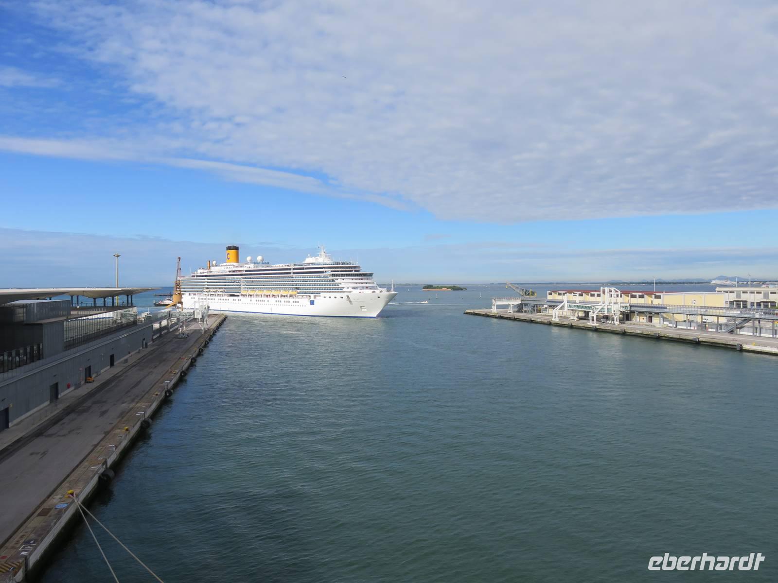 Nach einem guten Frühstück ging die Fahrt bei herrlichem Wetter weiter durch die Dolomiten in Richtung Venedig. Unterwegs legten wir einen Zwischenstopp im Weingut „Zonin" in Gambarella ein. Dort wurden wir herzlich empfangen und durch das Museum und den Weinkeller geführt. Wir erhieleten umfangreiche Erklärungen zur Geschichte des Weingutes und den Besonderheiten der einzelnen Weine. Ein leckeres Mittagessen und die Verkostung von 3 in diesem Weingut hergestellten Weinen waren die Höhepunkte des Besuchs. Weiter ging die Fahrt zum Hafen von Venedig, in dem bereits neben anderen Kreuzfahrtschiffen auch unsere AIDAvita angelegt hatte und für uns bereit stand. Die Busse wurden verabschiedet, das Einchecken und der Gepäcktransport verliefen reibungslos. Nachdem wir unsere Kabinen bezogen hatten, stärkten wir uns bei Kaffee und Kuchen. Nach einem zeitigen Abendessen absolvierte wir die obligatorische Seenot-Rettungsübung mit den Schwimmwesten. Bei einem wunderschönen Sonnenuntergang hieß es kurz nach 20:00 Uhr „Leinen los" und die spektakuläre Ausfahrt aus Venedig unmittelbar vorbei am Markusplatz und den anderen historischen Gebäuden und den Kanälen konnte beginnen. Auf dem Schiff erlebten wir eine Lasershow, die Begrüßung durch das Management und eine erste Musik- und Tanzshow auf dem Pooldeck.