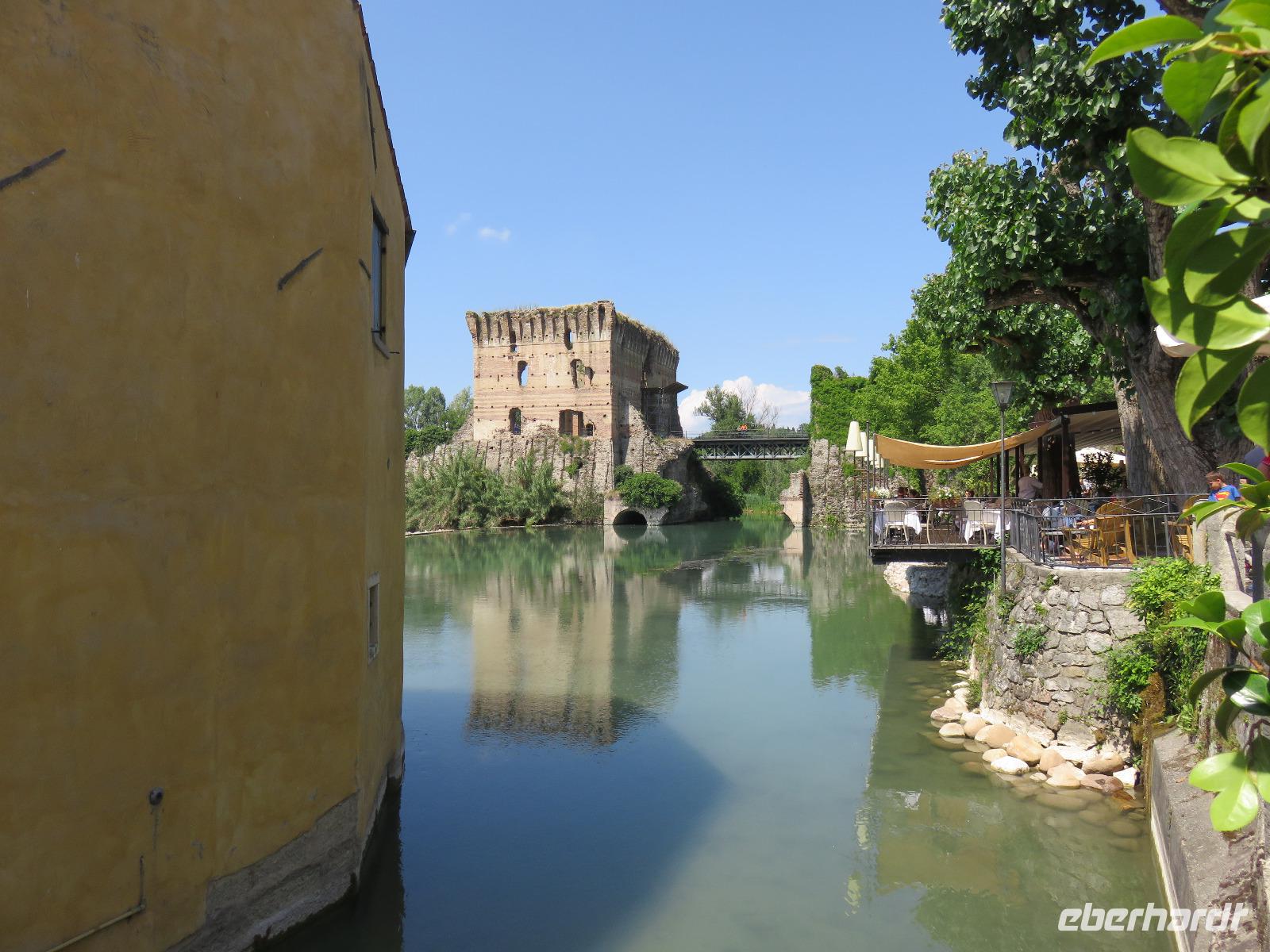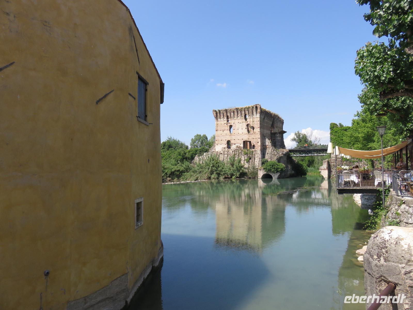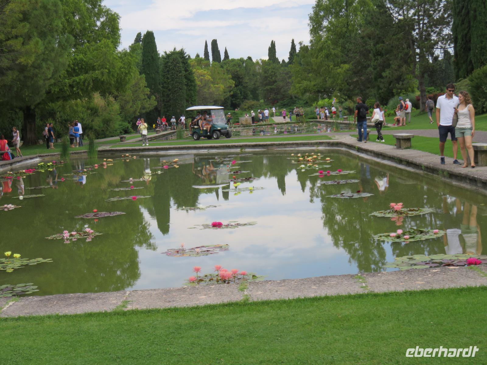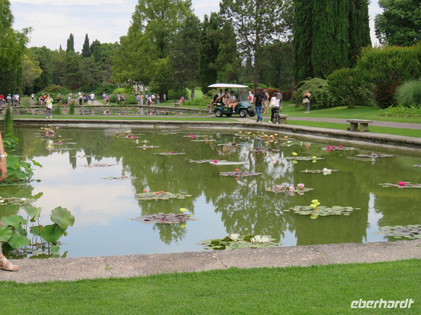 Der Parco Sigurtà, ein wunderschöner Landschaftgarten, begeisterte uns während unserer Fahrt mit einem Elektrozug durch seine unterschiedlichen Bereiche: Große Wiese, Kräutergarten, Wildgehege, Rosenallee und Seerosenbecken. Es war ein Fest der Sinne. Nach etwas Zeit für individuelle Besichtigungen fuhren wir nach Borghetto am Mincio. Zuerst bestaunten wir die 600 Meter lange Visconti-Brücke, die auch heute intakt ist. Kaum zu glauben, dass diese zu Beginn des 15. Jahrhunderts in nur acht Monaten erbaut wurde. In dem kleinen Mühlenort nutzten wir die Freizeit zum Bummeln. Die kleine Restaurants, Cafés und Pizzarien luden uns zum Mittagessen ein.