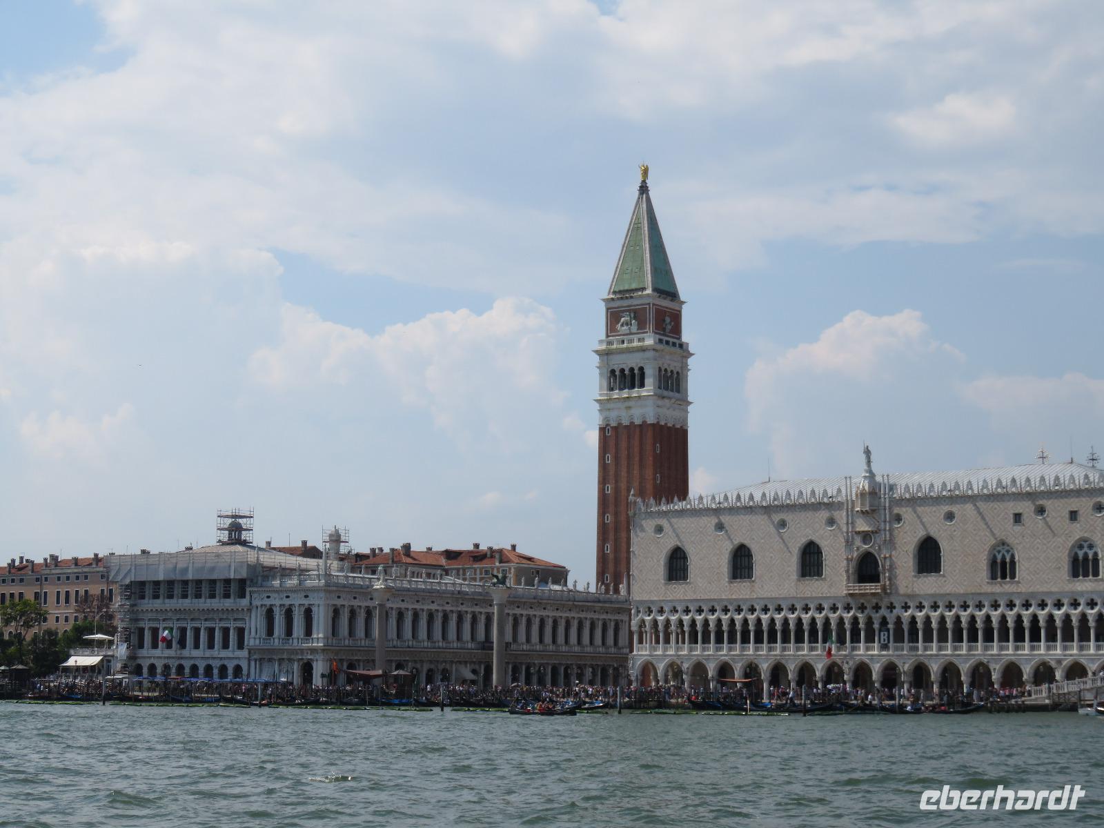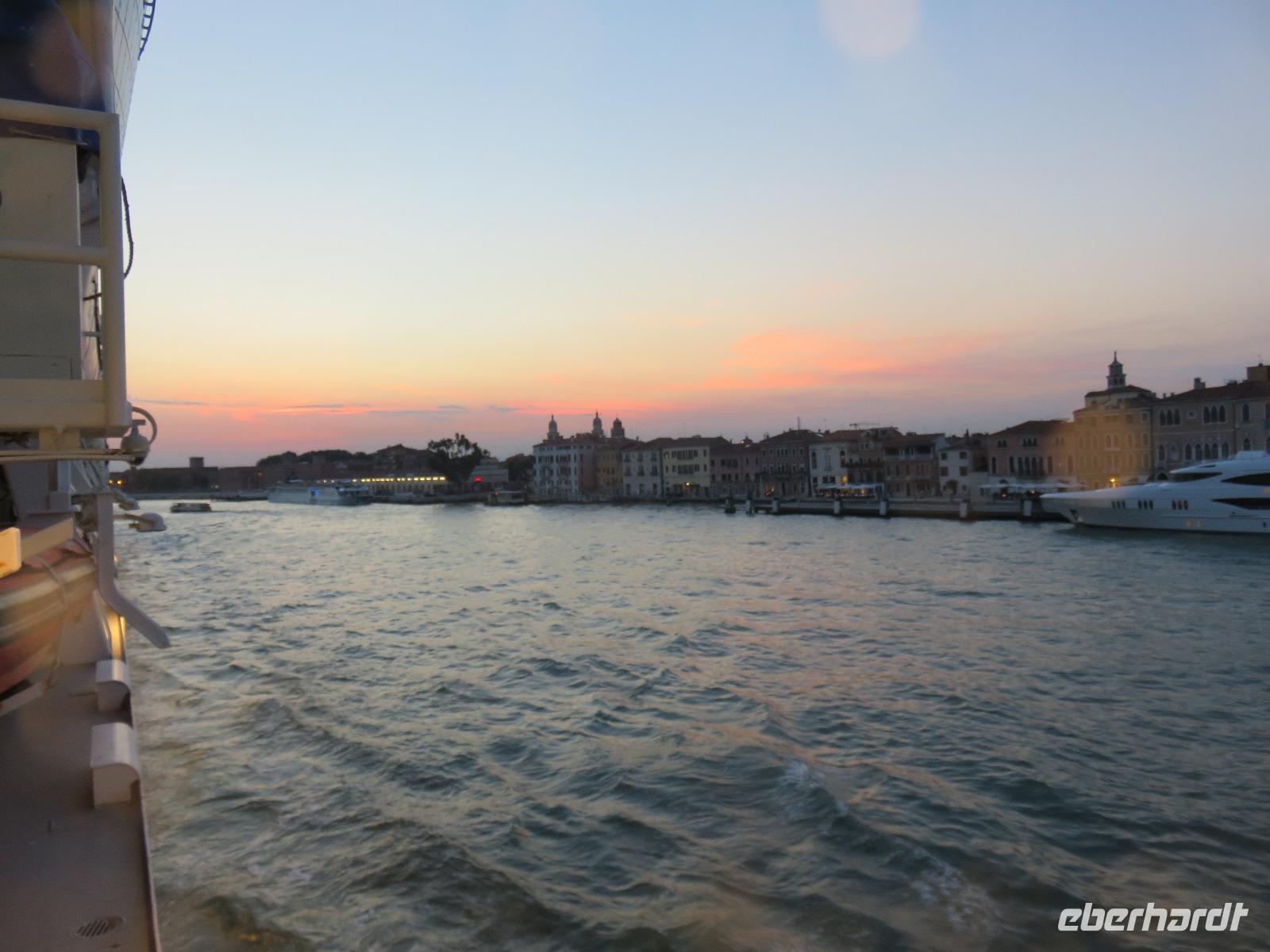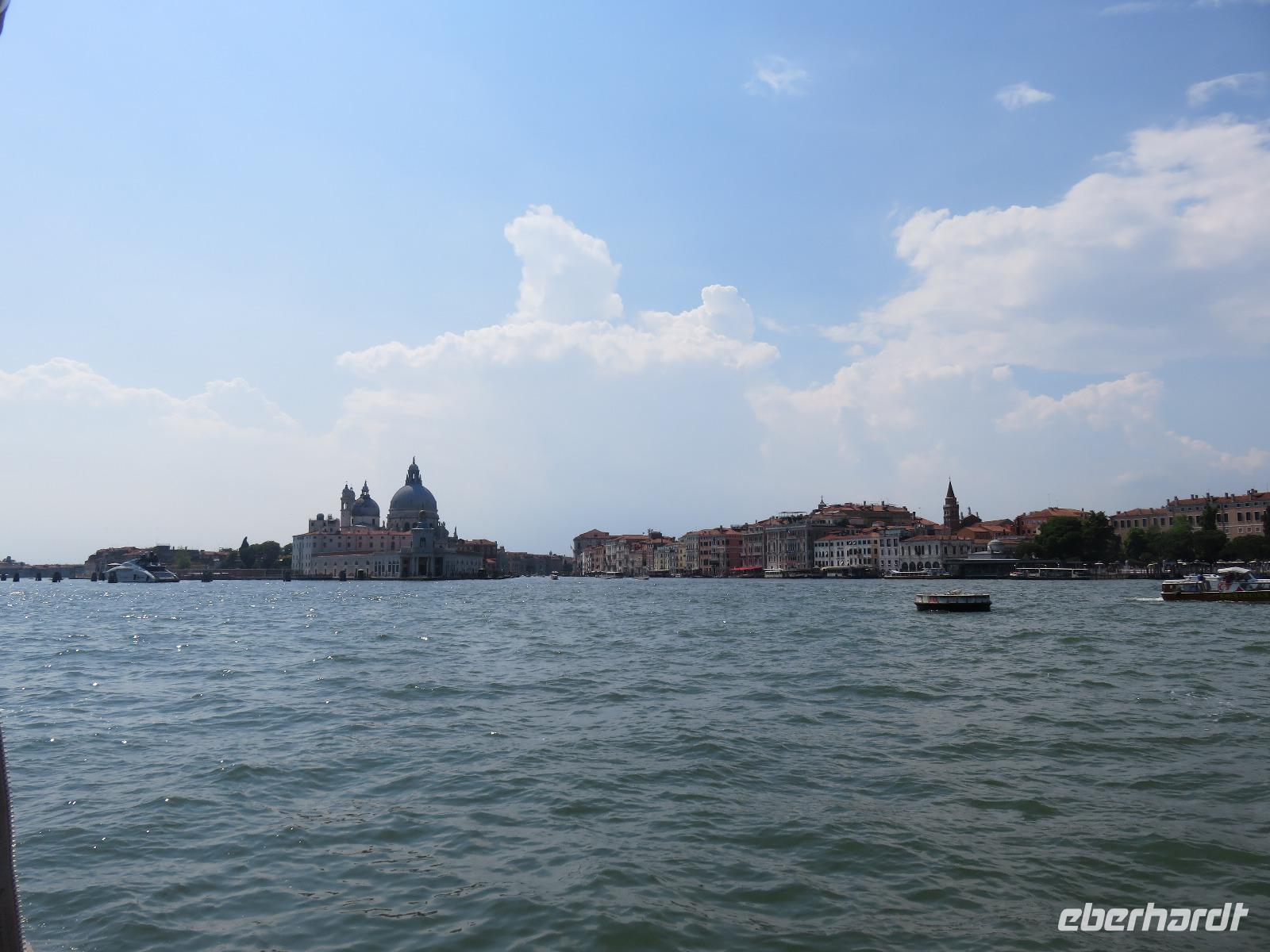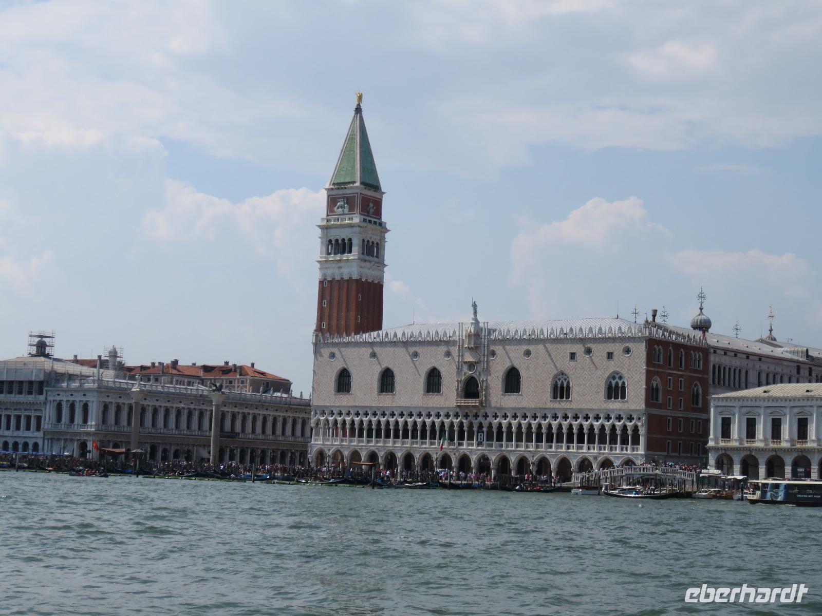 Zuerst nutzten wir den modernen People Mover, einen Zug, der auf Stelzen vorbei am Hafen der Kreuzfahrtschiffe bis zum Römischen Platz fährt. Hier begrüßte uns unsere örtliche Reiseleiterin Lucia. Wir gingen zuerst zum Campo Campazzo, dann zum Campo S. Polo. Unsere Reiseleiterin wählte eine Strecke, die noch Abseits von den großen Touristenströmen lag. Unterwegs erfuhren wir Wissenswertes zum Leben in Venedig und natürlich zur Geschichte der Stadt. Plötzlich lag er vor uns, der Canal Grande mit der imposanten Rialto-Brücke. Hier sprudelte die Stadt fast über, sehr viele Touristen waren an diesem äußerst sonnigen, heißen Tag, bei fast wolkenlosem Himmel, unterwegs. Wir sahen kurz den Gondolieren bei der Arbeit zu. Aber wirklich nur ganz kurz, denn wir wollten unbedingt zum Markusplatz mit dem Campanile und dem Dogenpalast, den wir durch ein Gewirr engster Gassen mit vielen Touristen erreichten. Für alle Gäste war dies eine Stippvisite zum Auffrischen für Wiederbesucher oder zum neugierig werden für alle Gäste, die zum ersten Mal in Venedig weilten. Nach etwas Freizeit spazierten wir vom Markusplatz zum Schiffsanleger zu unserer Bootsüberfahrt zum Kreuzfahrthafen. Ein Gewimmel nicht nur in den Gassen ... die Boote standen zum Anlegen an. Und so mussten wir etwas warten, bis unser Boot an der Reihe war. Schließlich legten wir 15.10 Uhr ab und konnten den Markusplatz, die Kirche San Marco und den Canal Grande nun aus völlig neuer Perspektive bestaunen. Wir fuhren mit dem Boot zwischen den großen Schiffen von MSC und Royal Caribbian. Die AIDAblu versteckte sich noch etwas hinter diesen Ozeanriesen.