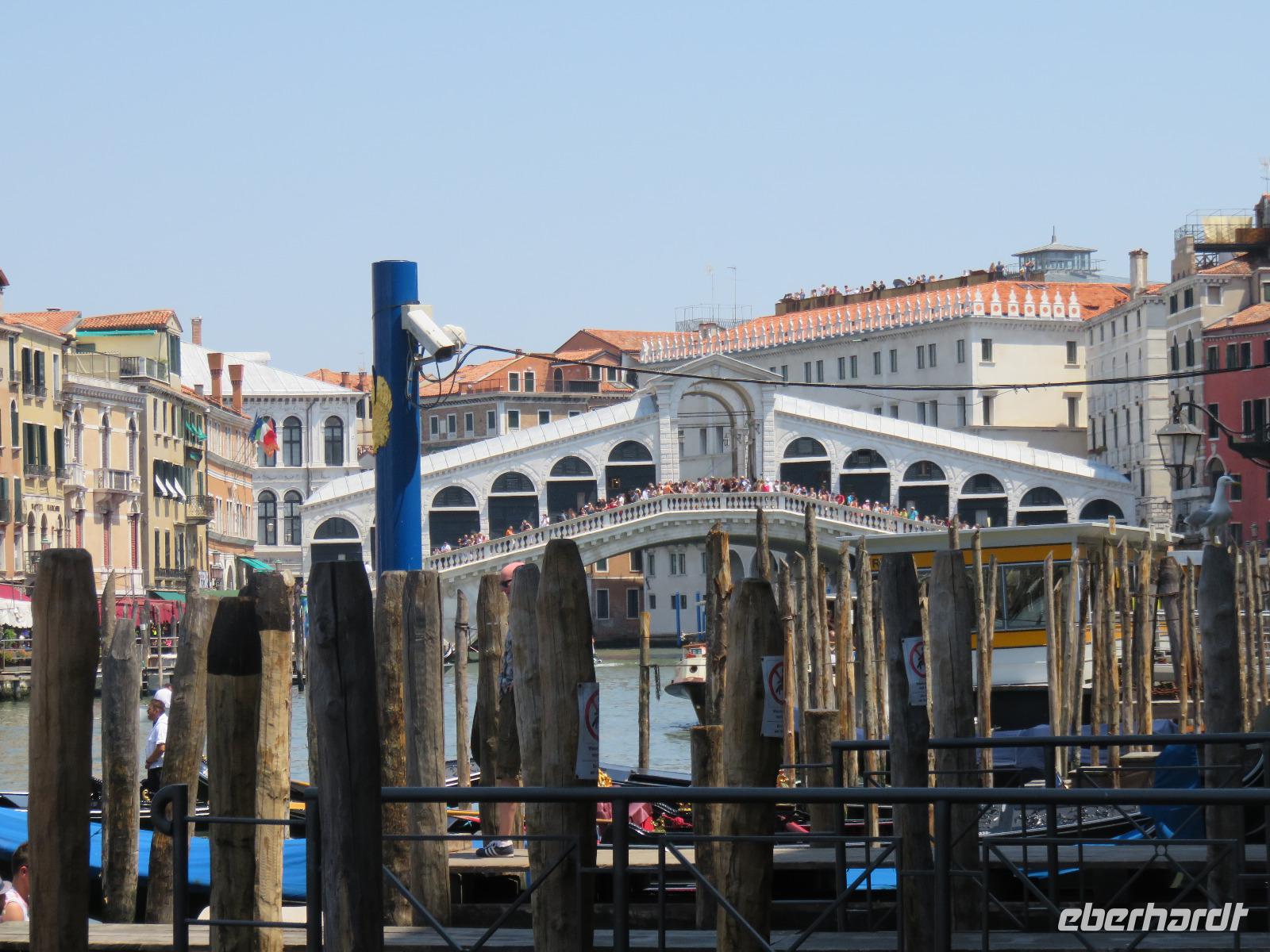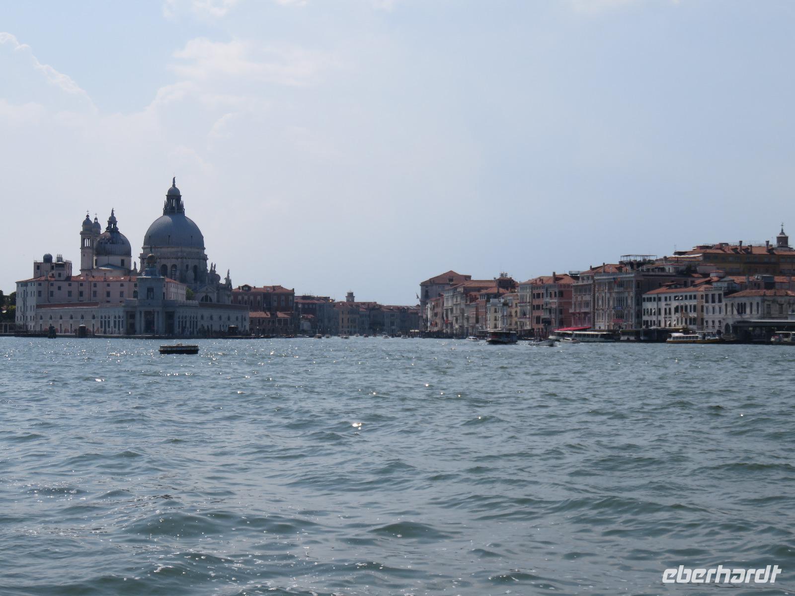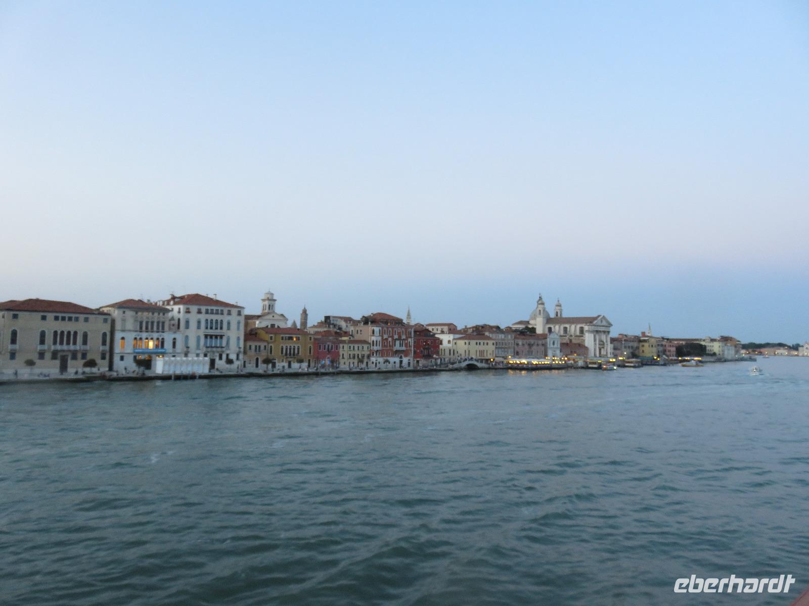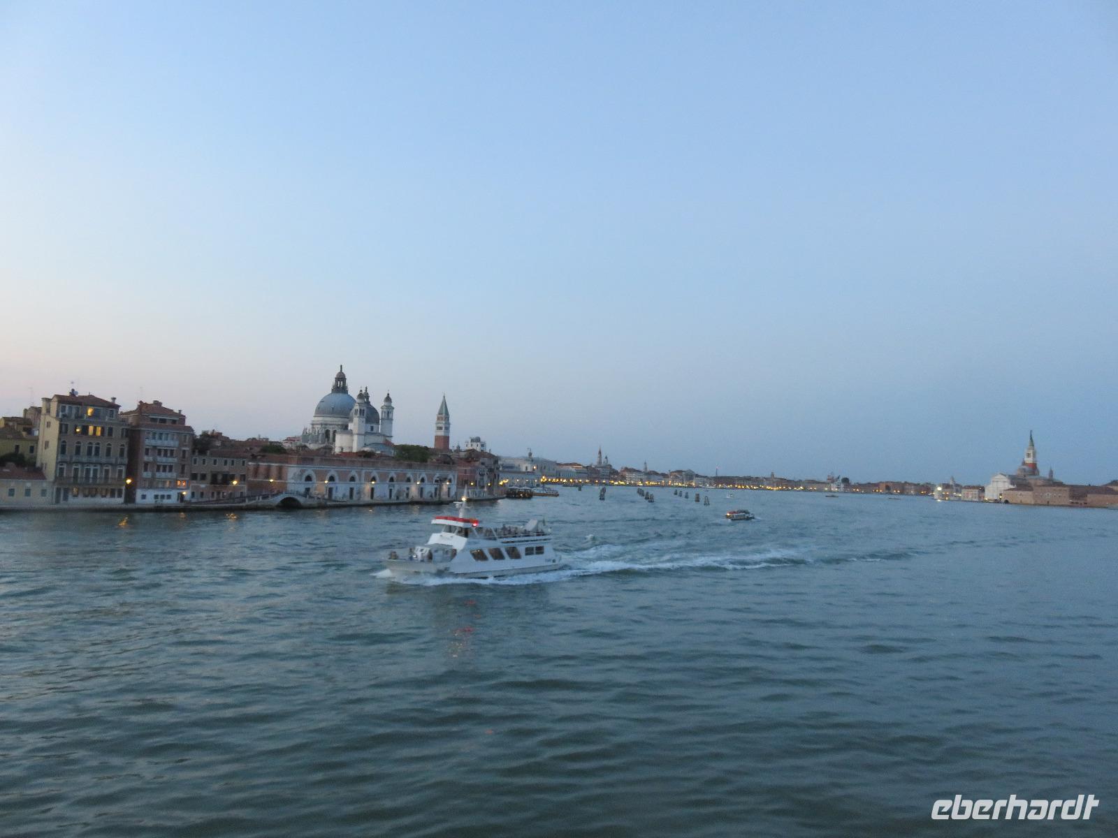 Zuerst nutzten wir den modernen People Mover, einen Zug, der auf Stelzen vorbei am Hafen der Kreuzfahrtschiffe bis zum Römischen Platz fährt. Hier begrüßte uns unsere örtliche Reiseleiterin Lucia. Wir gingen zuerst zum Campo Campazzo, dann zum Campo S. Polo. Unsere Reiseleiterin wählte eine Strecke, die noch Abseits von den großen Touristenströmen lag. Unterwegs erfuhren wir Wissenswertes zum Leben in Venedig und natürlich zur Geschichte der Stadt. Plötzlich lag er vor uns, der Canal Grande mit der imposanten Rialto-Brücke. Hier sprudelte die Stadt fast über, sehr viele Touristen waren an diesem äußerst sonnigen, heißen Tag, bei fast wolkenlosem Himmel, unterwegs. Wir sahen kurz den Gondolieren bei der Arbeit zu. Aber wirklich nur ganz kurz, denn wir wollten unbedingt zum Markusplatz mit dem Campanile und dem Dogenpalast, den wir durch ein Gewirr engster Gassen mit vielen Touristen erreichten. Für alle Gäste war dies eine Stippvisite zum Auffrischen für Wiederbesucher oder zum neugierig werden für alle Gäste, die zum ersten Mal in Venedig weilten. Nach etwas Freizeit spazierten wir vom Markusplatz zum Schiffsanleger zu unserer Bootsüberfahrt zum Kreuzfahrthafen. Ein Gewimmel nicht nur in den Gassen ... die Boote standen zum Anlegen an. Und so mussten wir etwas warten, bis unser Boot an der Reihe war. Schließlich legten wir 15.10 Uhr ab und konnten den Markusplatz, die Kirche San Marco und den Canal Grande nun aus völlig neuer Perspektive bestaunen. Wir fuhren mit dem Boot zwischen den großen Schiffen von MSC und Royal Caribbian. Die AIDAblu versteckte sich noch etwas hinter diesen Ozeanriesen.