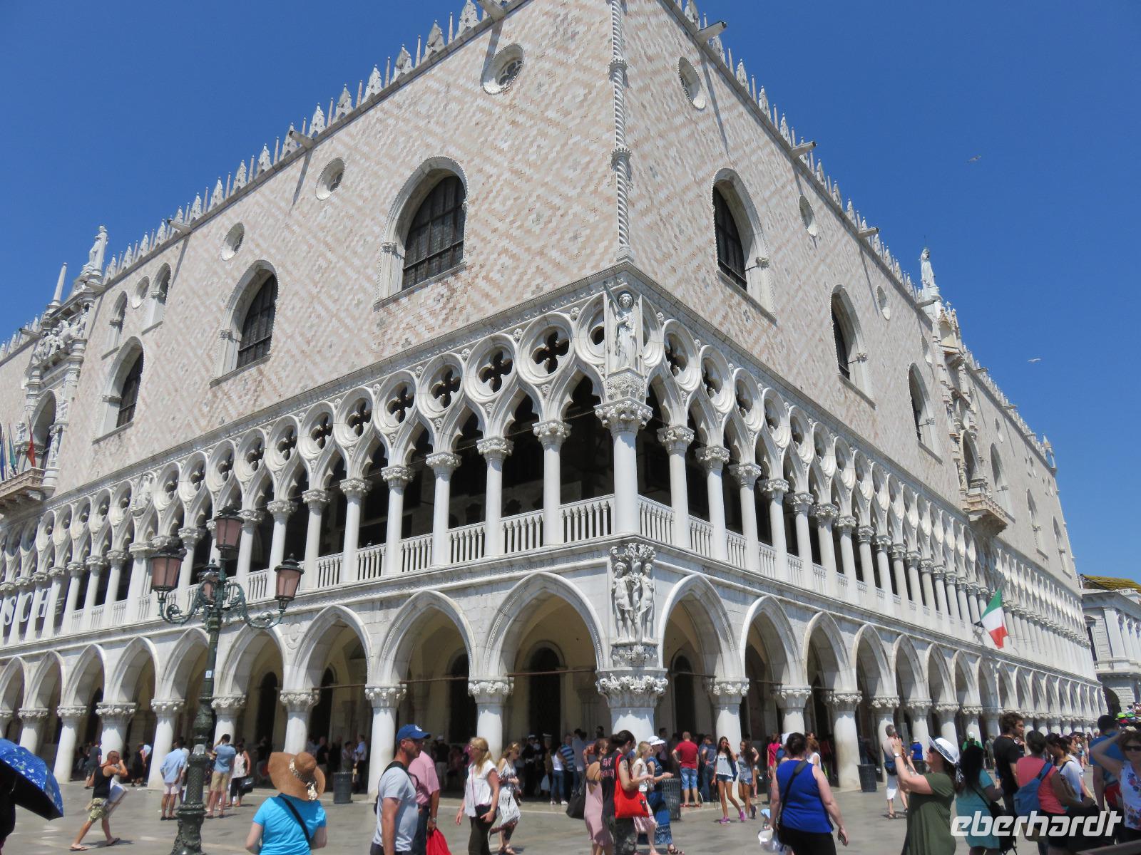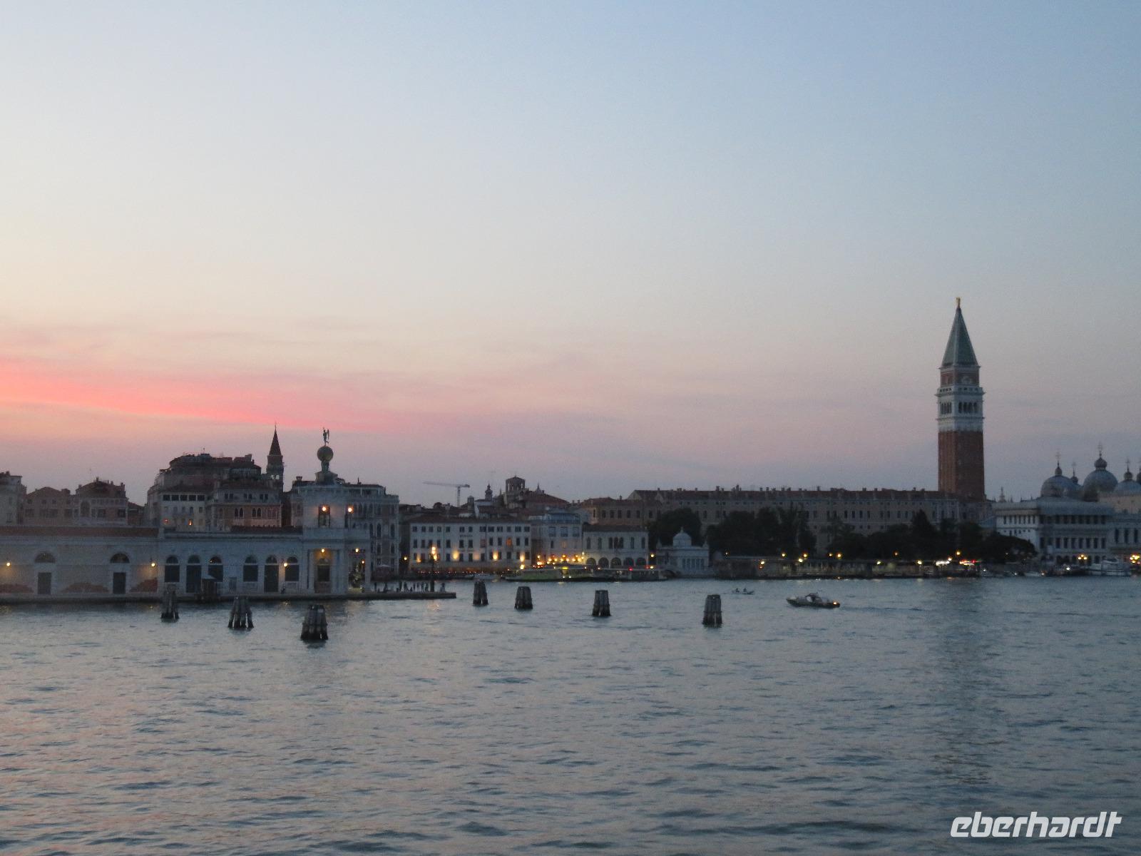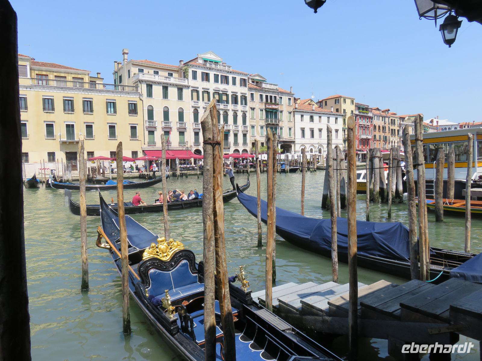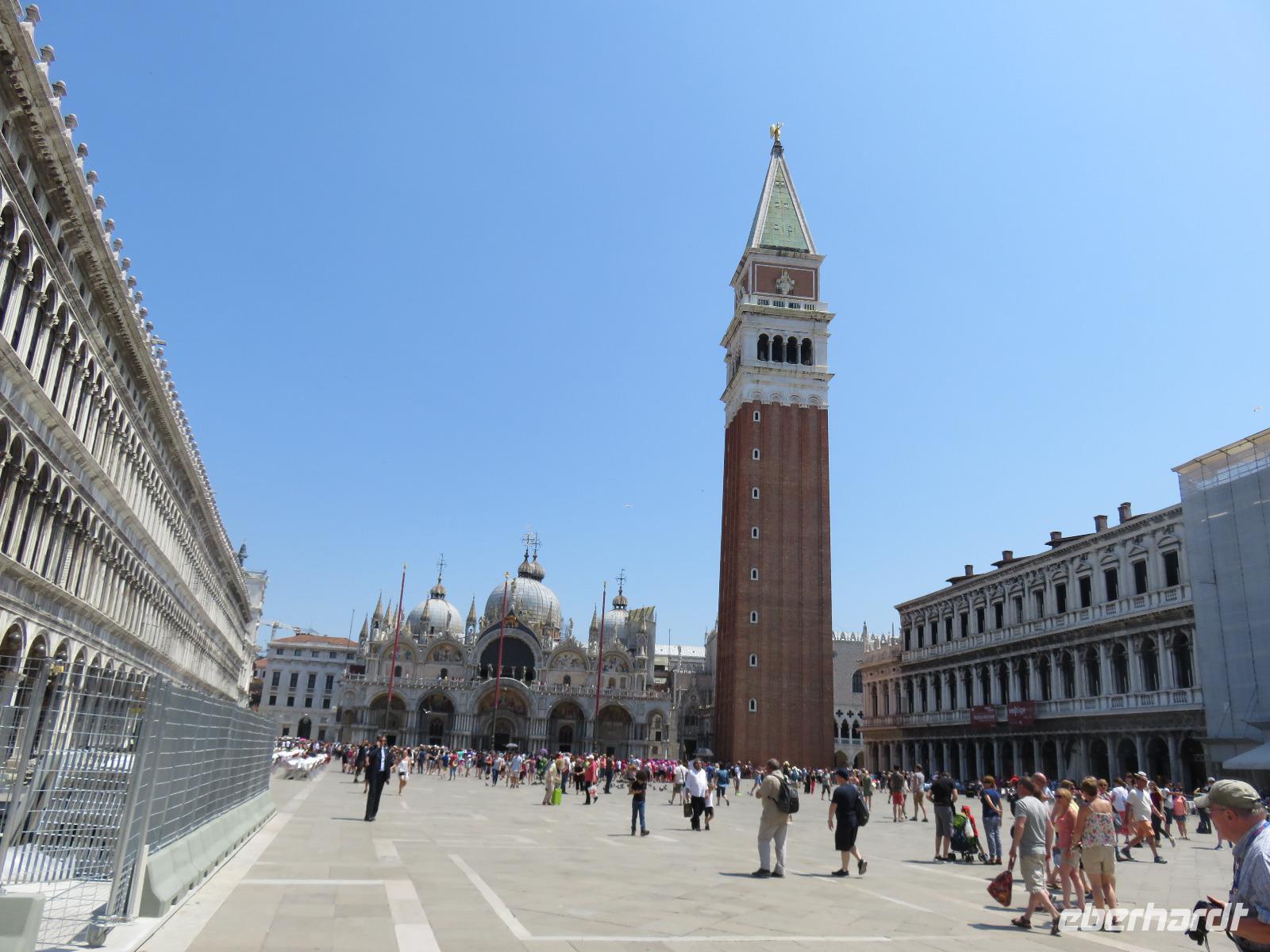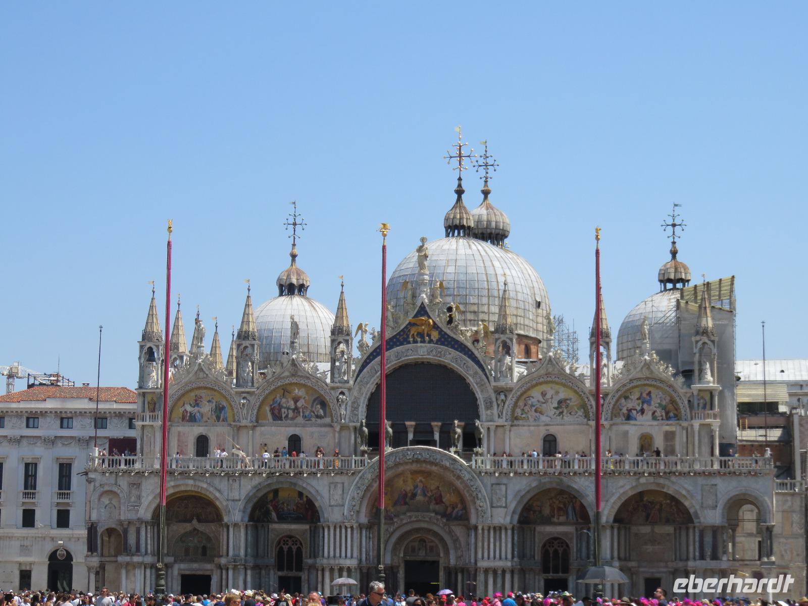Zuerst nutzten wir den modernen People Mover, einen Zug, der auf Stelzen vorbei am Hafen der Kreuzfahrtschiffe bis zum Römischen Platz fährt. Hier begrüßte uns unsere örtliche Reiseleiterin Lucia. Wir gingen zuerst zum Campo Campazzo, dann zum Campo S. Polo. Unsere Reiseleiterin wählte eine Strecke, die noch Abseits von den großen Touristenströmen lag. Unterwegs erfuhren wir Wissenswertes zum Leben in Venedig und natürlich zur Geschichte der Stadt. Plötzlich lag er vor uns, der Canal Grande mit der imposanten Rialto-Brücke. Hier sprudelte die Stadt fast über, sehr viele Touristen waren an diesem äußerst sonnigen, heißen Tag, bei fast wolkenlosem Himmel, unterwegs. Wir sahen kurz den Gondolieren bei der Arbeit zu. Aber wirklich nur ganz kurz, denn wir wollten unbedingt zum Markusplatz mit dem Campanile und dem Dogenpalast, den wir durch ein Gewirr engster Gassen mit vielen Touristen erreichten. Für alle Gäste war dies eine Stippvisite zum Auffrischen für Wiederbesucher oder zum neugierig werden für alle Gäste, die zum ersten Mal in Venedig weilten. Nach etwas Freizeit spazierten wir vom Markusplatz zum Schiffsanleger zu unserer Bootsüberfahrt zum Kreuzfahrthafen. Ein Gewimmel nicht nur in den Gassen ... die Boote standen zum Anlegen an. Und so mussten wir etwas warten, bis unser Boot an der Reihe war. Schließlich legten wir 15.10 Uhr ab und konnten den Markusplatz, die Kirche San Marco und den Canal Grande nun aus völlig neuer Perspektive bestaunen. Wir fuhren mit dem Boot zwischen den großen Schiffen von MSC und Royal Caribbian. Die AIDAblu versteckte sich noch etwas hinter diesen Ozeanriesen.