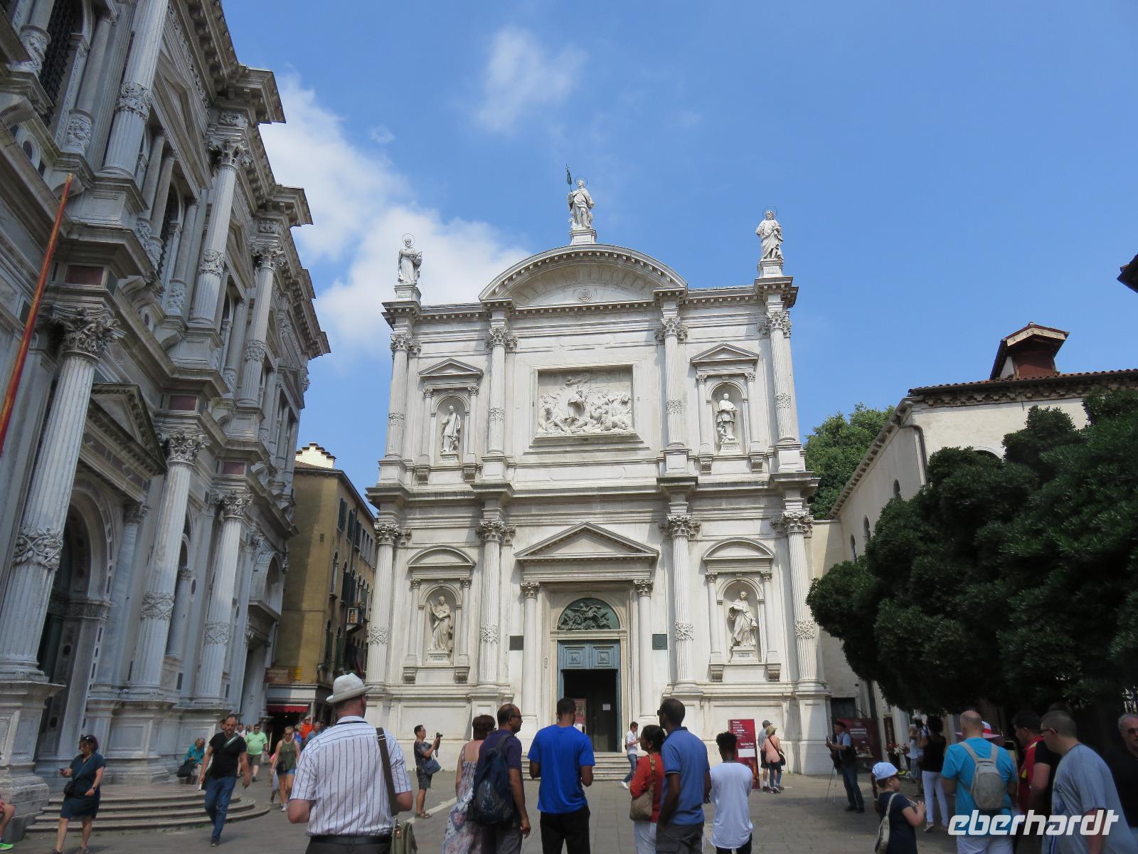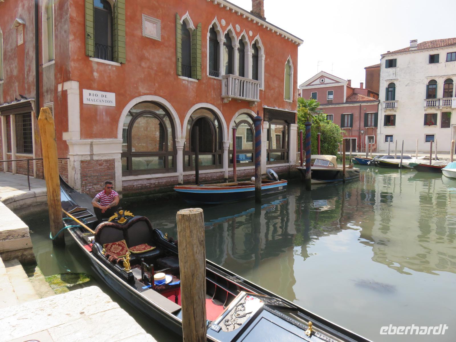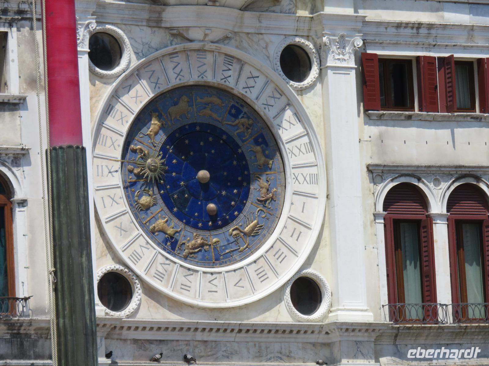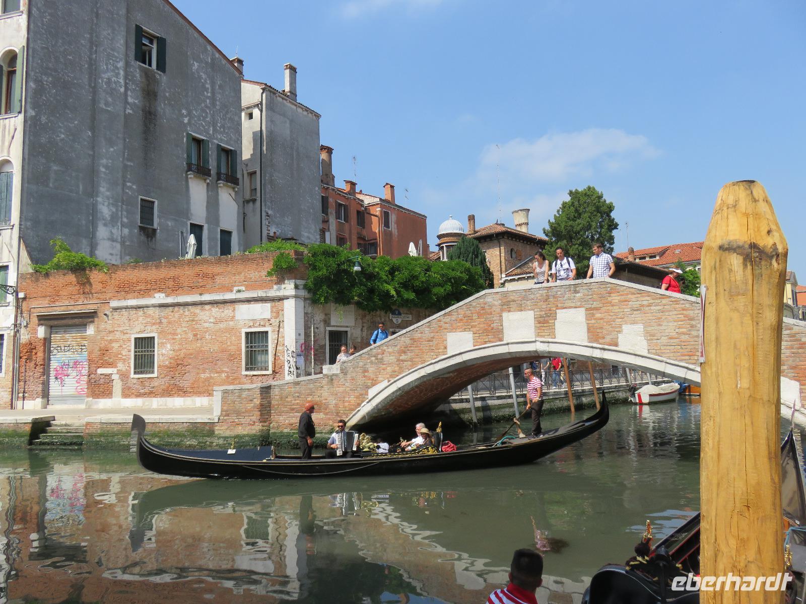 Zuerst nutzten wir den modernen People Mover, einen Zug, der auf Stelzen vorbei am Hafen der Kreuzfahrtschiffe bis zum Römischen Platz fährt. Hier begrüßte uns unsere örtliche Reiseleiterin Lucia. Wir gingen zuerst zum Campo Campazzo, dann zum Campo S. Polo. Unsere Reiseleiterin wählte eine Strecke, die noch Abseits von den großen Touristenströmen lag. Unterwegs erfuhren wir Wissenswertes zum Leben in Venedig und natürlich zur Geschichte der Stadt. Plötzlich lag er vor uns, der Canal Grande mit der imposanten Rialto-Brücke. Hier sprudelte die Stadt fast über, sehr viele Touristen waren an diesem äußerst sonnigen, heißen Tag, bei fast wolkenlosem Himmel, unterwegs. Wir sahen kurz den Gondolieren bei der Arbeit zu. Aber wirklich nur ganz kurz, denn wir wollten unbedingt zum Markusplatz mit dem Campanile und dem Dogenpalast, den wir durch ein Gewirr engster Gassen mit vielen Touristen erreichten. Für alle Gäste war dies eine Stippvisite zum Auffrischen für Wiederbesucher oder zum neugierig werden für alle Gäste, die zum ersten Mal in Venedig weilten. Nach etwas Freizeit spazierten wir vom Markusplatz zum Schiffsanleger zu unserer Bootsüberfahrt zum Kreuzfahrthafen. Ein Gewimmel nicht nur in den Gassen ... die Boote standen zum Anlegen an. Und so mussten wir etwas warten, bis unser Boot an der Reihe war. Schließlich legten wir 15.10 Uhr ab und konnten den Markusplatz, die Kirche San Marco und den Canal Grande nun aus völlig neuer Perspektive bestaunen. Wir fuhren mit dem Boot zwischen den großen Schiffen von MSC und Royal Caribbian. Die AIDAblu versteckte sich noch etwas hinter diesen Ozeanriesen.