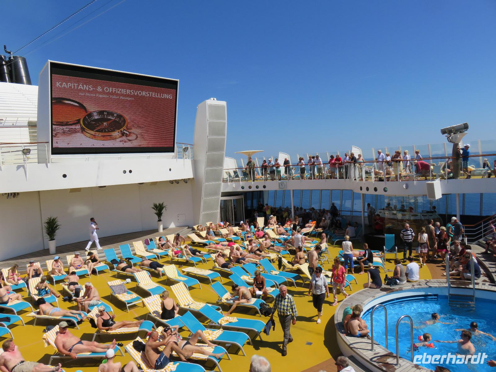 Nach einer ruhigen und erholsamen Nacht der Blick aus dem Kabinenfenster: super, glatte See, blauer Himmel, Herz, was willst Du mehr! Unser Kapitän, Volker Baumgart, begrüßte uns über den Bordfunk und gab diese Wetterprognose auch für die nächsten Tage. 11 Uhr stellte er seine Offiziere auf dem Pooldeck vor. Nun wussten wir, wer die Geschicke des Schiffes und unserer Kreuzfahrt in der Hand hat. 11.30 Uhr trafen wir uns zu unserem Gruppentreff und stießen mit einem Glas Sekt auf eine erlebnisreiche und schöne Kreuzfahrt an. Mit der Tanzlehrerin der AIDAblu Katharina begaben wir uns anschließend auf einen geführten Schiffsrundgang. Das hilft uns zur besseren Orientierung! Hatten wir ja bereits im Bus geprobt, wo Steuer- und Backbord ist, wo das Heck und der Bug ... Nun wurde alles klarer. Wir haben Zeit, und wenn wir uns einmal etwas verlaufen, auch nicht so schlimm, heute ist Seetag und wir konnten üben. Den Nachmittag verbrachte jeder ganz nach seinen Wünschen und wählte aus dem reichen Bordprogramm aus. Am Abend stellten sich die internationalen AIDA Stars mit einer stimmungsvollen Show im Theatrium vor. Auch wenn bei einem Seetag das Erholen und Genießen im Vordergrund steht, verging der Tag wie im Flug und wir träumten unserem ersten Landgang entgegen.