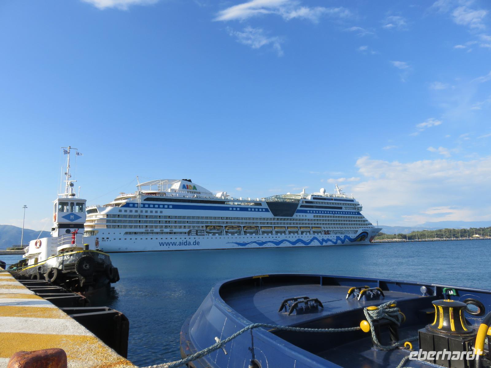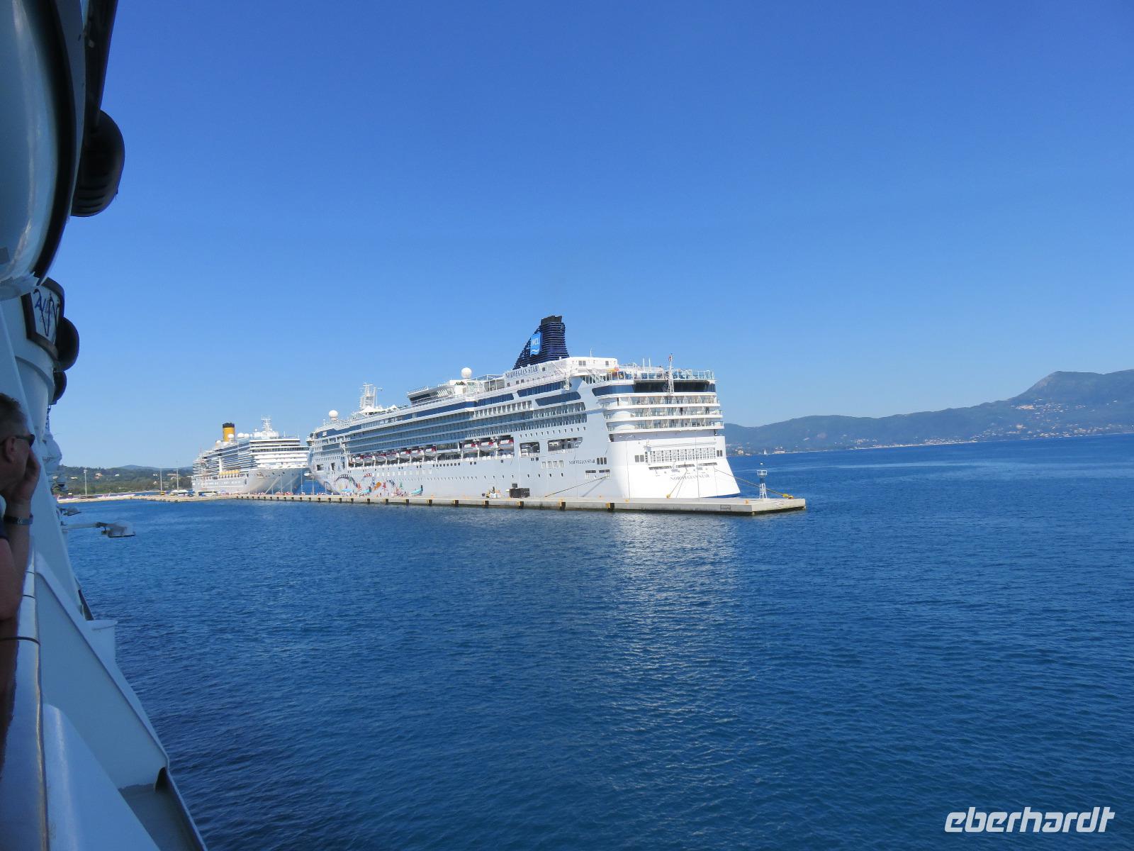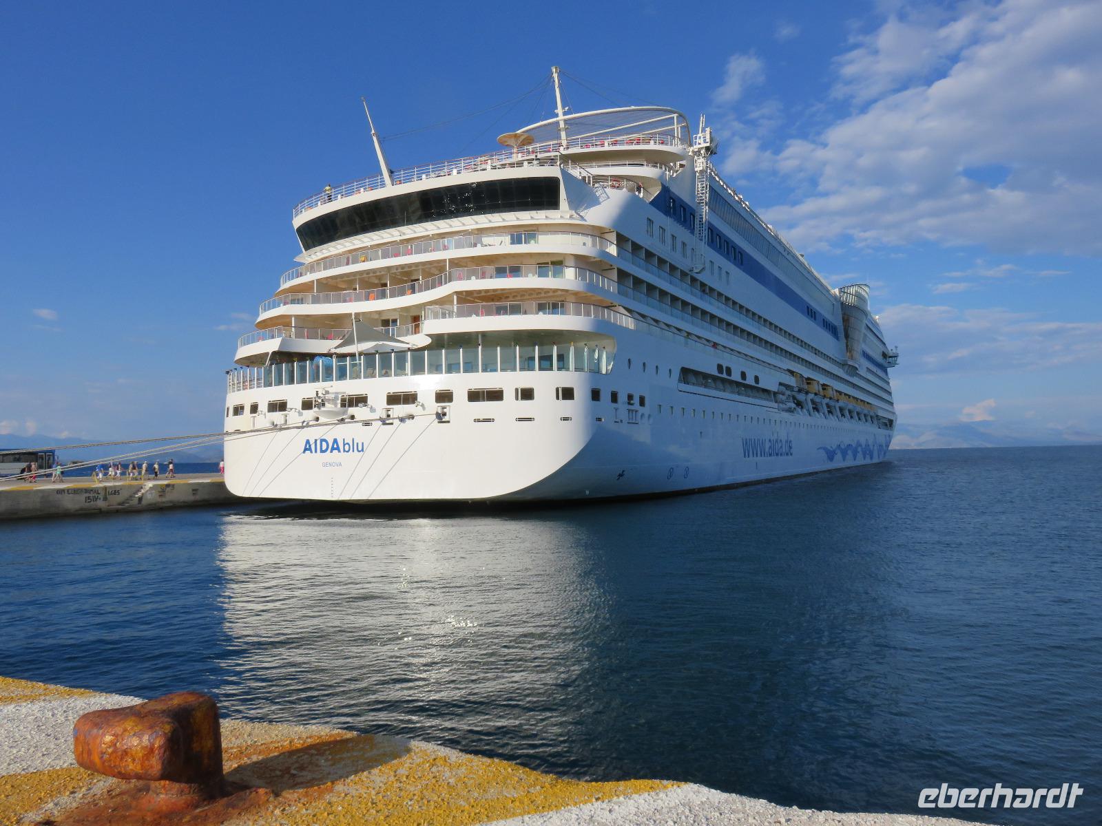 Mit einem späten Frühstück starteten wir in den Tag. Aber nicht zu spät, denn wir wollten die Passage durch die enge Seestraße zwischen Albanien und der Insel Korfu nicht verpassen. Trennen an dieser Stelle nur 1,5 Kilometer Korfu vom Festland. Es präsentierte sich uns eine prächtige Kulisse der Albanischen Berge und der bis zu 1.024 Meter hohen Bergkette Korfus im Glanz der Morgensonne. Langsam zog die AIDAblu ihre Bahn und vor uns lag bereits die Einfahrt in den Hafen von Korfu-Stadt. Pünktlich machten wir an der Pier fest - gegenüber die Costa Luminosa und die Norwegian Star. Die Mehrzahl der Gäste unserer Reisegruppe begab sich mit Helena auf den Ausflug Korfus schöne Aussichten. Zuerst besichtigen wir eine Manufaktur, wo die berühmten Kumquats, die Zwergorangen - eine Spezialität der Insel, zu Likör, Bonbons, Marmelade und anderen Leckereien verarbeitet werden. Natürlich haben wir den aromatischen Likör probiert und so fand die ein oder andere der Spezialitäten einen neuen Besitzer. Helena berichtete zum Leben auf der Insel, zu bekannten Filmen, die hier gedreht wurden, zum Leben im Kloster Paleokastritsa, zur Legende um die Steinernen Schiffe des Odysseus oder den Inselheiligen Spiridon und natürlich zur Pflanzenwelt, besonders den Kräutern und dem Olivenanbau auf Korfu, das als eine der grünsten der Ionischen Inseln gilt. Vom Aussichtspunkt Bella Vista bestaunten wir die Westküste. Schließlich warfen wir einen Blick auf die spektakuläre Landebahn des Flughafens, eine der schwierigsten der Welt, und zur Mäuseinsel. Den Abschluss bildete unser Spaziergang im historischen Zentrum von Korfu-Stadt mit dem Rathausplatz, den Arkaden am Liston und der Neuen Festung mit ihren gewaltigen Mauern. Hier trafen wir weitere Gäste unserer Reisegruppe, die auf dem Rundgang durch Korfu-Stadt mit Besuch der Sommerresidenz von Österreichs Kaiserin Elisabeth, Sissi, im Achilleion-Palast weilten. Zurück im Hafen bummelten wir schließlich vom Hafengebäude in aller Ruhe zum Schiff. Nach dem Abendessen und einem faszinierenden Sonnenuntergang wurde es heute im Theatrium rockig laut: Unter dem Motto Rock Me Baby interpretierten die AIDA Stars einige der bekanntesten Titel von Ike und Tina Turner aus den 60er und 70er Jahren. Kaum zu glauben, dass Tina Turner, die heute in der Schweiz lebt, inzwischen bereits 77 Jahre ist. Doch ein Titel fehlte uns - Simbly the Best. Den Titel mussten wir uns als Zugabe erobern - ein heißer Abschluss. Wen es noch nicht in seine Koje bzw. Kabine zog, der amüsierte sich am Alpenglühen, bei Rock'n'Roll-Oldies mit der Band Superfly oder Dance Classics.
