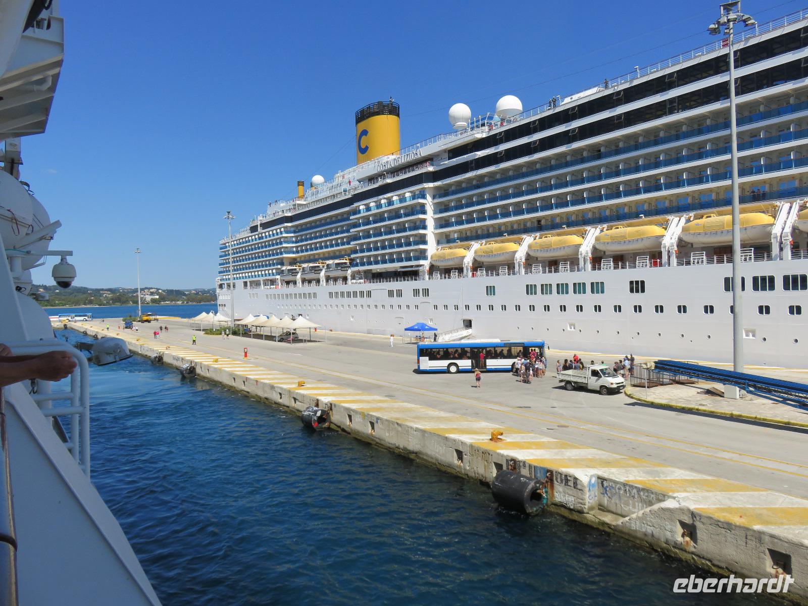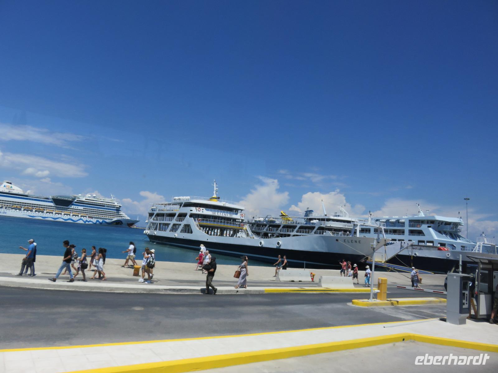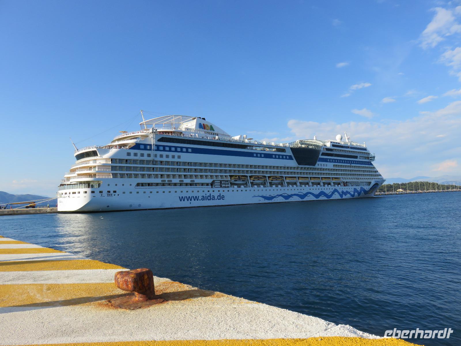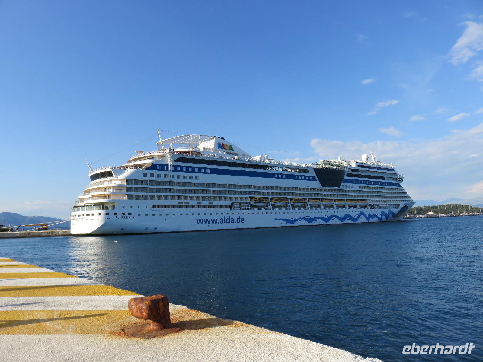 Mit einem späten Frühstück starteten wir in den Tag. Aber nicht zu spät, denn wir wollten die Passage durch die enge Seestraße zwischen Albanien und der Insel Korfu nicht verpassen. Trennen an dieser Stelle nur 1,5 Kilometer Korfu vom Festland. Es präsentierte sich uns eine prächtige Kulisse der Albanischen Berge und der bis zu 1.024 Meter hohen Bergkette Korfus im Glanz der Morgensonne. Langsam zog die AIDAblu ihre Bahn und vor uns lag bereits die Einfahrt in den Hafen von Korfu-Stadt. Pünktlich machten wir an der Pier fest - gegenüber die Costa Luminosa und die Norwegian Star. Die Mehrzahl der Gäste unserer Reisegruppe begab sich mit Helena auf den Ausflug Korfus schöne Aussichten. Zuerst besichtigen wir eine Manufaktur, wo die berühmten Kumquats, die Zwergorangen - eine Spezialität der Insel, zu Likör, Bonbons, Marmelade und anderen Leckereien verarbeitet werden. Natürlich haben wir den aromatischen Likör probiert und so fand die ein oder andere der Spezialitäten einen neuen Besitzer. Helena berichtete zum Leben auf der Insel, zu bekannten Filmen, die hier gedreht wurden, zum Leben im Kloster Paleokastritsa, zur Legende um die Steinernen Schiffe des Odysseus oder den Inselheiligen Spiridon und natürlich zur Pflanzenwelt, besonders den Kräutern und dem Olivenanbau auf Korfu, das als eine der grünsten der Ionischen Inseln gilt. Vom Aussichtspunkt Bella Vista bestaunten wir die Westküste. Schließlich warfen wir einen Blick auf die spektakuläre Landebahn des Flughafens, eine der schwierigsten der Welt, und zur Mäuseinsel. Den Abschluss bildete unser Spaziergang im historischen Zentrum von Korfu-Stadt mit dem Rathausplatz, den Arkaden am Liston und der Neuen Festung mit ihren gewaltigen Mauern. Hier trafen wir weitere Gäste unserer Reisegruppe, die auf dem Rundgang durch Korfu-Stadt mit Besuch der Sommerresidenz von Österreichs Kaiserin Elisabeth, Sissi, im Achilleion-Palast weilten. Zurück im Hafen bummelten wir schließlich vom Hafengebäude in aller Ruhe zum Schiff. Nach dem Abendessen und einem faszinierenden Sonnenuntergang wurde es heute im Theatrium rockig laut: Unter dem Motto Rock Me Baby interpretierten die AIDA Stars einige der bekanntesten Titel von Ike und Tina Turner aus den 60er und 70er Jahren. Kaum zu glauben, dass Tina Turner, die heute in der Schweiz lebt, inzwischen bereits 77 Jahre ist. Doch ein Titel fehlte uns - Simbly the Best. Den Titel mussten wir uns als Zugabe erobern - ein heißer Abschluss. Wen es noch nicht in seine Koje bzw. Kabine zog, der amüsierte sich am Alpenglühen, bei Rock'n'Roll-Oldies mit der Band Superfly oder Dance Classics.