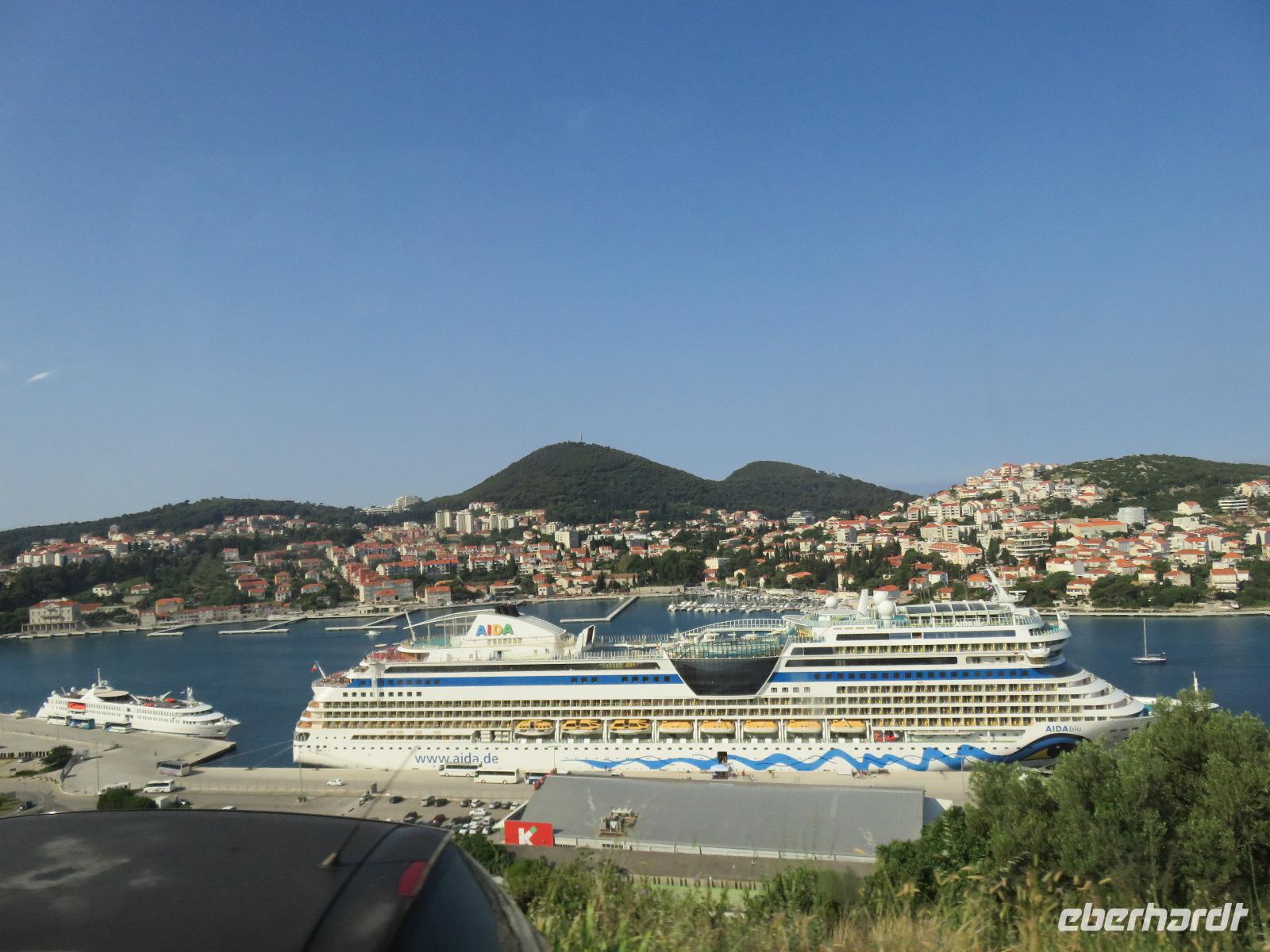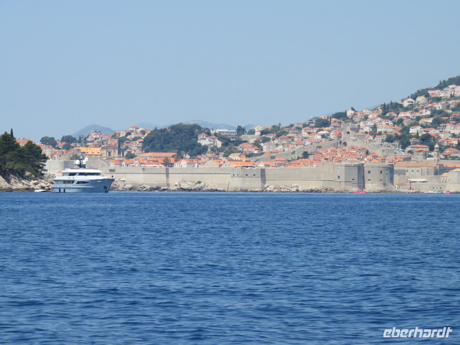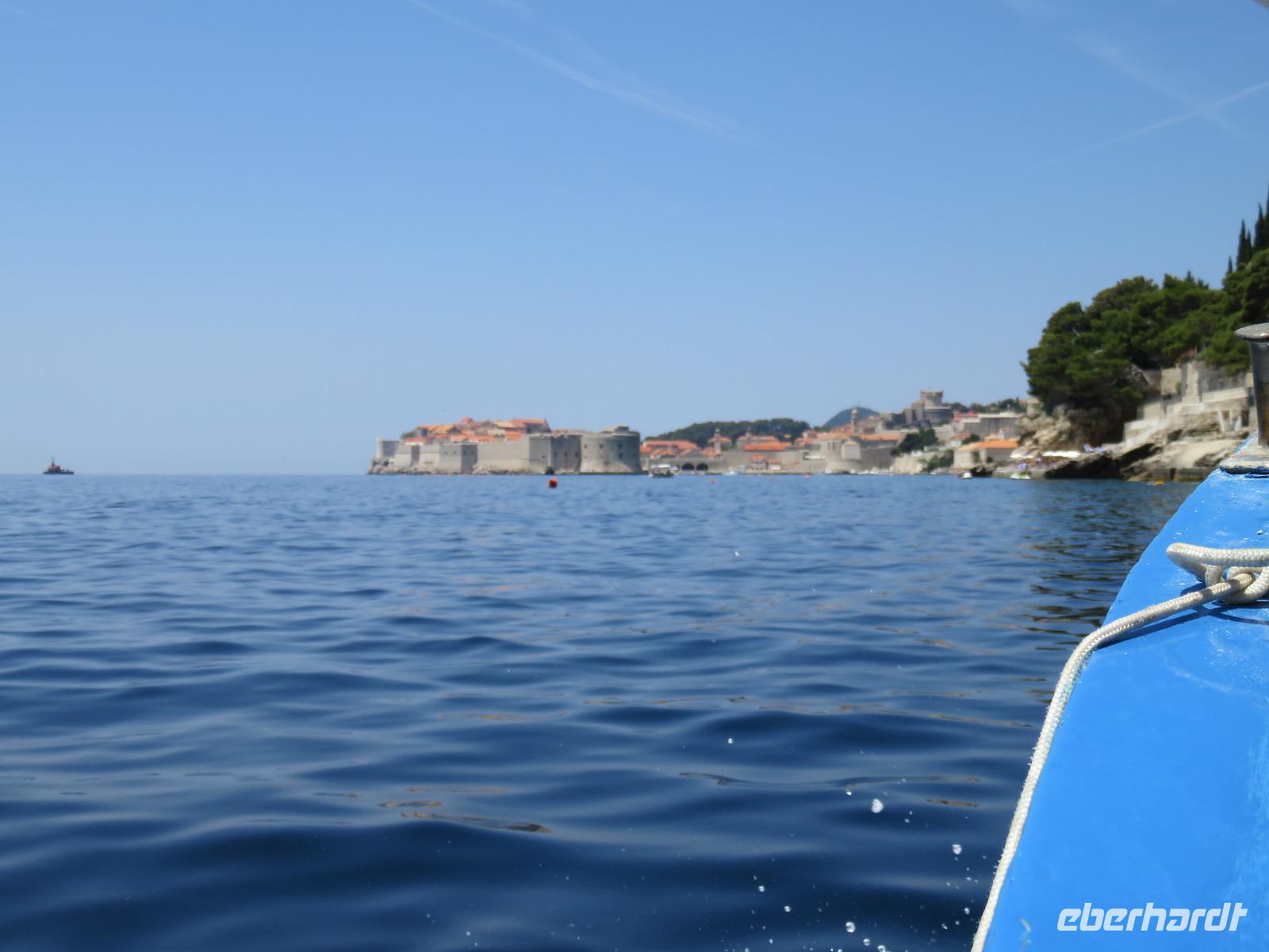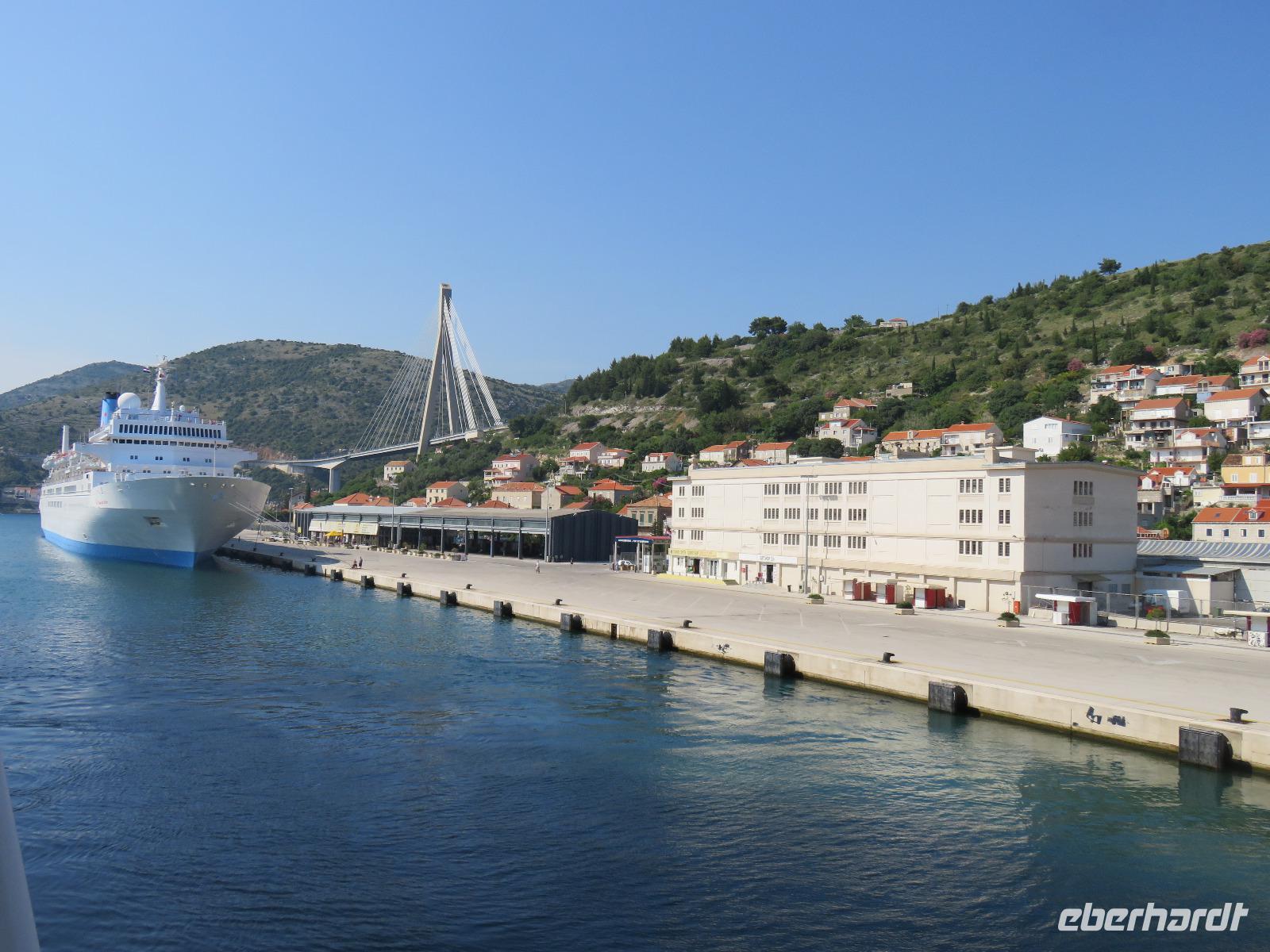 Erneut hatten wir über Nacht von Italien quer über die Adria gekreuzt und erreichten den Hafen von Dubrovnik. Die Sonne strahlte vom wolkenlosen Himmel und so starteten wir sofort nach dem Frühstück zu unserem Eberhardt-Inklusiv-Ausflug. Unsere örtliche Reiseleiterin Helena begrüßte uns direkt am Kai. Wir fuhren zuerst mit dem Bus zu einem Aussichtspunkt am 412 Meter hohen Hausberg, dem Sergiusberg. In der Sonne glitzerten die frisch gedeckten, roten Ziegeldächer der Häuser der Altstadt: ein friedlicher und durch die mächtige Stadtmauer, teilweise bis zu sechs Meter dick und bis zu 25 Meter hoch, zugleich ein wehrhafter Anblick. Wenn diese Steine reden könnten, würden wir Geschichten aus dem Mittelalter, aus der Zeit der Seerepublik Ragusa, hören. So berichtete uns Helena über diese Zeit und über die Zeit der venezianischen Herrschaft. Nach einer kurzen Busfahrt begaben wir uns vom Piletor aus auf einen Spaziergang durch die Altstadt. Zuerst besuchten wir das Franziskanerkloster mit der ältesten Apotheke Europas. Hier schien die Zeit stehen geblieben zu sein. Danach lenkten wir unsere Schritte über die Hauptstraße Stradún in kleine Nebengassen und zu kleinen beschaulichen Plätzen. Wir verweilten an der Kirche des Hl. Blasius und an der Kathedrale Mariä Himmelfahrt sowie am Rektorenpalast. Natürlich besichtigten wir den kleinen, geschützten Hafen Dubrovniks, wo viele Boote im Spiel der Wellen vor Anker lagen. Helena gab uns Hinweise für unsere individuellen Besichtigungen in der anschließenden Freizeit: Spaziergang auf der fast zwei Kilometer langen Stadtmauer oder auch eine Bootstour rund um Dubrovnik. Da es die Sonne mit uns sehr gut meinte, gönnten wir uns eine Erfrischungspause in einem Lokal direkt an der Stadtmauer. Die Kellner waren schnell, sprachen uns in Deutsch an und nahmen auch den EURO an. So mussten wir nicht in KUNA umrechnen. Schnell war ein Plan gefasst: Wir lassen es geruhsam angehen und so charterten wir ein kleines Ausflugsboot für einen Teil unserer Gruppe für 10 EUR pro Person und starteten entlang der Altstadt zur Festung Lovrijenac, umrundeten die Insel Lokrum, fuhren in eine Grotte hinein ... es war einfach schön, so richtig zum Genießen. Danach blieb etwas Zeit zu einem kleinen Bummel. Pünktlich zum Ablegen waren wir wieder an Bord und erfreuten uns an der Ausfahrt aus dem Hafen entlang der kroatischen Küste. Wir hatten für diesen Tag einen weiteren wichtigen Termin. 17.30 Uhr trafen wir uns zu unserem Gruppen-Erinnerungs-Foto auf dem Pooldeck. Nicht verraten hatte ich, dass unser Kapitän Volker Baumgart und der Hotelmanager Robert Schmiel uns begrüßen werden. Es gab ein riesiges Hallo und die Überraschung war gelungen. Zudem nahm sich der Kapitän Zeit, um einige Fragen zu beantworten. Herzlichen Dank!