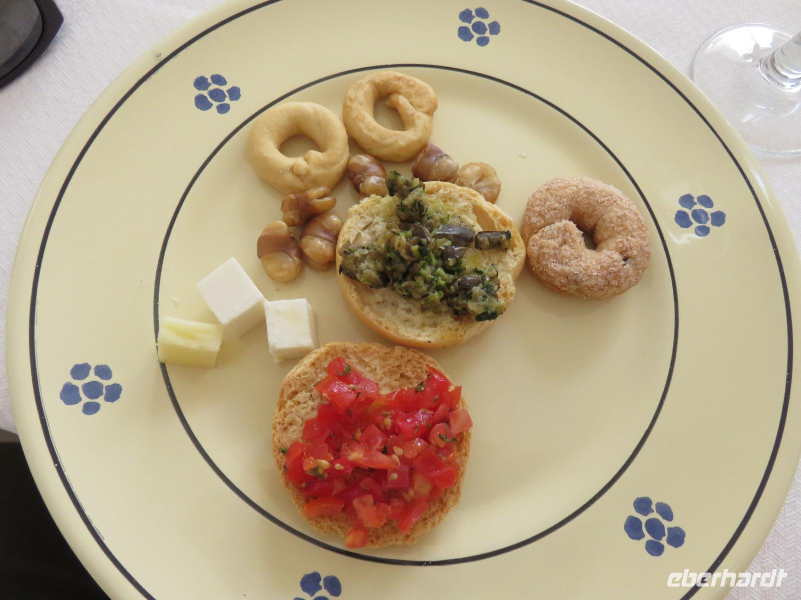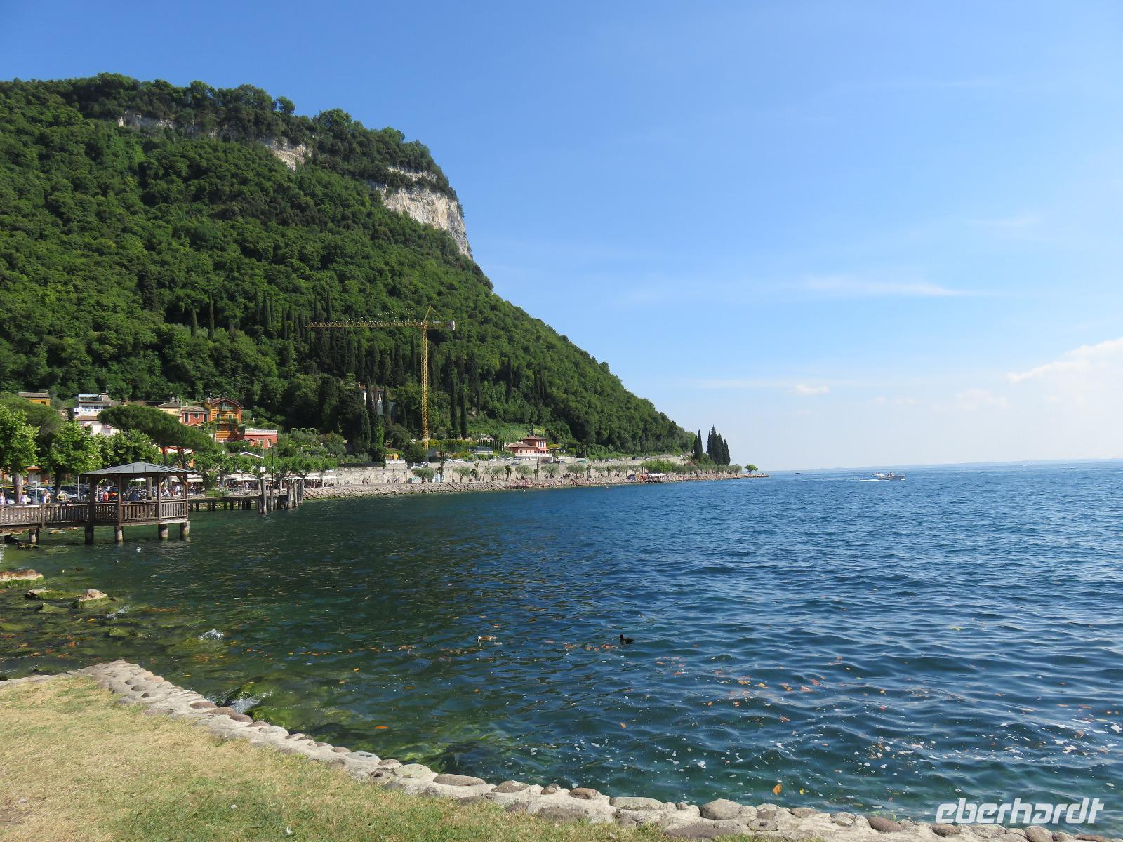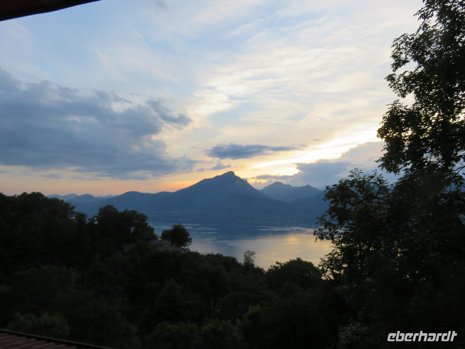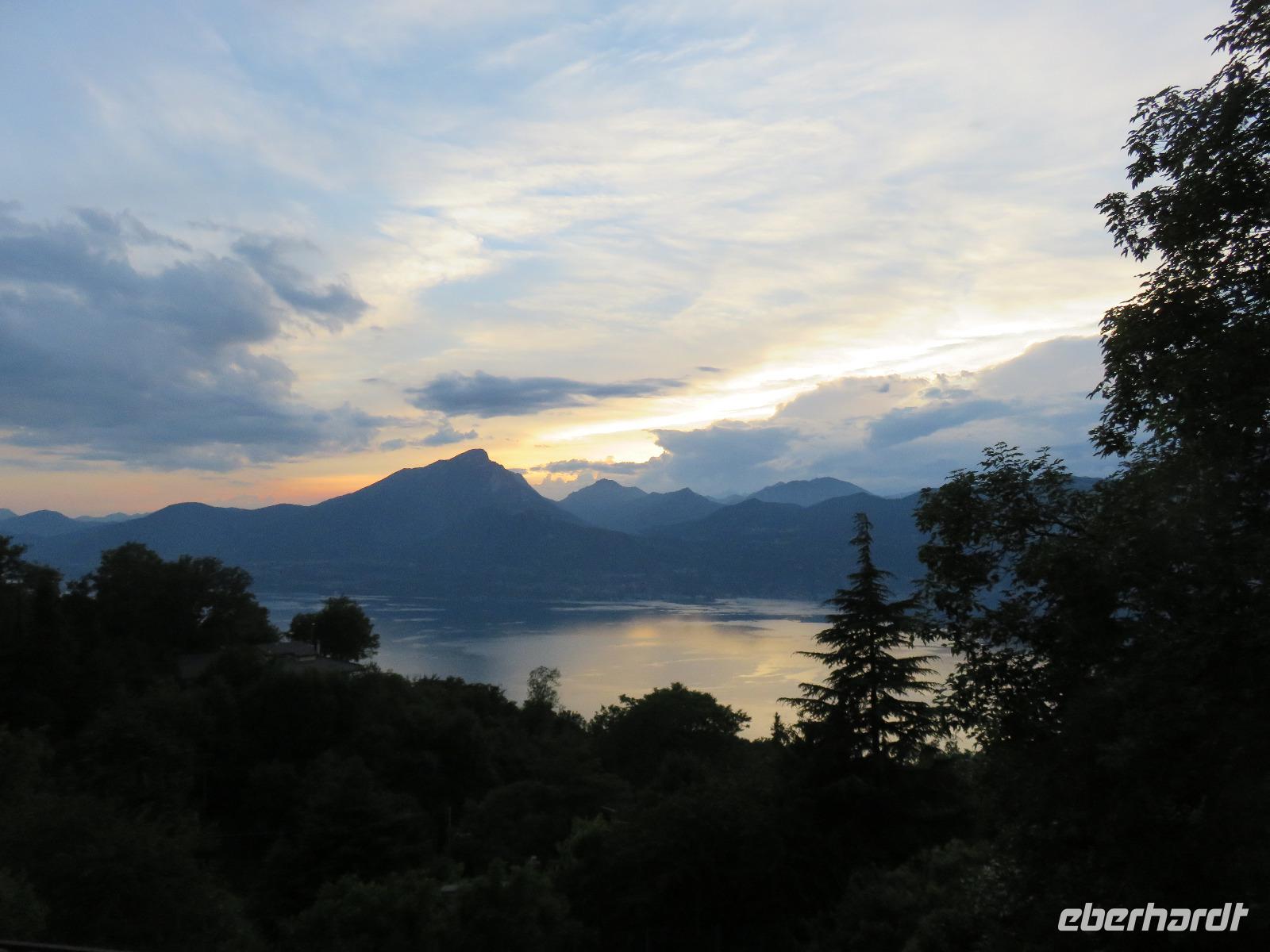 Gut gestärkt konnte es nun weiter in Richtung Hotel gehen. Wir hielten für unsere Gäste noch eine Überraschung bereit: Mit unserem Chauffeur Karl-Heinz hatte ich abgestimmt, die Gardesana Orientale entlang Ost-Ufers des Gardasees zu nehmen. So starteten wir in Peschiera und fuhren nach Garda. Eine letzte kurze Pause und weiter die engen Serpentinenstraße hinauf zum Monte Baldo und zum Hotel San Zeno im gleichnamigen Ort. Wir wurden bestens betreut und erfreuten uns am Panoramablick auf den Gardasee. Das Abendessen wurde uns serviert: Minestrone oder Penne Bolognese, Salatbuffet, Schnitzel mit Pommes und zum Schluss Schokoladenpudding. Doch halt. Diesen konnten wir nicht genießen: Plötzlich gab es unter unser ein starkes Vibrieren, fast hüpften wir mit dem Hotel in die Höhe ... hatte es eine Explosion gegeben, was war das? Die Leiterin des Hotels forderte uns ganz ruhig auf, das Haus zu verlassen und auf der oberen Terrasse im Freien Platz zu nehmen. Nach 20 Minuten konnten wir wieder ins Haus. Die Natur hatte ihre Macht demonstriert: Die Region des Gardasees war von einem Erdbeben mit einer Stärke von 4,3 der Richterskala erschüttert worden. Das Epizentrum lag am anderen Ufer des Gardasees in Pregasio unweit von Limone sul Garda. Noch lange saßen wir beeindruckt auf der Terrasse mit Blick auf den See im Sonnenuntergang zusammen. Es war alles ruhig und friedlich, als sei nichts gewesen.