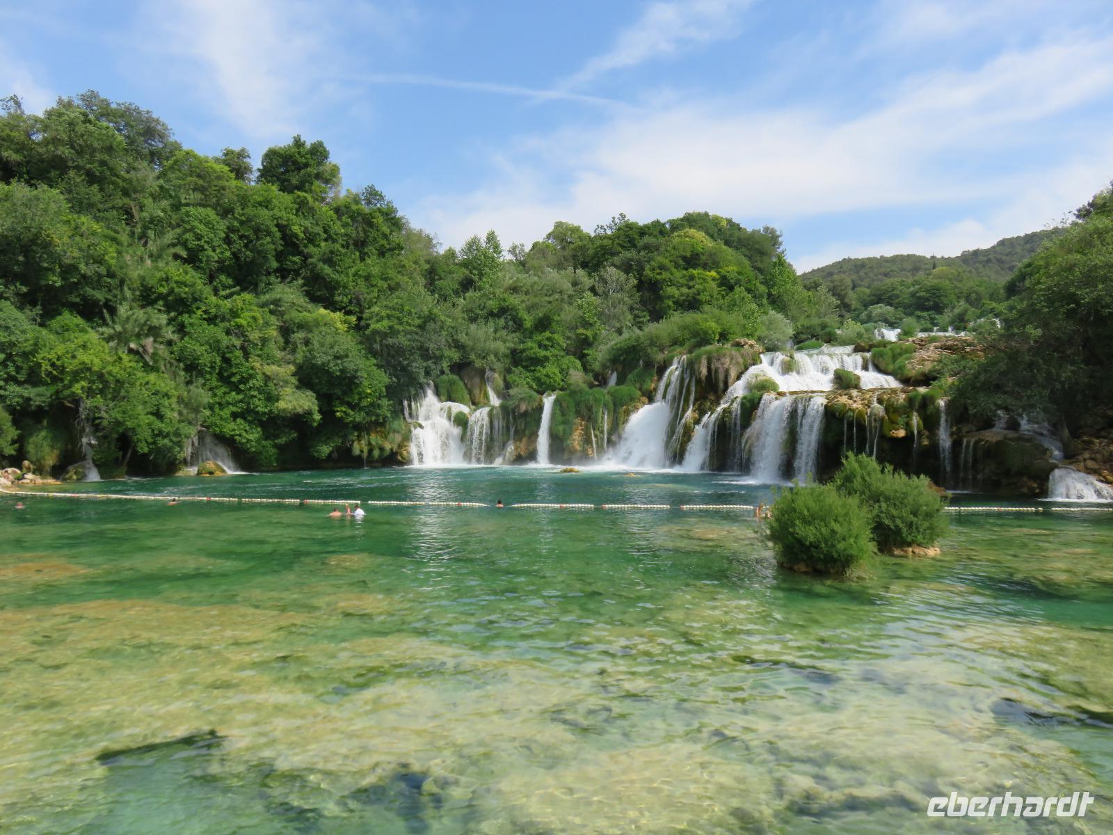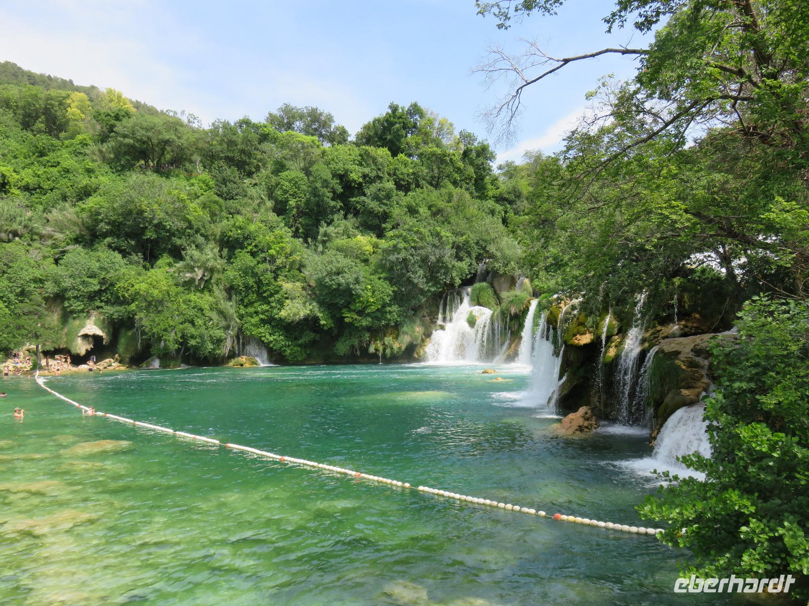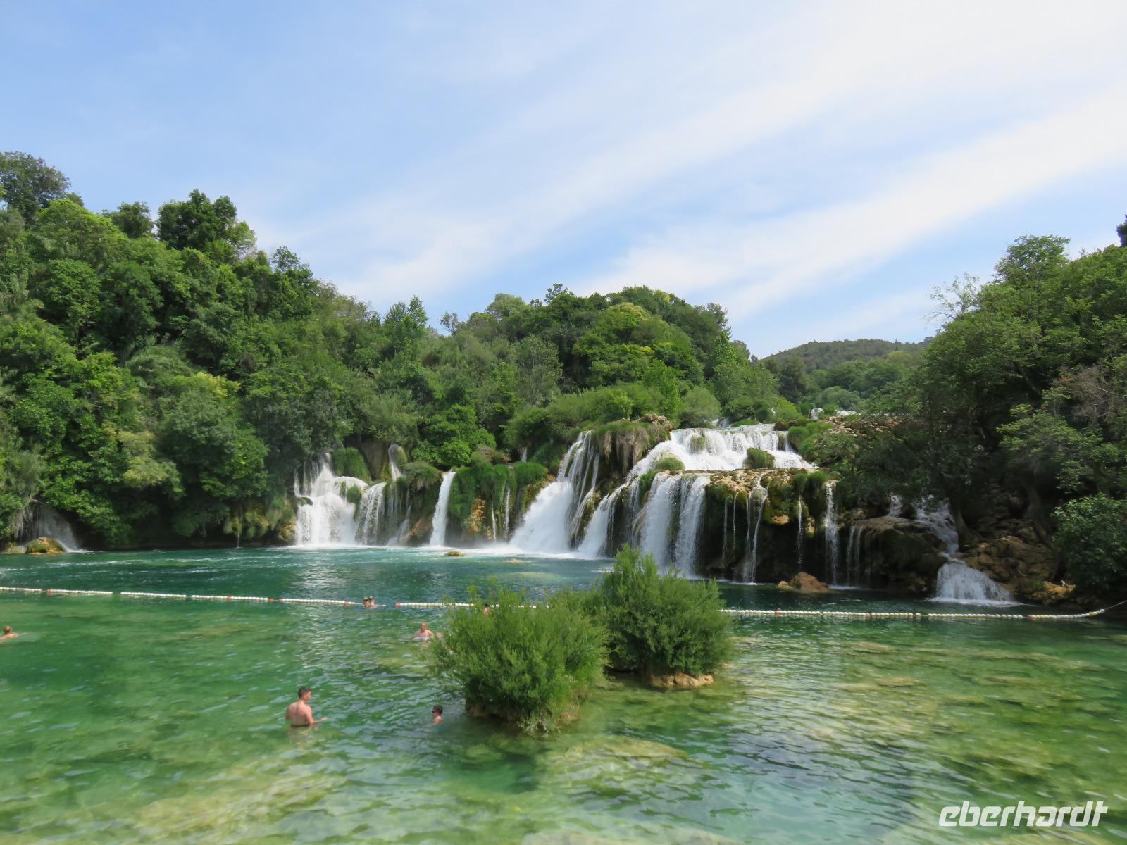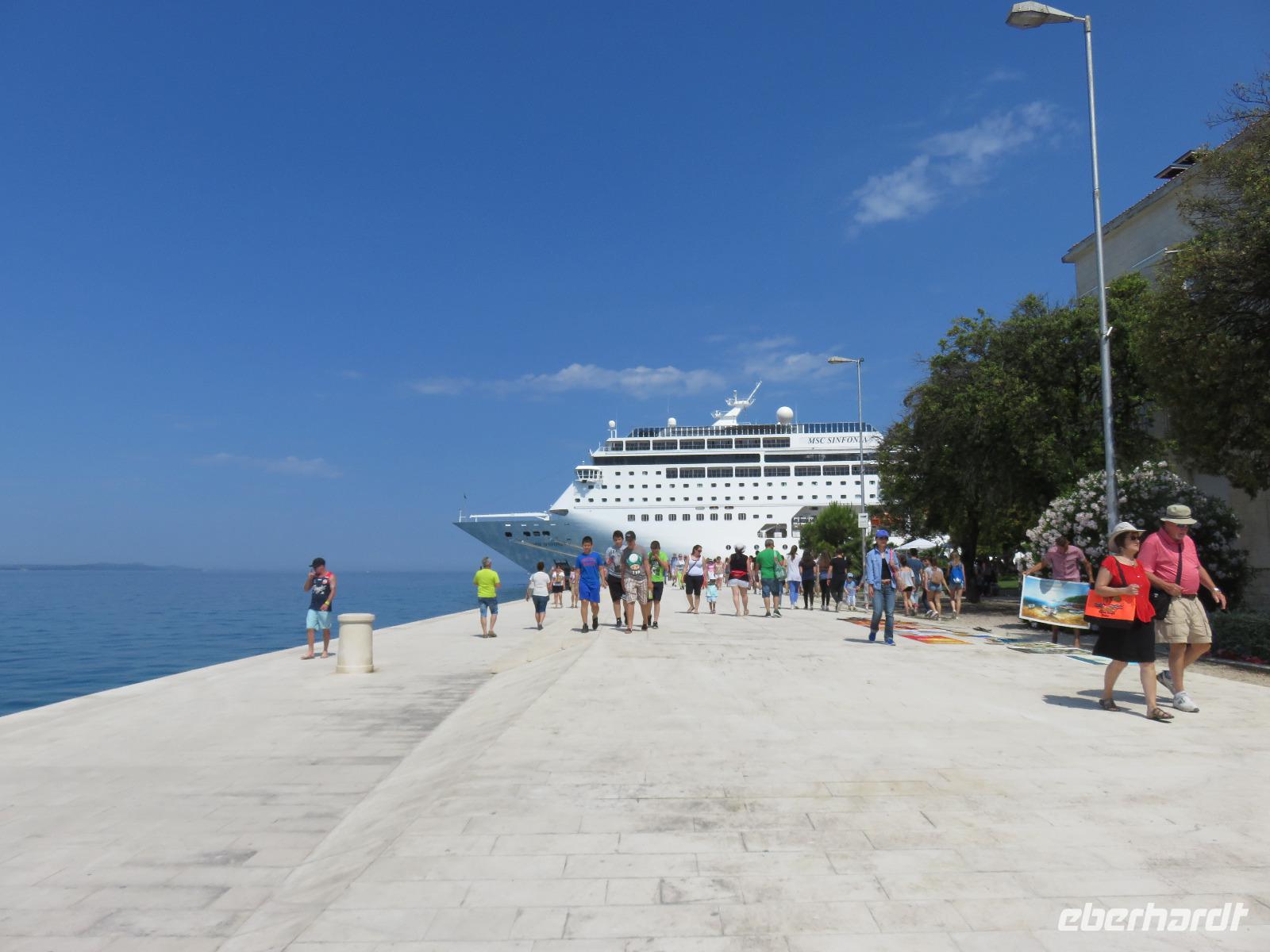 Auch diese Nacht war ruhig. Eigentlich merkten wir gar nicht, dass wir mit dem Schiff unterwegs sind. Am Morgen erreichten wir eine der ältesten Städte Kroatiens, Zadar. Unsere örtliche Reiseleiterin Jasna holte uns direkt im Hafen ab. Nach kurzer Busfahrt besichtigten wir zuerst die Licht- und die Meeresorgel. Wir lauschten den Melodien des Meeres! Eine tolle Idee des kroatischen Architekten Nikola Bašic. Unser Stadtspaziergang führte uns nun vorbei an der zweigeschossigen Rundkirche des Heiligen Donat, durch das römische Forum zur Domkirche der Heiligen Anastasia. Hier sangen und tanzten die Kinder der Stadt auf lustige Art und Weise. Nach einer kurzen Stippvisite und etwas Freizeit begaben wir uns durch das Sveti-Rok-Tor, eines der alten Stadttore, hinaus aus der Altstadt. Hier stand unser Bus für den zweiten Teil unseres Eberhardt-Inklusiv-Ausfluges bereit. Wir fuhren zu den Krka-Wasserfällen. Wir spazierten zuerst zu einem Aussichtspunkt. Nun teilten wir uns in eine Gruppe der Schnelläufer und eine der Genießer. Doch halt, genossen haben wir alle unsere Zeit in diesem Naturparadies. Dann lag er vor uns und breitete seine natürliche Schönheit aus - der Skradinski Buk, der spektakulärste Wasserfall im Nationalpark. Über 17 Kaskaden und 45 Meter Höhe stürzte, rauschte und polderte das Wasser in die Tiefe. Nach einer Pause an diesem eindrucksvollen Naturschauspiel spazierten wir im Nationalpark. Die Natur bot uns eine Fülle interessanter Beobachtungen: munter tummelten sich Fische im klaren Wasser, blaue Libellen tanzten in der heißen Luft, Vögel zwitscherten um die Wette, Frösche gaben ihr Konzert ... Nur einen haben wir nicht gesehen: Winnetou. Hier wurden Szenen der Filme Der Ölprinz oder Unter Geiern gedreht. Es störte nicht. Die Natur war umso schöner und beeindruckender. Gern wären wir noch etwas hier geblieben ... aber 17.30 Uhr war Alle Mann an Bord und diese Zeit ist für alle Kreuzfahrer Gesetz.