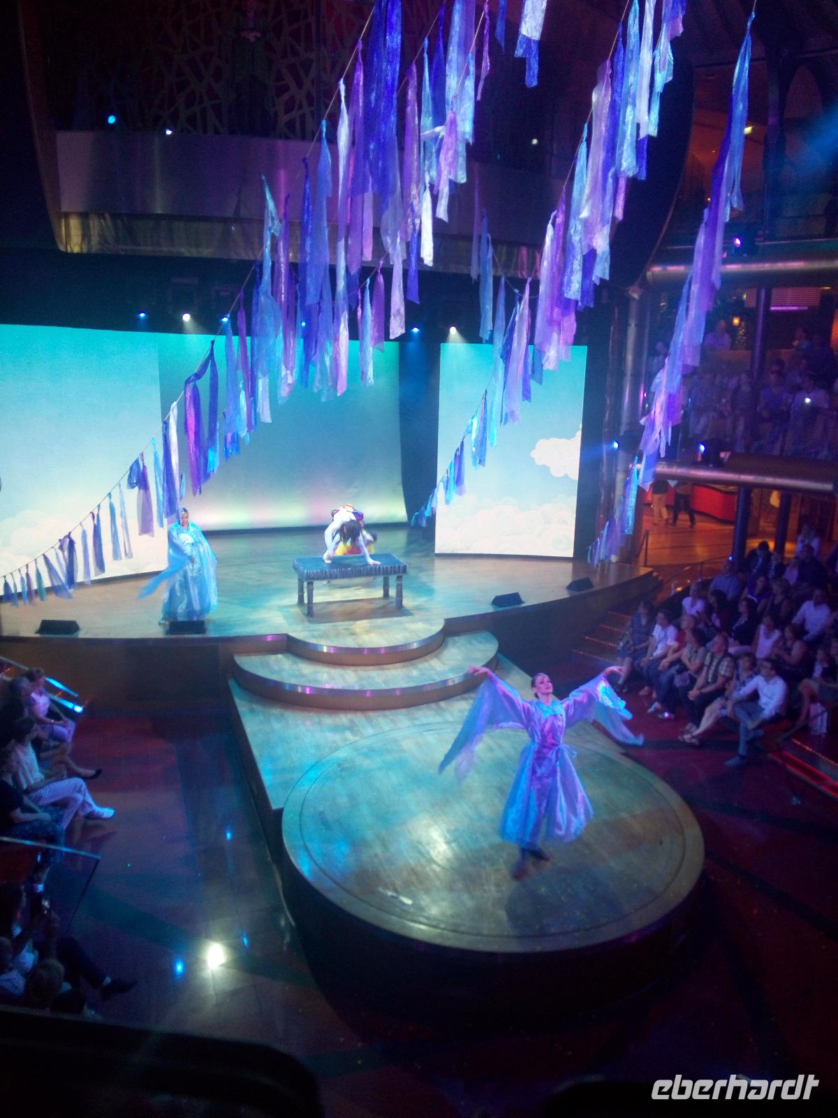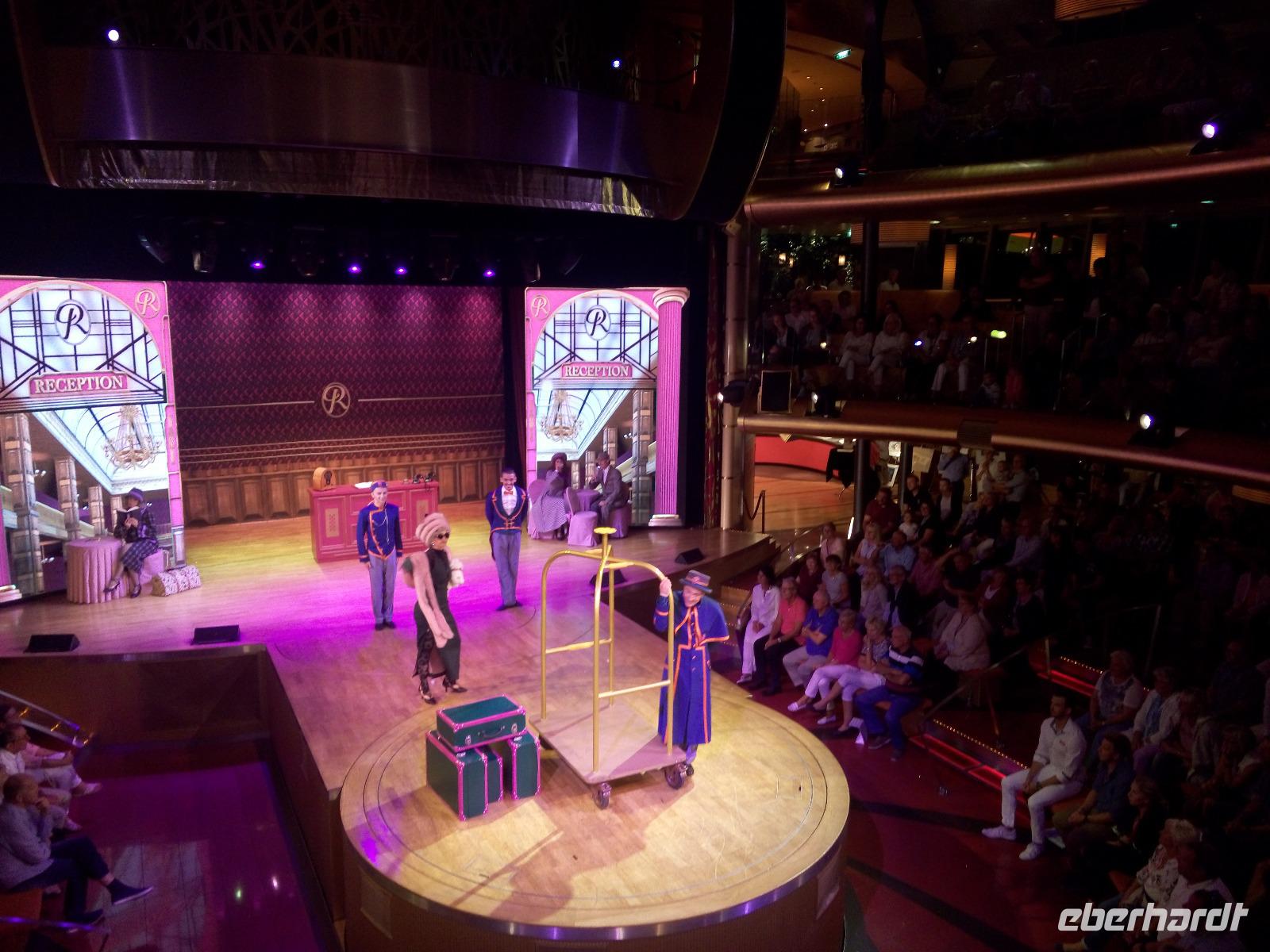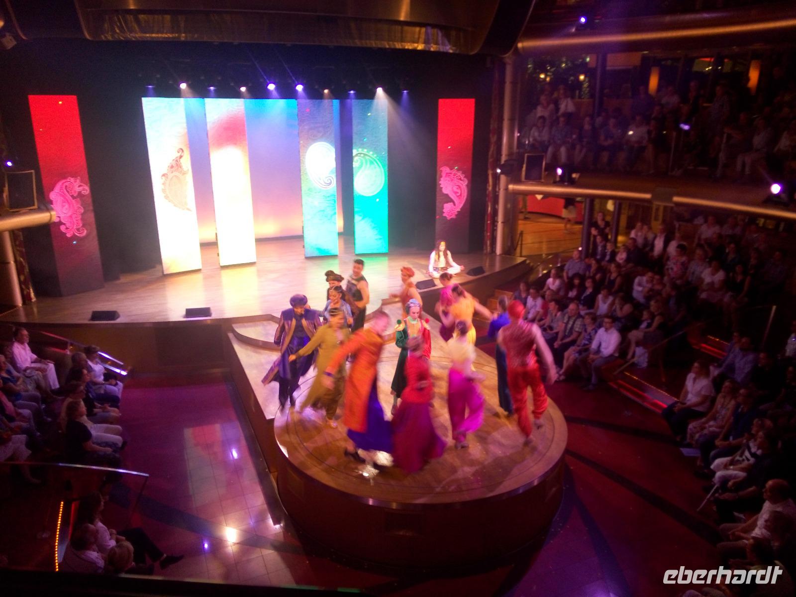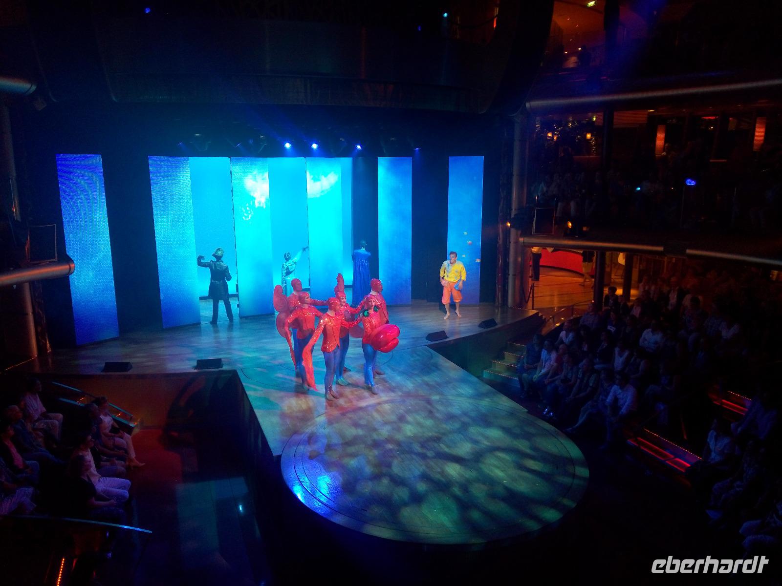Pünktlich waren wir am Bord und konnten unsere Erholung fortsetzten. Es gab genug Angebote. 2 Mal pro Abend konnte man eine Vorstellung bei Theatrium sehen. Natürlich, gab es auch eine Disco, "ein Weisparty" und so weiter und so fort.