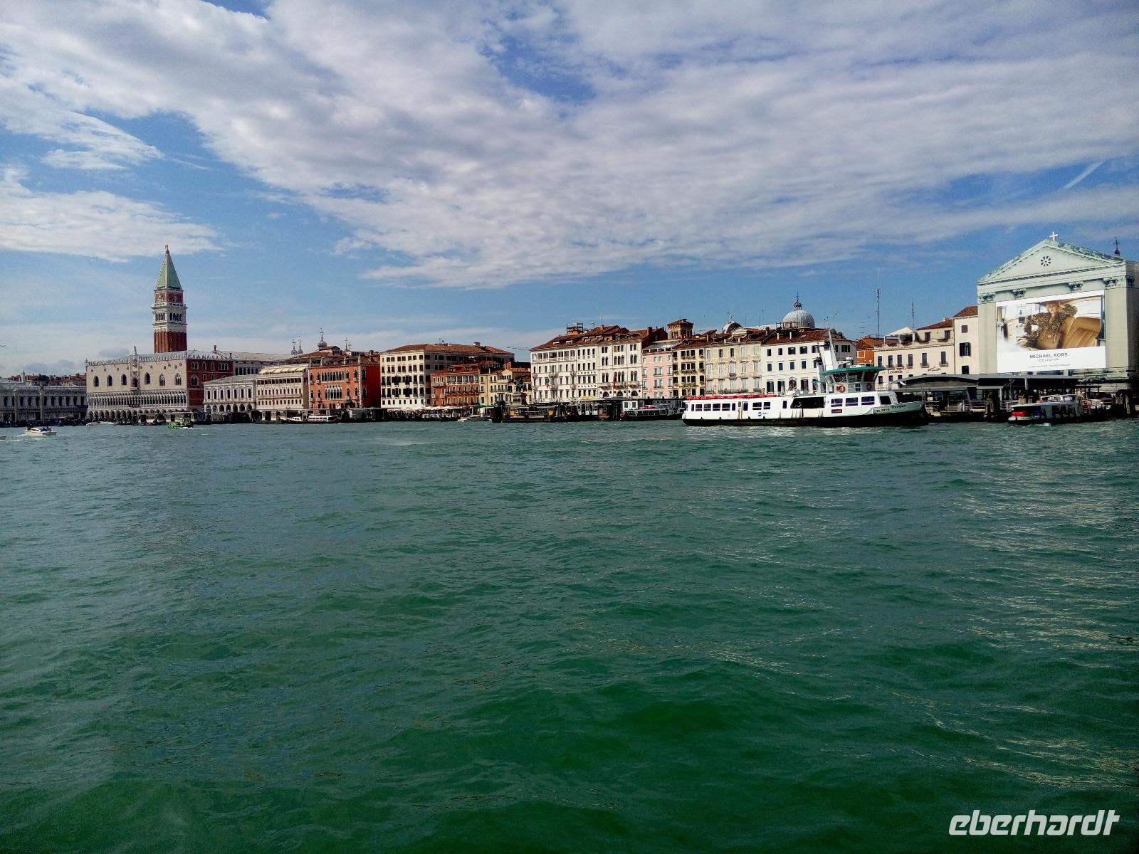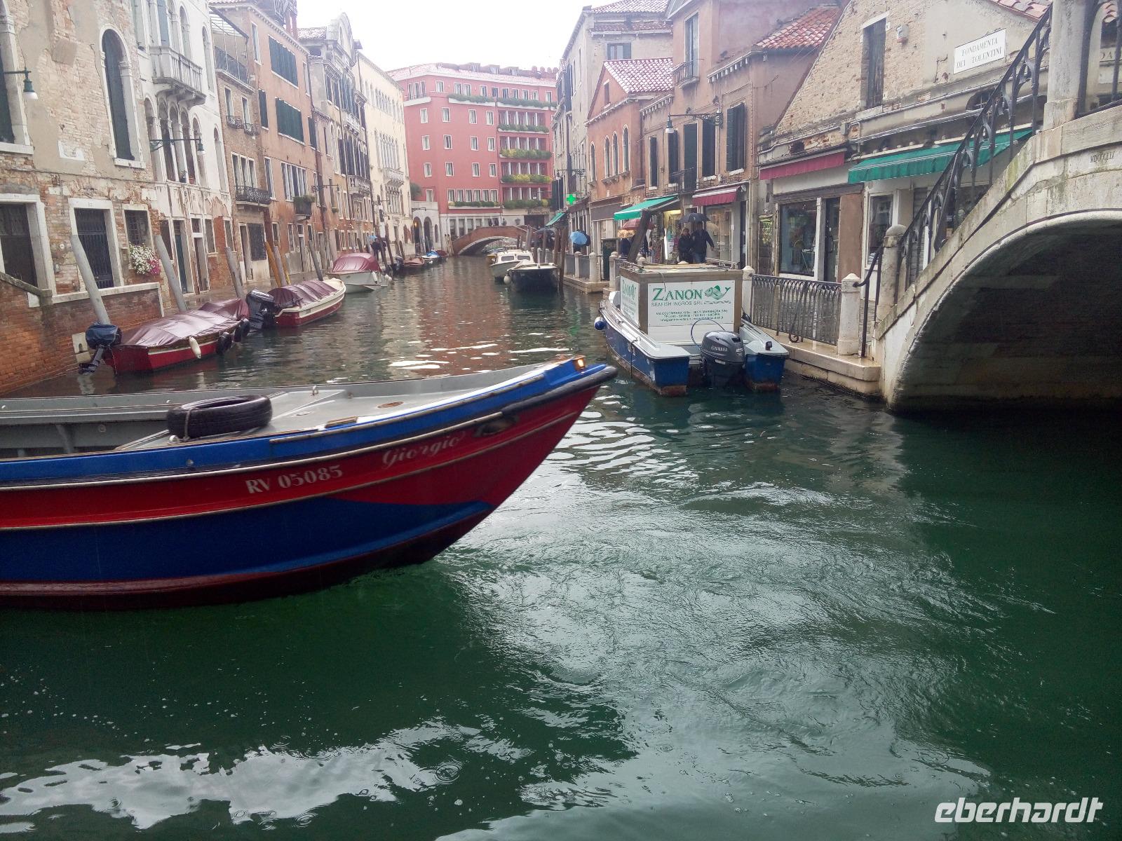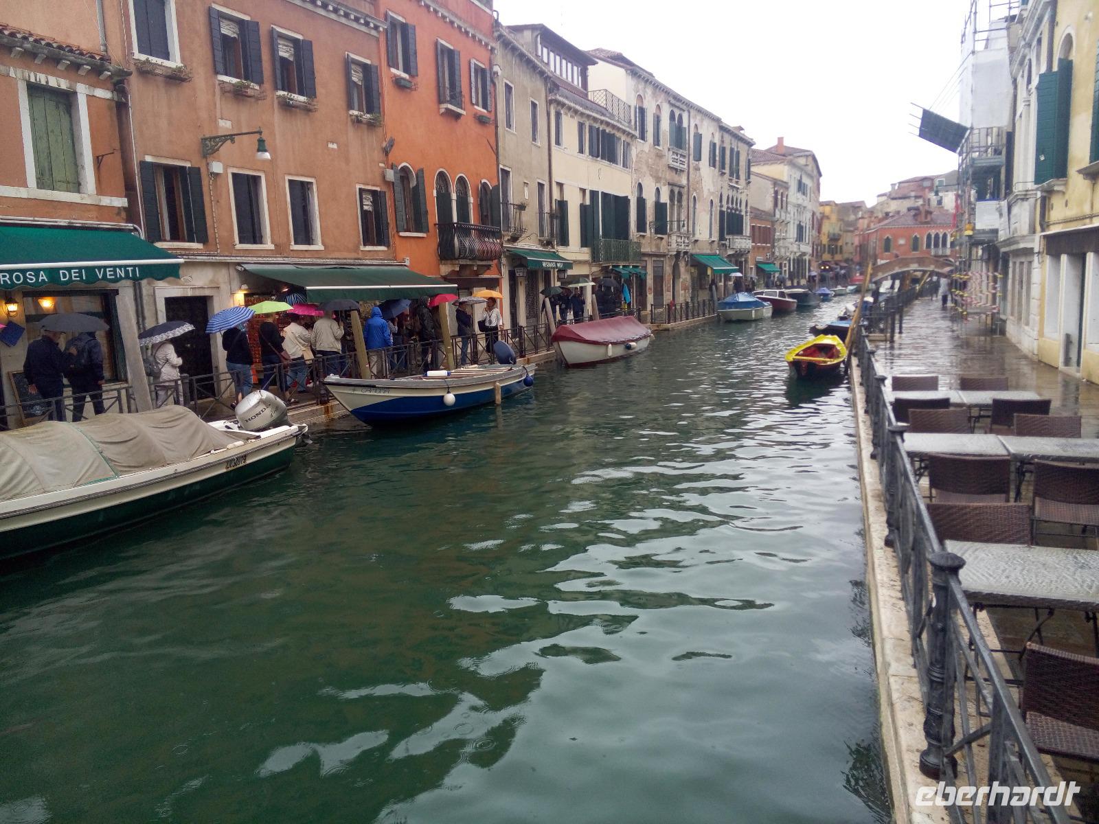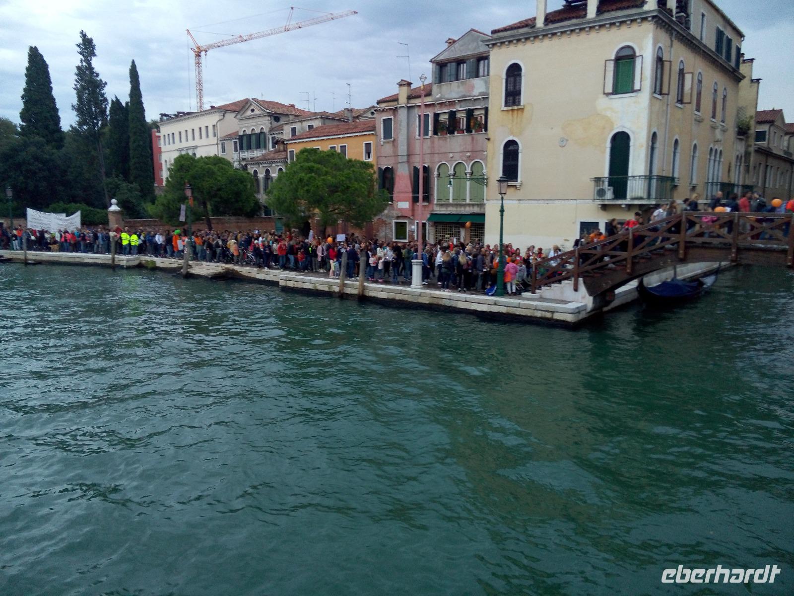 An diesem Tag war unser zweiter Versuch, Venedig bei dem schönen Wetter zu erwischen. Wieder gescheitert. Es hat nicht ein bisschen geregnet, es hat viel geregnet. Besonders zu dem Zeitpunkt als wir mit Alessia den Stadtrundgang gemacht haben. Da es sehr viele Touristen in der Stadt waren, haben sich einige entschieden, den schnellen Wassertaxi zu nehmen und sofort bei dem Markusplatz zu sein, wo unser Endtreffen war. Nicht alle haben den Stadtrundgang überstanden :-) Eine Frau aus unsere Gruppe hat sich spontan entschieden, ihren Weg allein zu dem Schiff zu schaffen. Nachdem sie dieses Abenteuer glücklich überstanden hat, wurde ich per Telefon informiert. Also, keine Sorge. Und das war unser Rekord an dem Tag. Von der Agentur, die die Audiogeräte vermietet, habe ich erfahren, dass aus der Gruppe von 70 Mann mehr als 25 sich verloren haben. So ist Venedig.