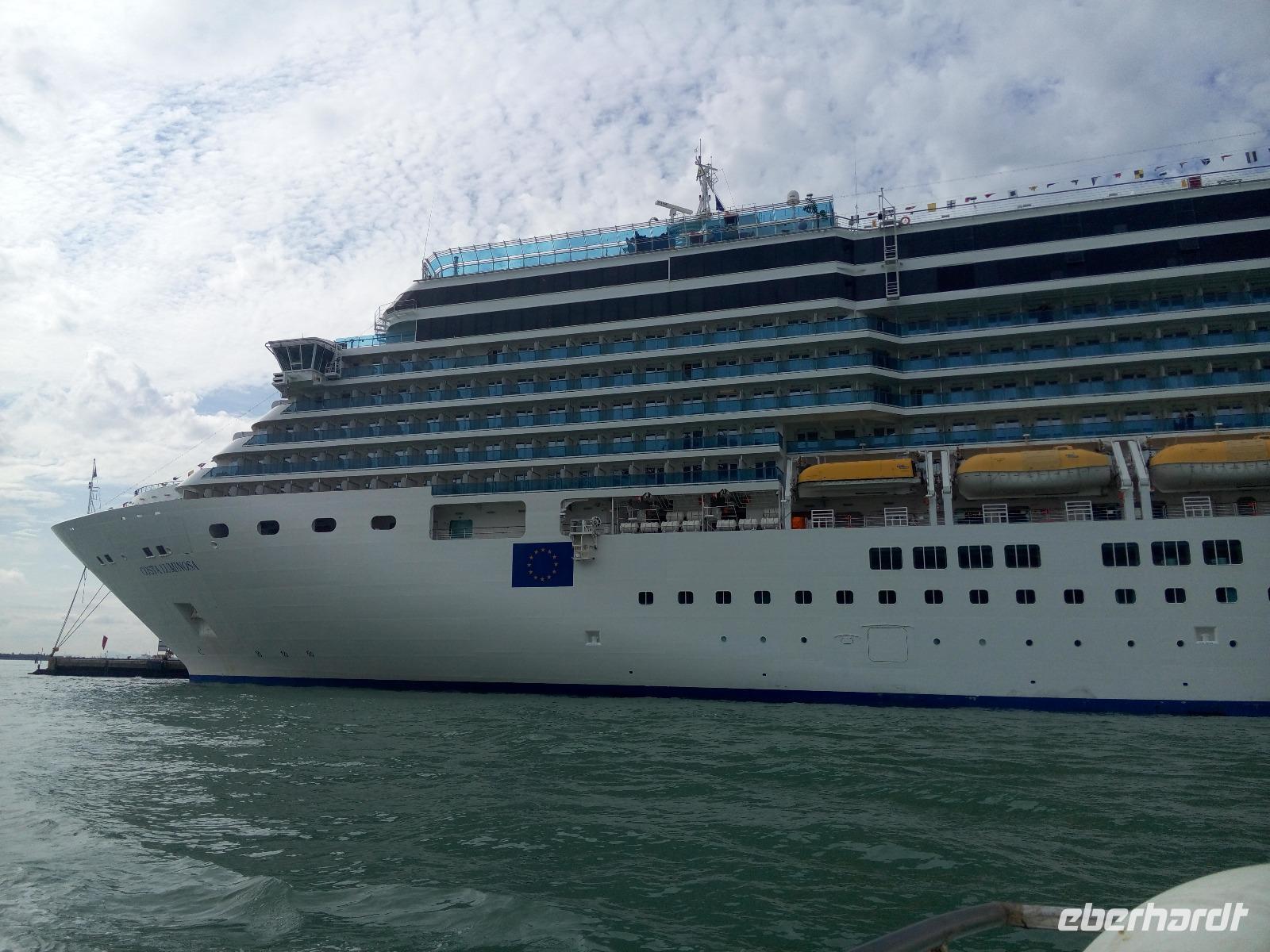 Nach diesem außergewöhnlichen und reichhaltigen Mittagessen sind wir weiter mit dem Bus gesaust, voll in der Erwartung so schnell wie möglich auf dem Schiff zu sein.2 Stunden später, gegen späten Nachmittag waren wir schon da. Sogar die Polizei hat uns nicht aufgehalten, die uns im Weg stand, als wir nach Tronchetto gekommen sind. Und schon sind alle Formalitäten durch und alle Gäste sind am Bord. Unser Fahrer René ist so schnell wie möglich zurückgefahren, er wollte sein Treffen mit den Polizisten wegen Ausreise aus Venedig nicht verpassen.