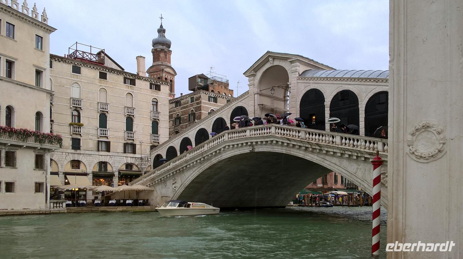 Wir beginnen unseren Stadtrundgang, jedoch der Regen wird immer stärker. Lucia führt uns durch kleine Gassen und über kleine Brücken zur Rialtobrücke. Da der Regen immer stärker