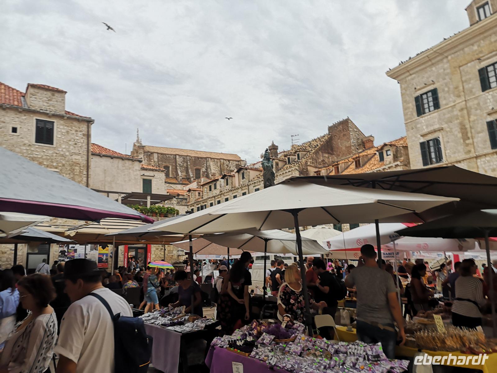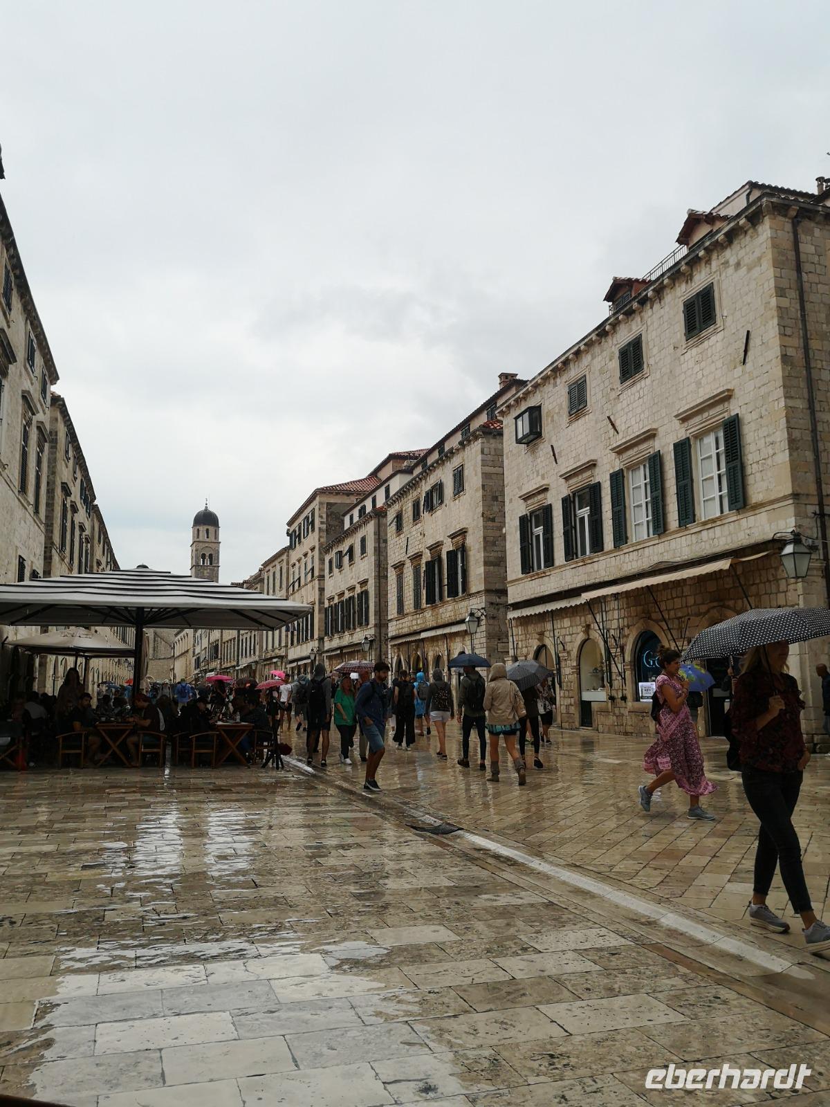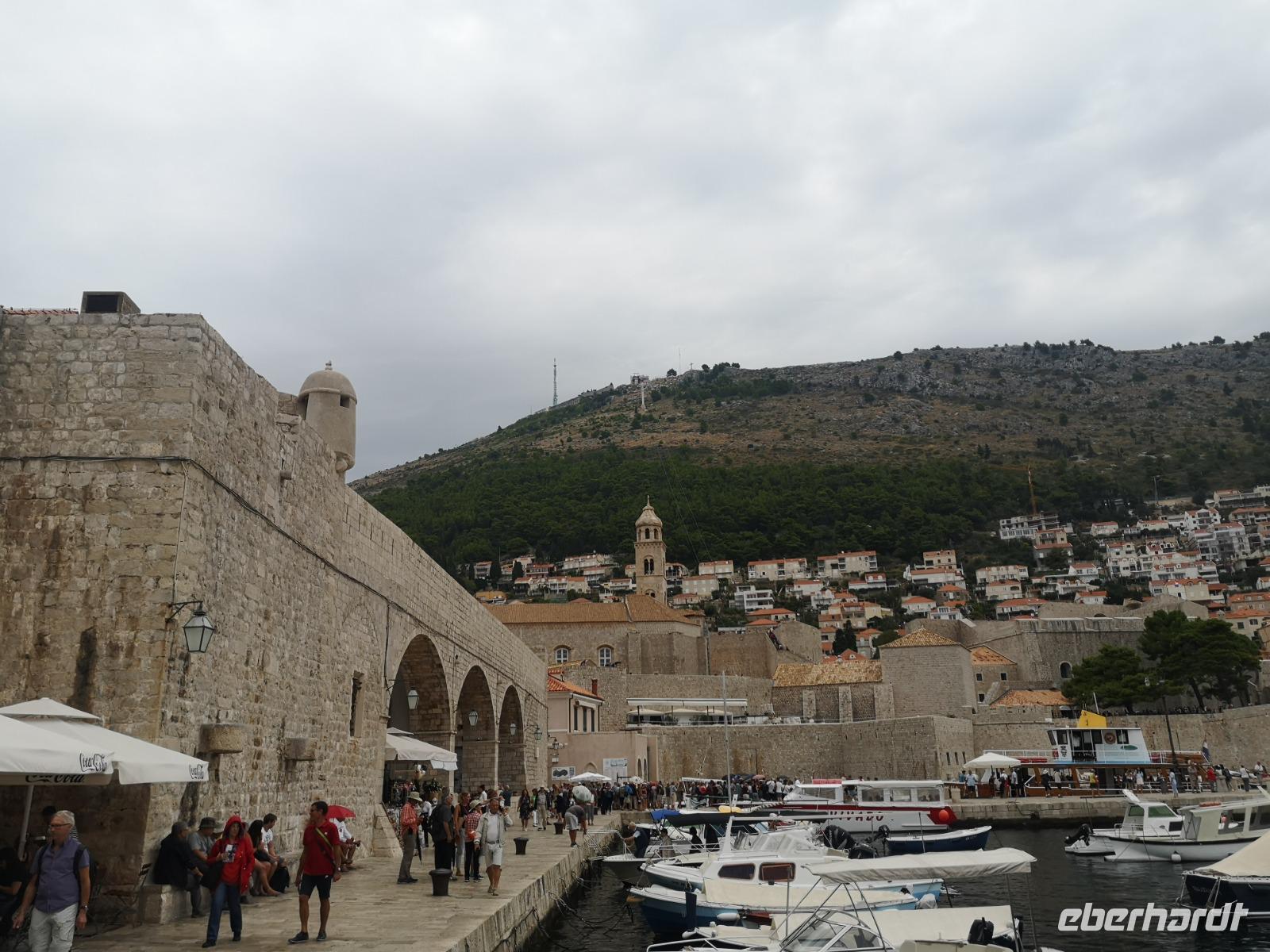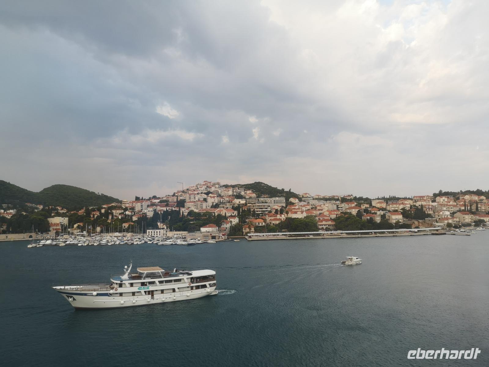 Der Himmel verdunkelt sich als wir in Dubrovnik anlegen und zu unserem Eberhardt-Ausflug aufbrechen. Begleitet von einem ersten kurzen Schauer fahren wir hinauf zum Aussichtspunkt und lauschen unserer Reiseleiterin Vlatka die uns von der Geschichte der Stadt erzählt. Wir machen das ein oder andere Foto bevor uns unser Bus hinunter an den Rand der Altstadt bringt. Diese ist nur zu Fuß zugänglich, was wie uns Vlatka erklärt, einer der Faktoren ist warum immer weniger Einheimische in der Altstadt leben. Vlatka führt uns durch die Gassen, vorbei an serbisch-orthodoxen und römisch-katholischen Kirchen, einem lebhaften Markt bis hin zum Hafen von Dubrovnik. Wir teilen uns auf, um die Altstadt auch individuell zu erkunden, als der Regen über uns hineinbricht. Die ersten flüchten sich zurück zum Kreuzfahrt-Hafen, während andere in den vielen Cafés und Restaurants entlang der Hauptstraße Schutz finden.