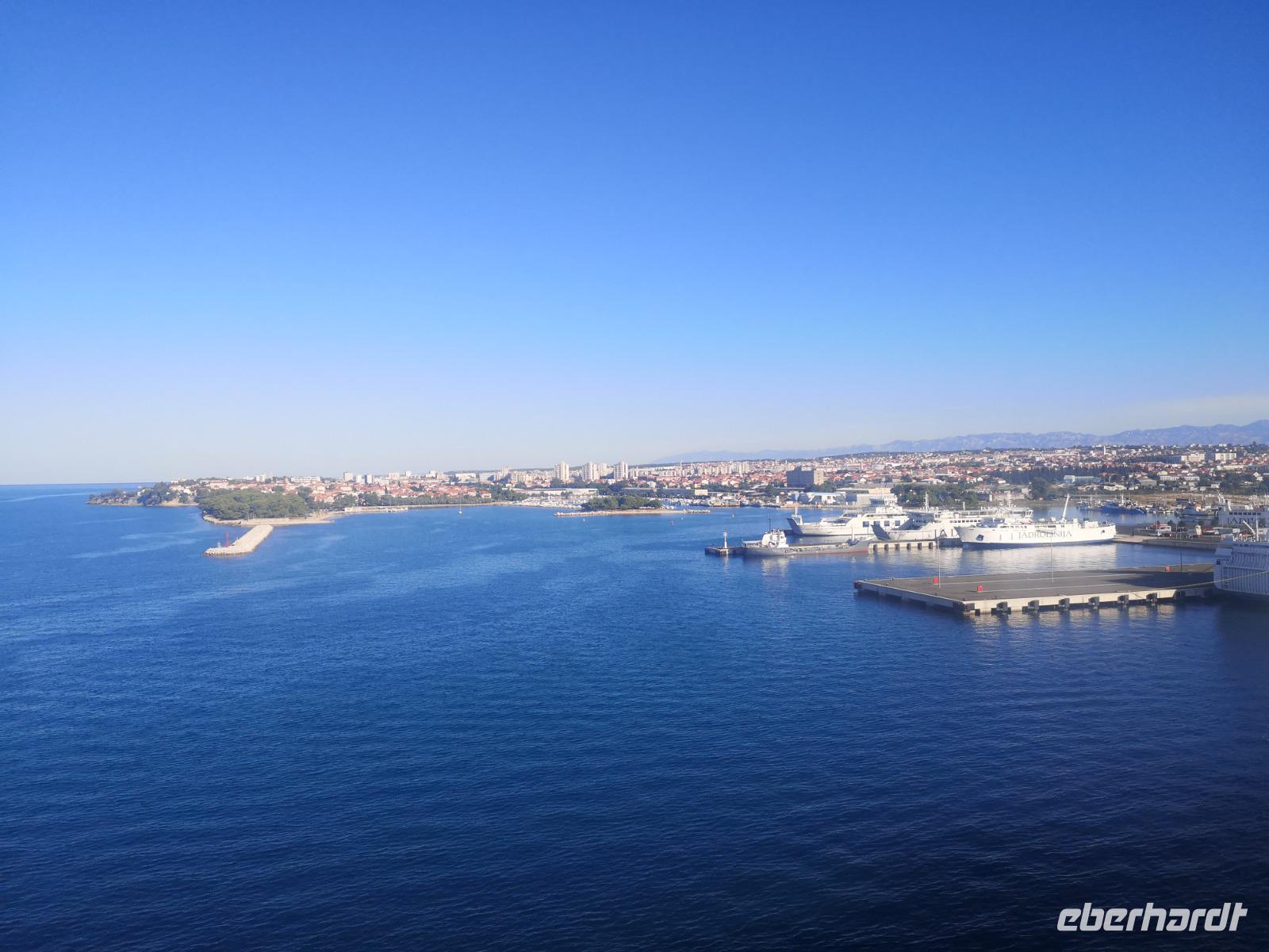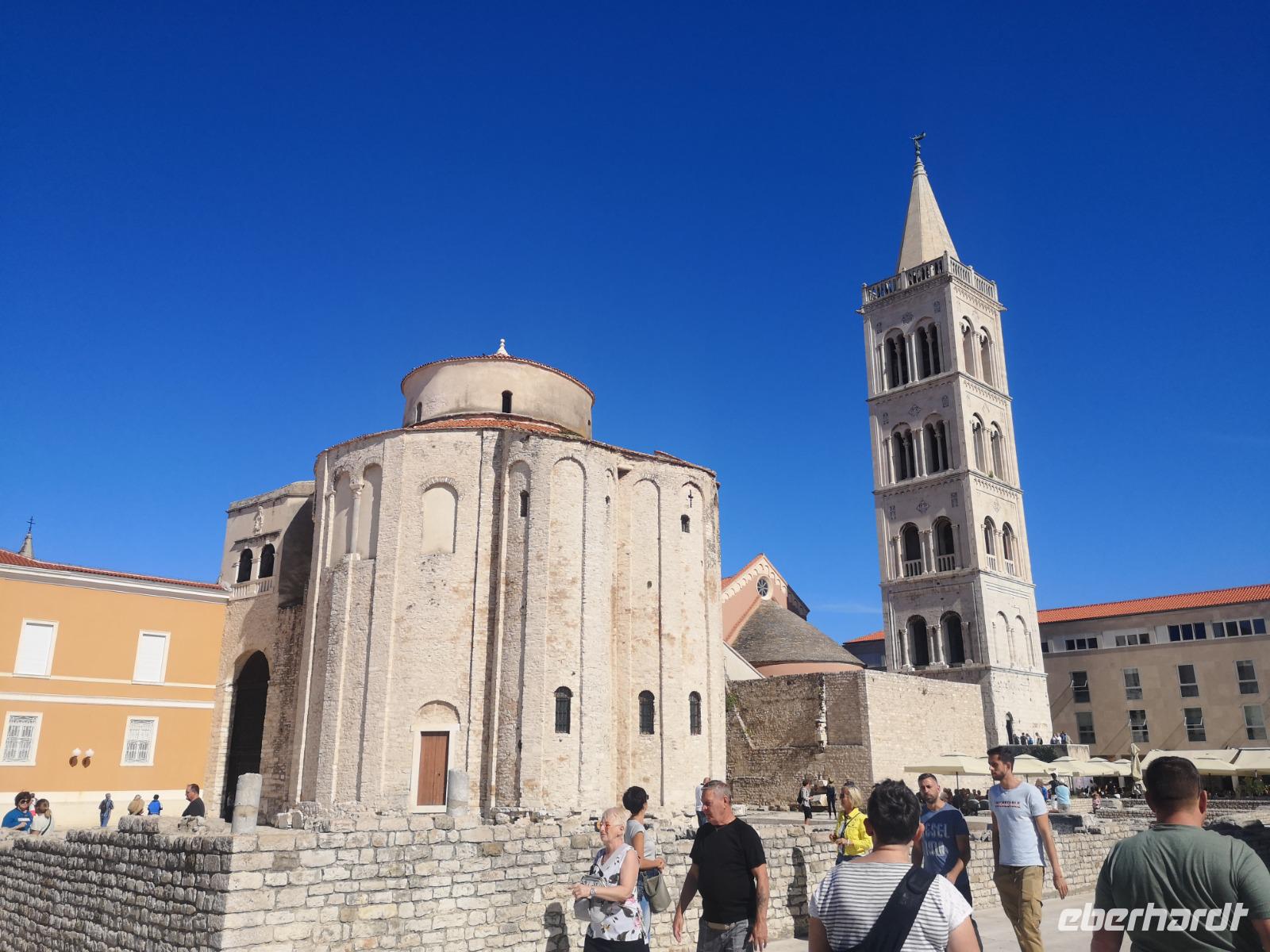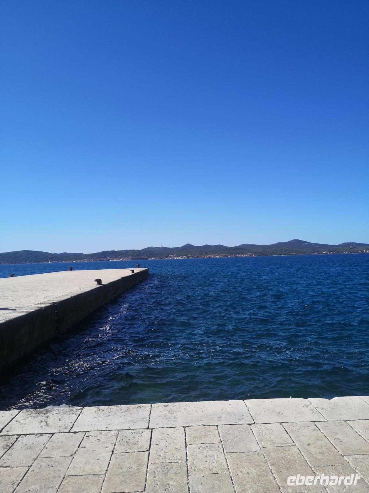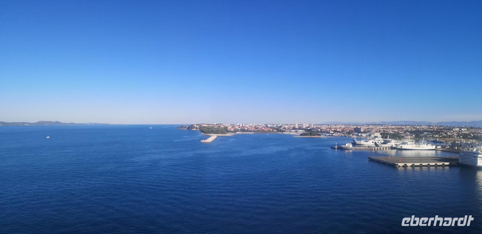 Die Aida bringt uns entlang der Kroatischen Küste, vorbei an zahlreichen kleinen Inseln nach Zadar. Auch die Sonne ist zurückgekehrt, als wir hier zu unserem Eberhardt-Ausflug an Land gehen. Am Gruß der Sonne beginnen wir unseren Rundgang durch Zadar mit unserer Reiseleiterin Vernonika. Entlang der Meerpromenade spazieren wir in die Altstadt, vorbei an der Meeresorgel dessen Klängen wir lauschen. Vorbei an diesen modernen Sehenswürdigkeiten geht es für uns in den Altstadtkern, in dem bis heute Überreste der 3000 Jahre langen Geschichte Zadars zu finden sind. Römische Säulen im Fundament einer früh-mittelalterlichen Kirche, die Kathedrale der heiligen Anastasia und die Überreste der alten Stadtmauern zeugen bis heute von der langen Geschichte der Stadt. Nach mehrfacher Zerstörung wurde Zadar immer wieder aufgebaucht, erzählt uns Veronika, und stieg immer wieder wie ein Phönix aus der Asche - stärker und schöner als zuvor.