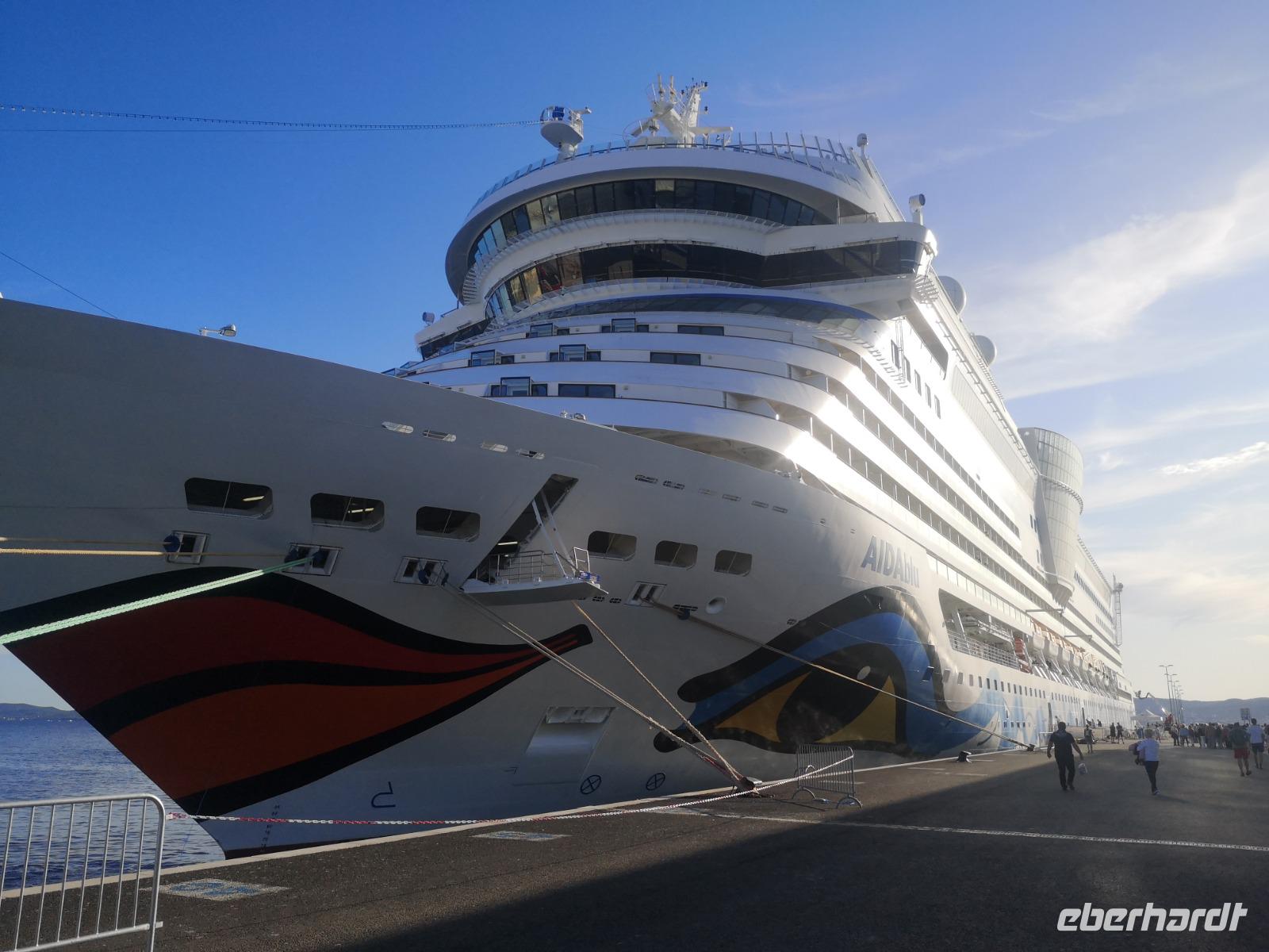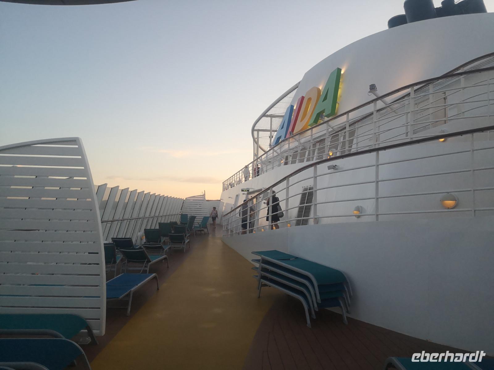 Nach unserer langen Anreise entspannen wir heute beim Seetag. Die Sonne strahlt bei sommerlichen Temperaturen und zahlreiche Menschen tummeln sich auf dem Pooldeck und in den Außenbereichen. Wir treffen uns am Vormittag in der Aida Bar und stoßen mit Sekt und Orangensaft auf unsere bevorstehende Kreuzfahrt an. Bei einem Schiffsrundgang verschaffen wir uns anschließend einen Überblick über die zahlreichen Angebote an Bord, die den Tag auf See im Nu verfliegen lassen.