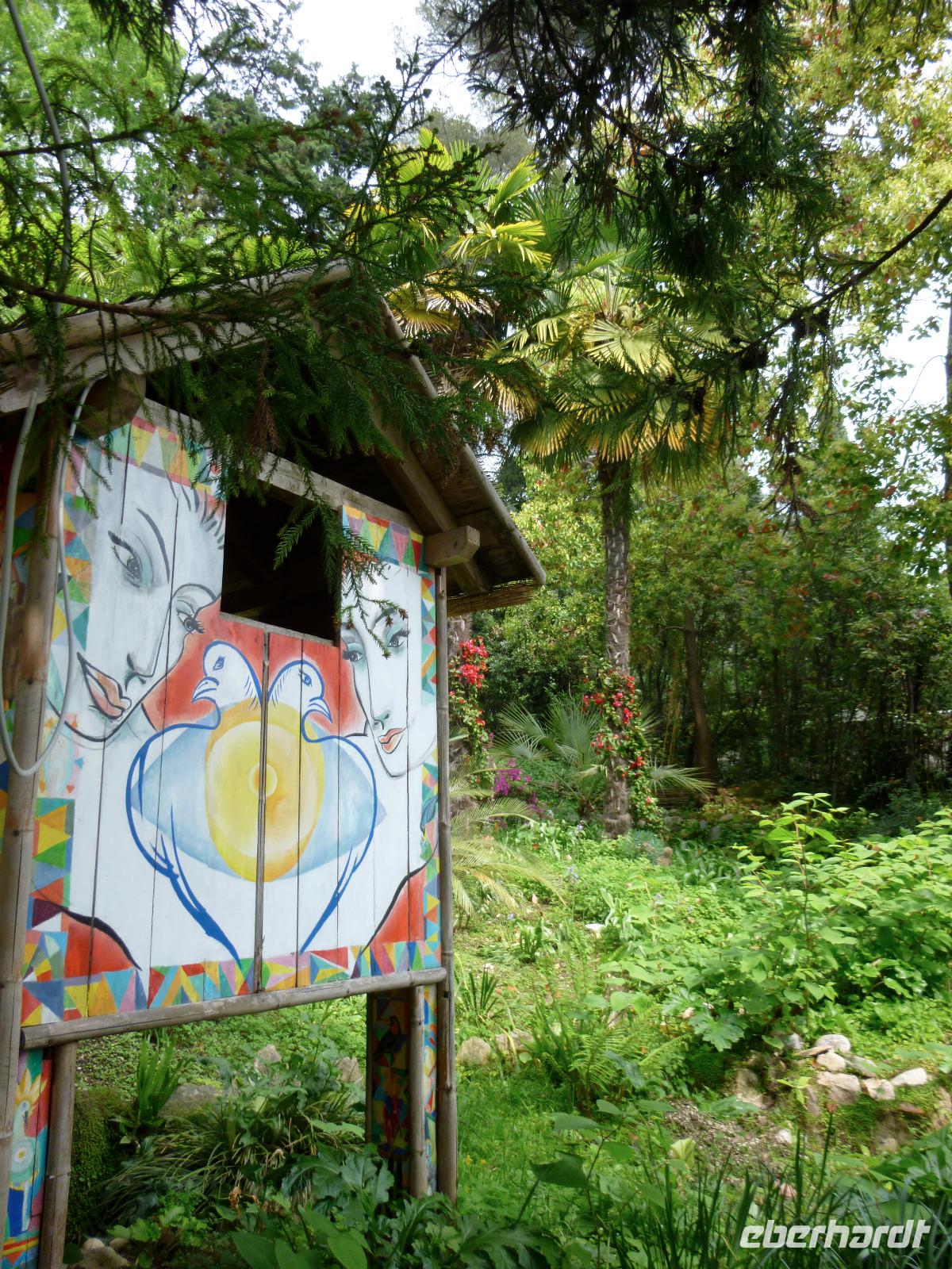 Etwa 28 Skulpturen und Installationen lassen sich zwischen Bäumen, Felsen, Wasserläufen, Sträuchern und Blumen entdecken. Harmonisch eingefügt in die Hänge am Gardasee begrüßen uns Pflanzen aus allen Ländern, wie Kampferbaum, Korkeiche, Urweltmammutbaum, Kanarischer Drachenbaum, Neuseeländer Flachs und persischer Eisenholzbaum.