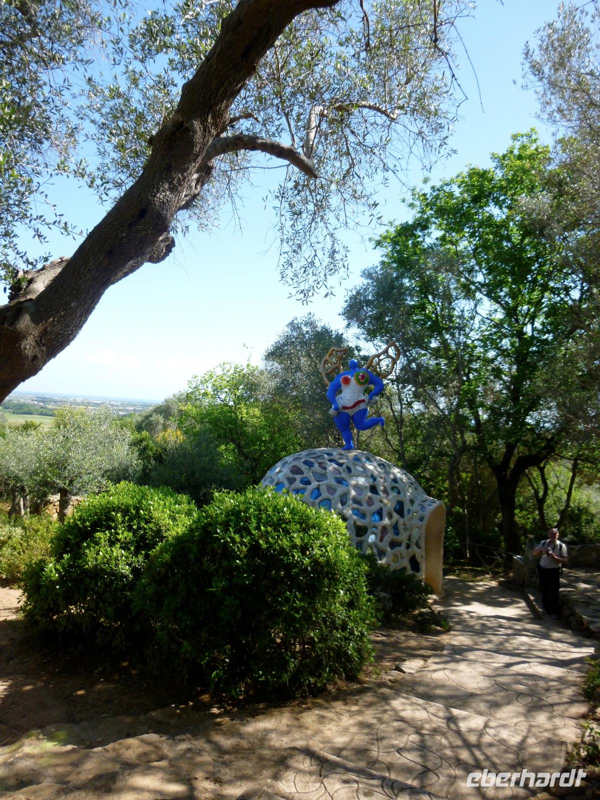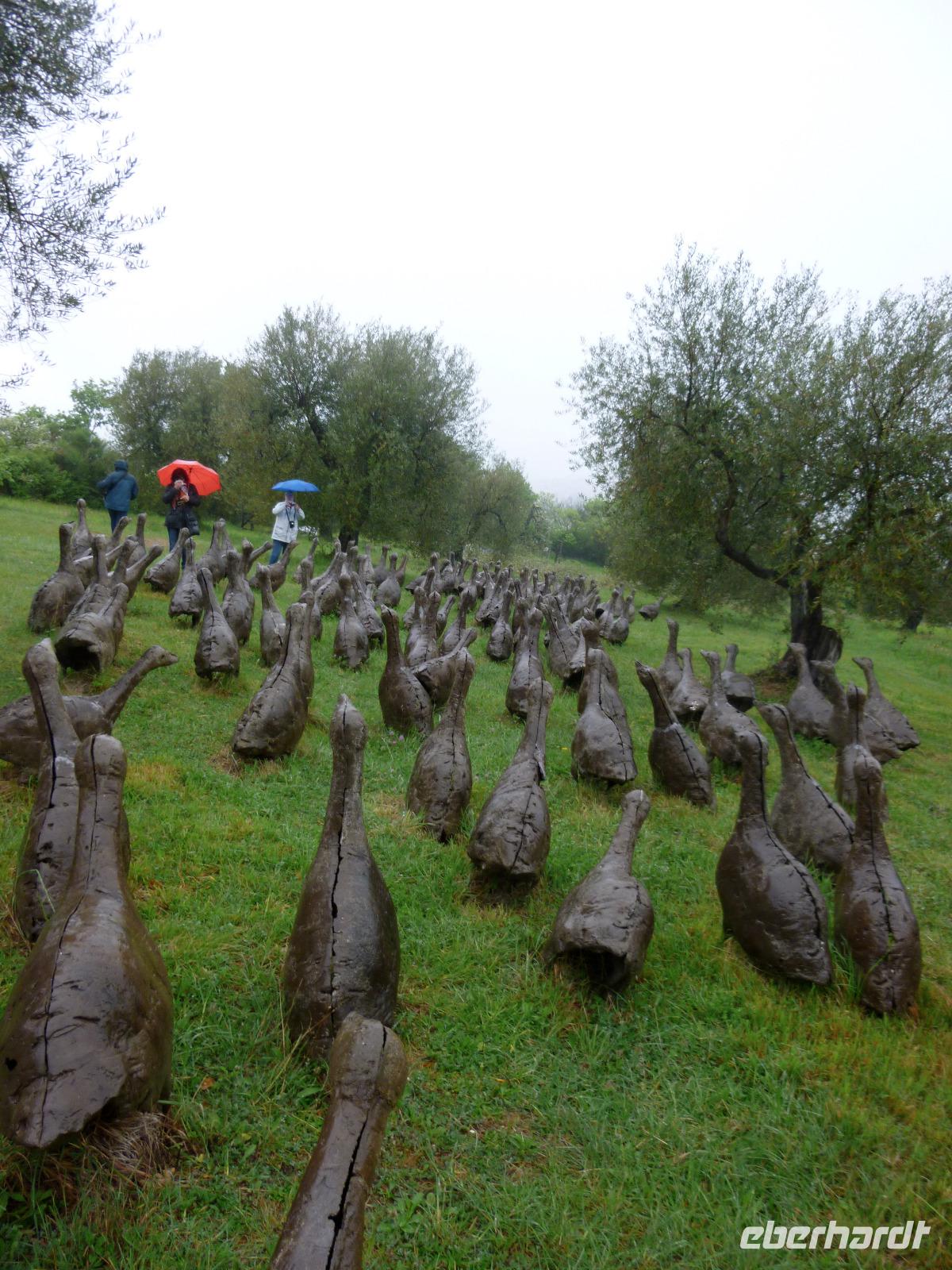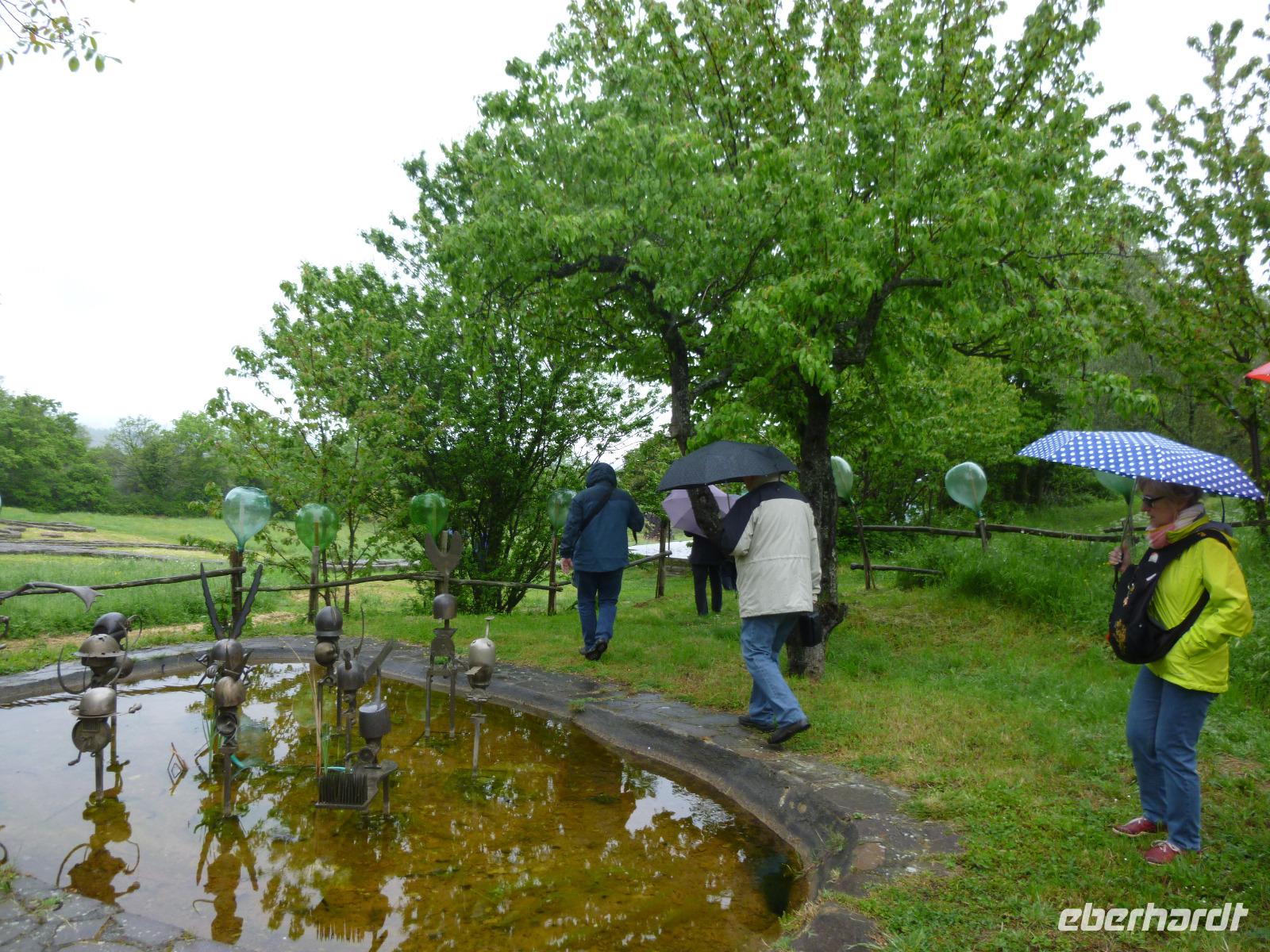 Spoerris Werk-Themen sind das Verhältnis von Weiblichem und Männlichem, von Lust und Schrecken, doch auch der Tod, Mythen und Legenden sowie Selbstbespiegelungen spielen eine Rolle. Gern wechselt der Künstler in seinen Werken (über die Hälfte im Garten) die Perspektive, Größe und kombiniert Gegenstände auf ungewöhnliche Weise. Er irritiert so unsere Sehgewohnheiten auf diesem Landgut, das einst einer alten Sieneser Familie gehörte. Auf der mageren steinigen Erde wachsen auf ehemaligen Wein- und Oliventerrassen hier jetzt einheimische Kultur- und Wild-Pflanzen-Welten wie Echter Ölbaum „Olivastra Seggianese", Himalaja Zeder, Pflaumeiche, Etruskisches Heiligenkraut, Lavendel, Judasbaum, Pinie, Pfriemenginster, Zistrose, Kakipflaume, Lorbeer, Ess-Kastanie, Echter Wein, Wacholder, Zypresse, Gingko, Echter Feigenbaum, Chilenische Schmucktanne. Schade nur, dass es nach dem leckeren Essen anfing stärker zu regnen, wir hätten sonst dieses Paradies gern noch länger genossen.