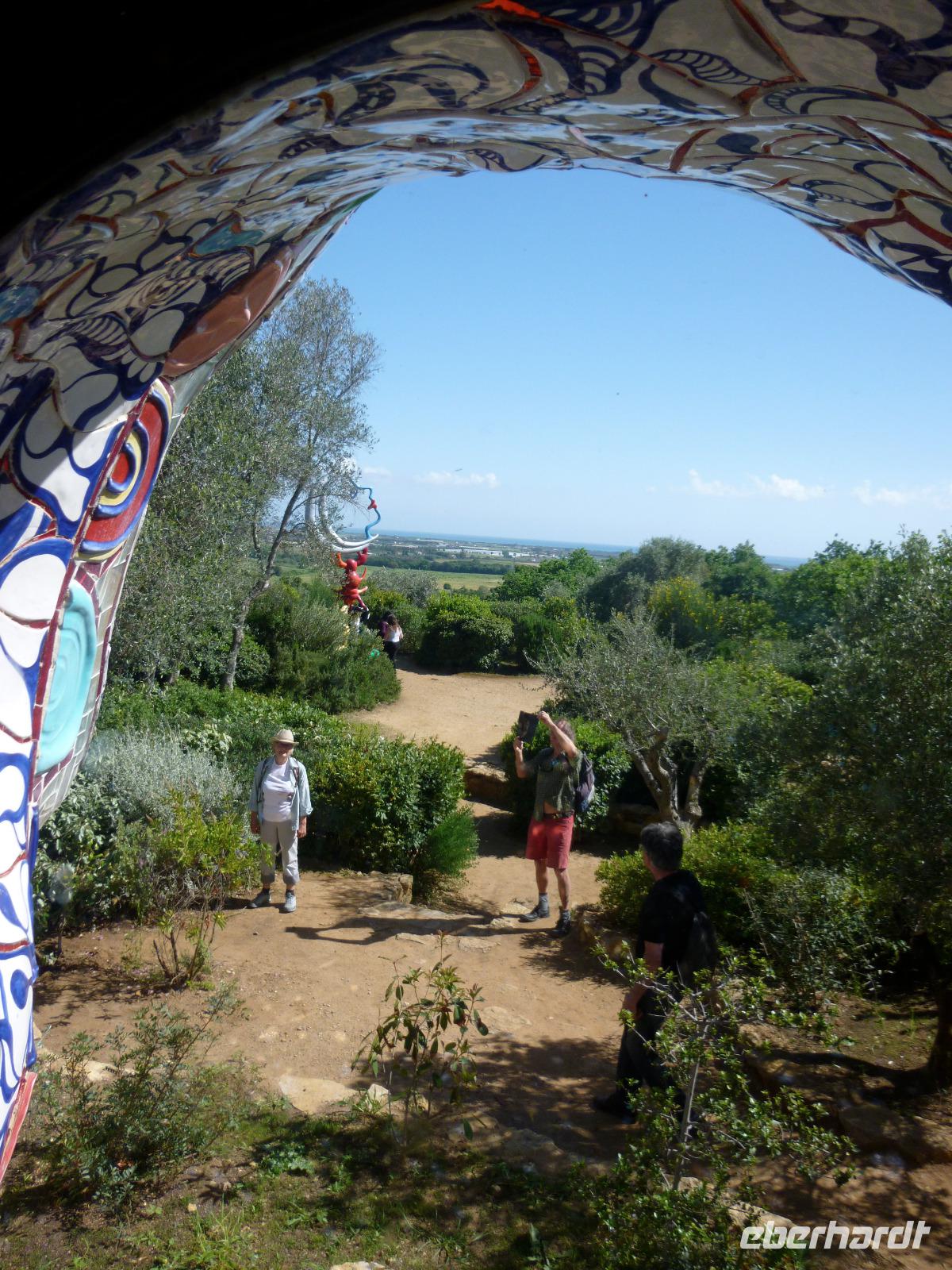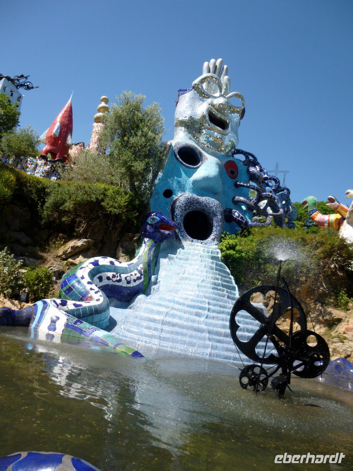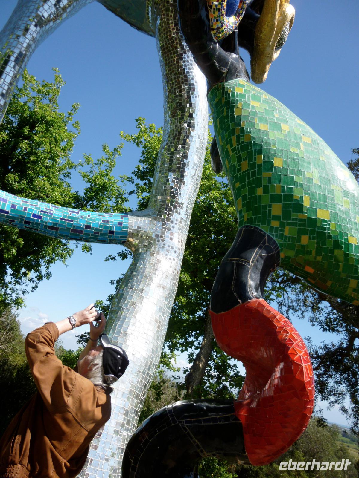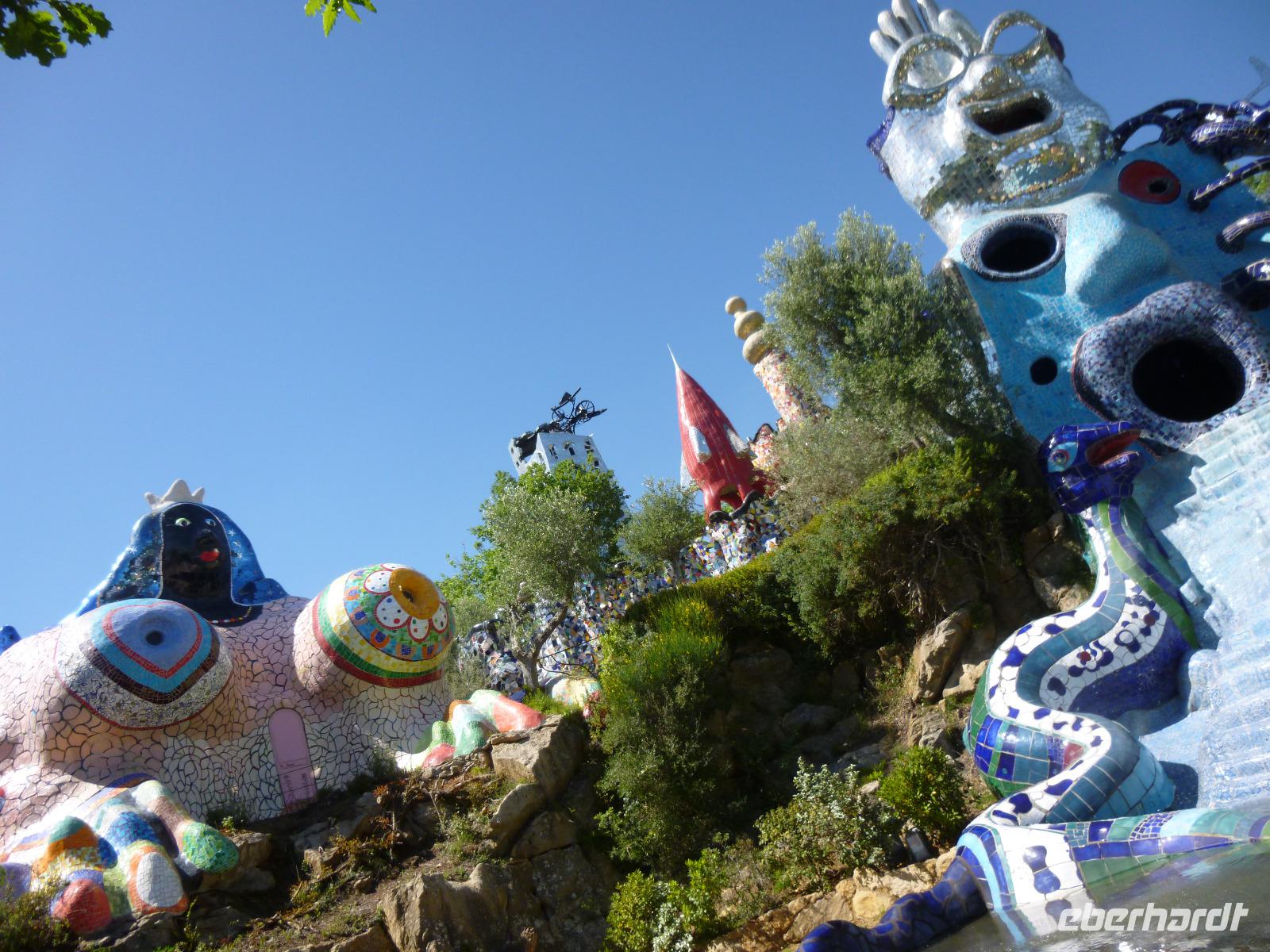 Von Orsinis Höllenschlund zu Nikis Wasserschlund reisten wir nur eine kurze Weile, sahen es schon von Weitem funkeln und glitzern in der Sonne und betraten durch Mario Bottas Mauer erwartungsvoll das Reich der 22 teilweise begeh- und bewohnbaren Monumentalfiguren des Tarot-Kartenspiels: „Sollte unser Leben ein Kartenspiel sein, so werden wir geboren, ohne die Regeln zu kennen", meinte Niki.