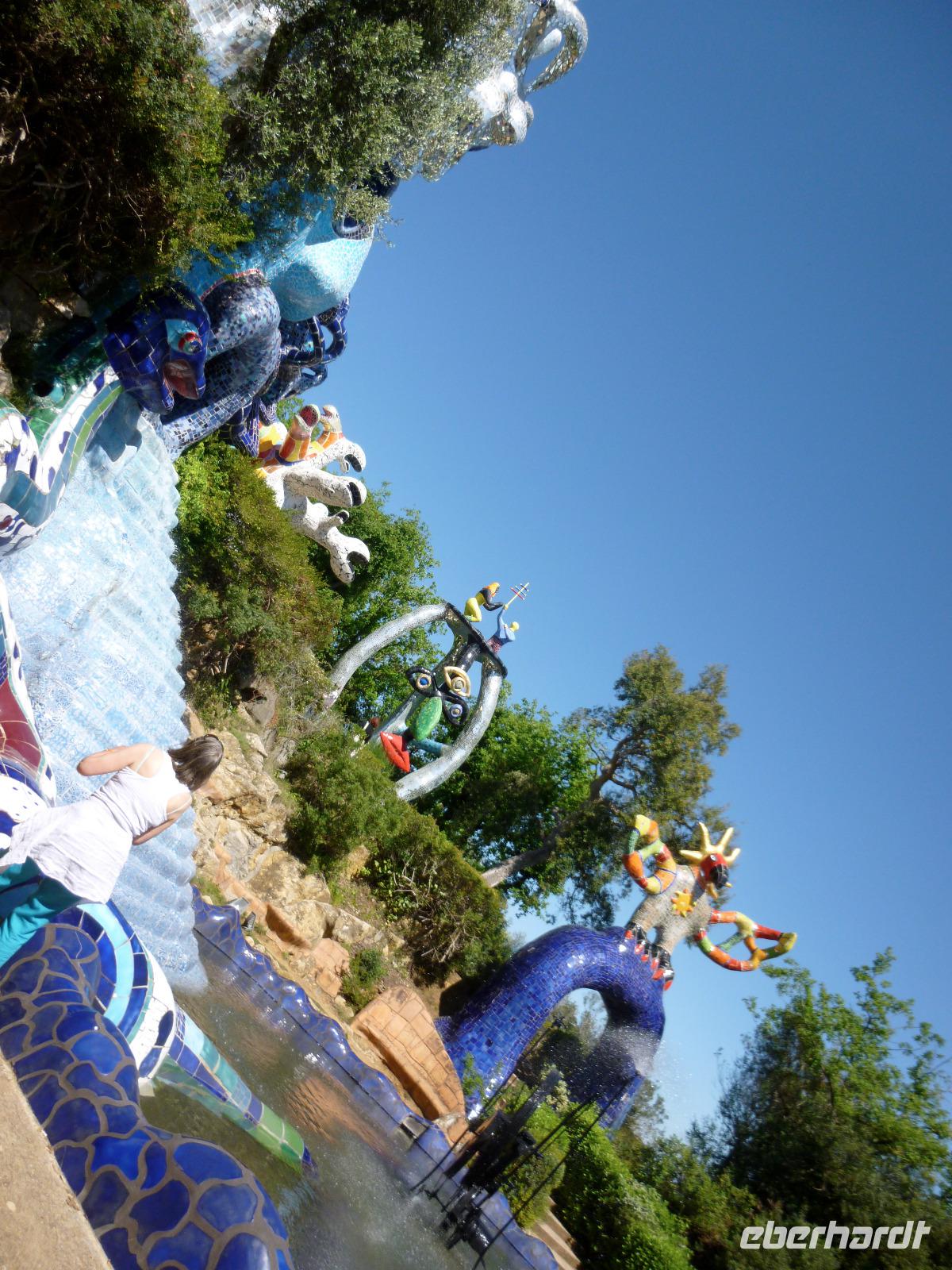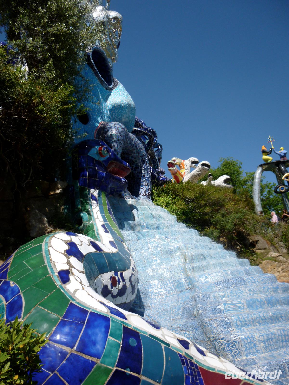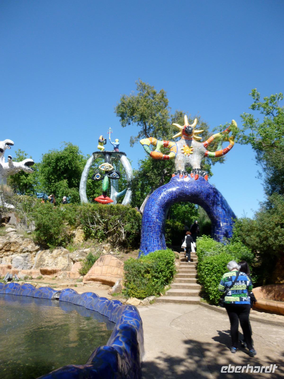 Von Orsinis Höllenschlund zu Nikis Wasserschlund reisten wir nur eine kurze Weile, sahen es schon von Weitem funkeln und glitzern in der Sonne und betraten durch Mario Bottas Mauer erwartungsvoll das Reich der 22 teilweise begeh- und bewohnbaren Monumentalfiguren des Tarot-Kartenspiels: „Sollte unser Leben ein Kartenspiel sein, so werden wir geboren, ohne die Regeln zu kennen", meinte Niki.