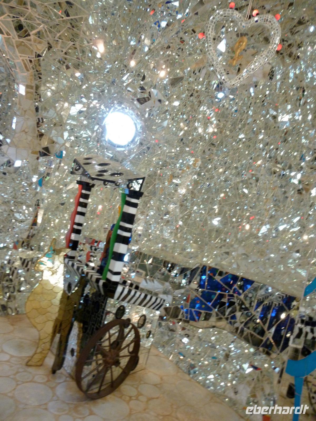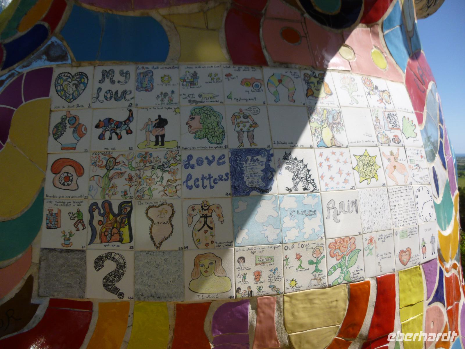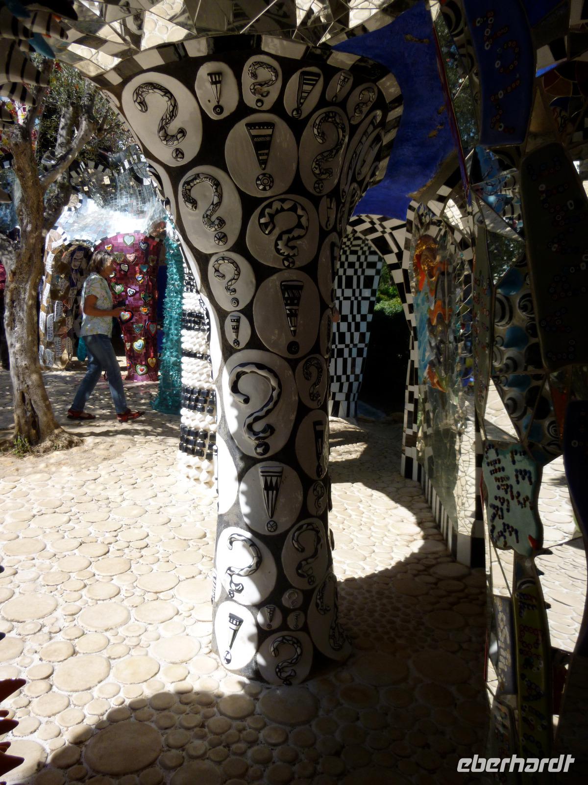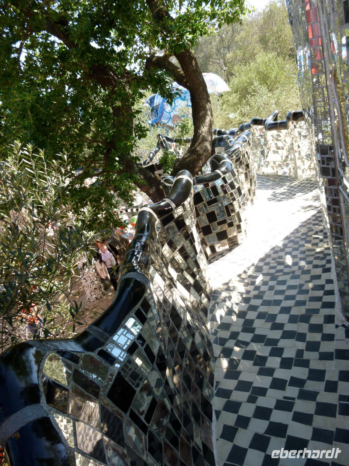 Von Orsinis Höllenschlund zu Nikis Wasserschlund reisten wir nur eine kurze Weile, sahen es schon von Weitem funkeln und glitzern in der Sonne und betraten durch Mario Bottas Mauer erwartungsvoll das Reich der 22 teilweise begeh- und bewohnbaren Monumentalfiguren des Tarot-Kartenspiels: „Sollte unser Leben ein Kartenspiel sein, so werden wir geboren, ohne die Regeln zu kennen", meinte Niki.