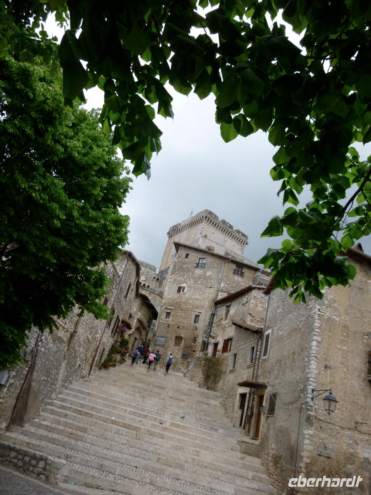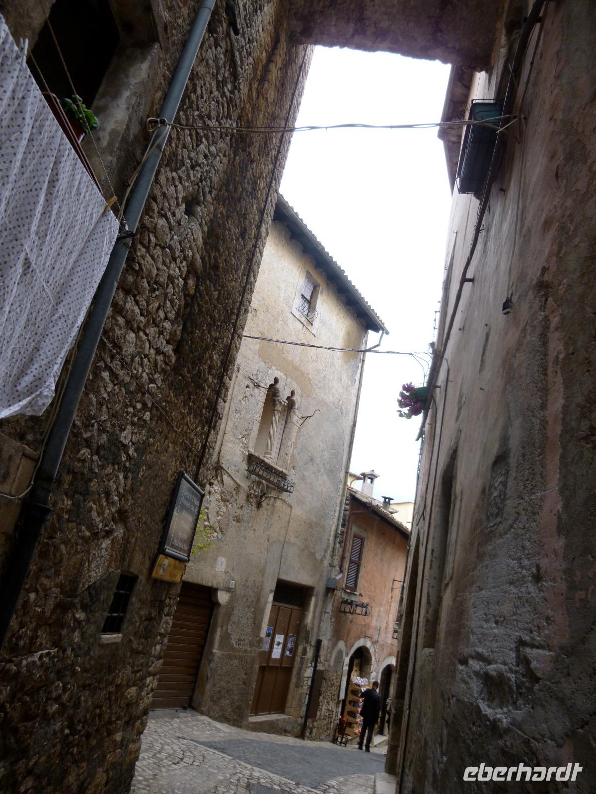 Wir umfuhren - noch berauscht vom Orangenblütenduft des giardino secreto den Hügel mit Sermoneta und dem Castello Caetani und dann ging es in atemberaubende Höhe bis zur Bergkuppe. Dort spazierten wir dann in den kleinen verträumten Ort. Selten haben wir ein so gutes Eis und leckeres einheimisches Gebäck genossen. Nur in den Nebengassen waren die vielen italienischen Schulkinder nicht zu hören, die Klassenfahrten machten.